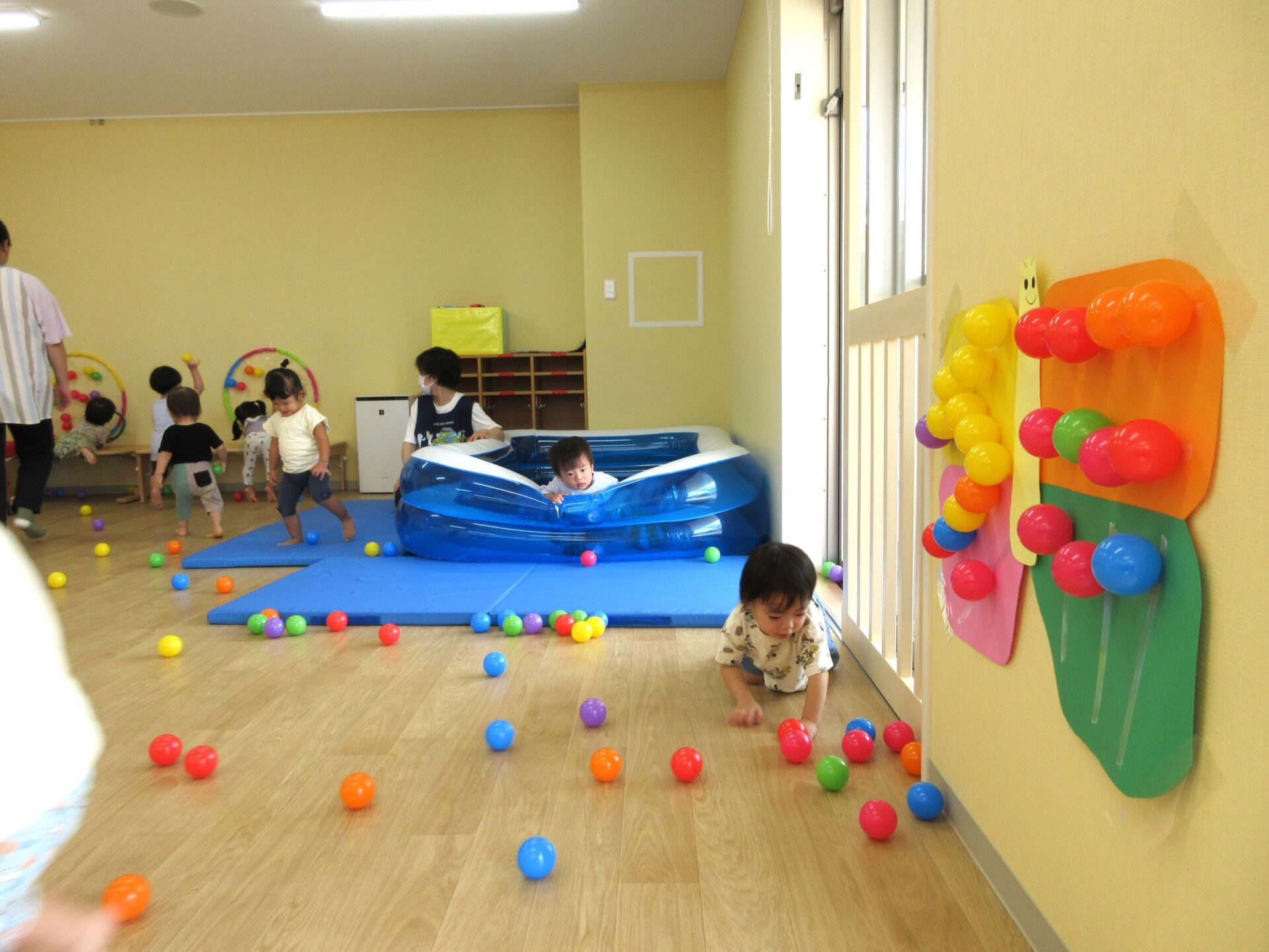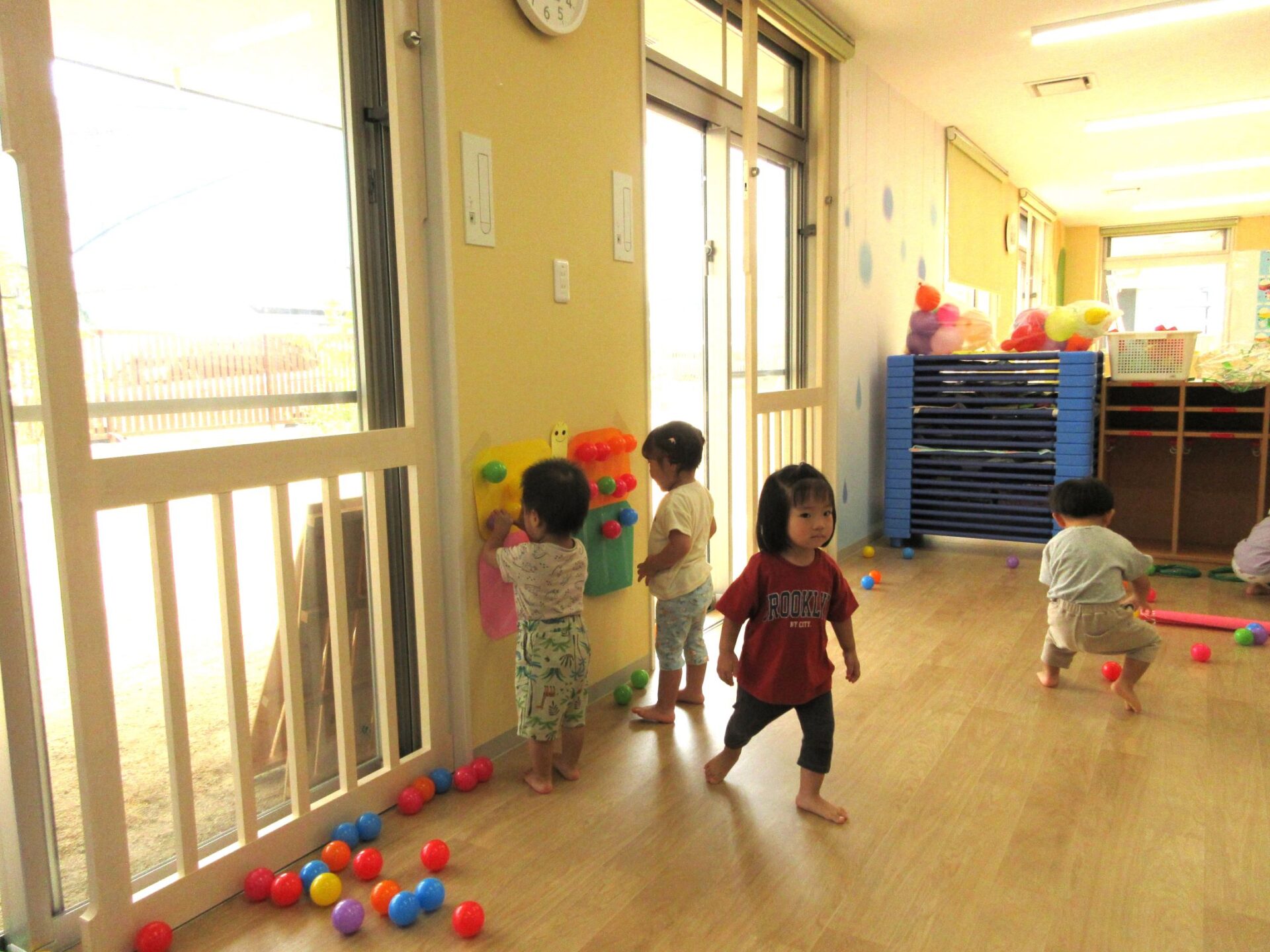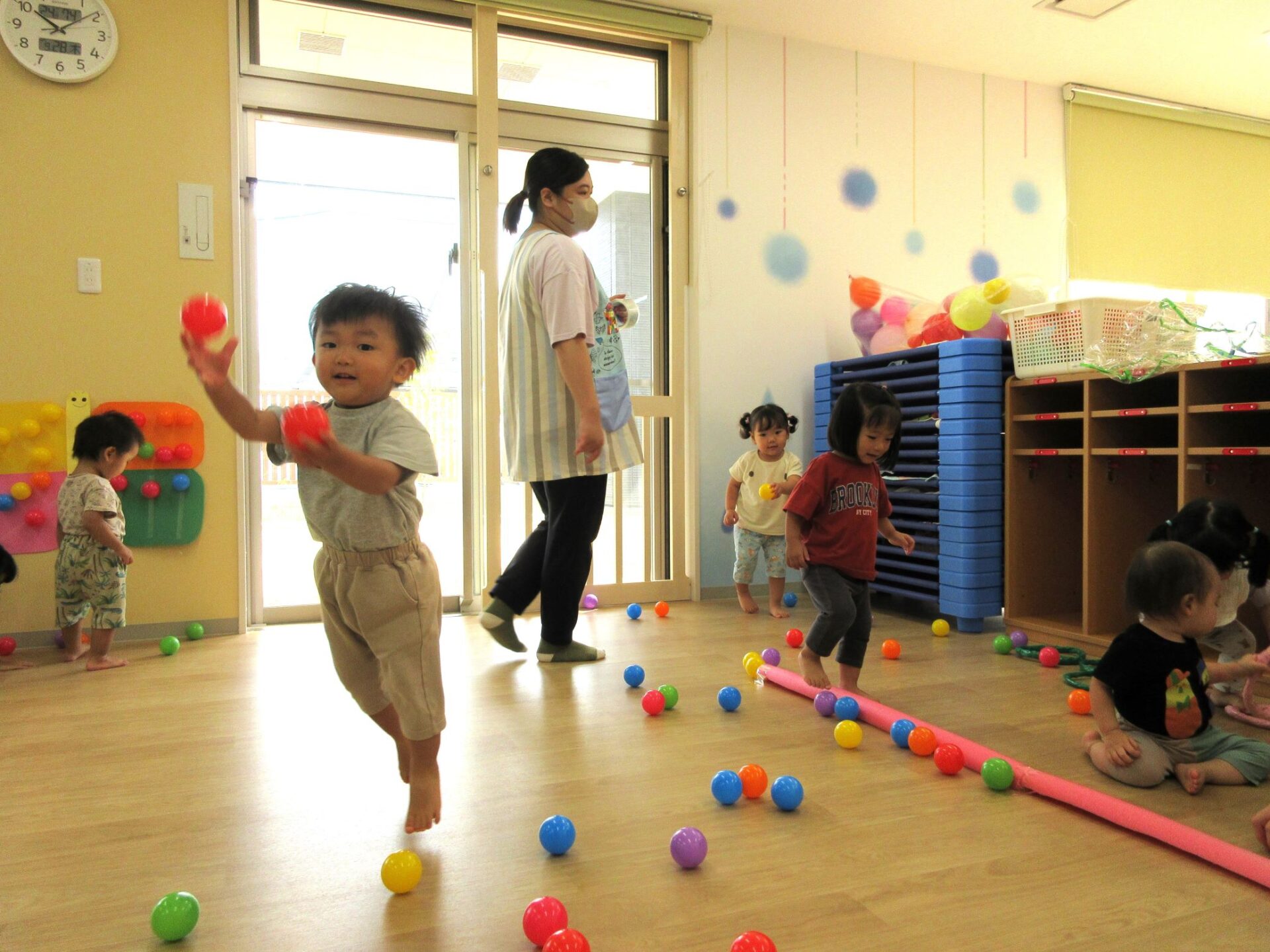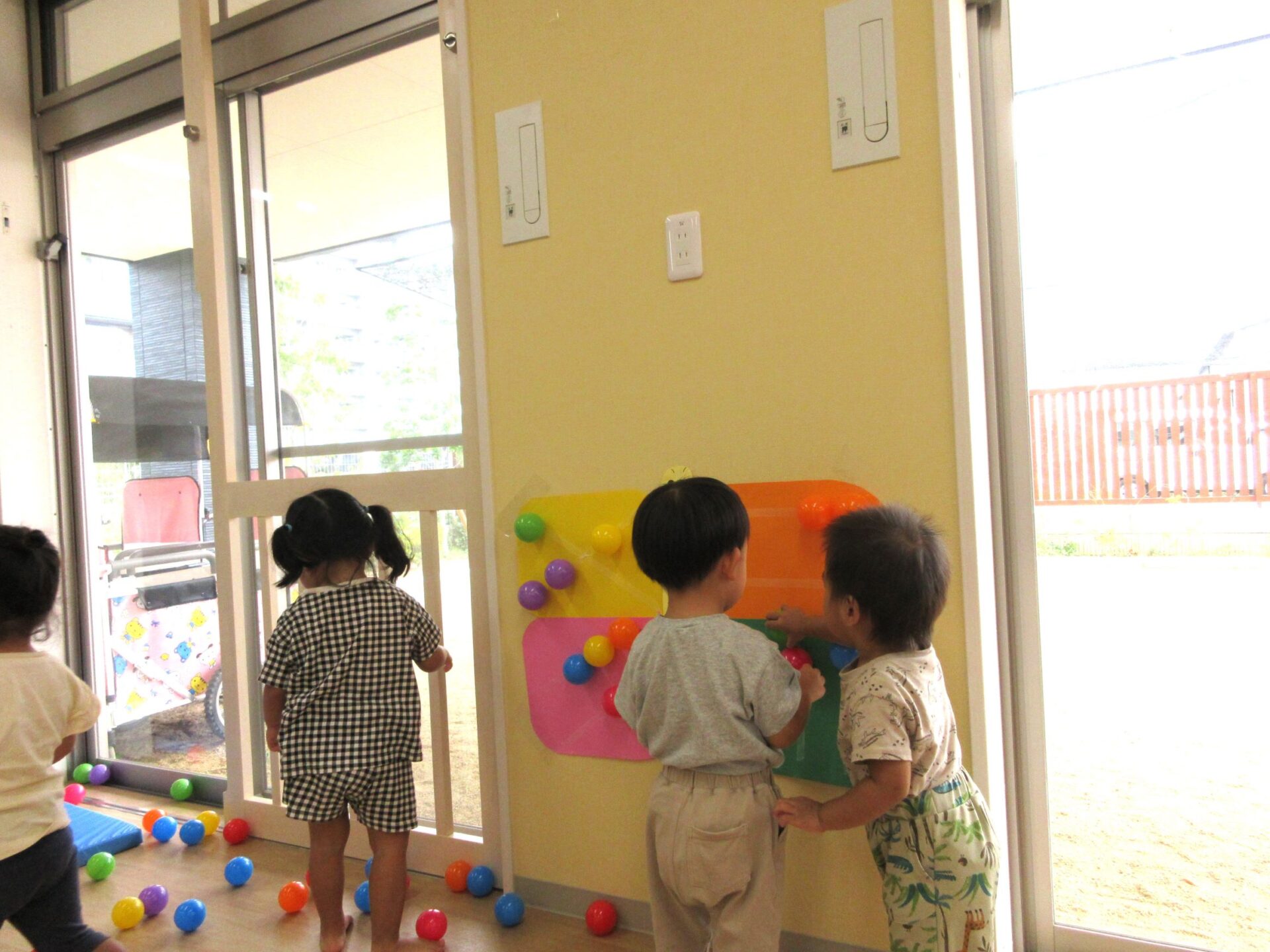 2023.09.30 お知らせ ブログ ボールで遊ぶ(だいち組) 28日(木)、1歳だいち組は保育室でボールを使って遊びました。 小さなボールを輪投げのように丸い輪に入れたり、壁の的に投げたり。 的にはボールがくっつくところがあります。「魔法の的当て」 投げずにそのままくっつけることもあります。 的の向こうのプールには、大きなボールがあります。 大きなボールですね。 「ぽっとん落とし」のコーナーもあります。 フープの的当てコーナもありました。ボールを使って、いろんなコーナーで遊びました。 一覧へ戻る