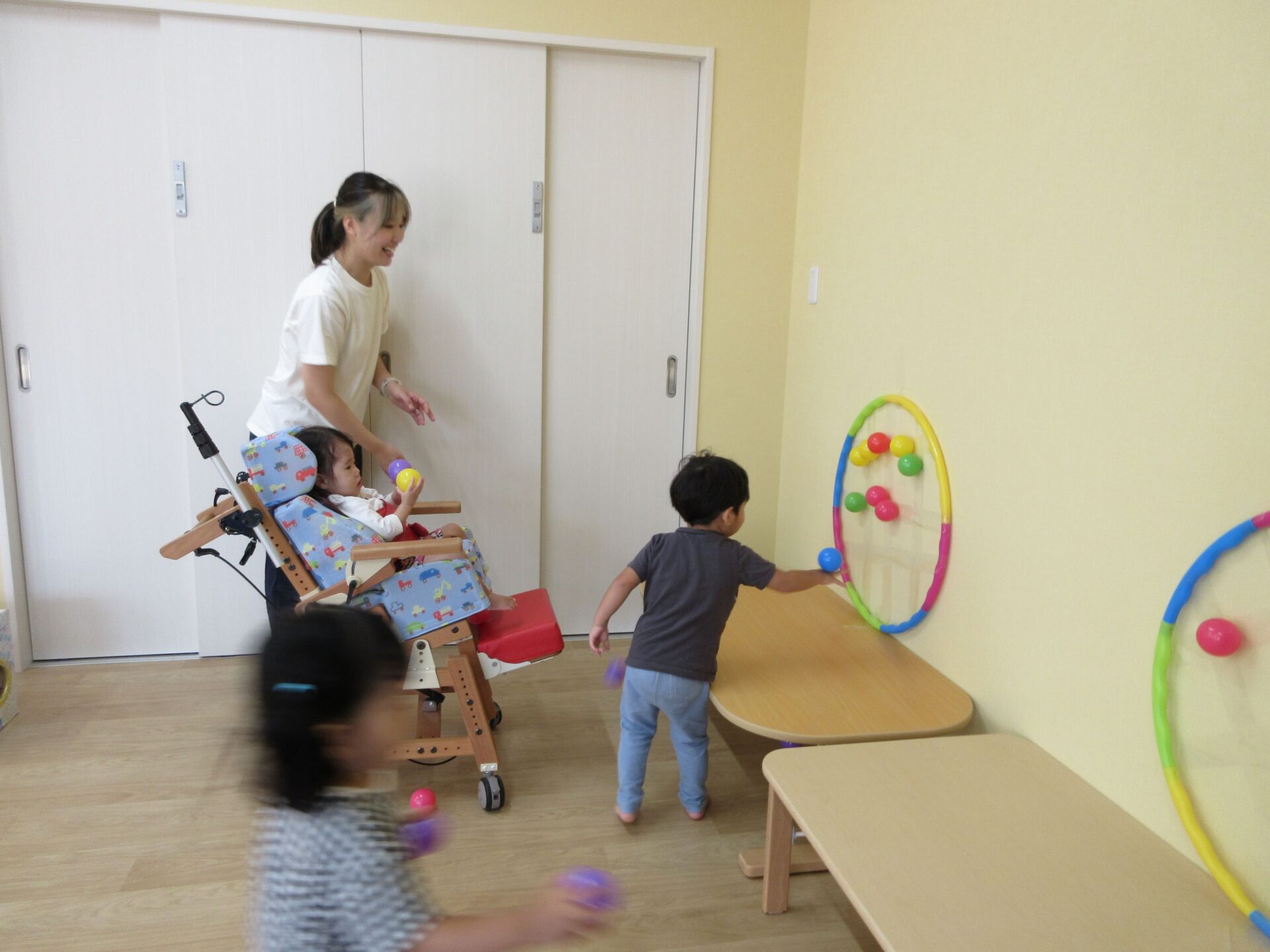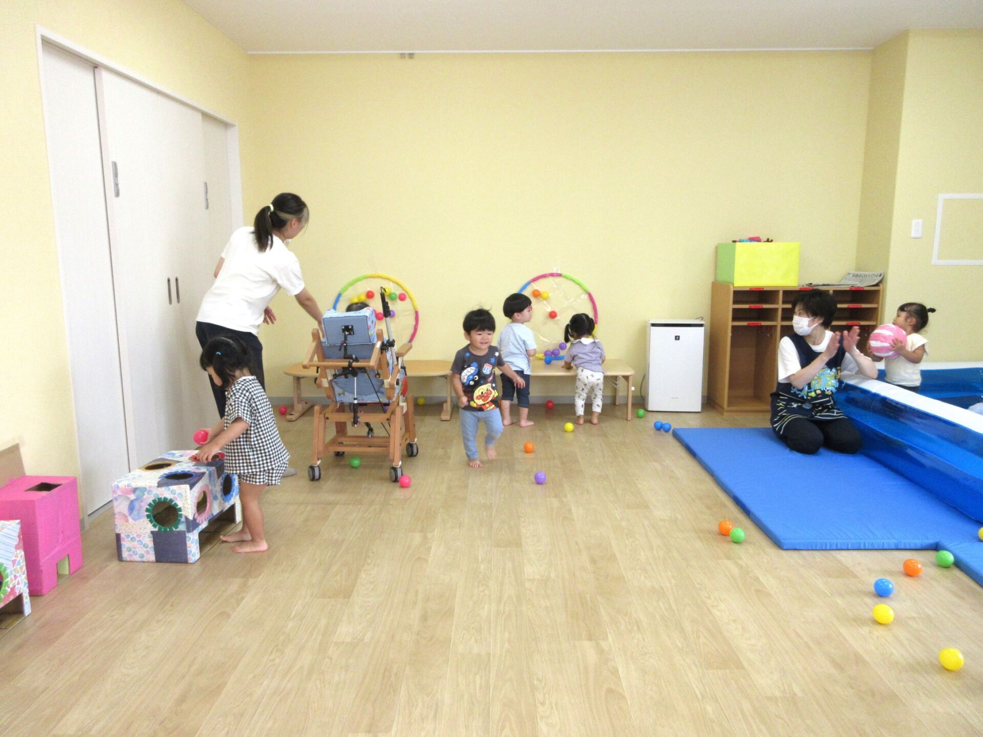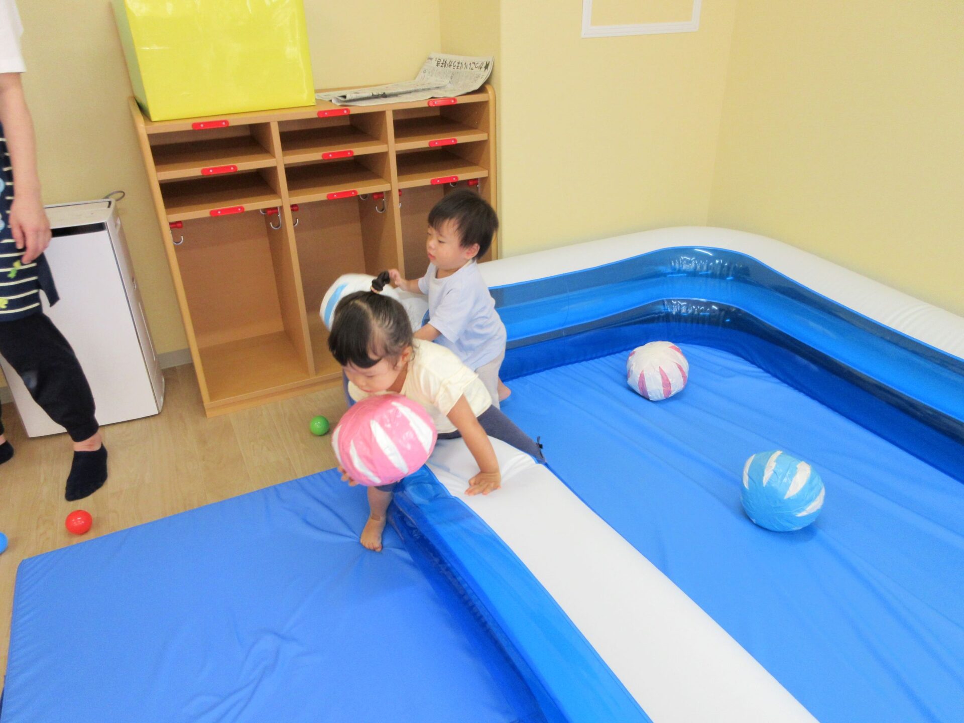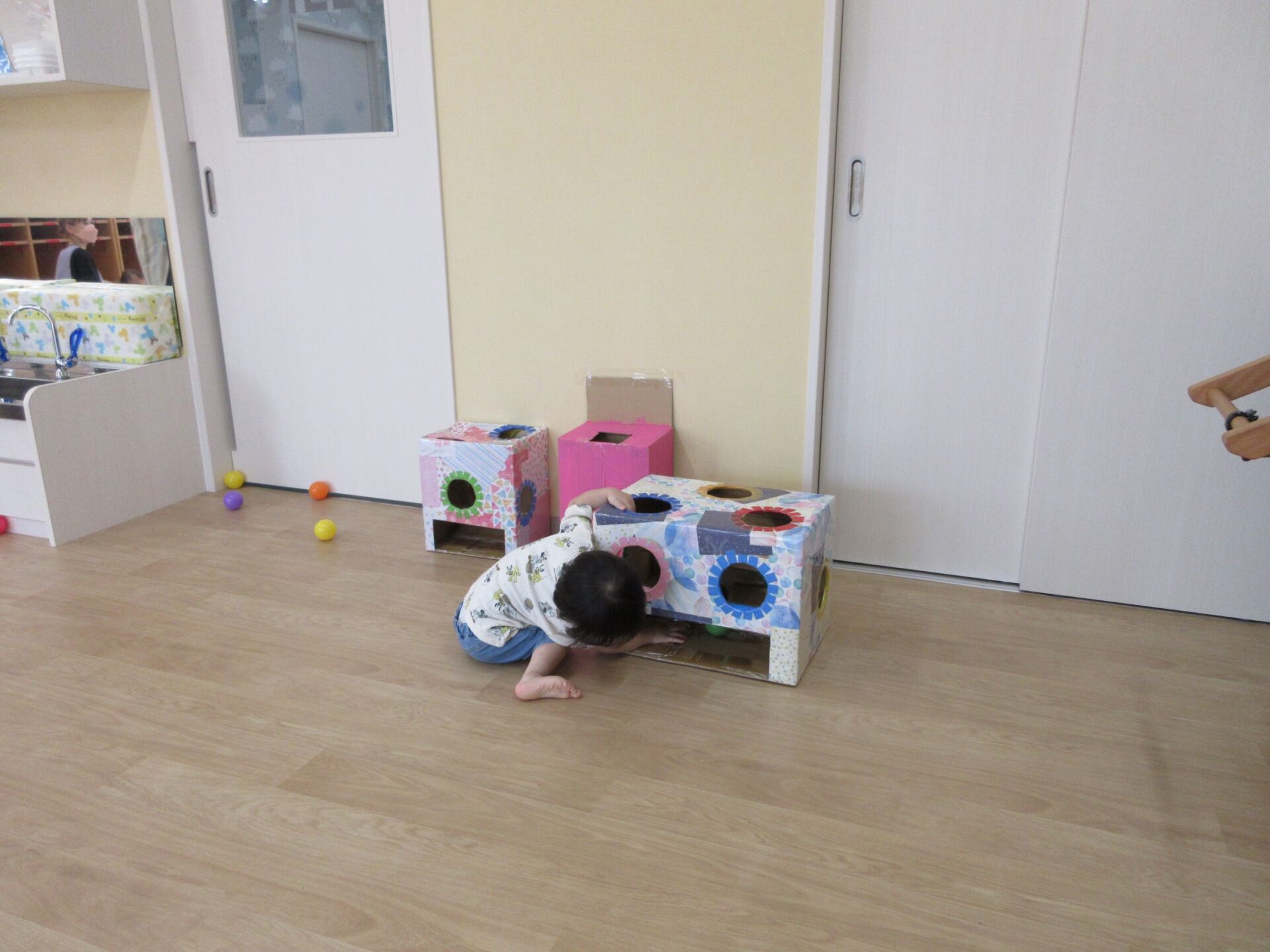 2023.09.30 お知らせ ブログ ボールで遊ぶ(だいち組) 28日(木)、1歳だいち組は保育室でボールを使って遊びました。 小さなボールを輪投げのように丸い輪に入れたり、壁の的に投げたり。 的にはボールがくっつくところがあります。「魔法の的当て」 投げずにそのままくっつけることもあります。 的の向こうのプールには、大きなボールがあります。 大きなボールですね。 「ぽっとん落とし」のコーナーもあります。 フープの的当てコーナもありました。ボールを使って、いろんなコーナーで遊びました。 一覧へ戻る