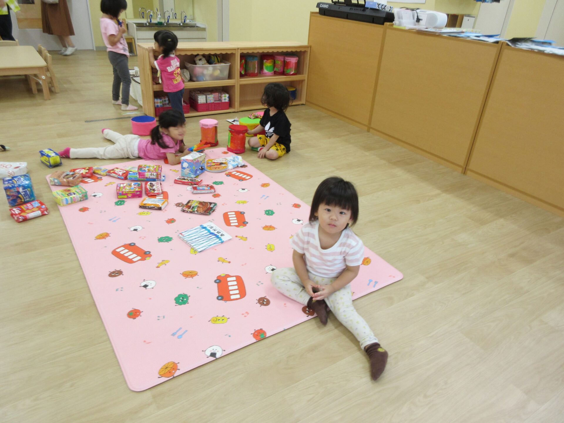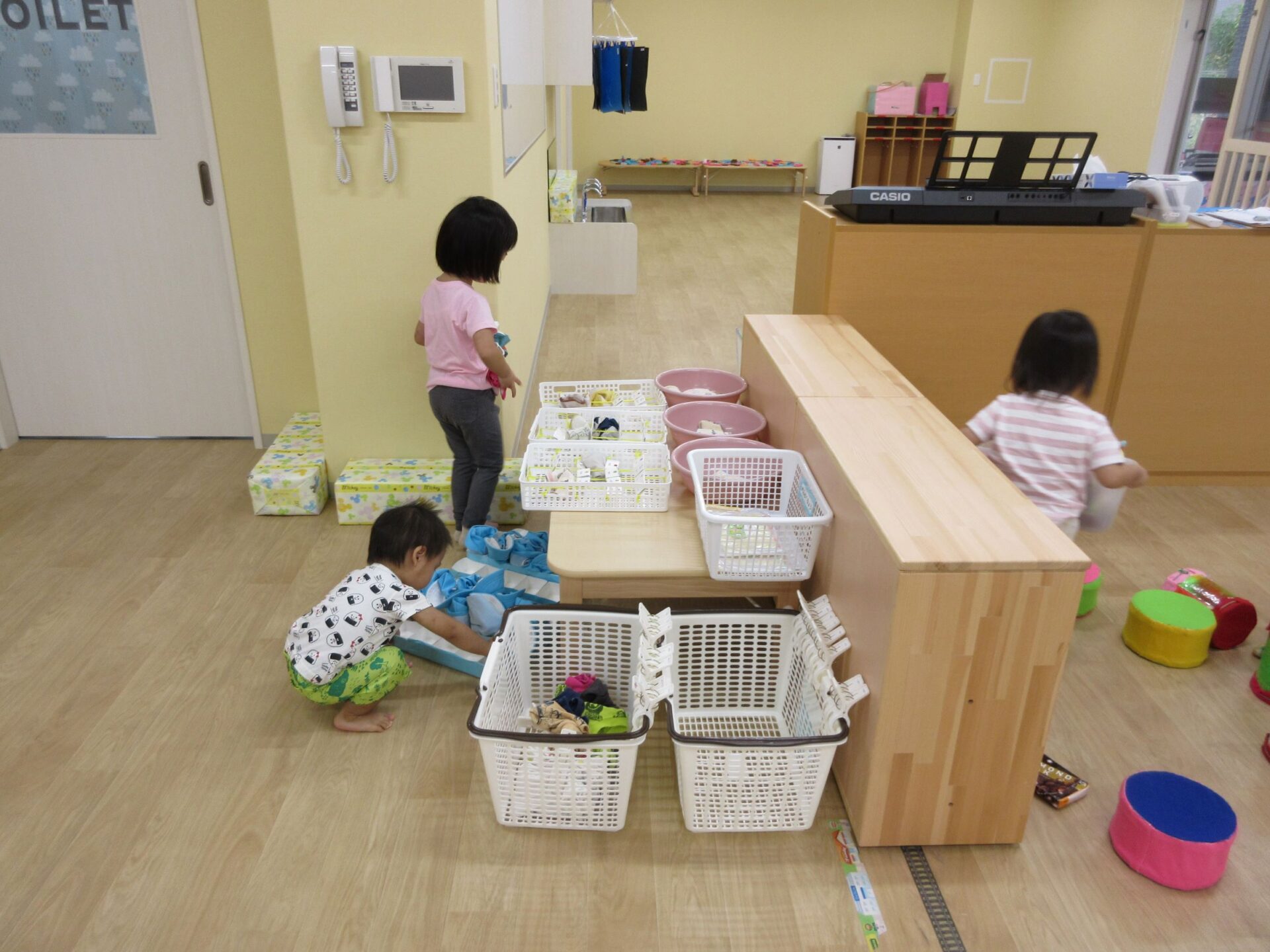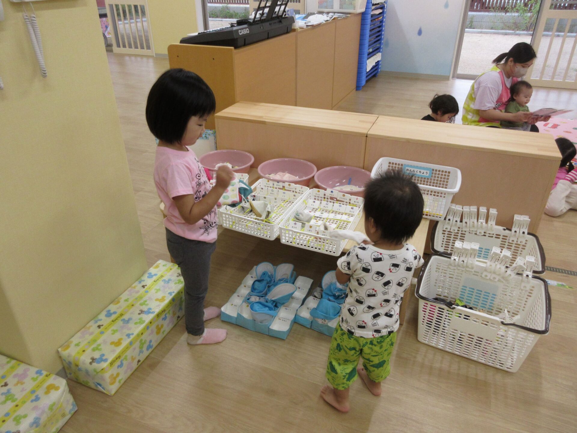 新しいおともだちが登園しました。1歳の子は、自分でカラー帽子を決められた場所に入れています。