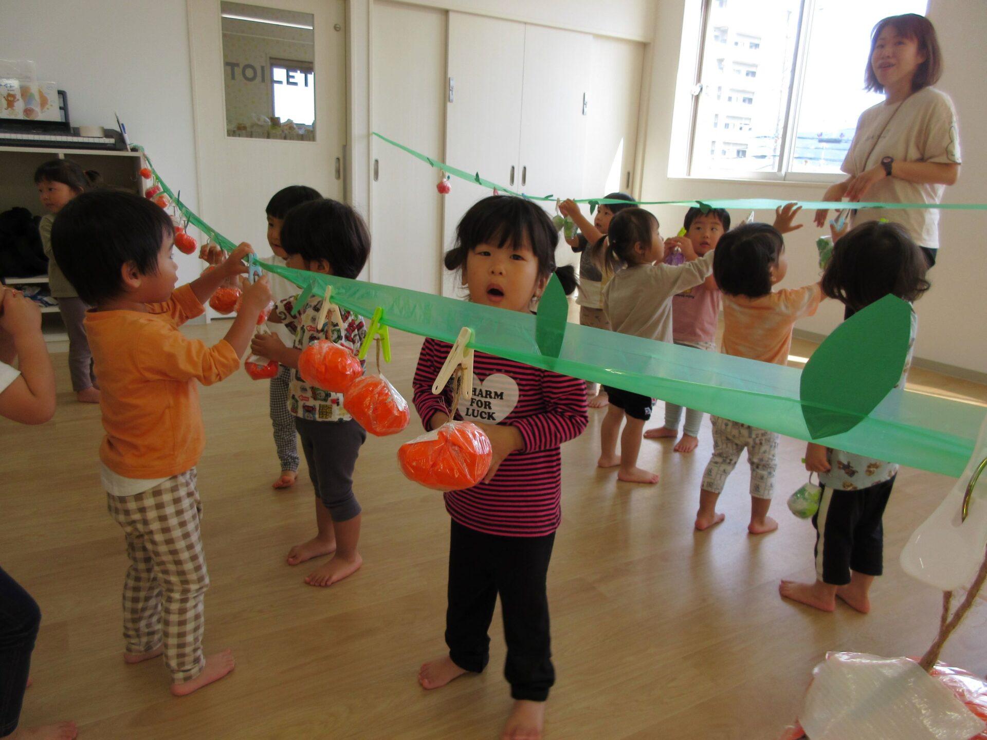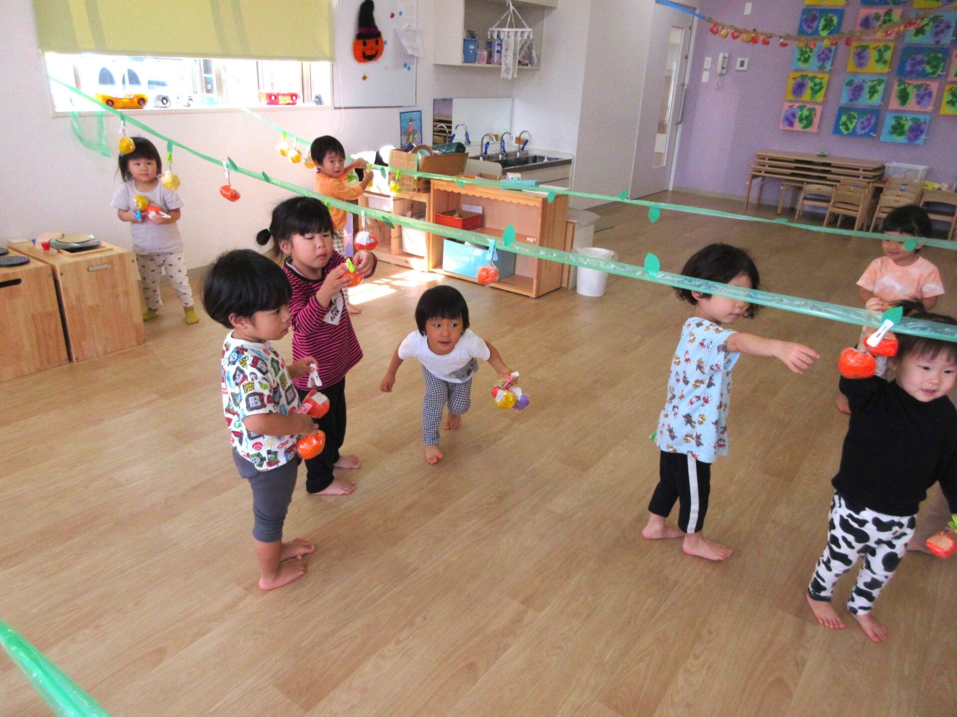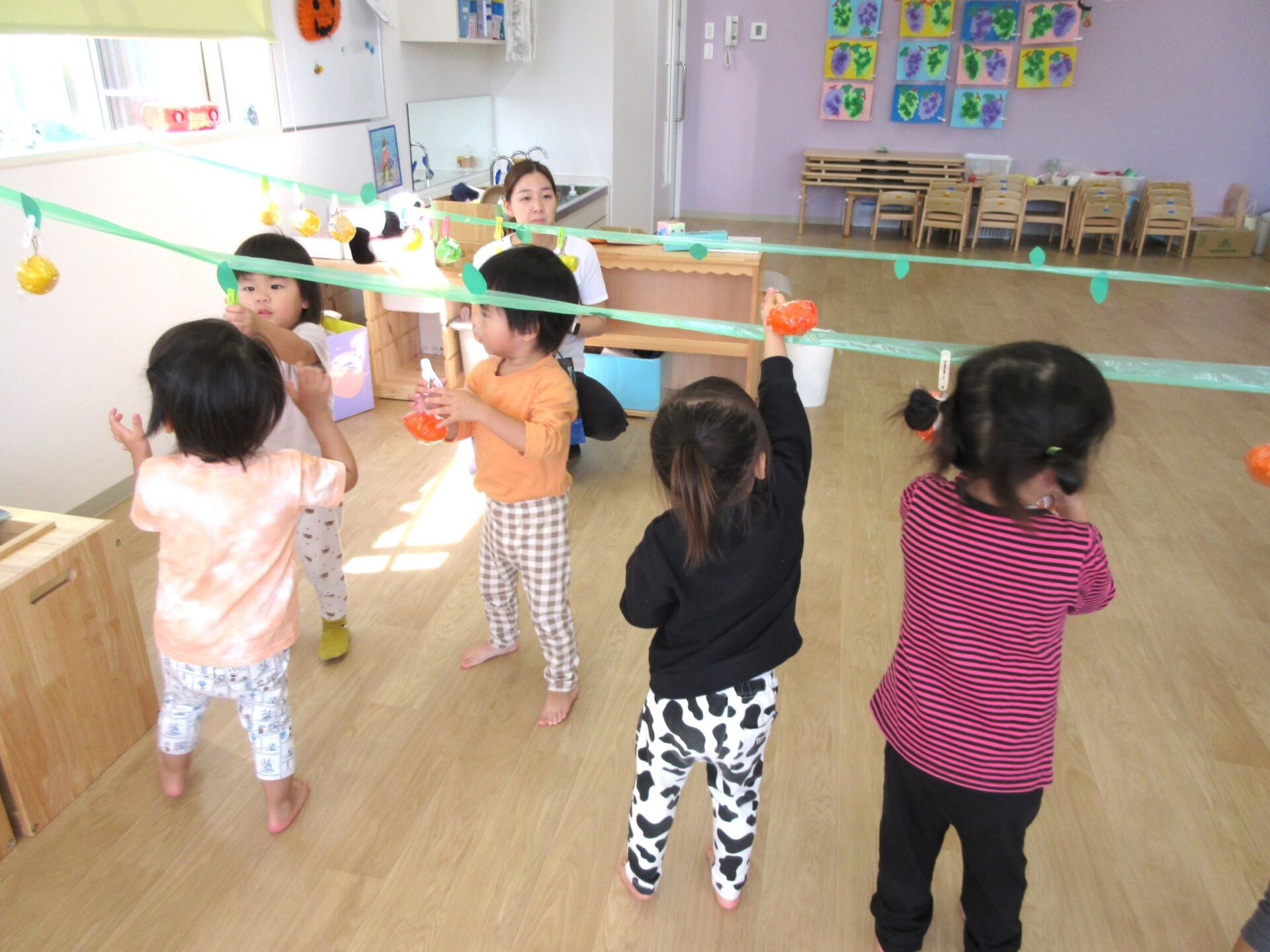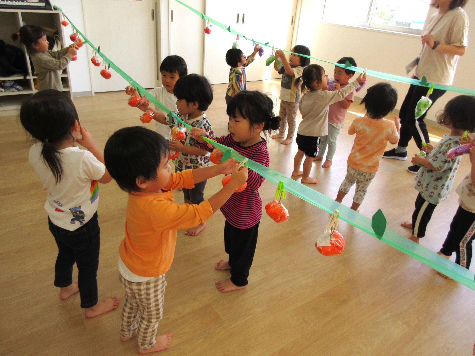 2023.10.10 お知らせ ブログ 秋の味覚狩り(あめ組) 10月6日(金)、2歳あめ組の保育室では、秋の味覚狩りをしました。 紙で作った「柿」、「みかん」、「梨」、「りんご」、「ぶどう」がつり下がっています。 洗濯ばさみを「つまむ」ことも、ねらいのひとつでした。 みんな楽しく収穫しています。 「見て見て!」 「とったよ。」 だんだんと果物がなくなってきました。 こんどは、元の木の枝に戻し始めました。洗濯ばさみではさんでいます。 とったばかりの秋の味覚を、食べている人もいます。 食べていますね。「おいしい!」 楽しい、秋の味覚狩り遊びでした。 一覧へ戻る