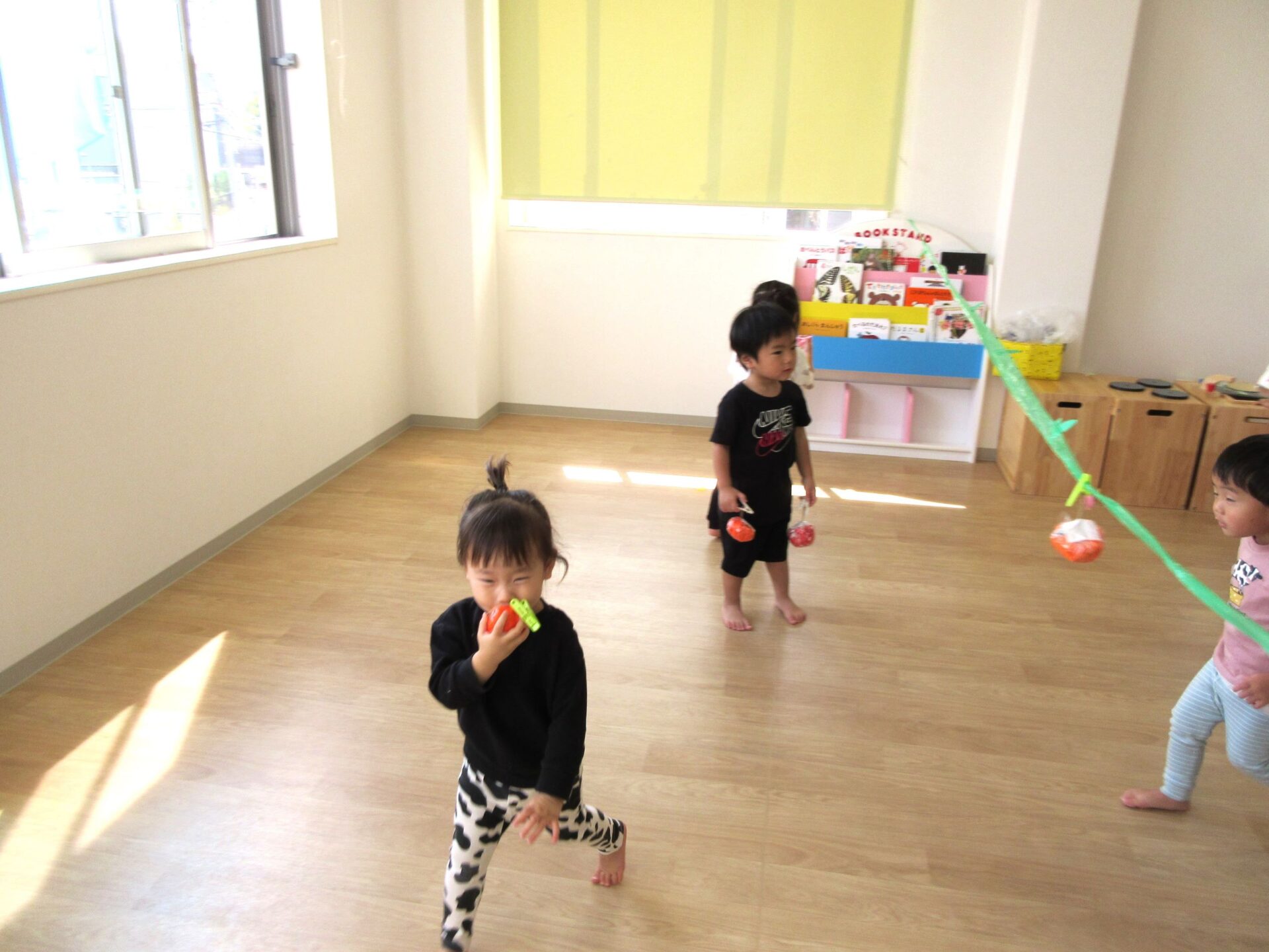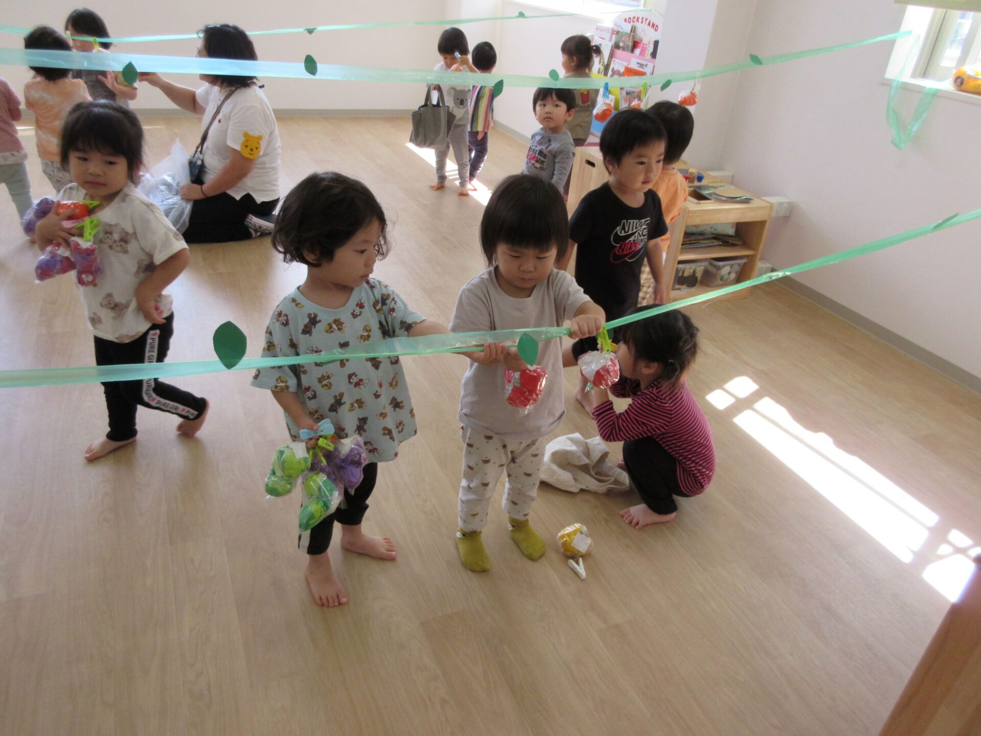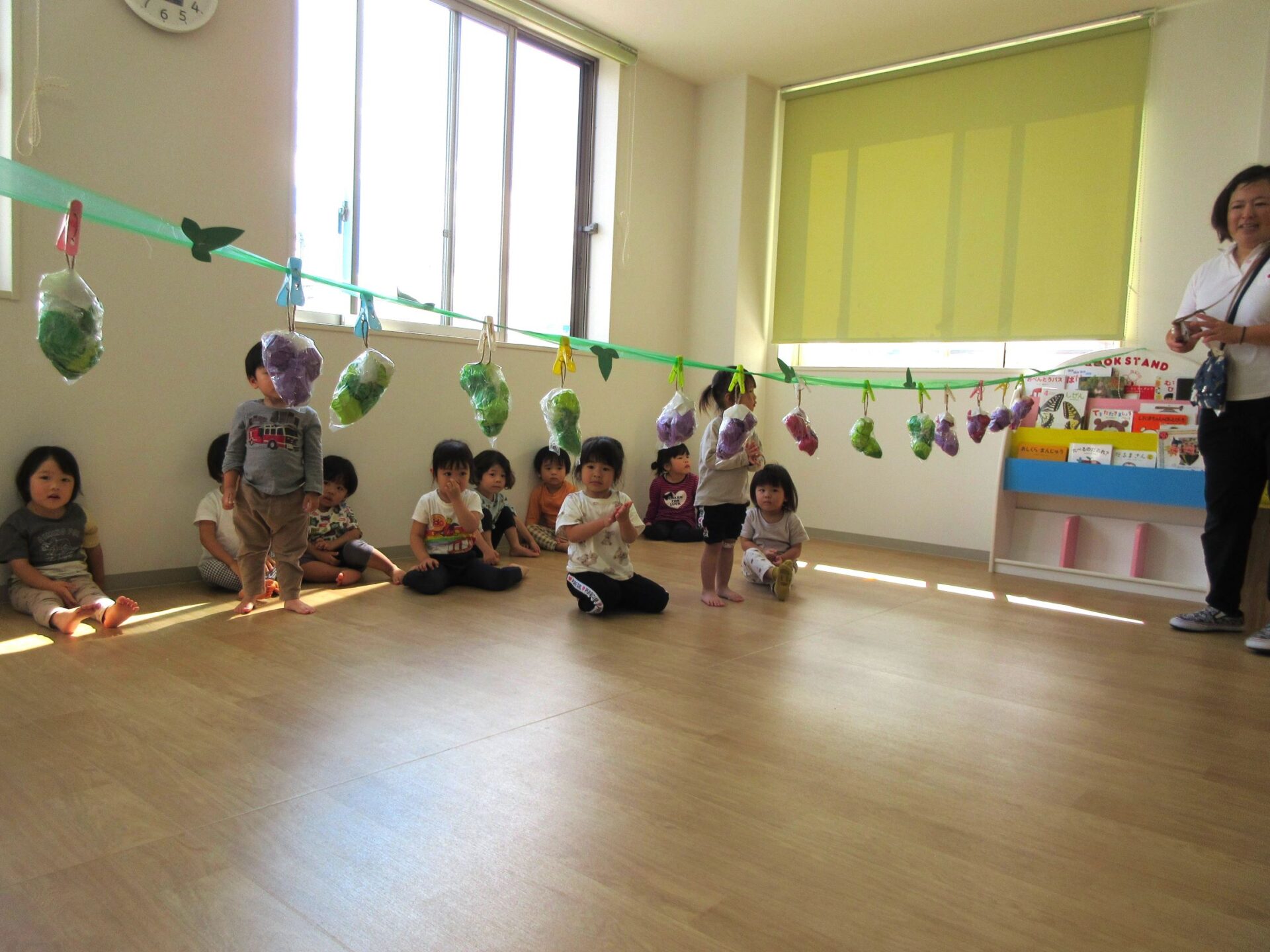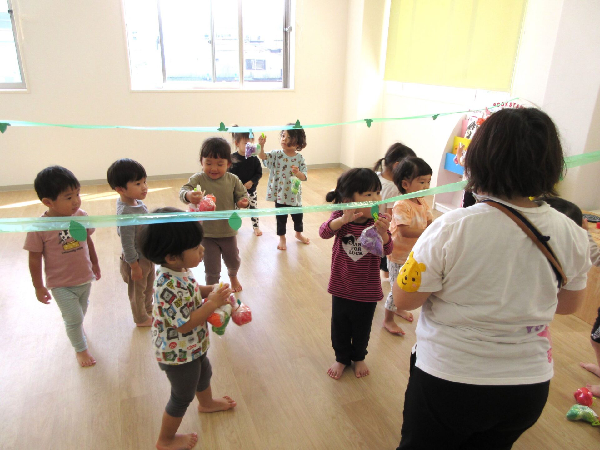2023.10.10 お知らせ ブログ 秋の味覚狩り(あめ組) 10月6日(金)、2歳あめ組の保育室では、秋の味覚狩りをしました。 紙で作った「柿」、「みかん」、「梨」、「りんご」、「ぶどう」がつり下がっています。 洗濯ばさみを「つまむ」ことも、ねらいのひとつでした。 みんな楽しく収穫しています。 「見て見て!」 「とったよ。」 だんだんと果物がなくなってきました。 こんどは、元の木の枝に戻し始めました。洗濯ばさみではさんでいます。 とったばかりの秋の味覚を、食べている人もいます。 食べていますね。「おいしい!」 楽しい、秋の味覚狩り遊びでした。 一覧へ戻る
