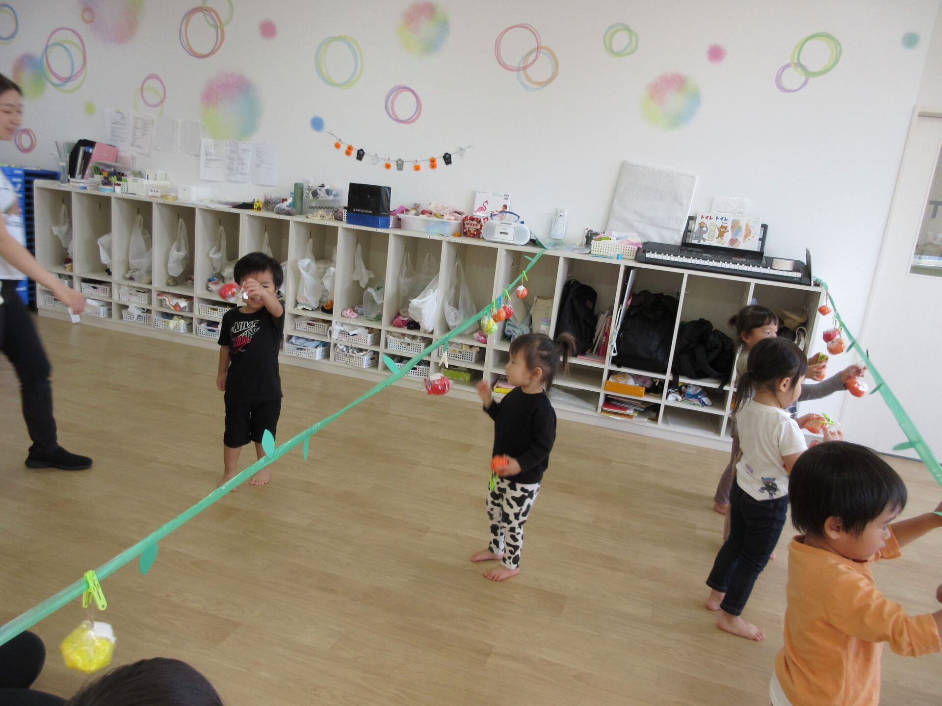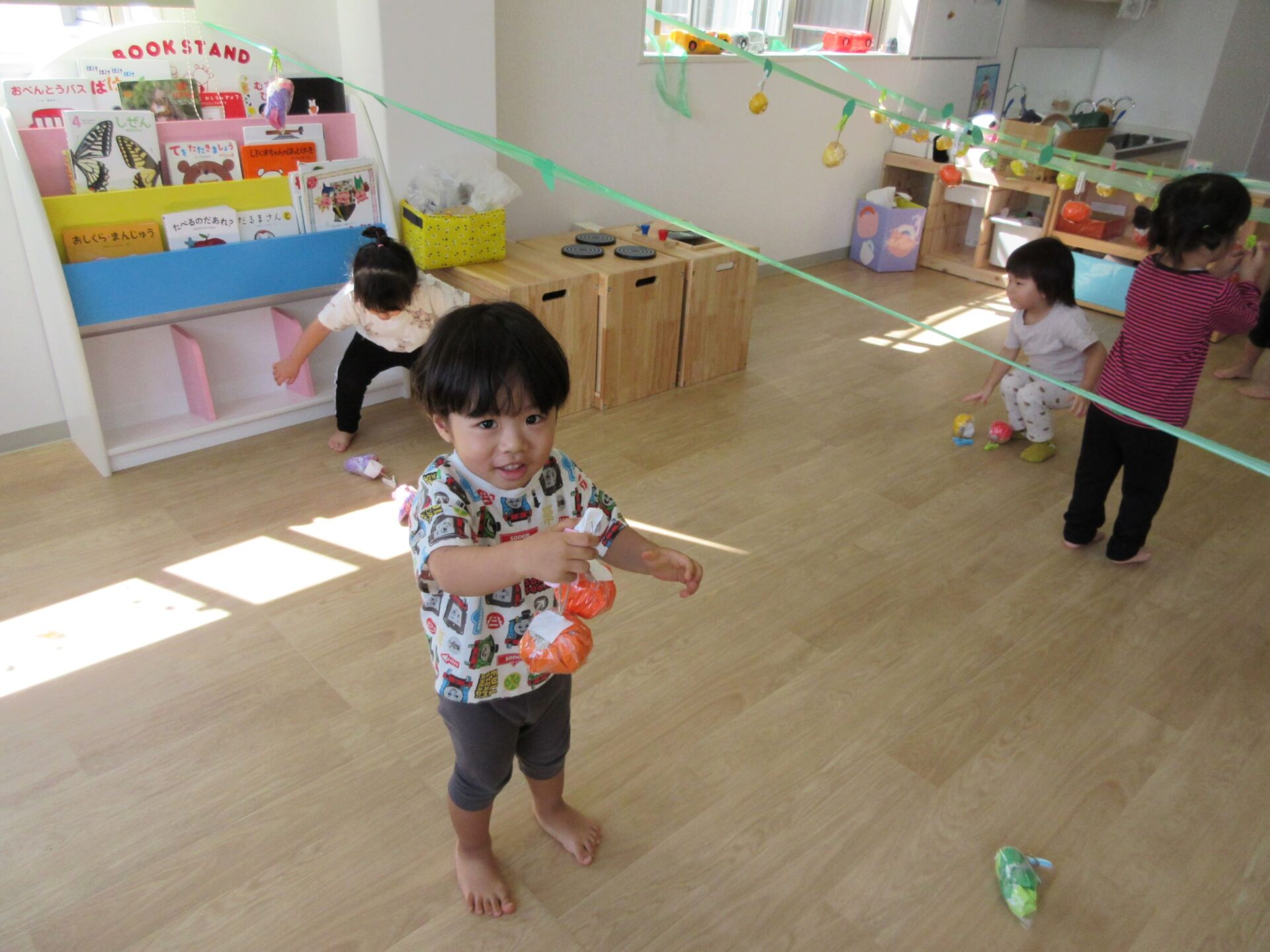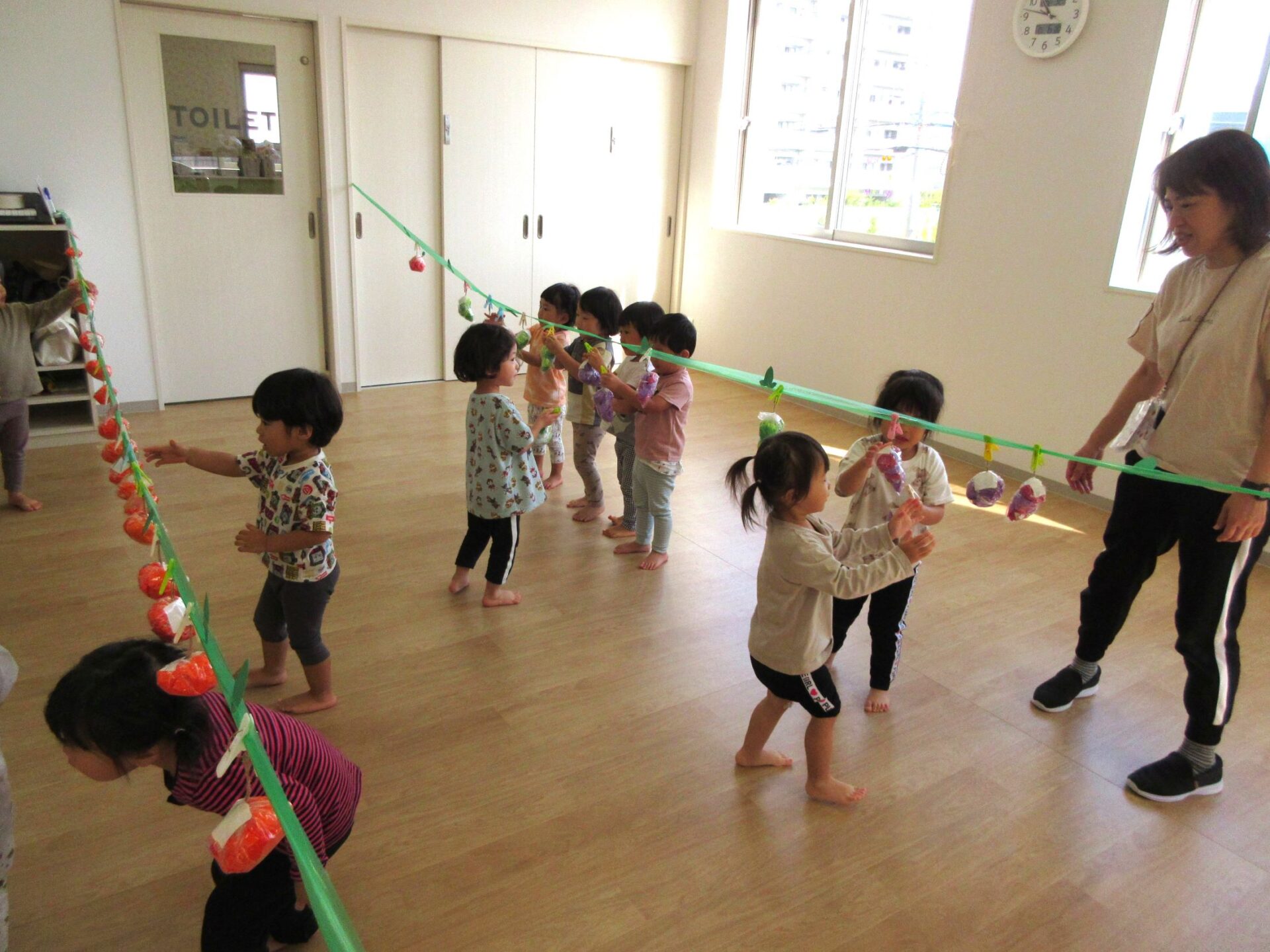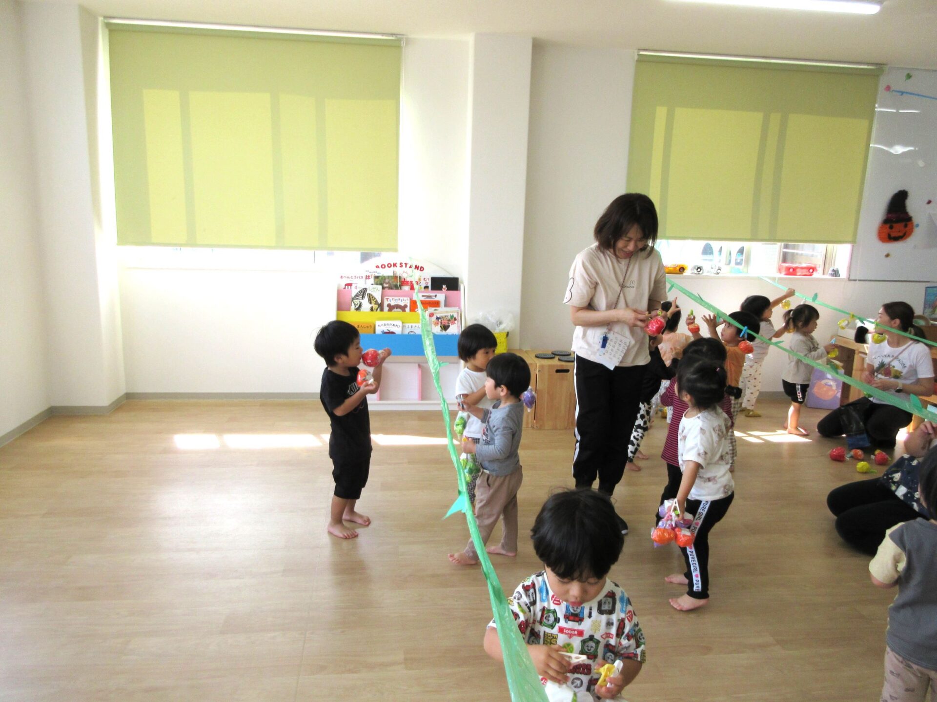 2023.10.10 お知らせ ブログ 秋の味覚狩り(あめ組) 10月6日(金)、2歳あめ組の保育室では、秋の味覚狩りをしました。 紙で作った「柿」、「みかん」、「梨」、「りんご」、「ぶどう」がつり下がっています。 洗濯ばさみを「つまむ」ことも、ねらいのひとつでした。 みんな楽しく収穫しています。 「見て見て!」 「とったよ。」 だんだんと果物がなくなってきました。 こんどは、元の木の枝に戻し始めました。洗濯ばさみではさんでいます。 とったばかりの秋の味覚を、食べている人もいます。 食べていますね。「おいしい!」 楽しい、秋の味覚狩り遊びでした。 一覧へ戻る