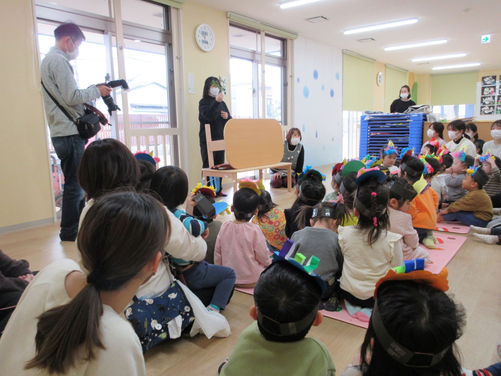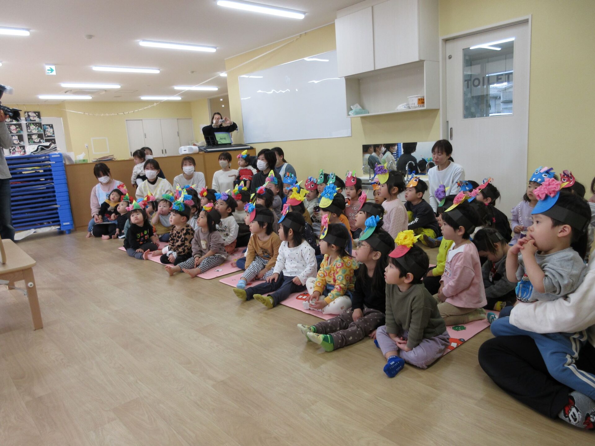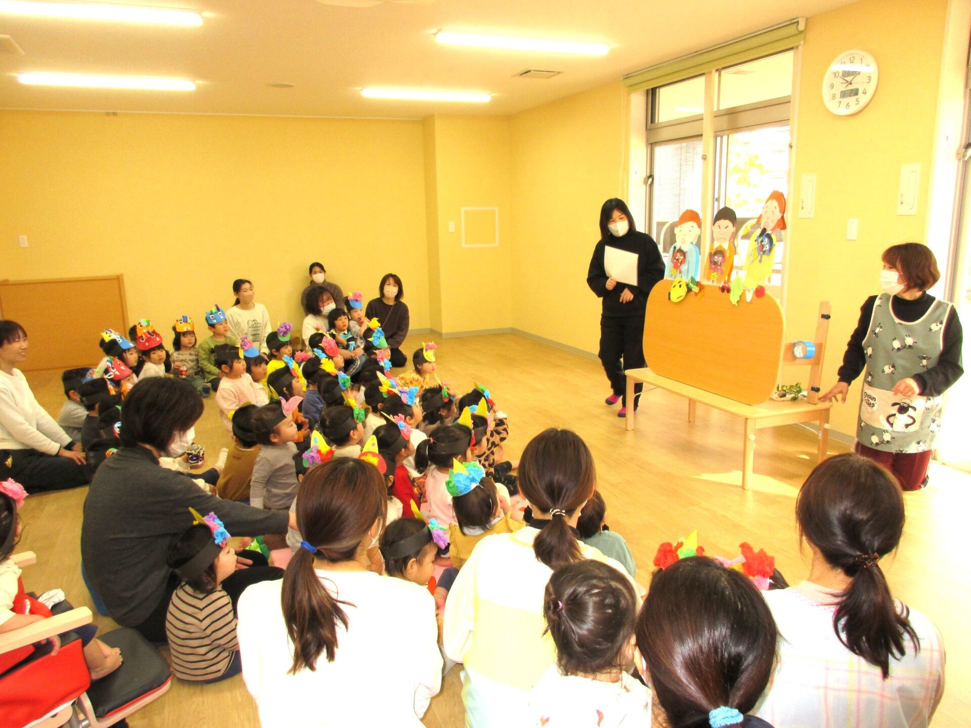 2月2日(金)、今日は園の節分の行事です。1階だいち組の隣の部屋に集まり、先生からお話を聞きました。
