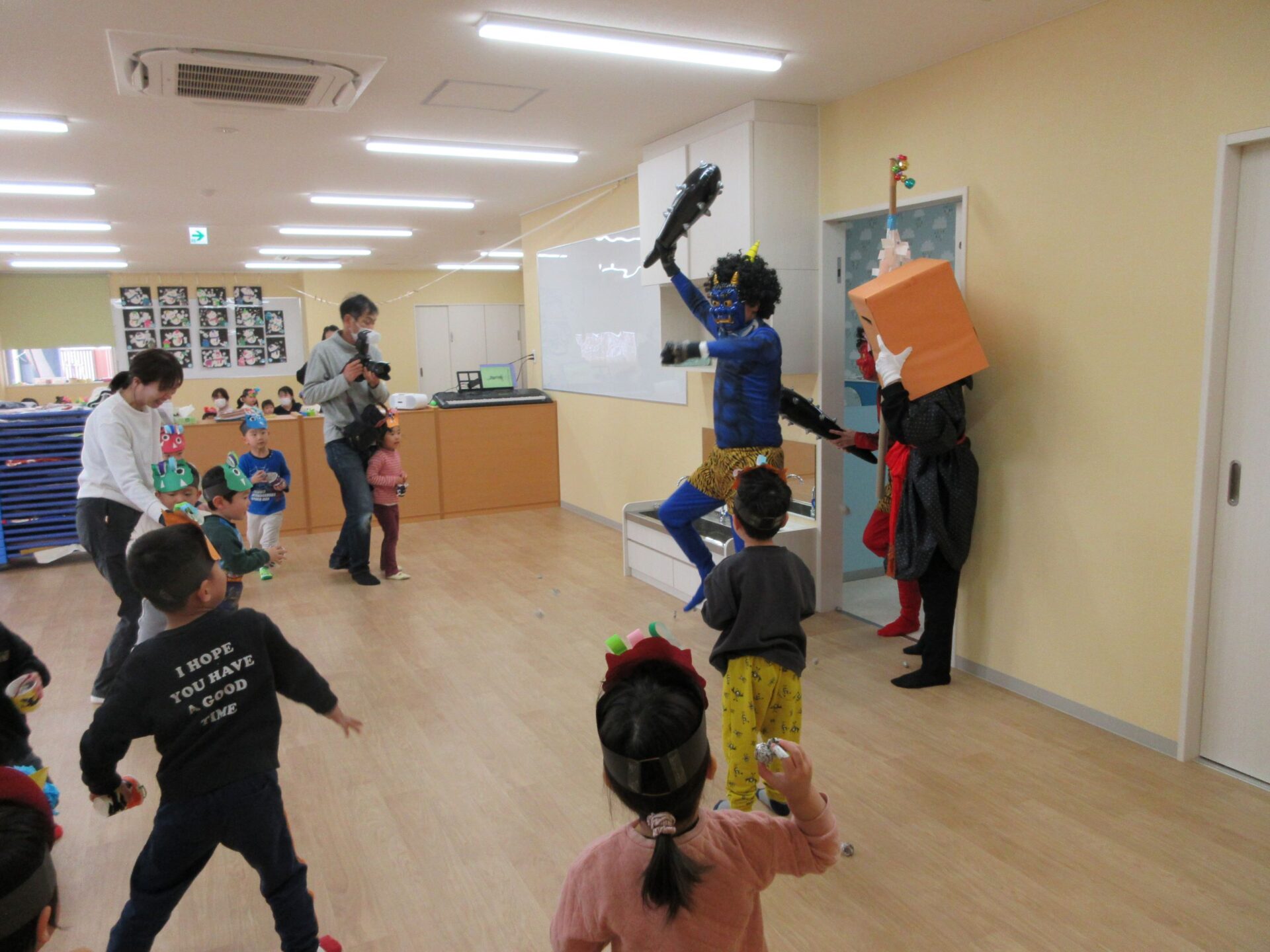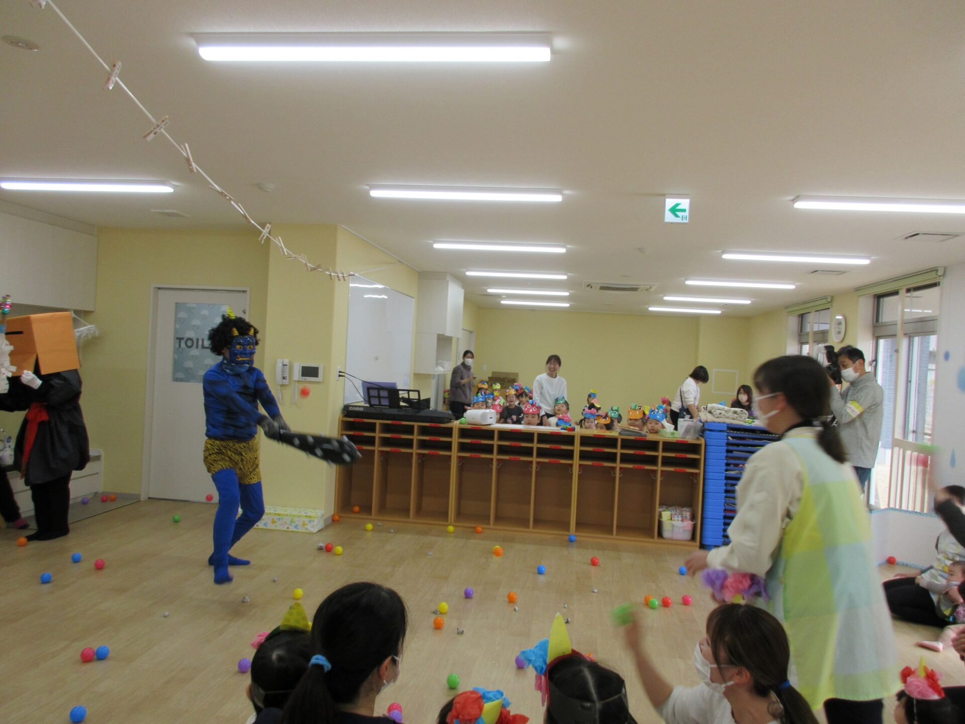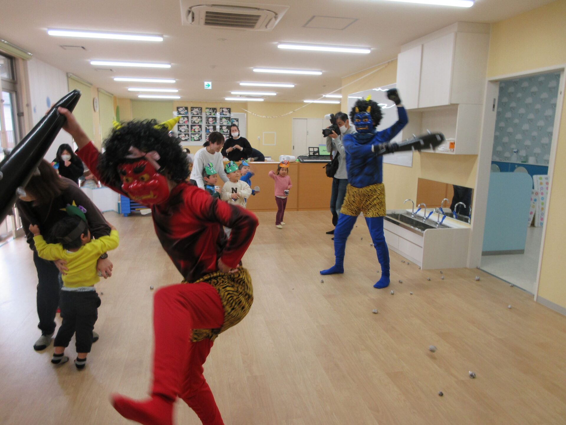 やっと出ていったと思っていたら、今度は2歳あめ組と3歳にじ組の部屋にも鬼がやってきました。