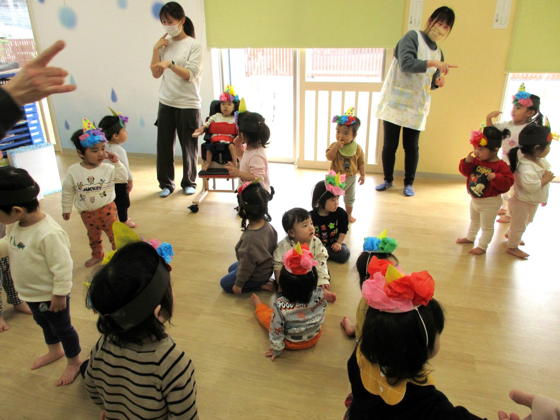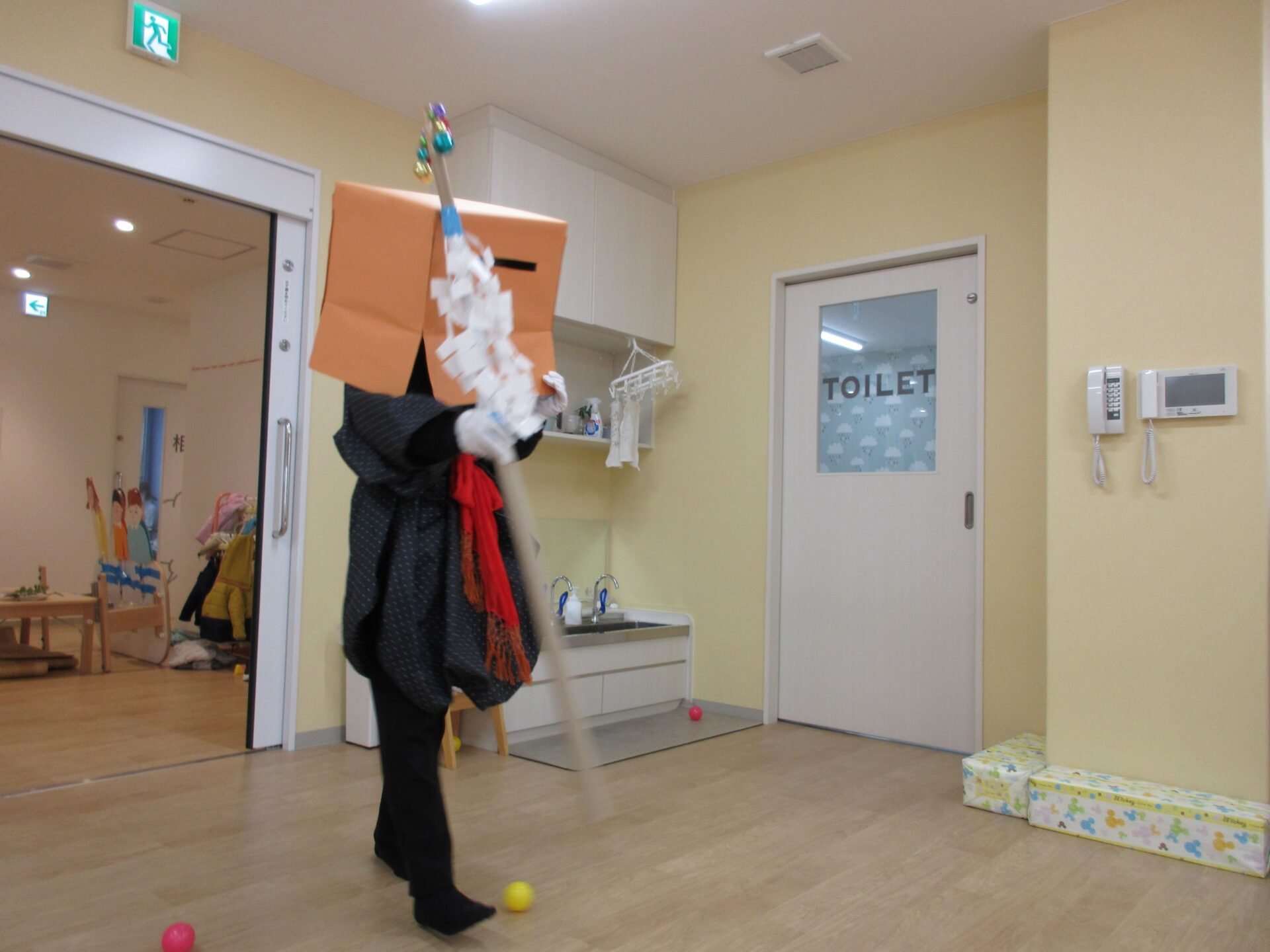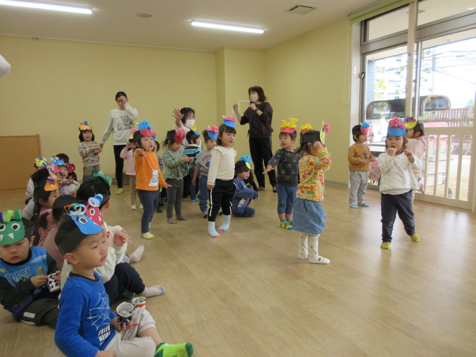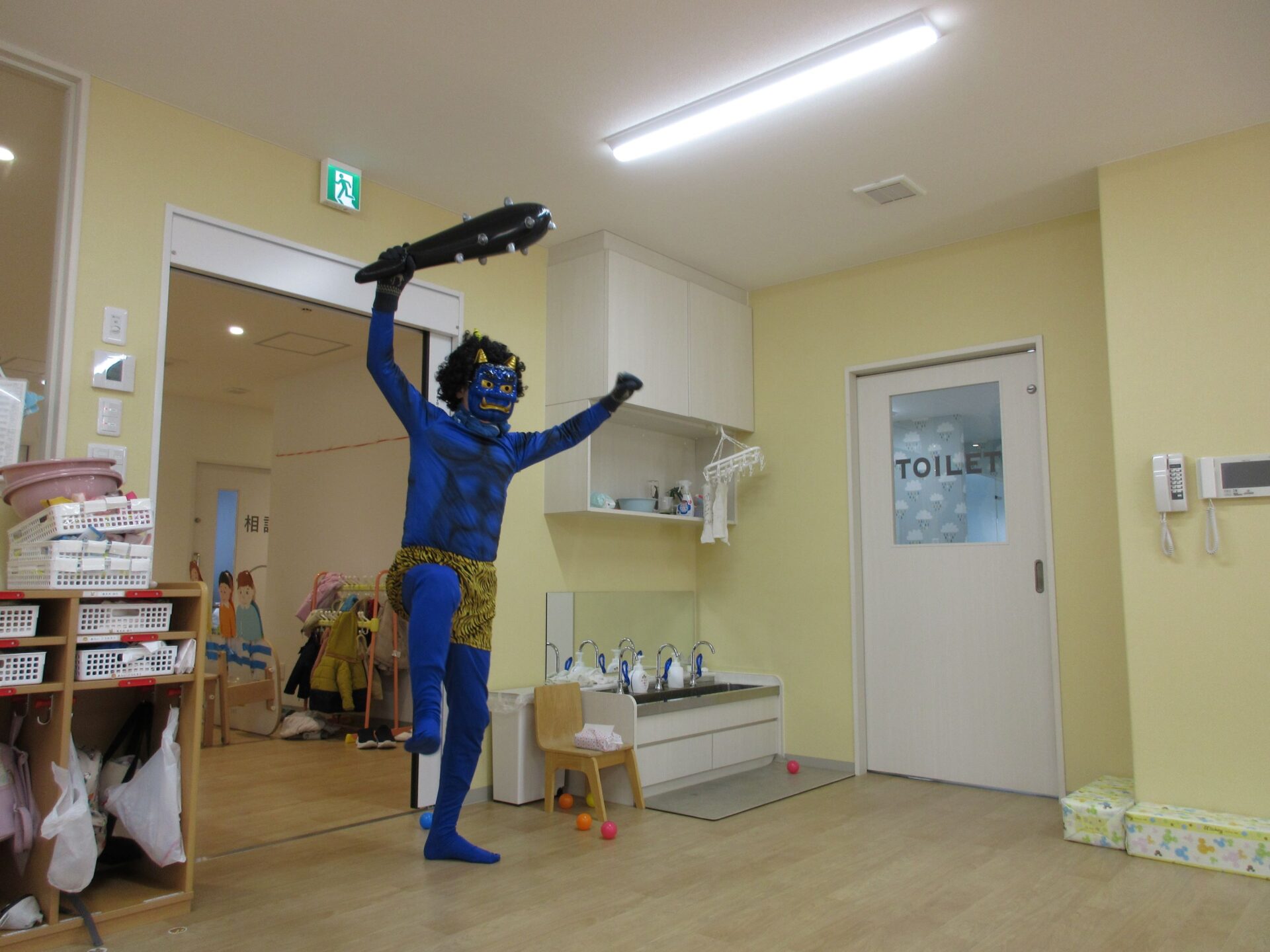 やっと出ていったと思っていたら、今度は2歳あめ組と3歳にじ組の部屋にも鬼がやってきました。