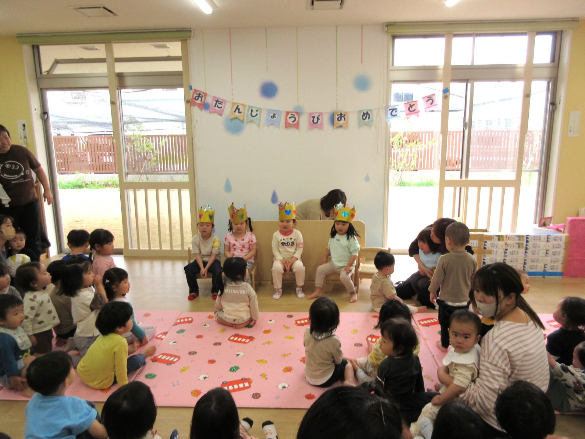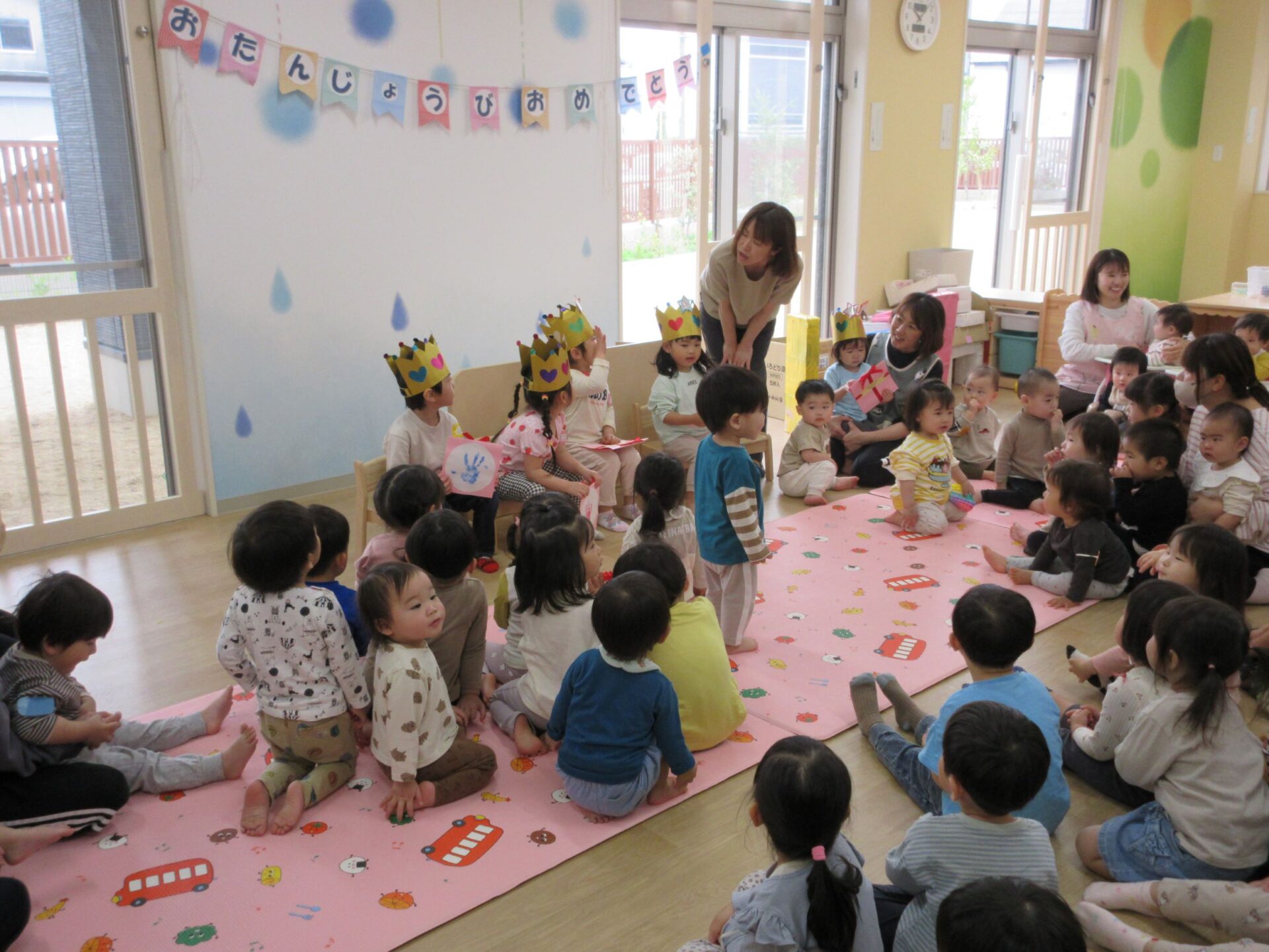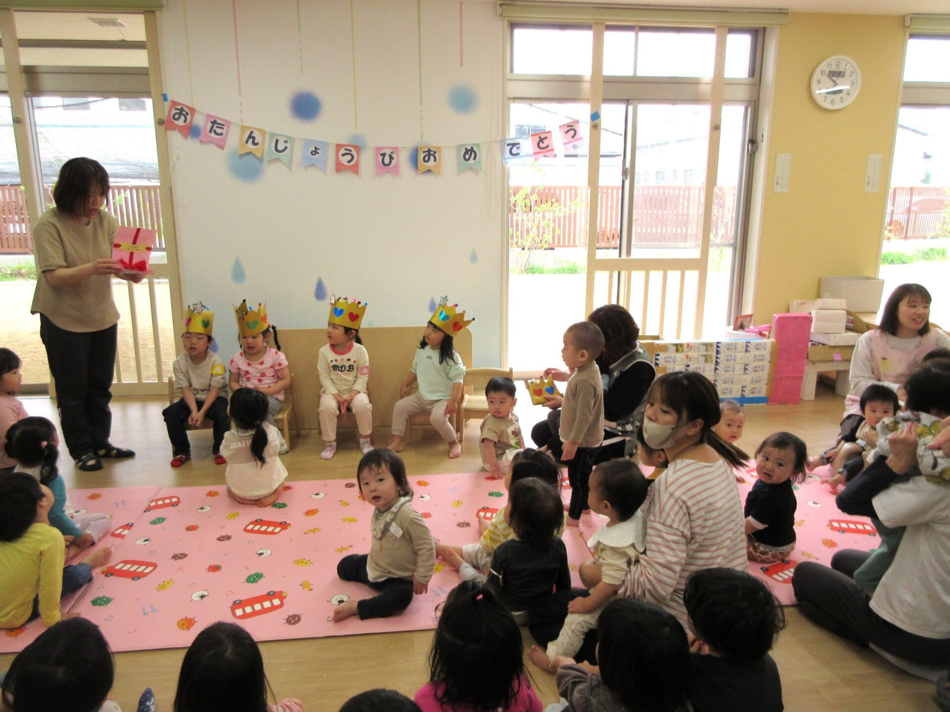 4月18日(木)、1階だいち組の保育室で、誕生会を行いました。今回、誕生日を迎える4月生まれは、5名です。冠をかぶせてもらい、写真入りのカードを受け取りました。