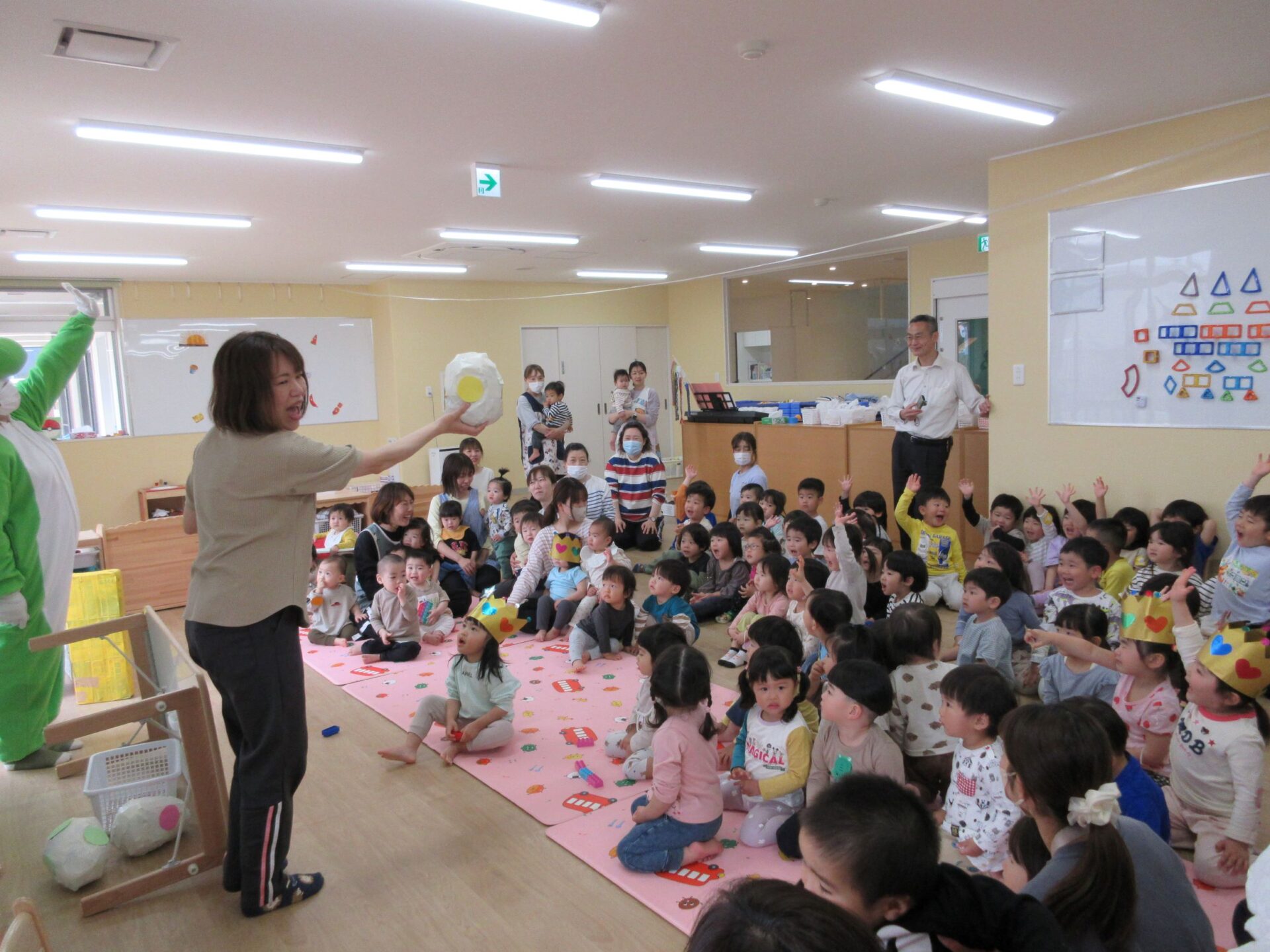 何色の卵クイズをしました。「〇〇色と思う人!」、「はーい!」