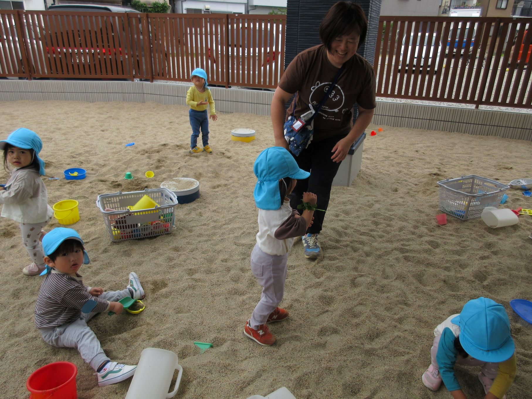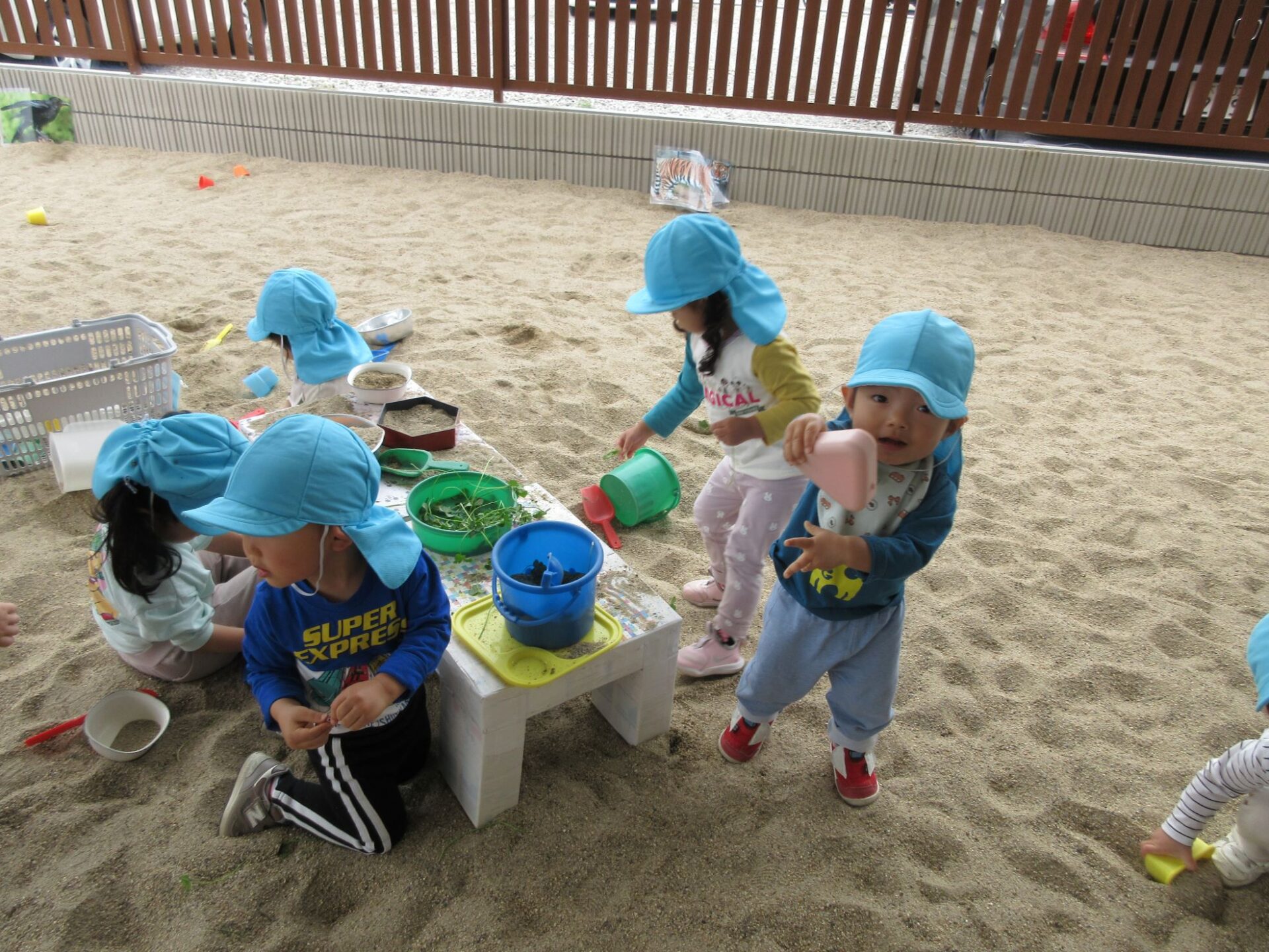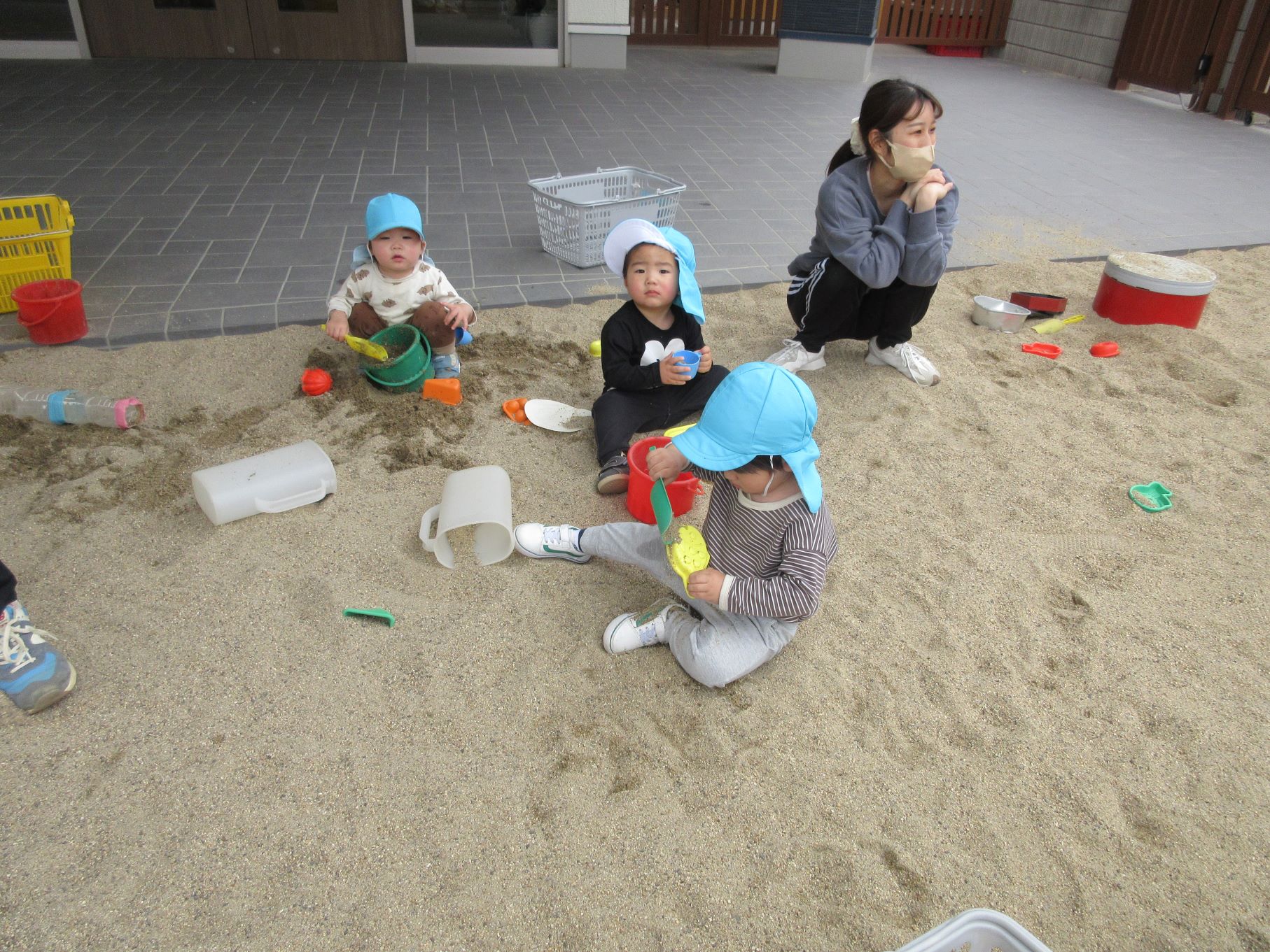 誕生会が終わって、砂場での様子です。2歳あめ組です。