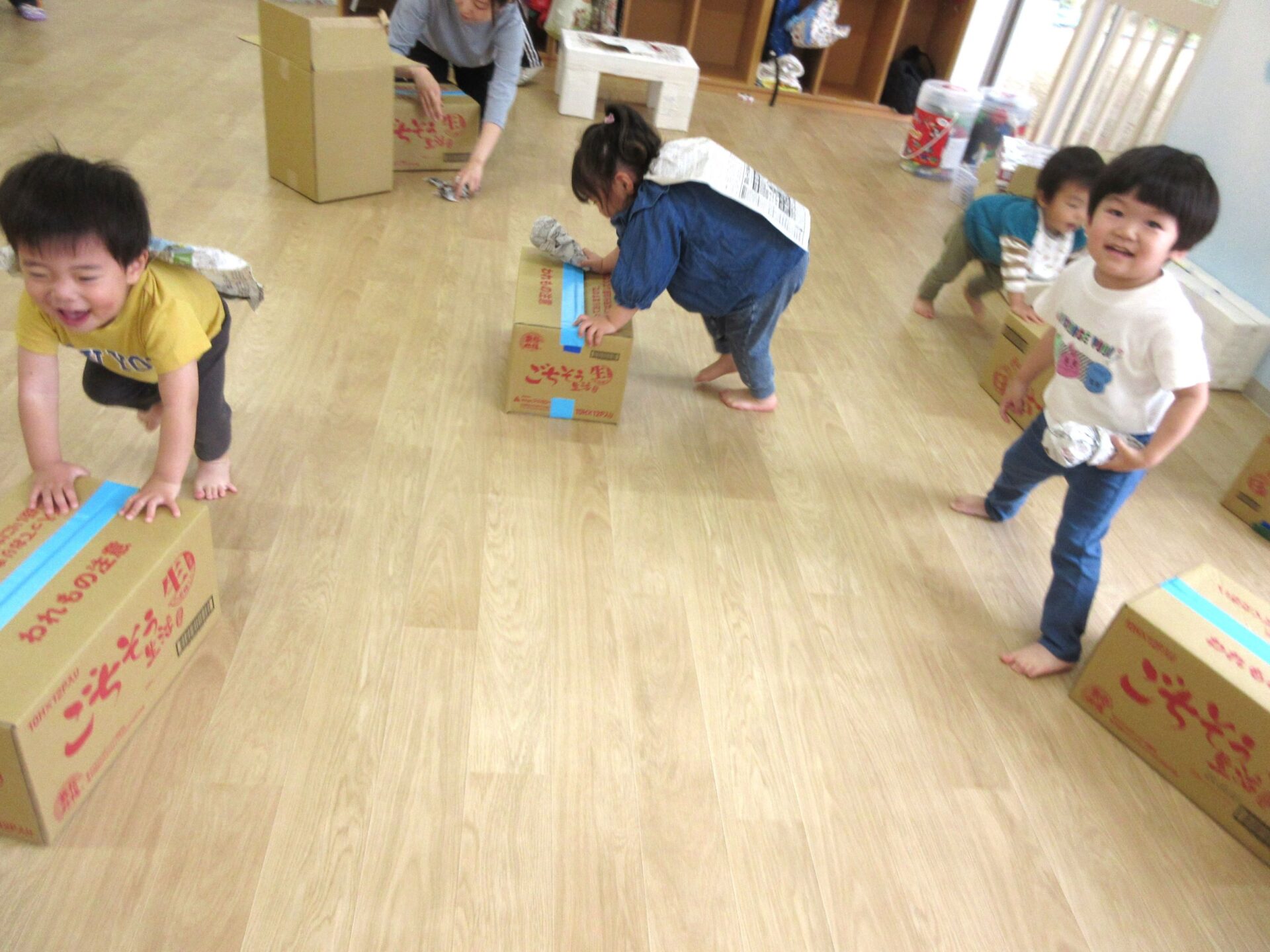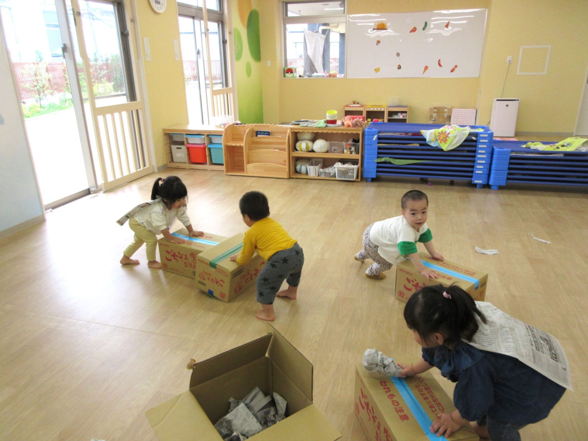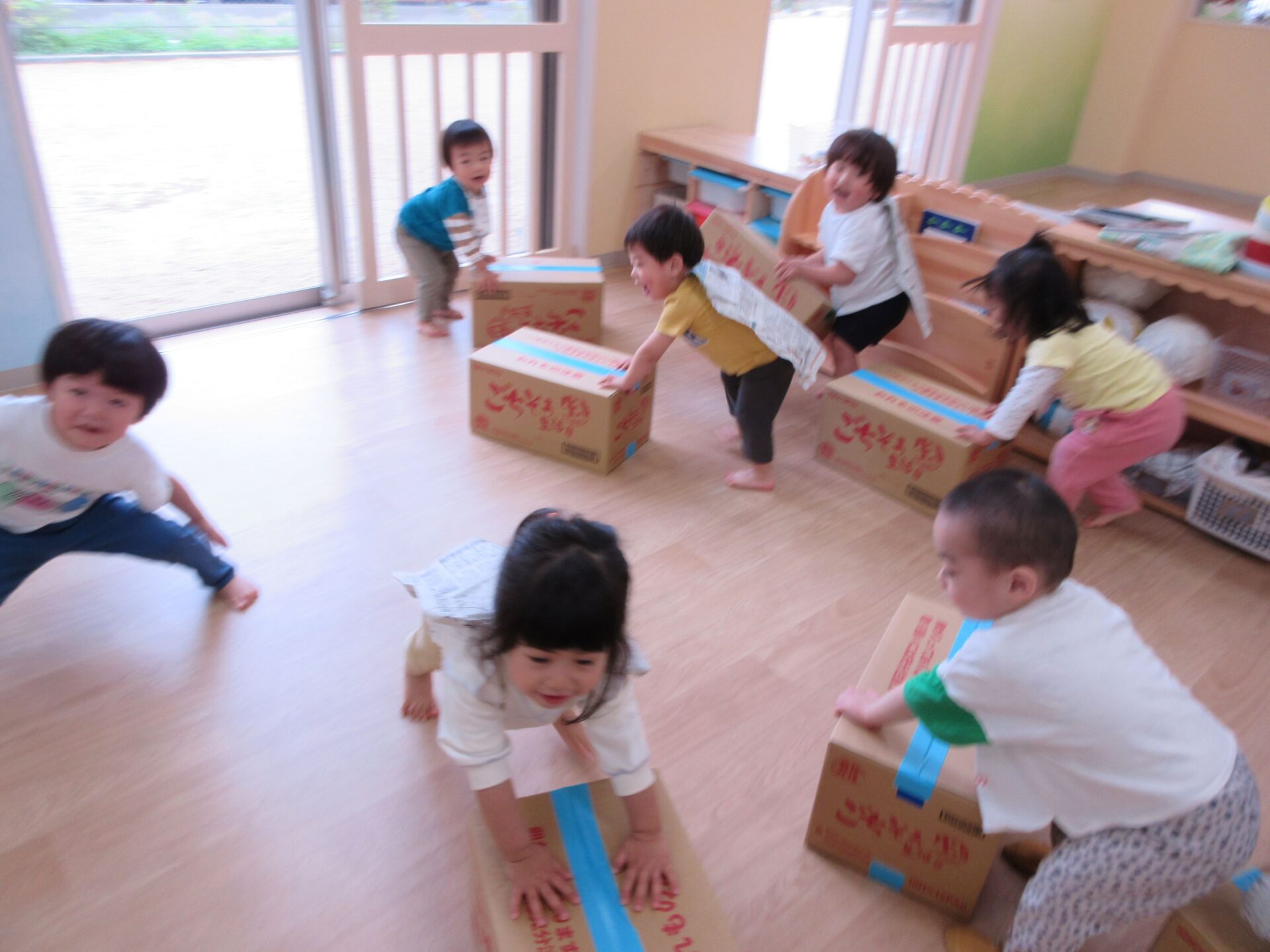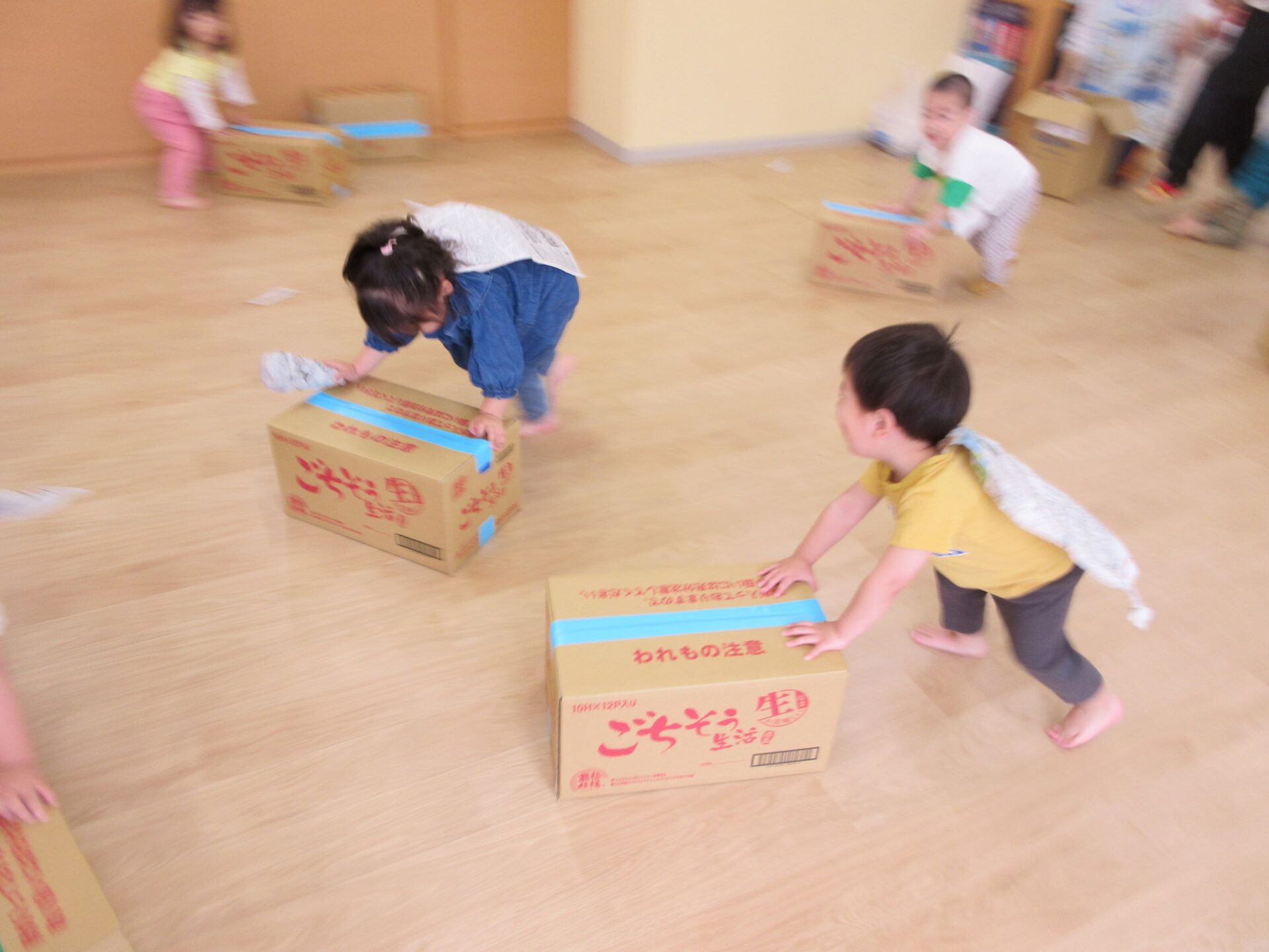 5月1日(水)、2歳あめ組の保育室では、みんなが段ボール箱を押して、走り回っていました。