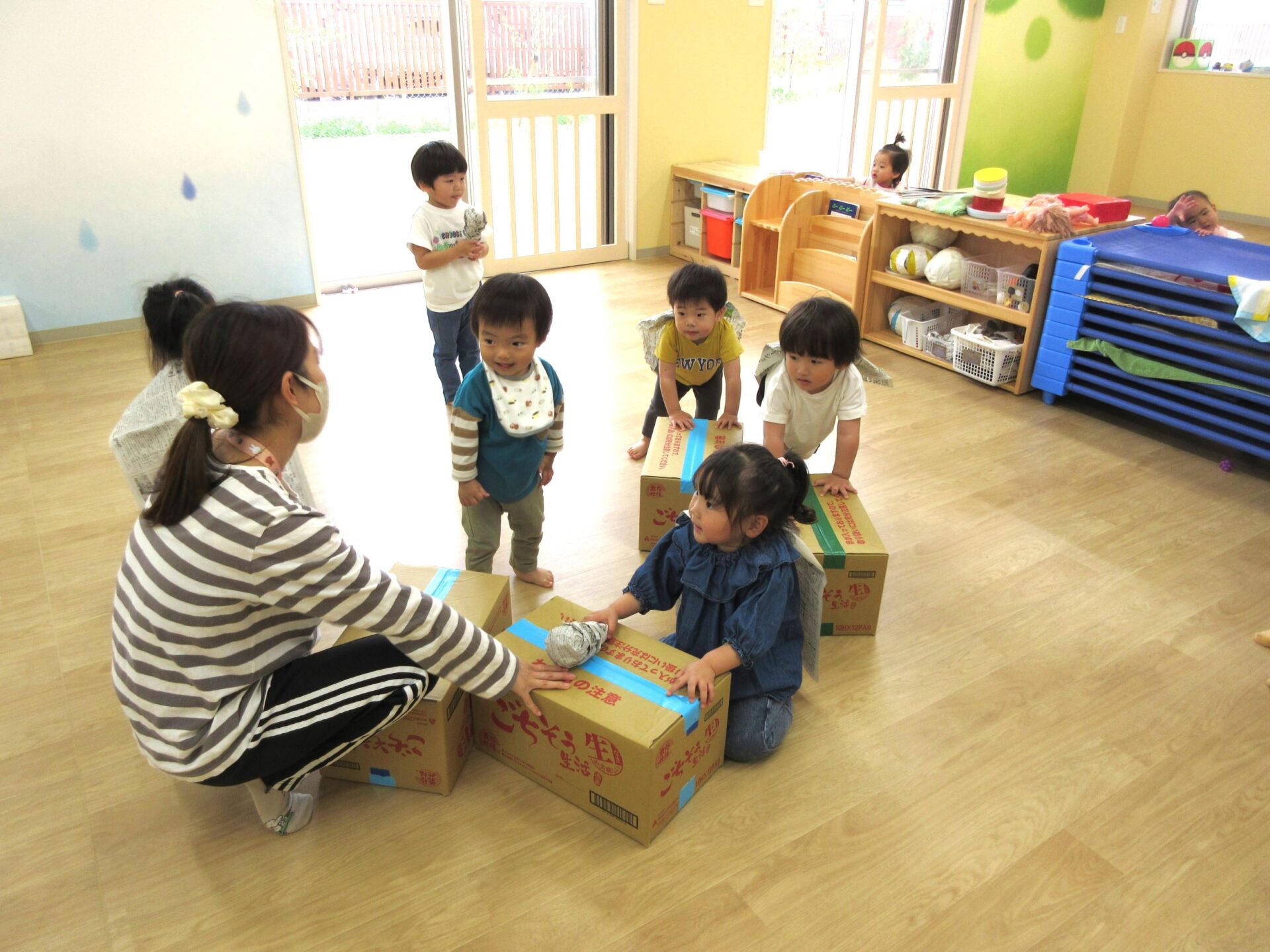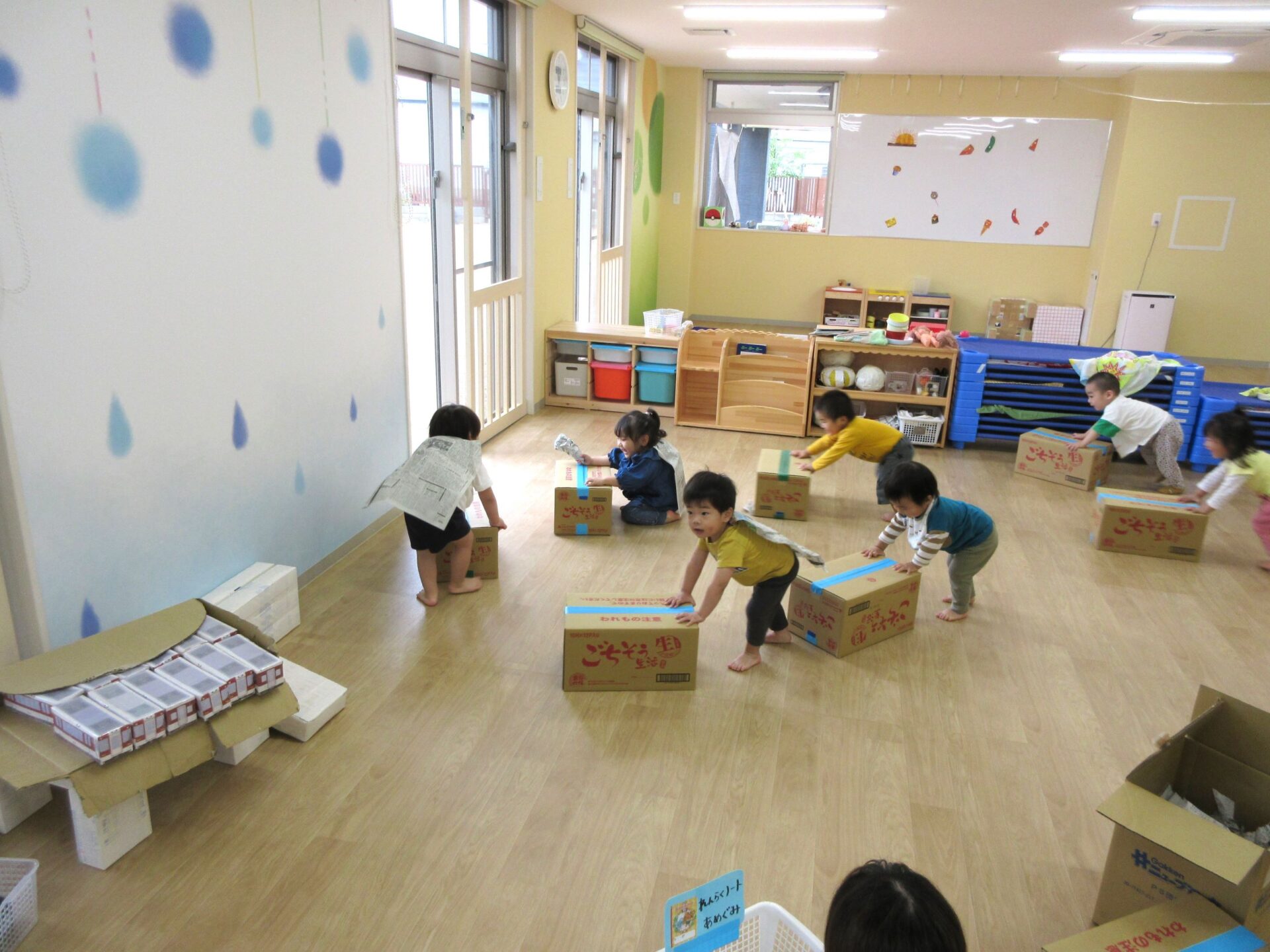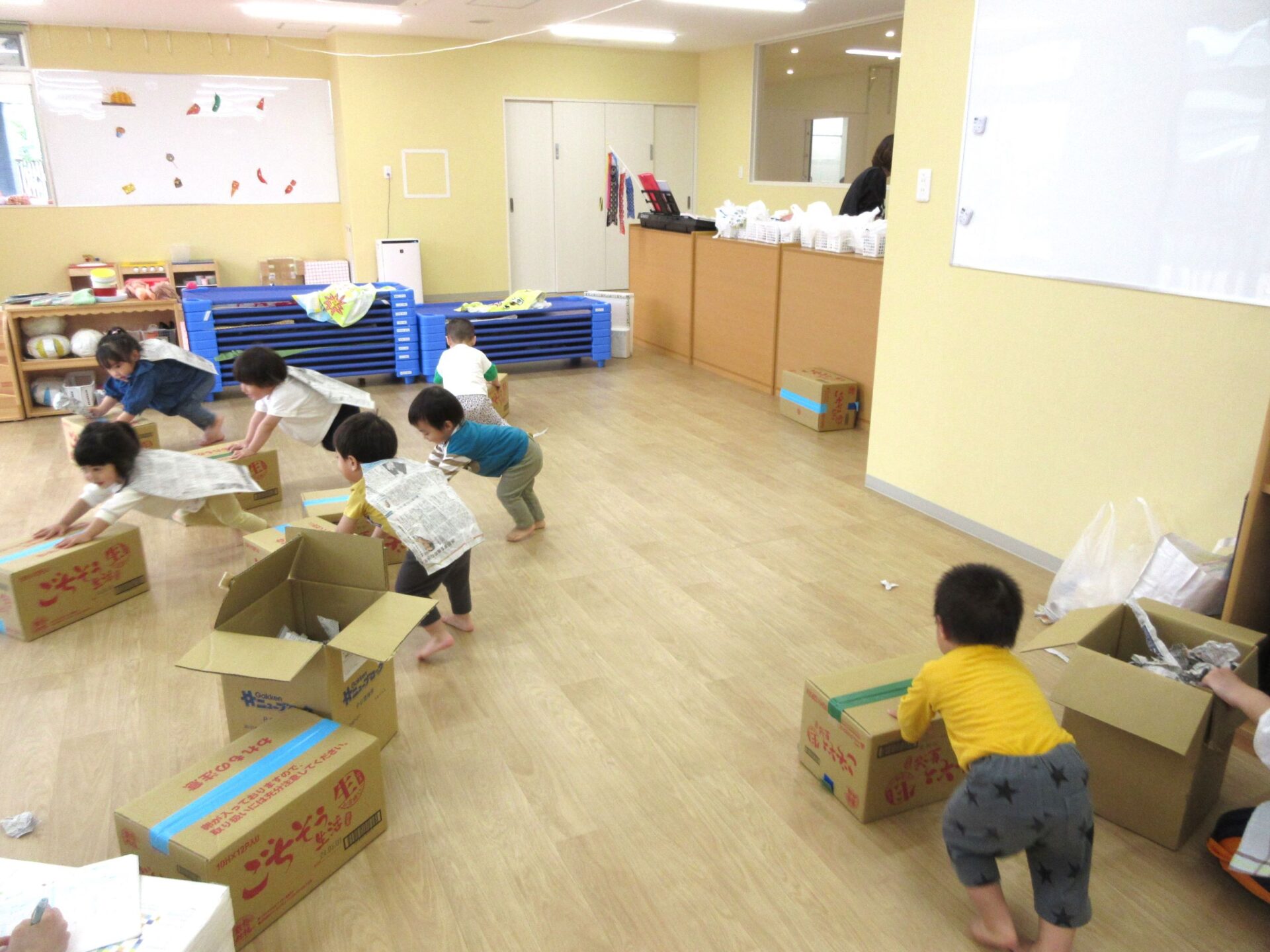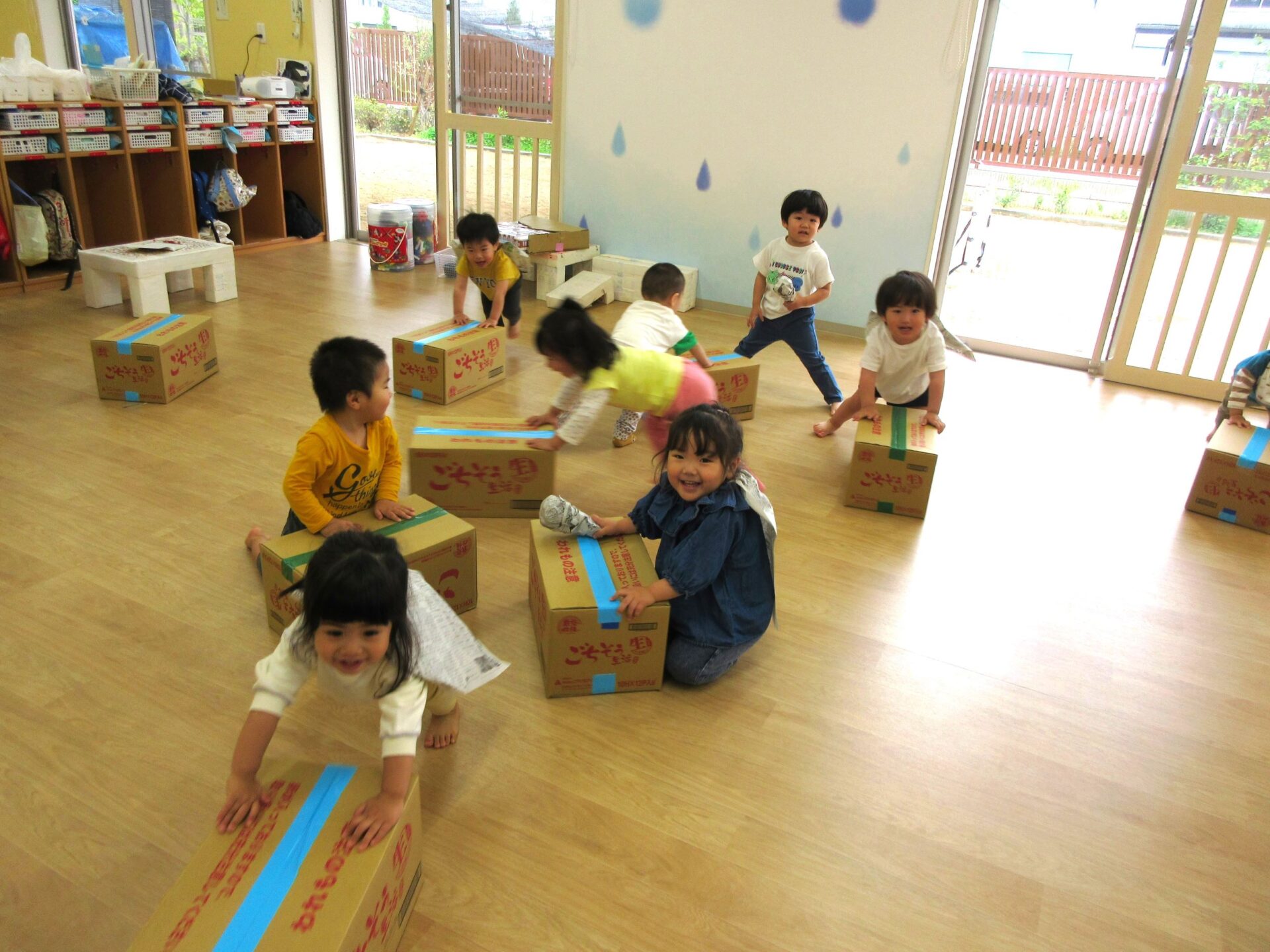 5月1日(水)、2歳あめ組の保育室では、みんなが段ボール箱を押して、走り回っていました。