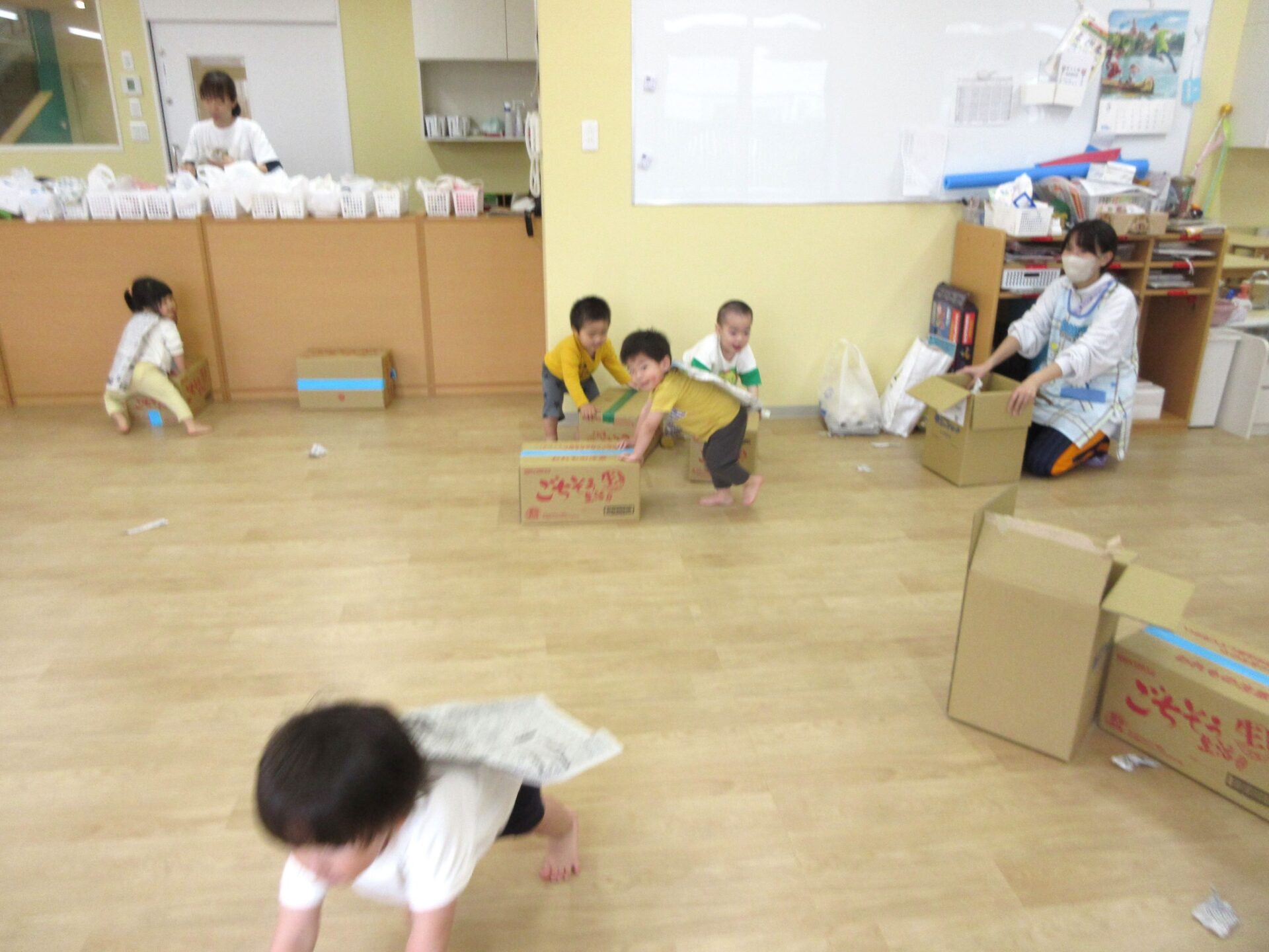みんな、段ボール箱を押しながら部屋中を走り回っています。新聞紙をマントのようにしている人もいます。