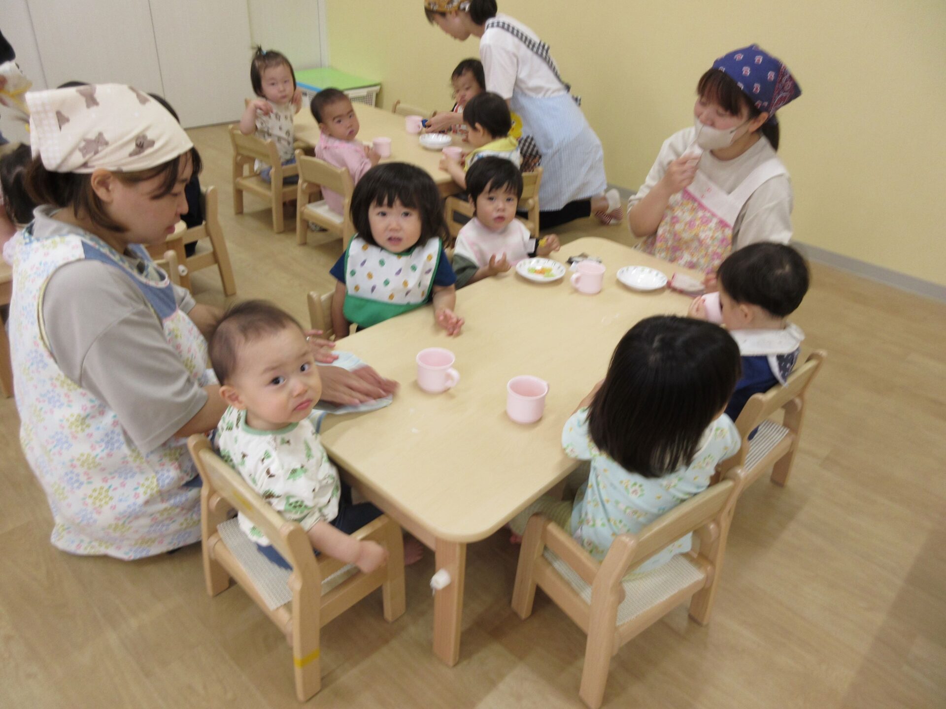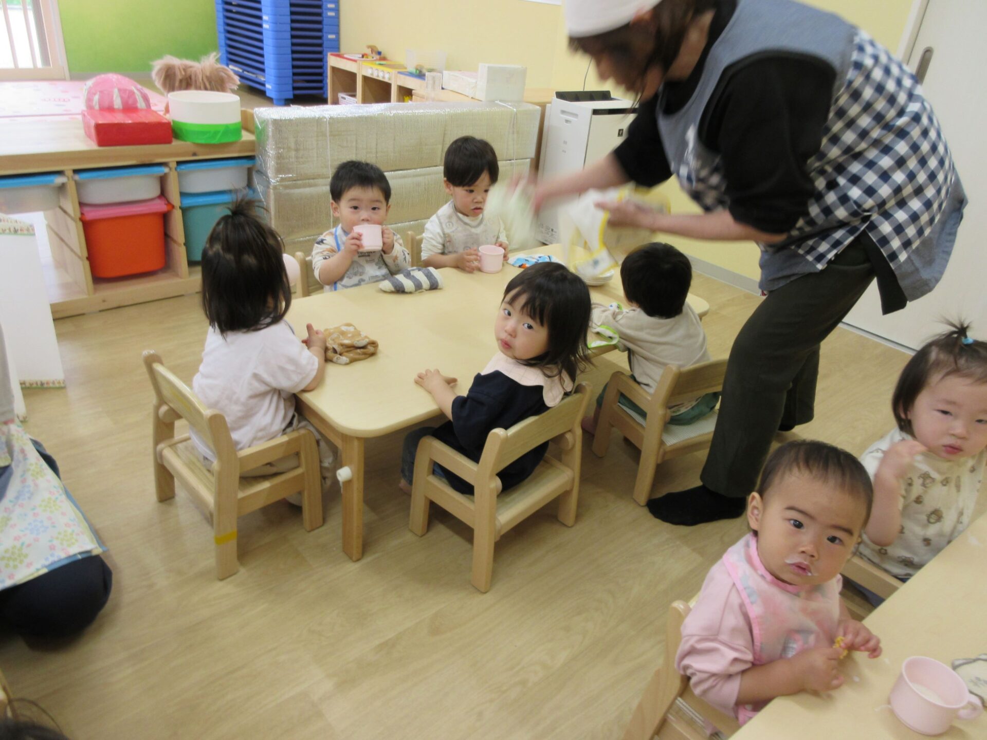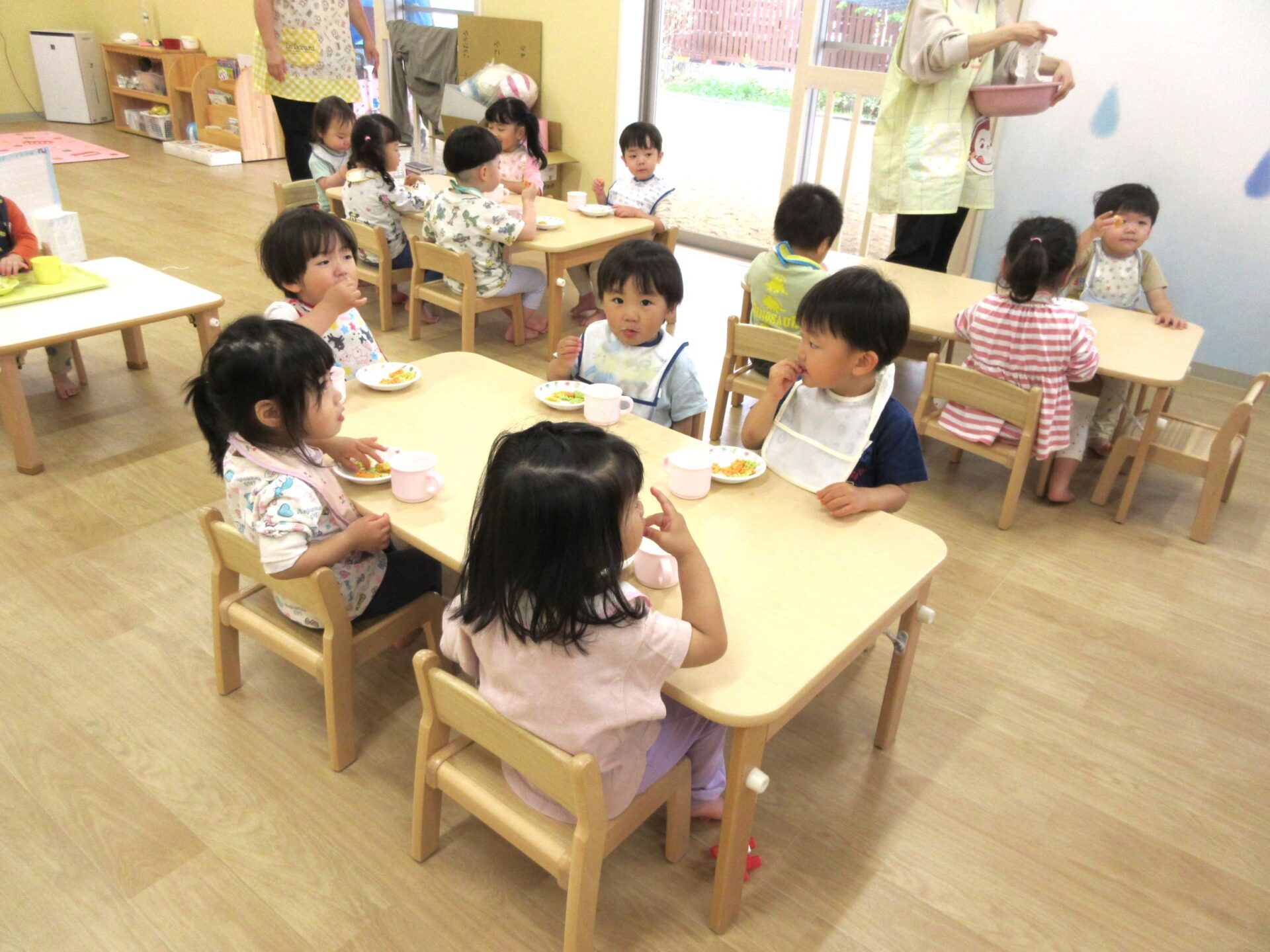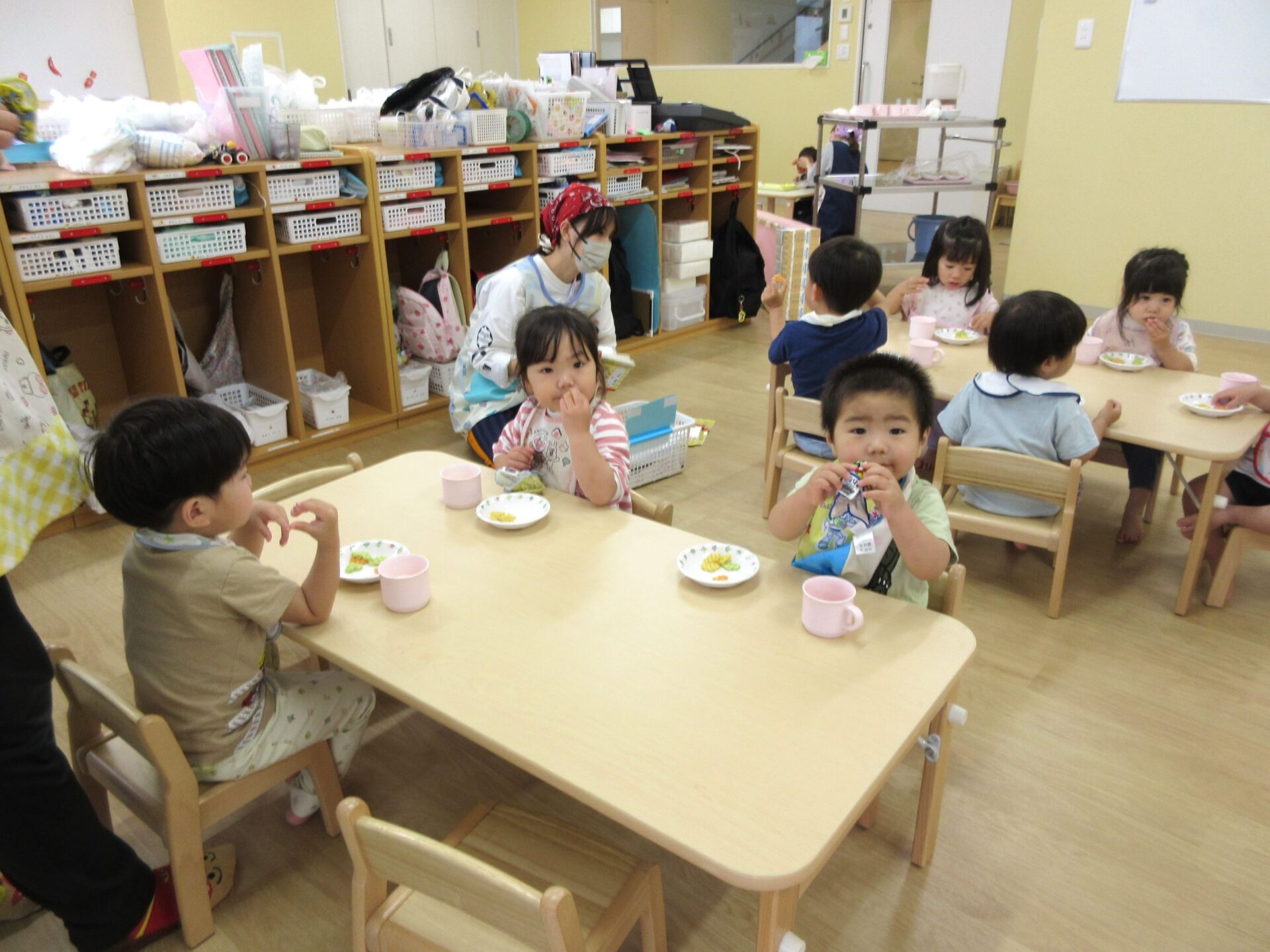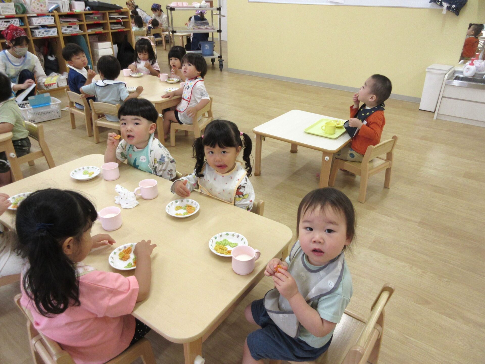 2024.05.09 お知らせ ブログ 朝おやつの様子 ゴールデンウィーク明けの5月7日(火)、1歳だいち組の朝おやつの様子です。 この日のおやつは、「べじたべる」と牛乳でした。 美味しくいただきました。 1階のだいち組とあめ組の保育室は、この日から模様替えをしました。 こちらは、2歳あめ組の朝おやつの様子です。 おいしそうにいただいています。 おやつは、やっぱりうれしいですね。 一覧へ戻る