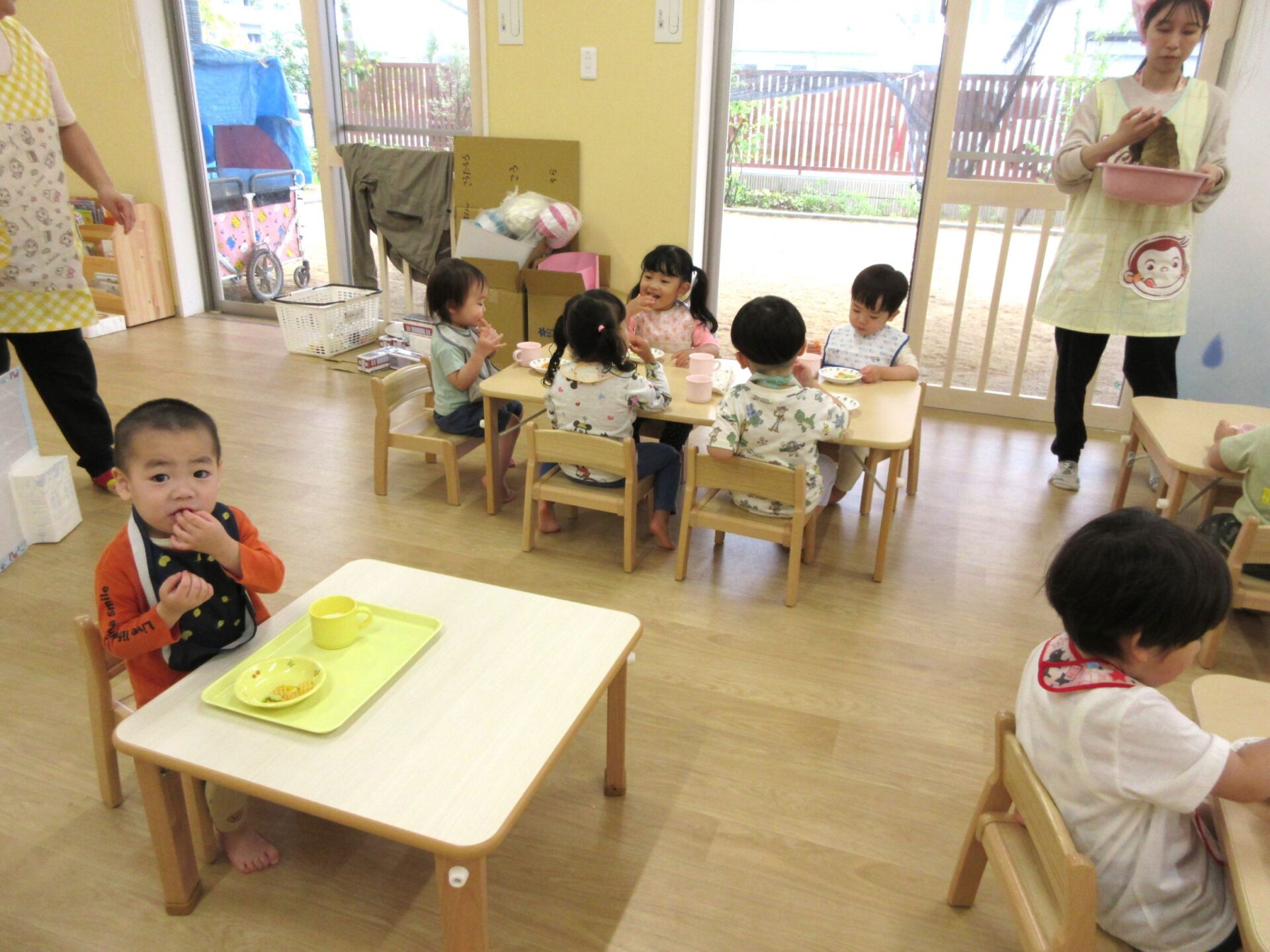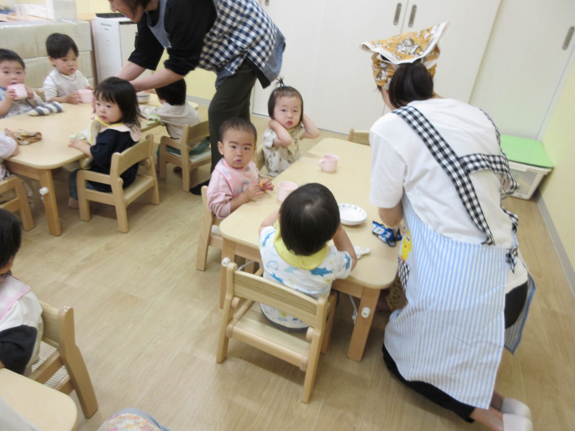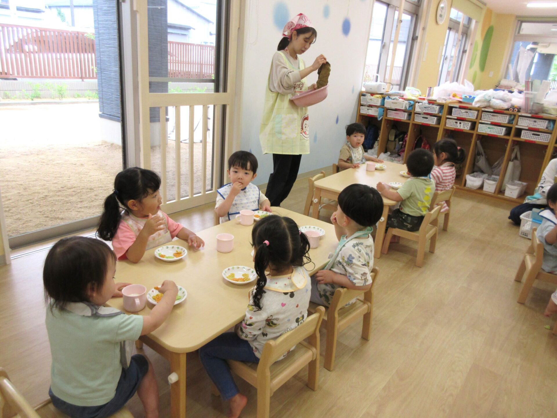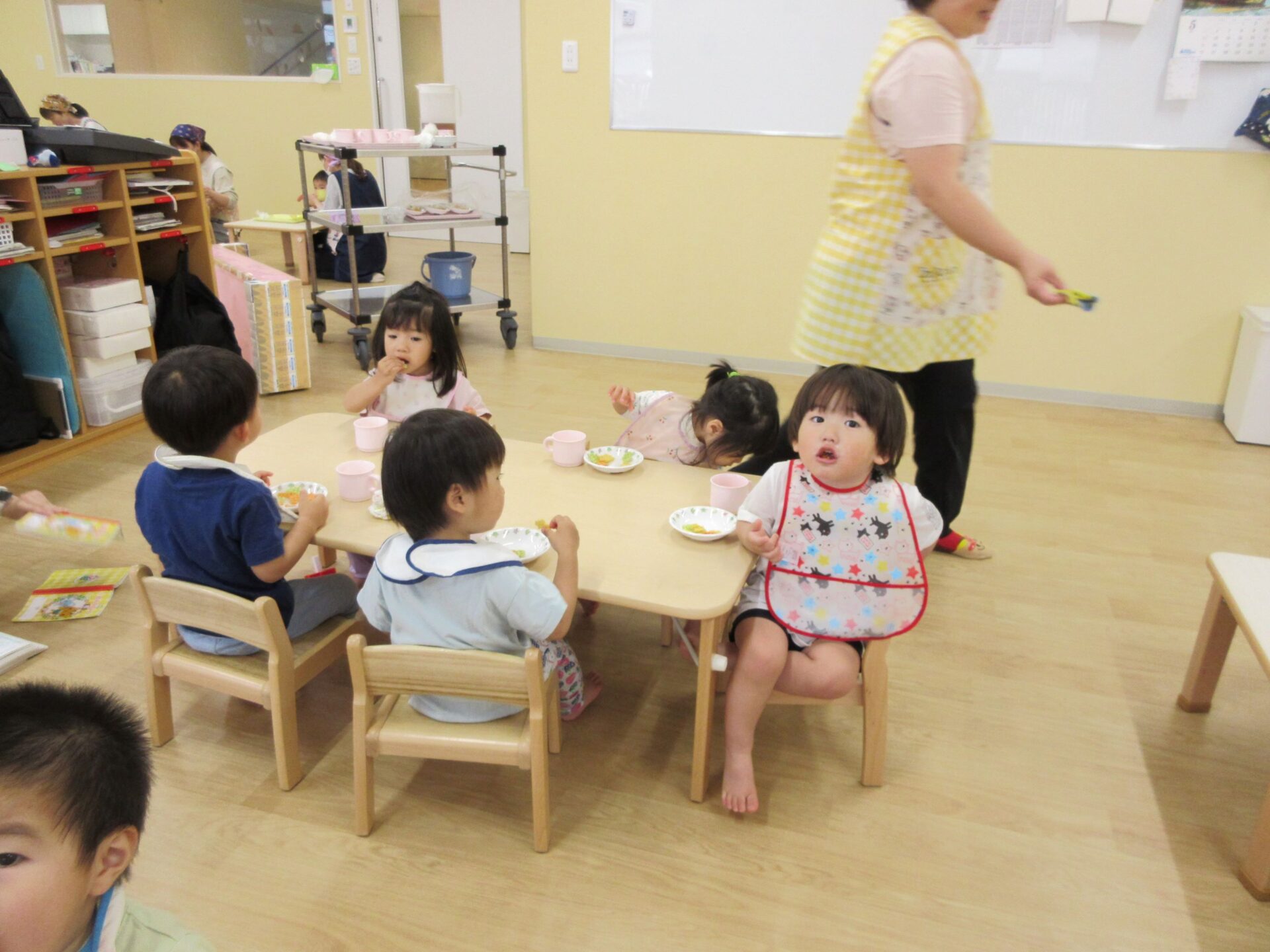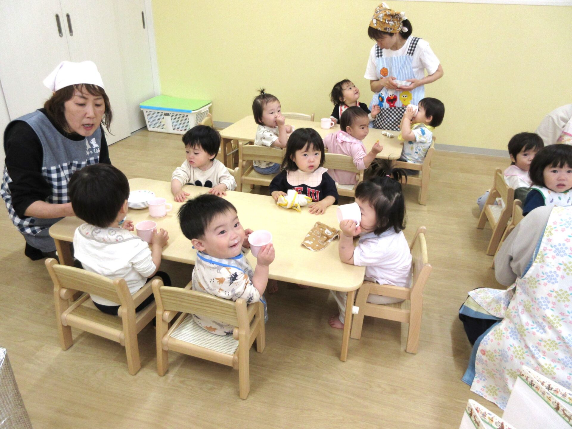 2024.05.09 お知らせ ブログ 朝おやつの様子 ゴールデンウィーク明けの5月7日(火)、1歳だいち組の朝おやつの様子です。 この日のおやつは、「べじたべる」と牛乳でした。 美味しくいただきました。 1階のだいち組とあめ組の保育室は、この日から模様替えをしました。 こちらは、2歳あめ組の朝おやつの様子です。 おいしそうにいただいています。 おやつは、やっぱりうれしいですね。 一覧へ戻る