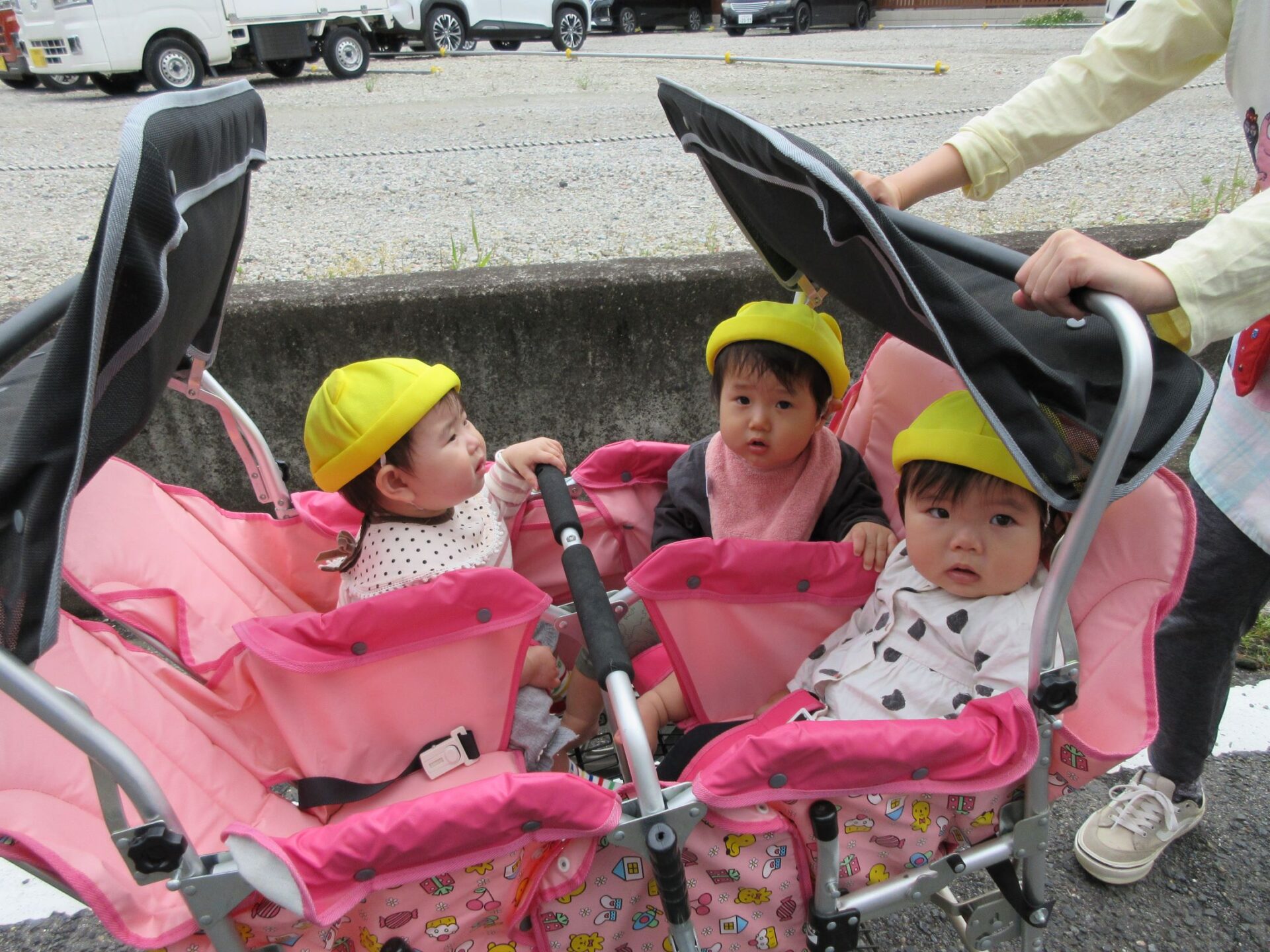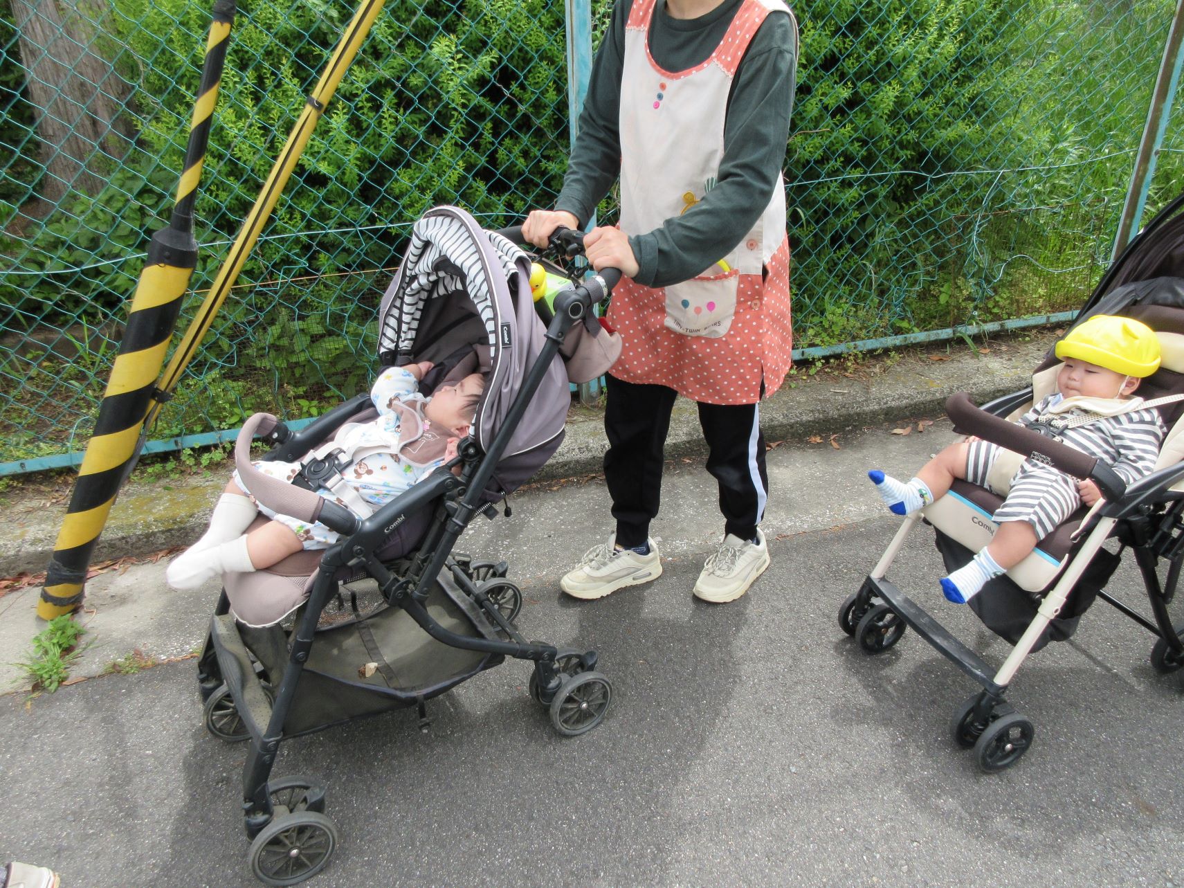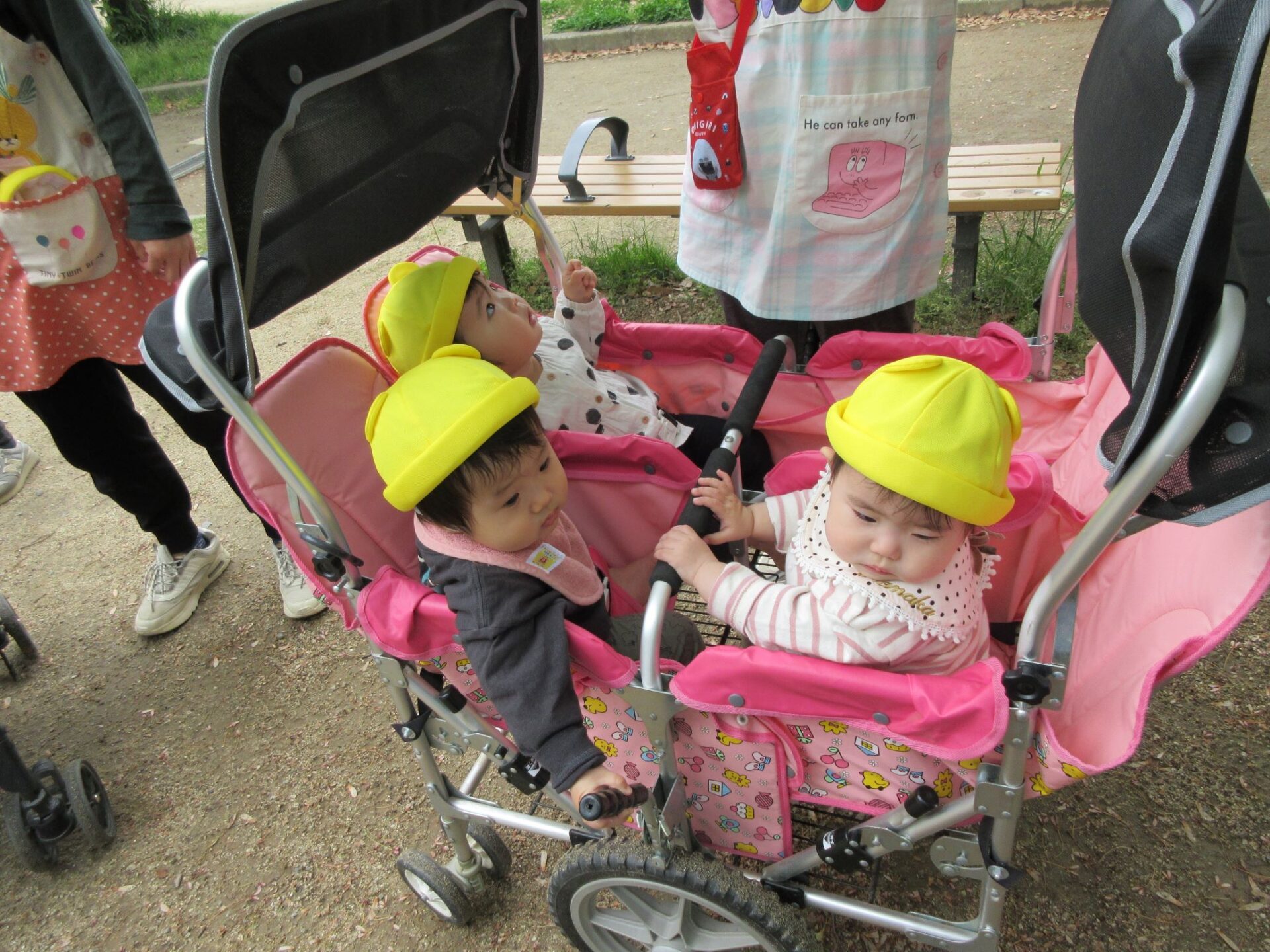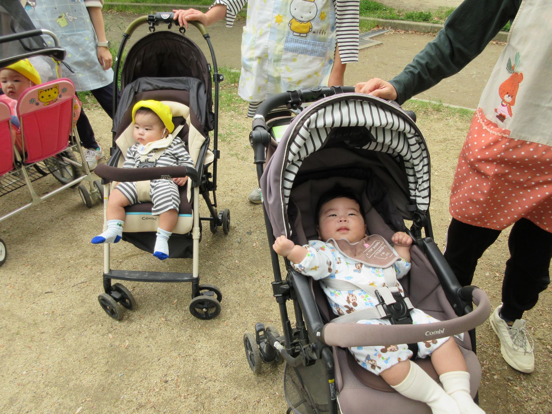 5月8日(水)、0歳うみ組は、お散歩カーとベビーカーに乗って、美園公園へ出発しました。