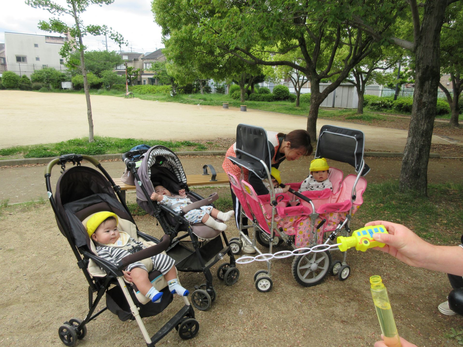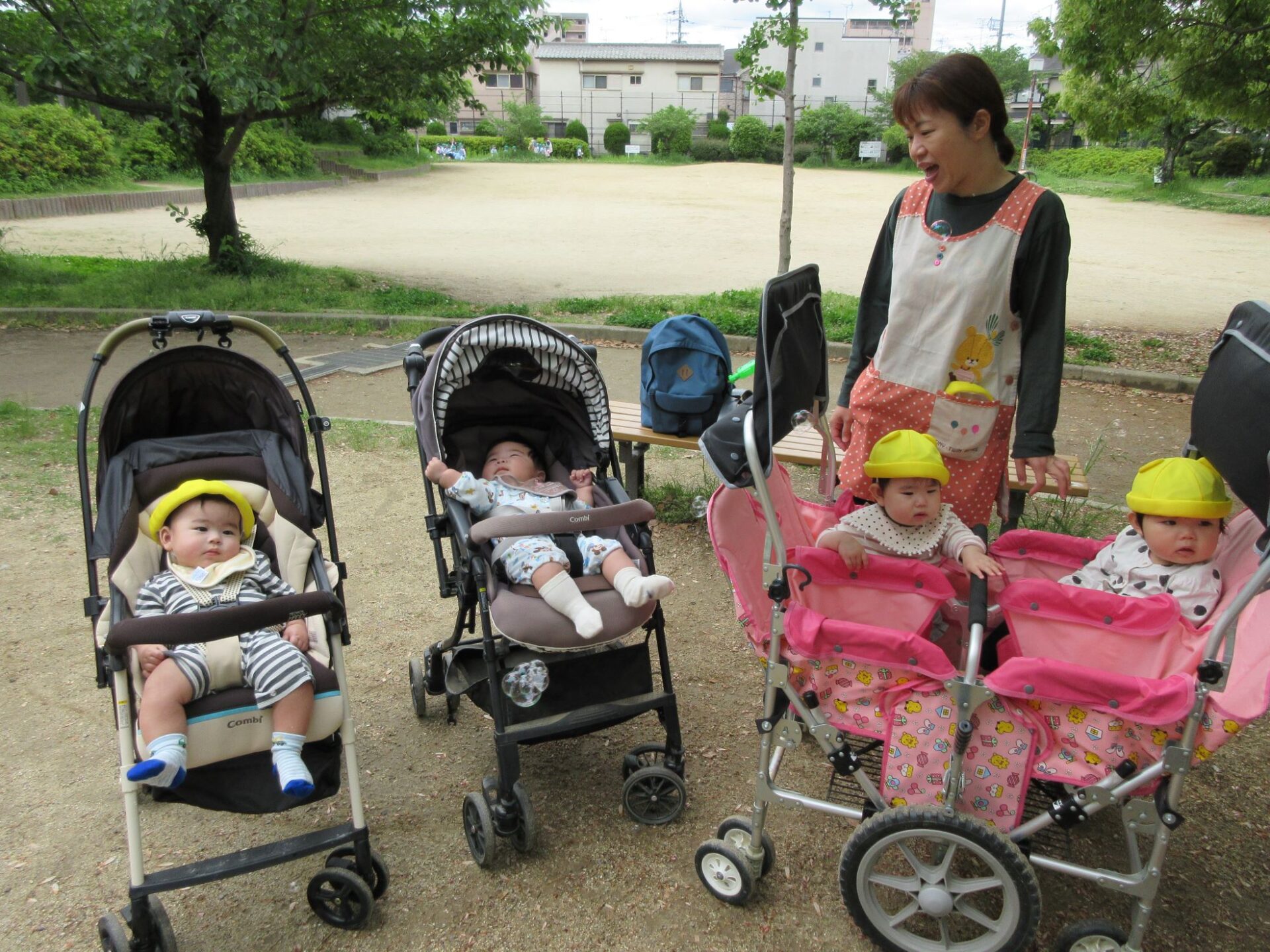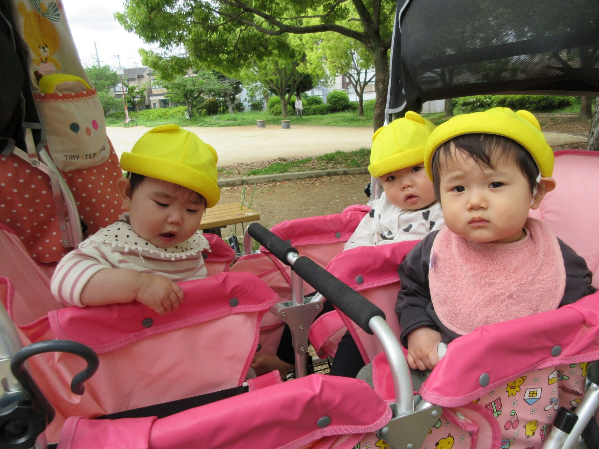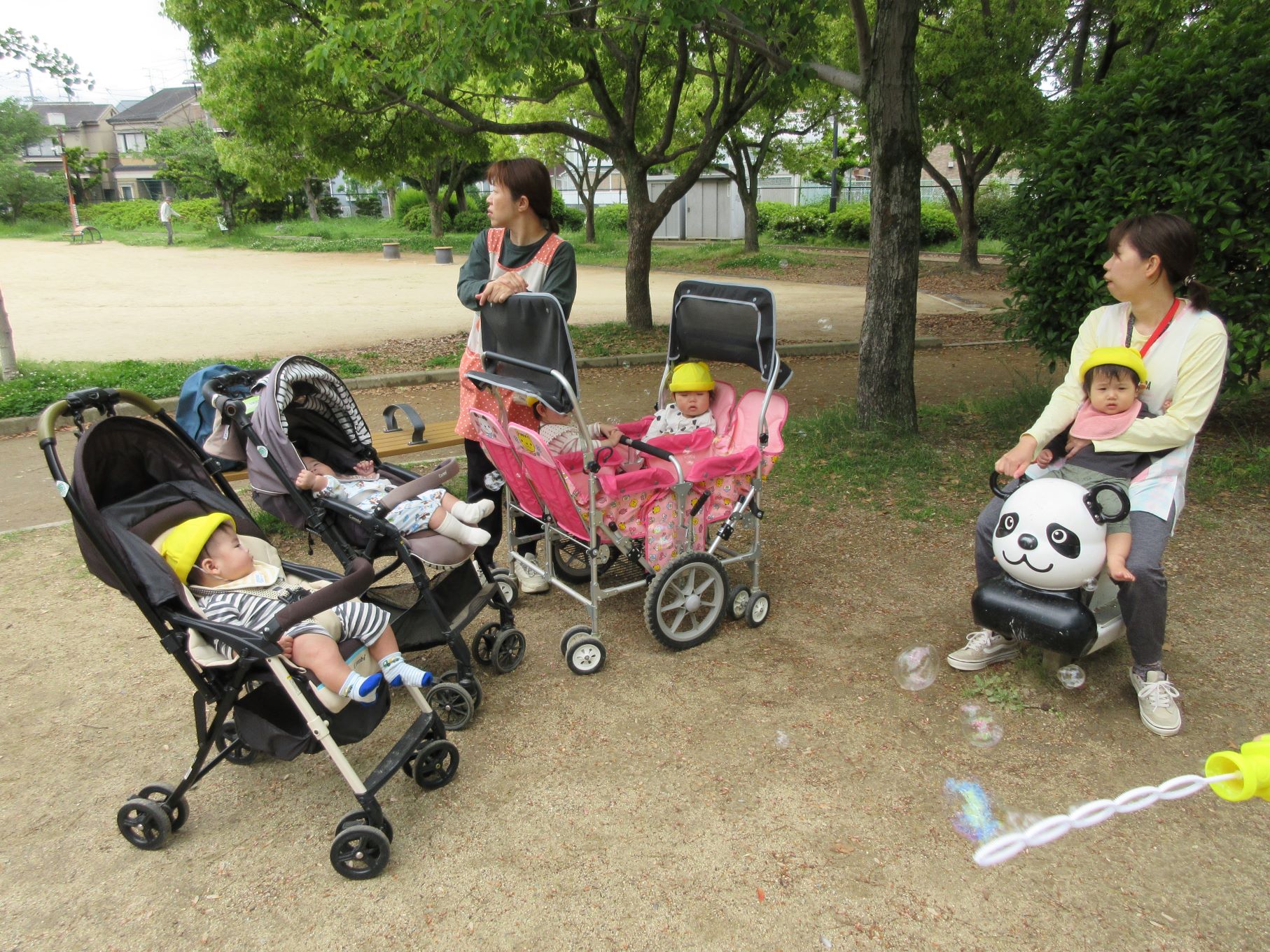 5月8日(水)、0歳うみ組は、お散歩カーとベビーカーに乗って、美園公園へ出発しました。
