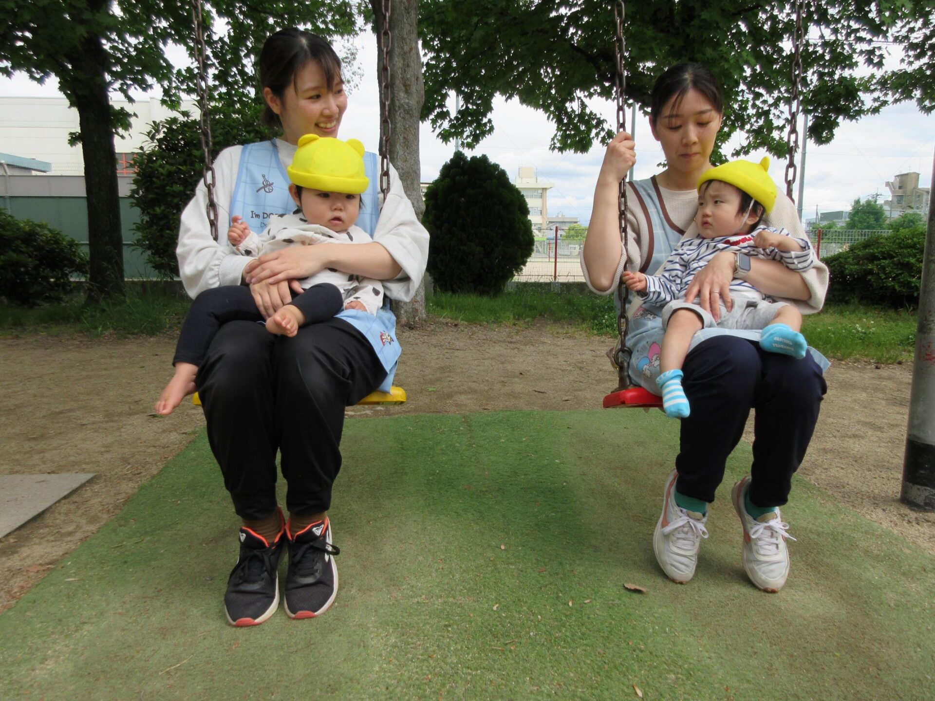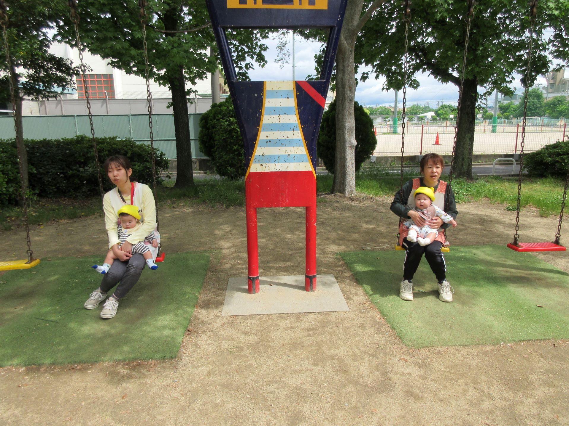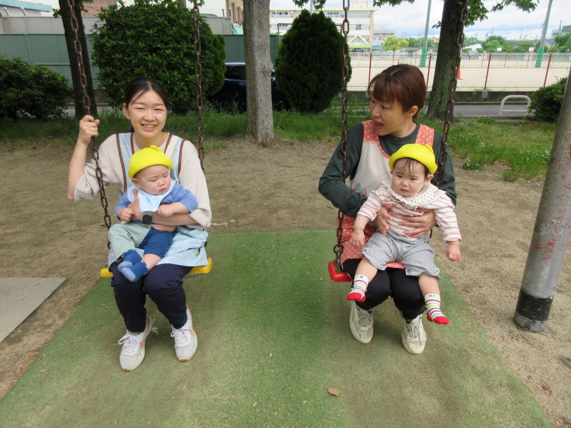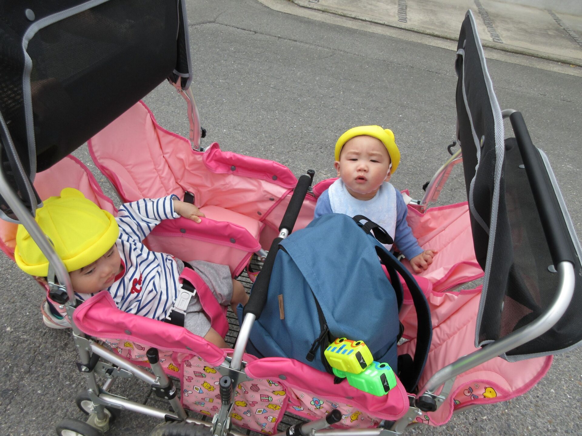 5月8日(水)、0歳うみ組は、お散歩カーとベビーカーに乗って、美園公園へ出発しました。