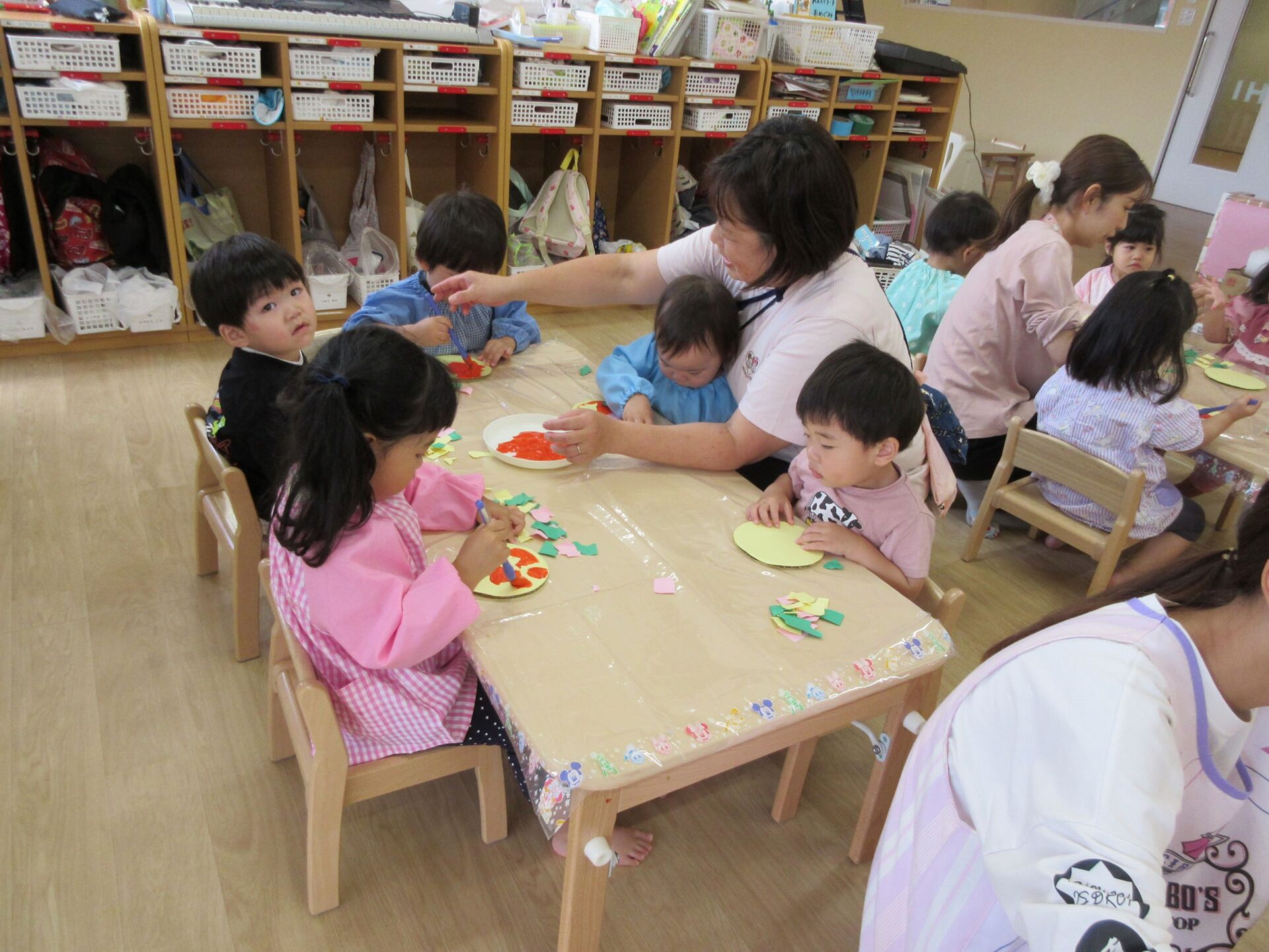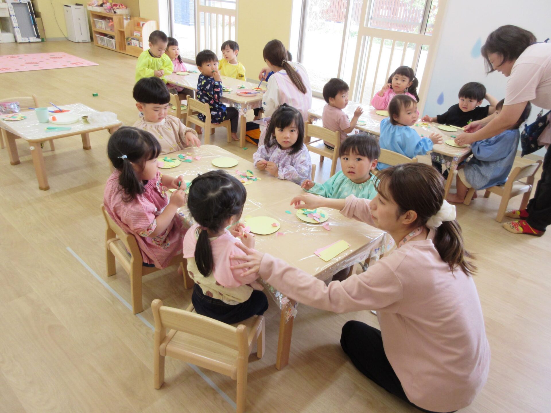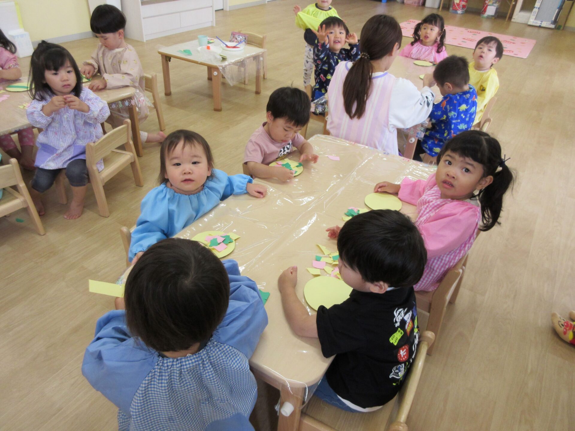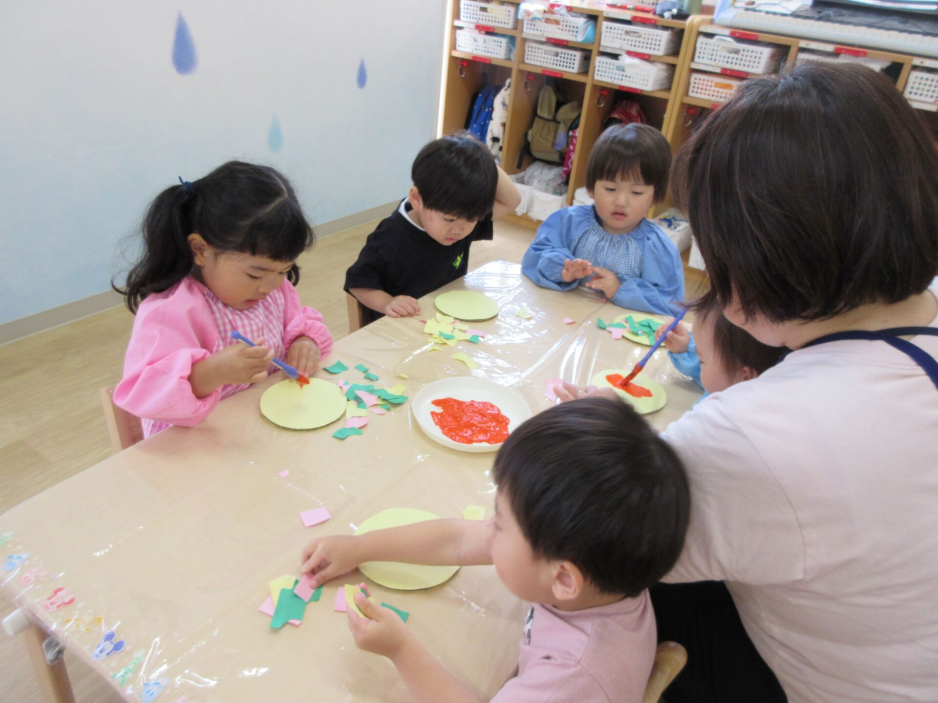 2024.05.24 お知らせ ブログ ピザを作りました。 5月23日(木)、2歳あめ組は何か制作しています。 丸いお皿のような紙、小さく切ったいろんな色の紙。 「みんな、何をつくっているの?」 「ピザ!」 ピザ生地(紙)に、トマトソース(のり)を塗って、その上に具をのせて貼って作るんですね。 おいしそうなピザができそうです。 すごく集中して取り組みました。 とても素敵なピザ職人でした。 一覧へ戻る