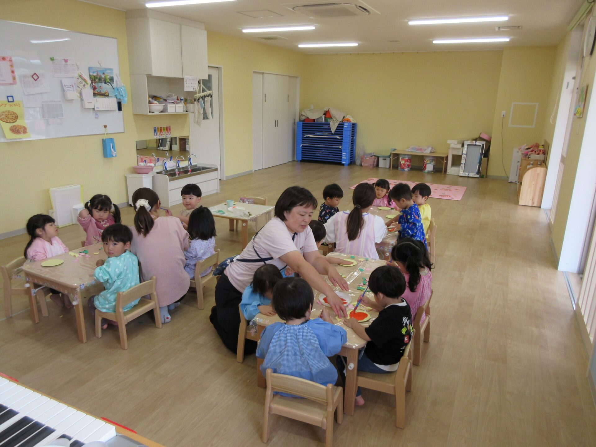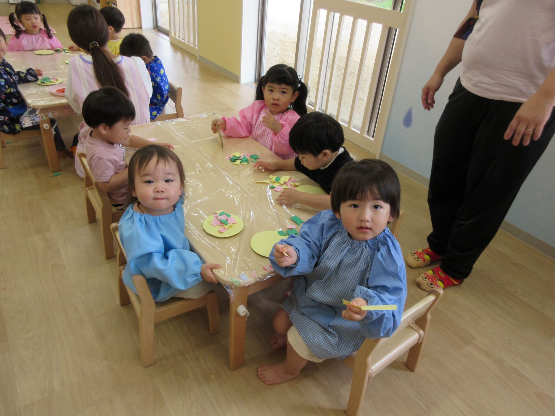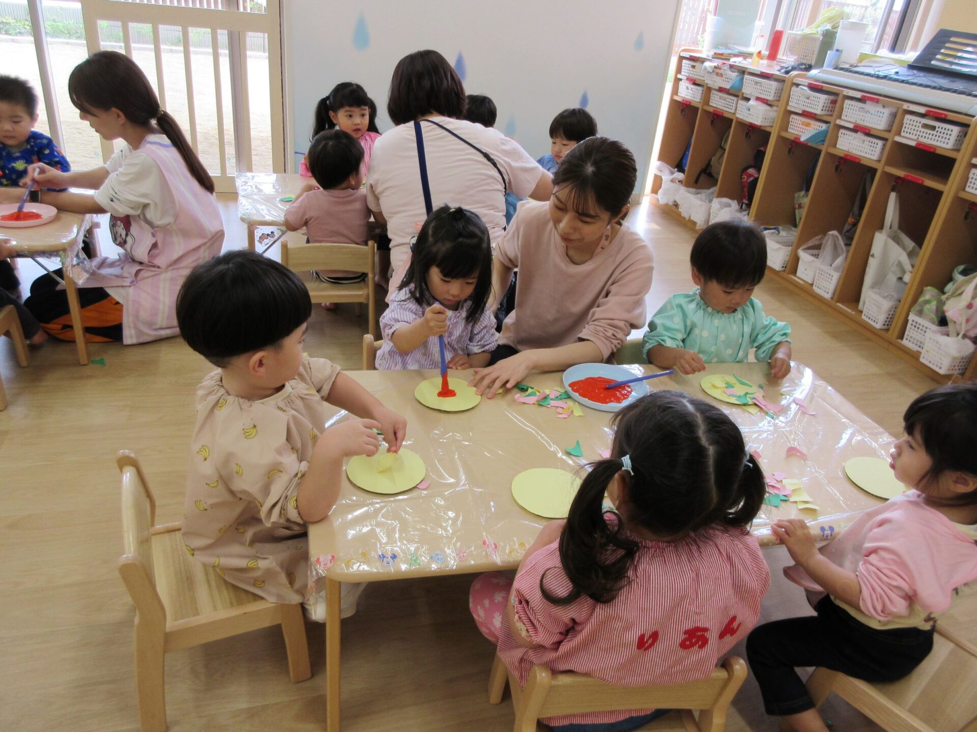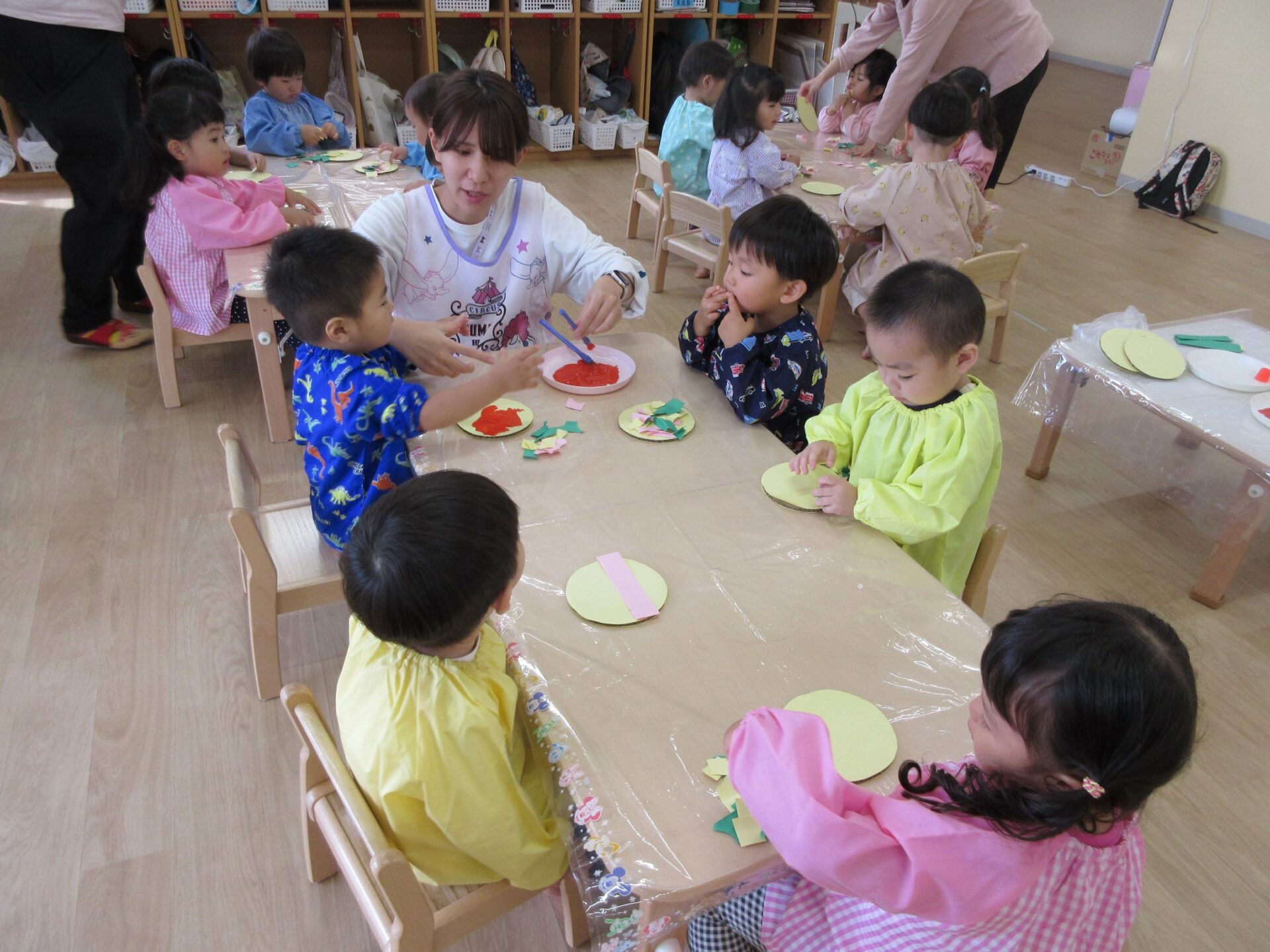 2024.05.24 お知らせ ブログ ピザを作りました。 5月23日(木)、2歳あめ組は何か制作しています。 丸いお皿のような紙、小さく切ったいろんな色の紙。 「みんな、何をつくっているの?」 「ピザ!」 ピザ生地(紙)に、トマトソース(のり)を塗って、その上に具をのせて貼って作るんですね。 おいしそうなピザができそうです。 すごく集中して取り組みました。 とても素敵なピザ職人でした。 一覧へ戻る