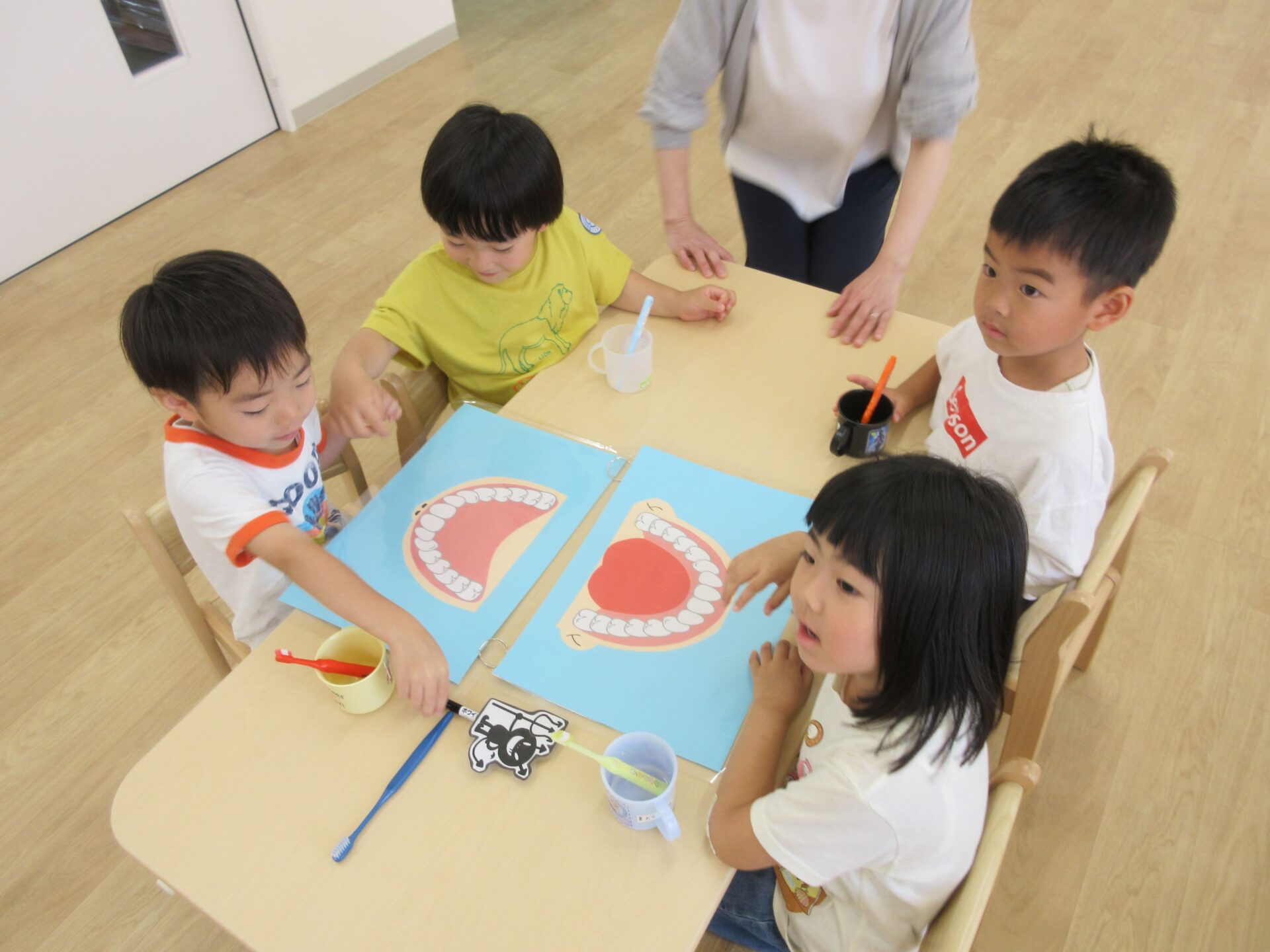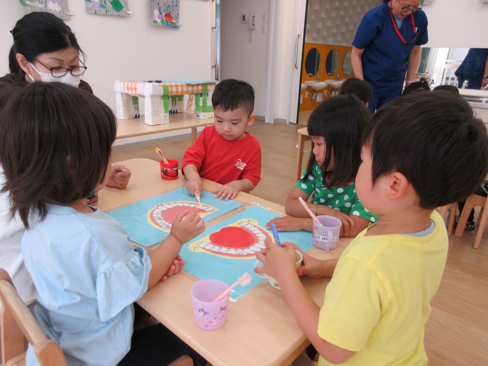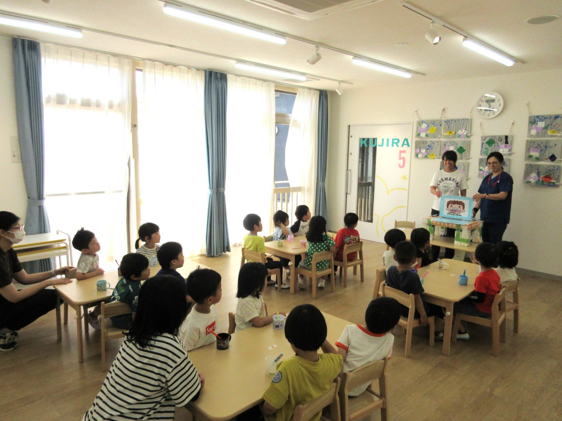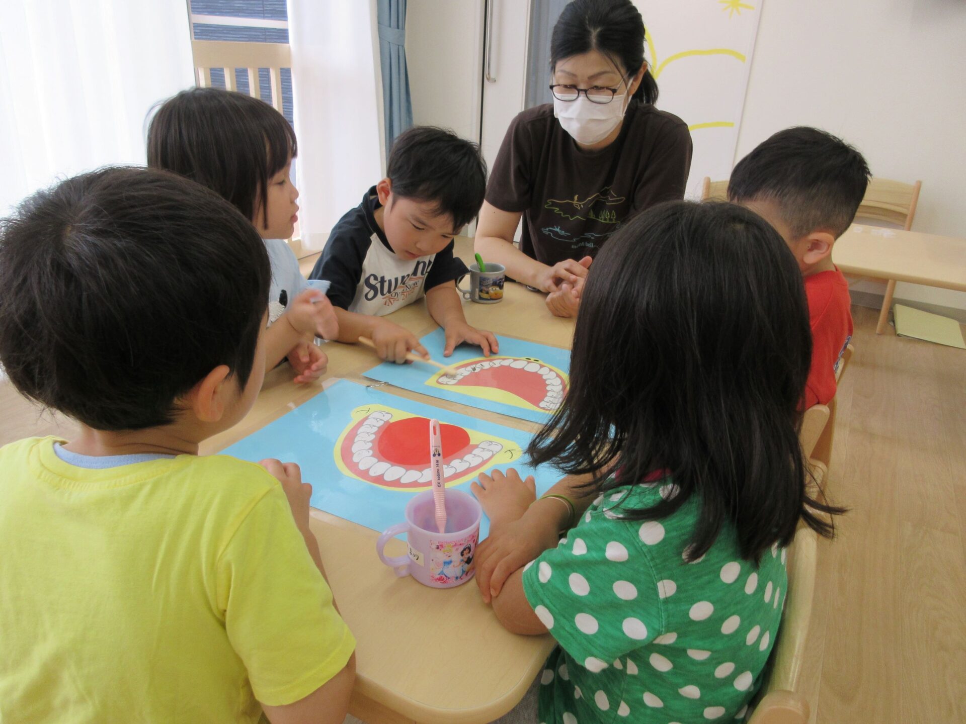 6月4日(火)、「虫歯予防デー」のこの日、4歳そら組は、看護師のナース・タニとナース・ナカジマから歯みがきのお話を聞きました。