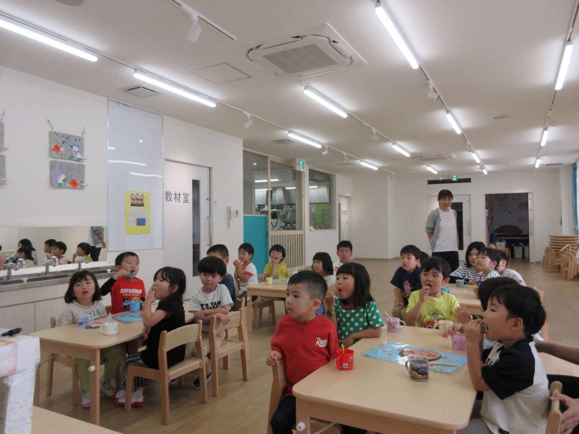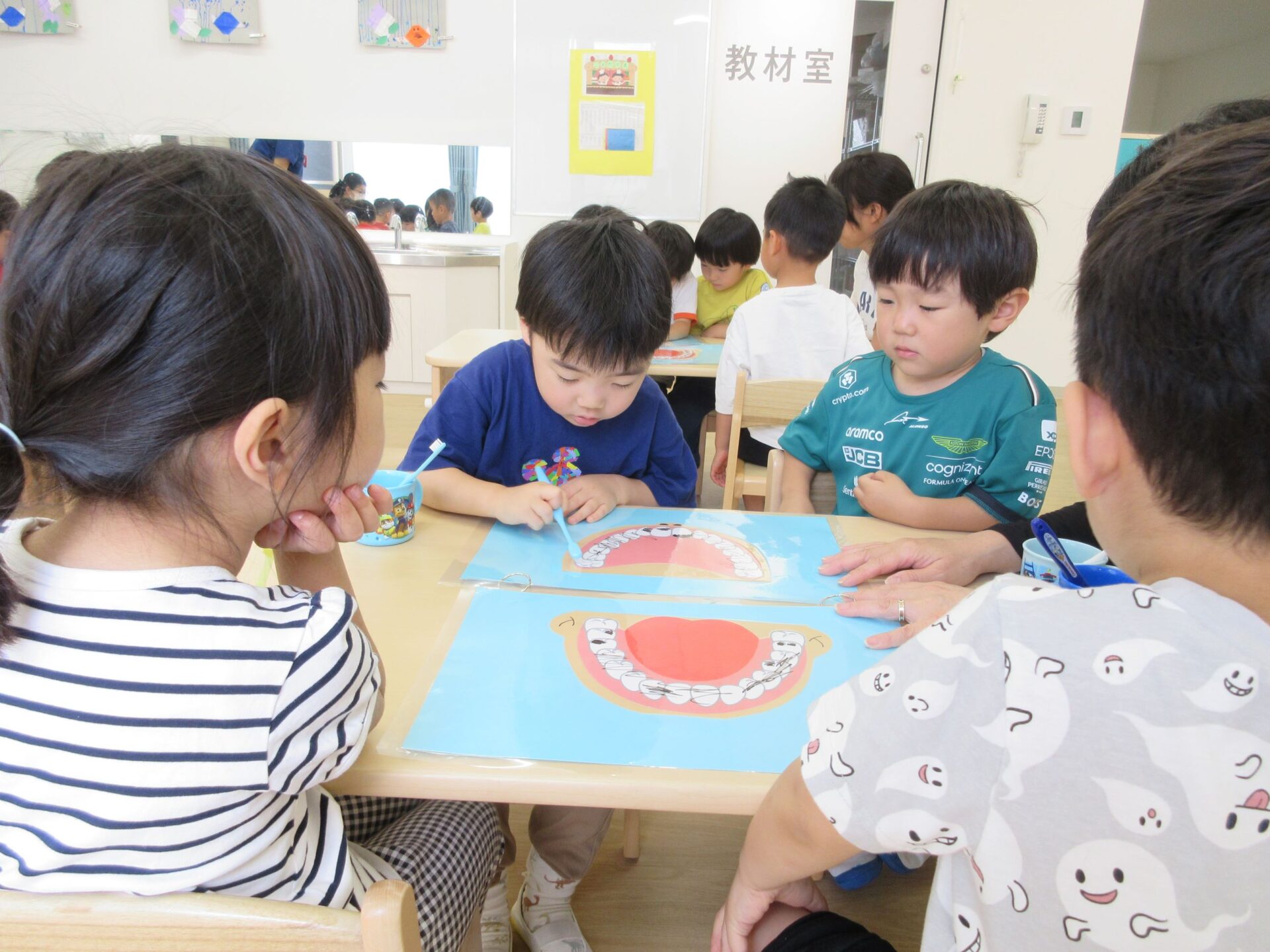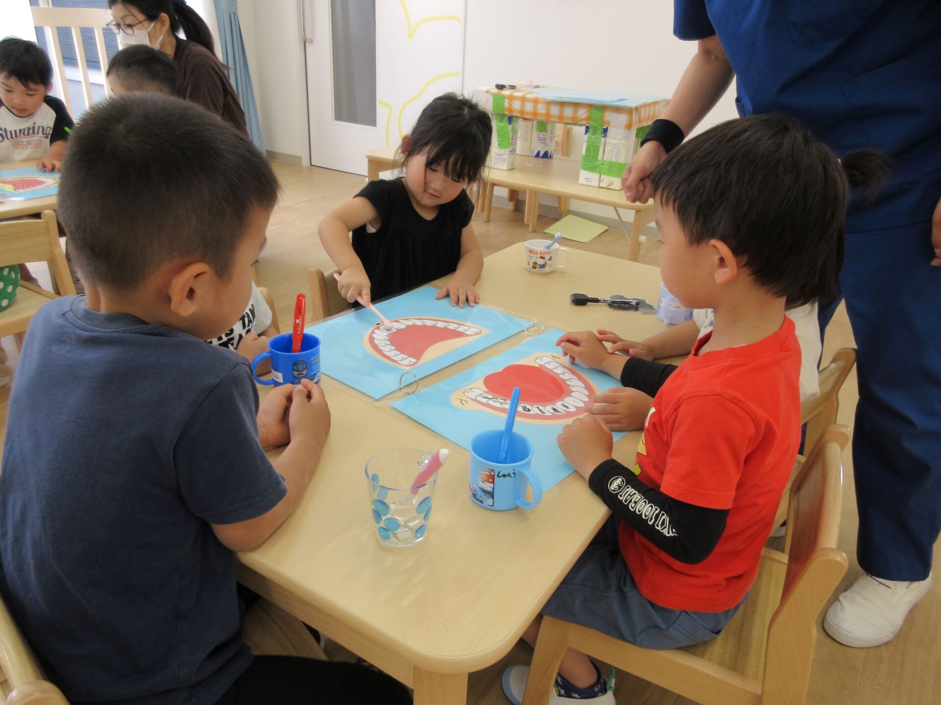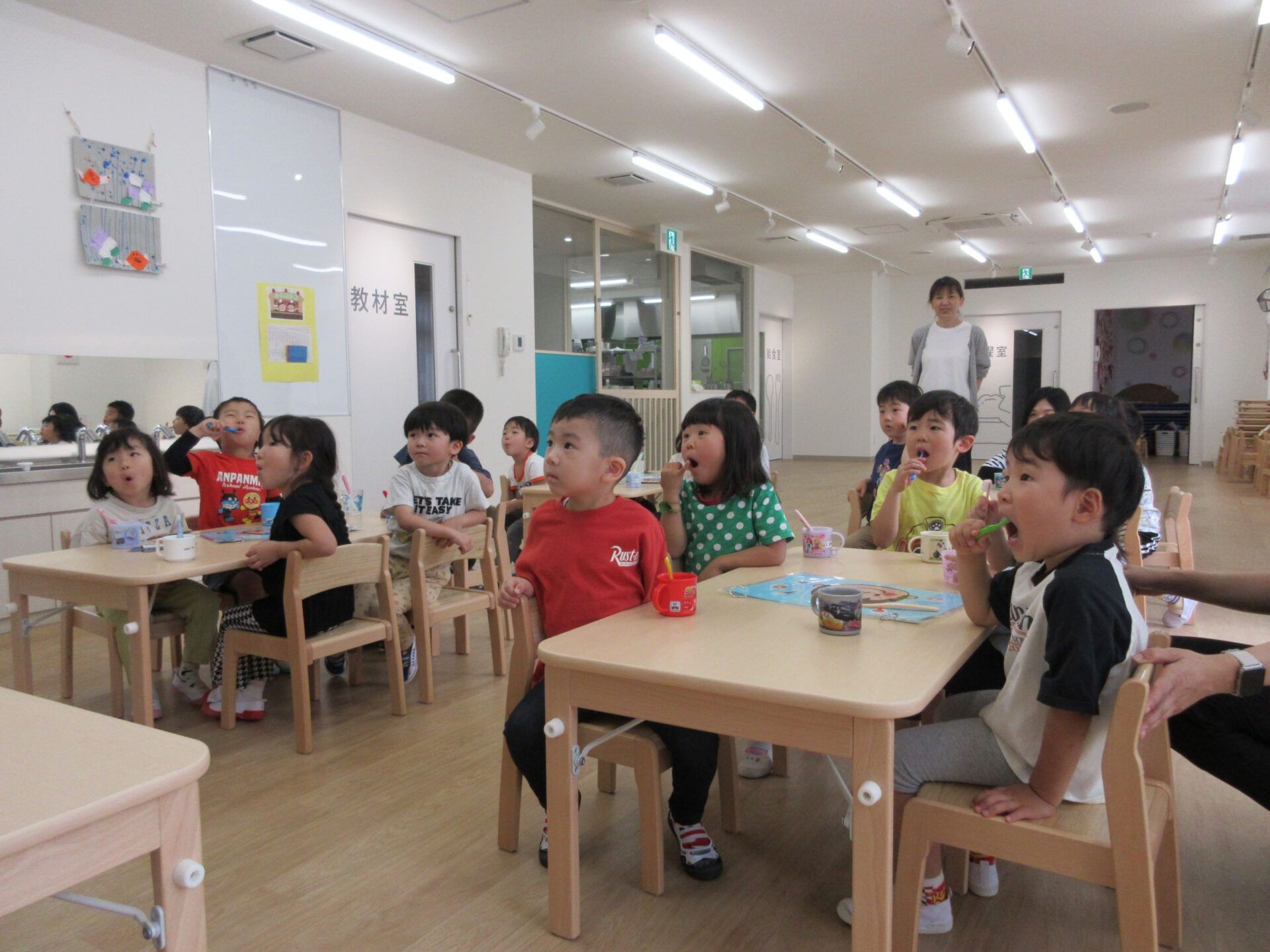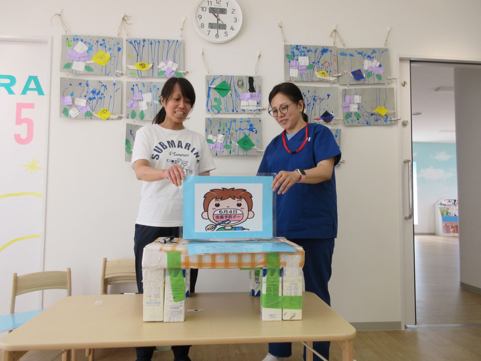 6月4日(火)、「虫歯予防デー」のこの日、4歳そら組は、看護師のナース・タニとナース・ナカジマから歯みがきのお話を聞きました。