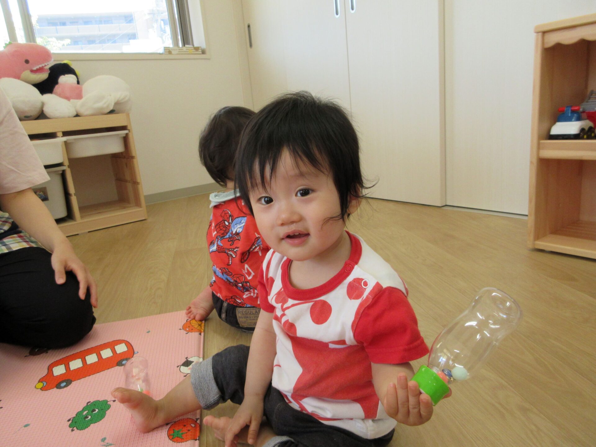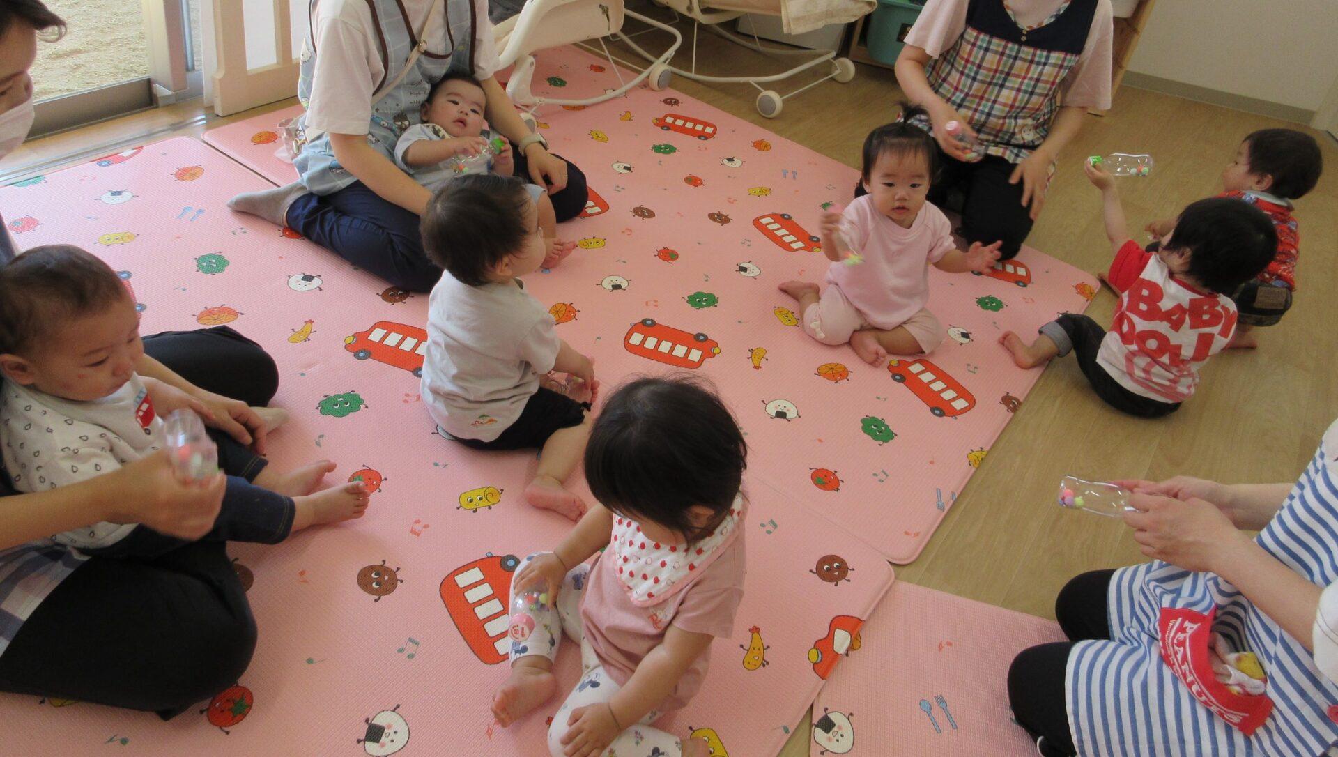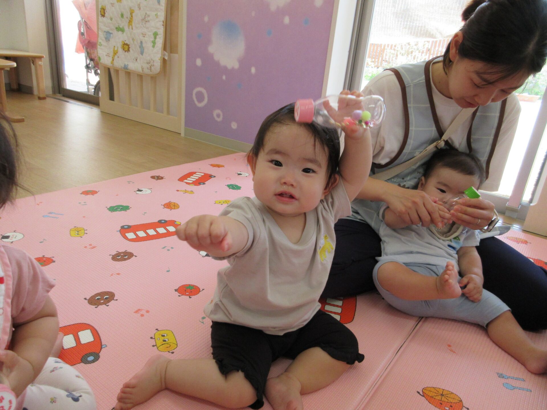 2024.06.21 お知らせ ブログ マラカスでシャカシャカ♪(うみ組) 6月14日(金)、0歳うみ組は、手作りマラカスで遊びました♪ 自分で上手に持っていますよ! 両手持ちです♪ マラカスを振ると、シャカシャカと音が鳴って面白いね♪ 立っちでマラカス!ノリノリです♪ みんなでピアノに合わせて鳴らしてみます♪ 素敵な音が聞こえてきましたよ♪ 楽しかったね!! 一覧へ戻る