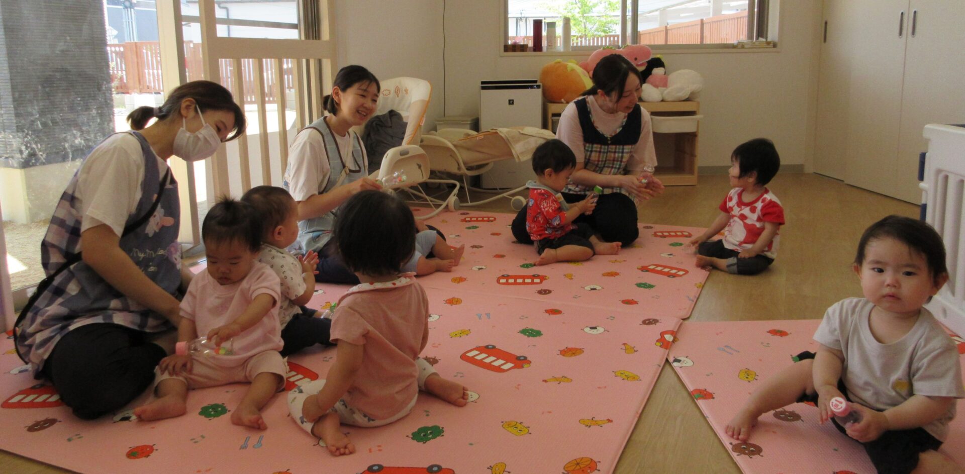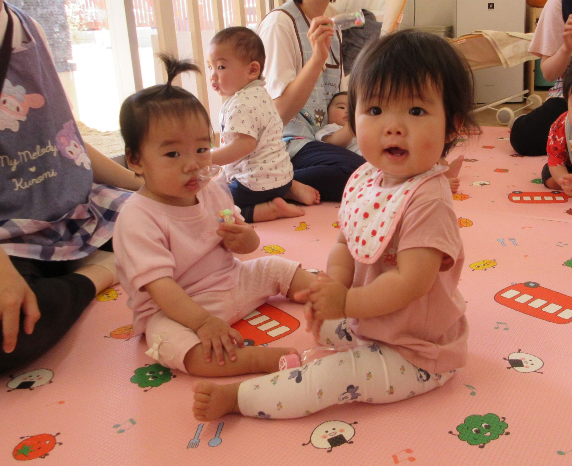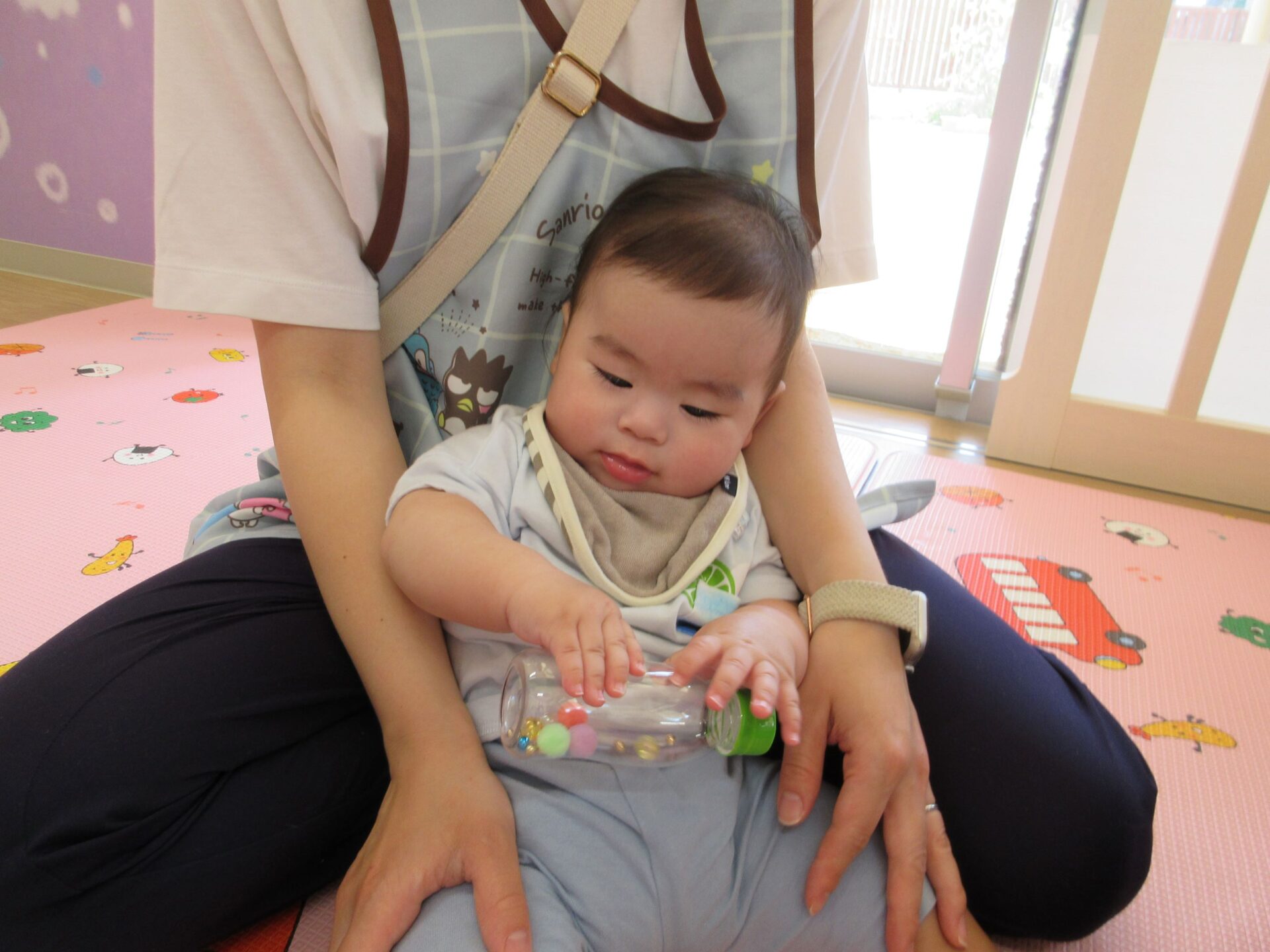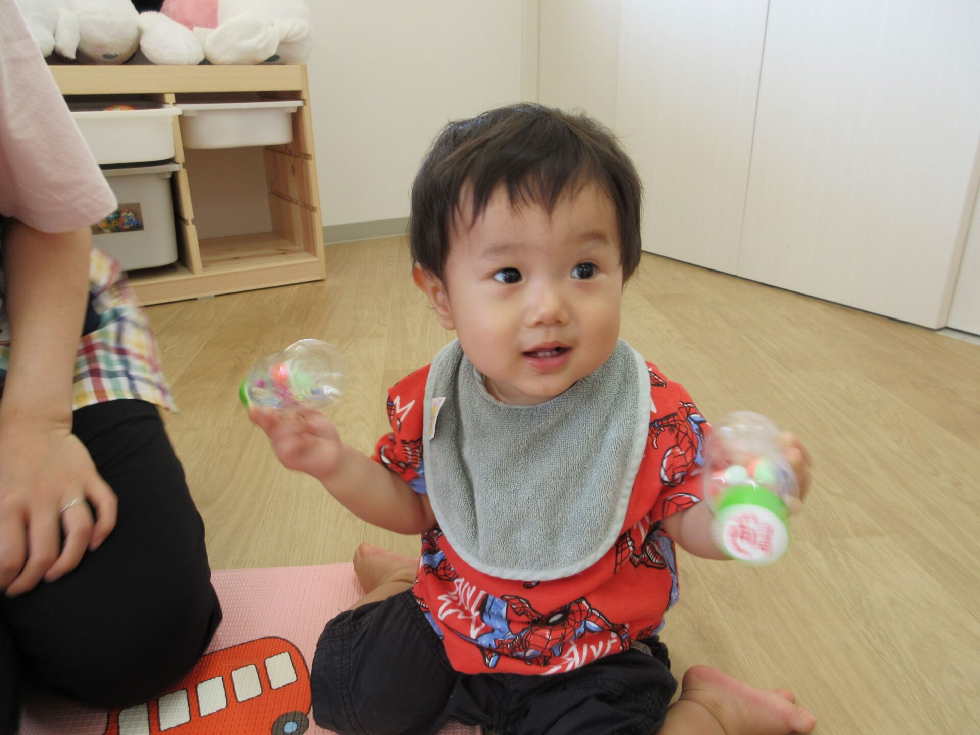 2024.06.21 お知らせ ブログ マラカスでシャカシャカ♪(うみ組) 6月14日(金)、0歳うみ組は、手作りマラカスで遊びました♪ 自分で上手に持っていますよ! 両手持ちです♪ マラカスを振ると、シャカシャカと音が鳴って面白いね♪ 立っちでマラカス!ノリノリです♪ みんなでピアノに合わせて鳴らしてみます♪ 素敵な音が聞こえてきましたよ♪ 楽しかったね!! 一覧へ戻る