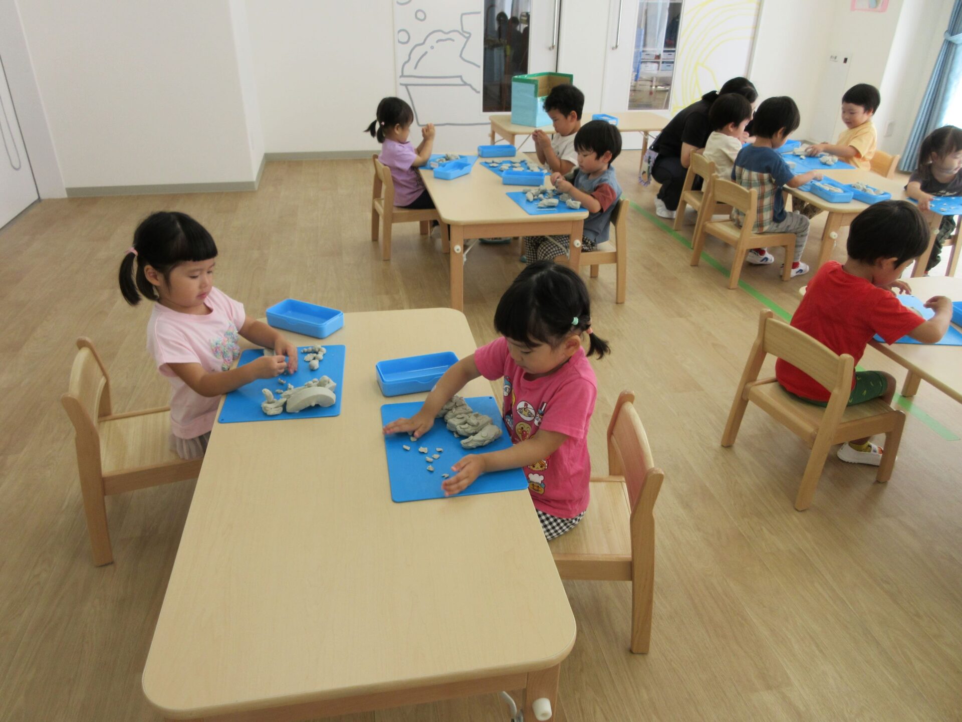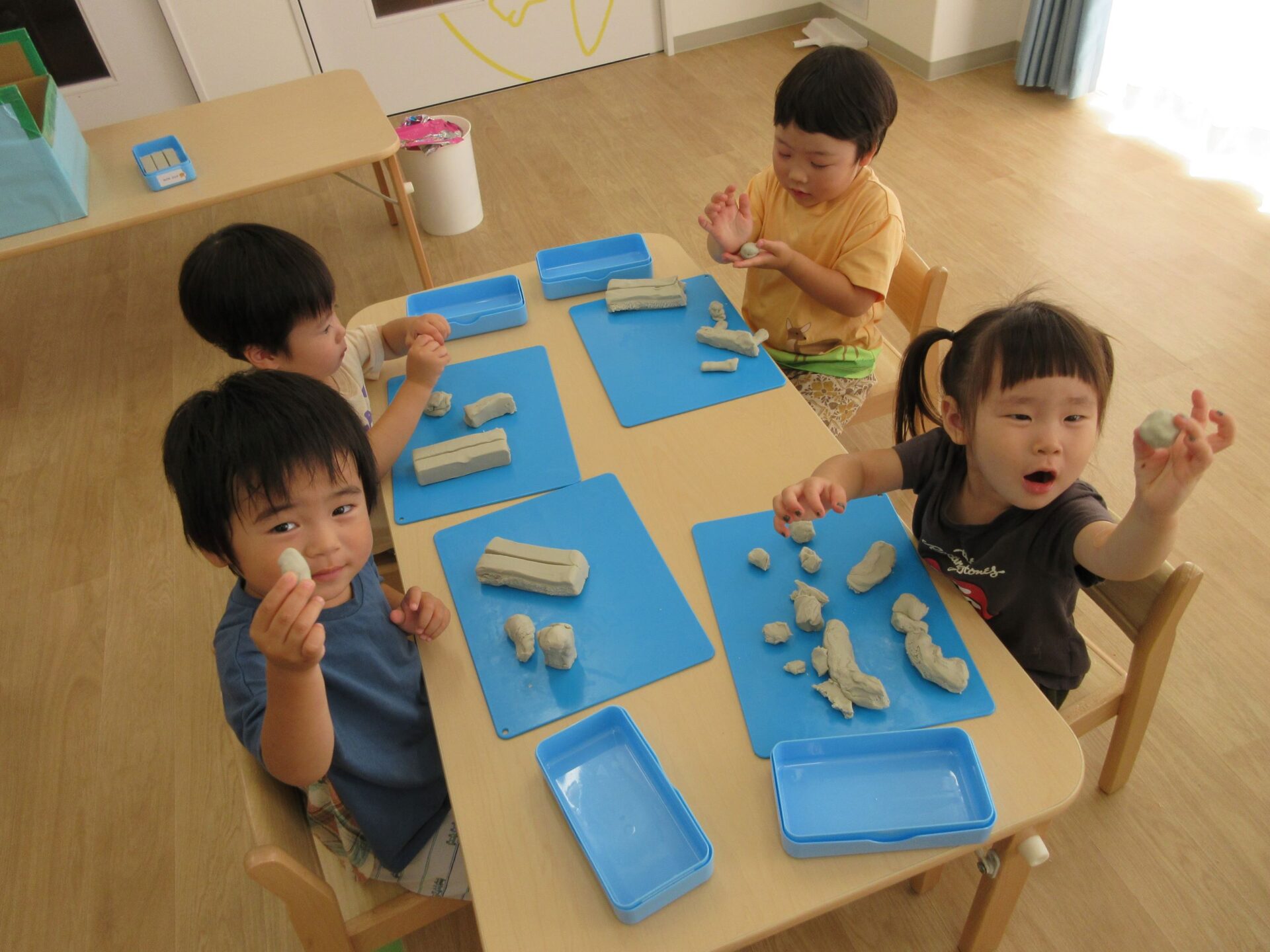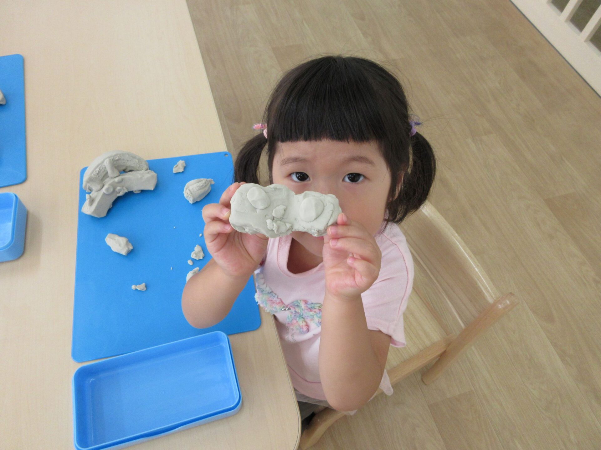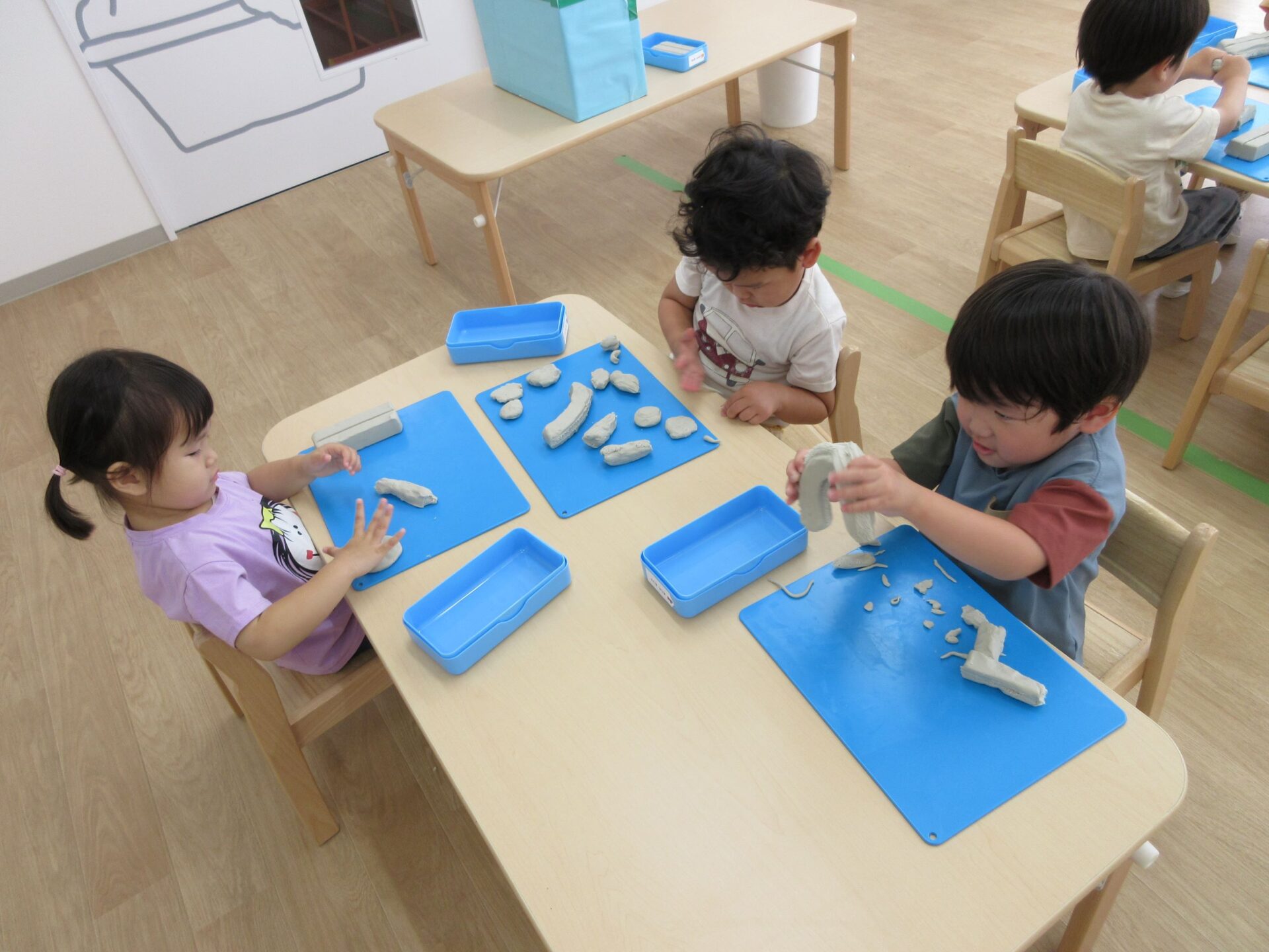 2024.06.24 お知らせ ブログ 粘土遊び(にじ組) 6月21日(金)、今日は3歳にじ組が、ランチルームで粘土遊びをしました。 初めての粘土遊びに、みんなワクワクです。 顔ができましたよ。 重ねてみたり、丸めてみたり、並べてみたりして楽しんでいます。 ケーキかな?オニかな? のばしたり、ちぎったり並べたり、いろいろ楽しいね。 さまざまな形に変化していく粘土に興味津々でした。また、しようね! 一覧へ戻る
