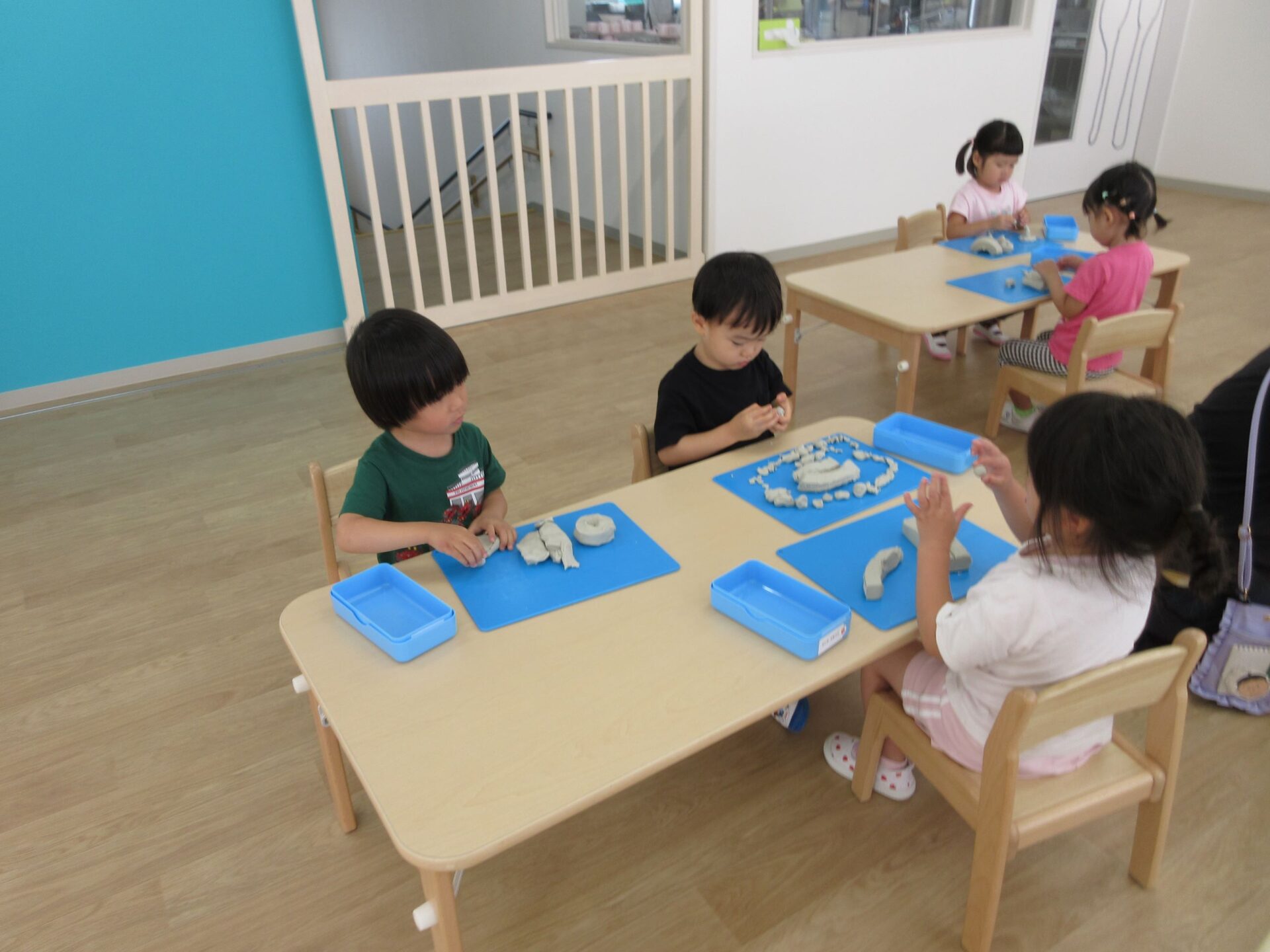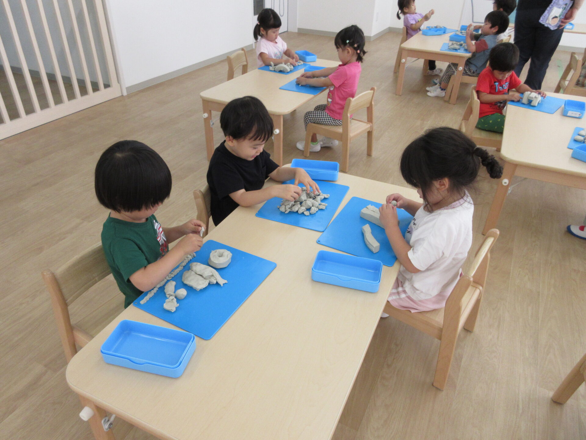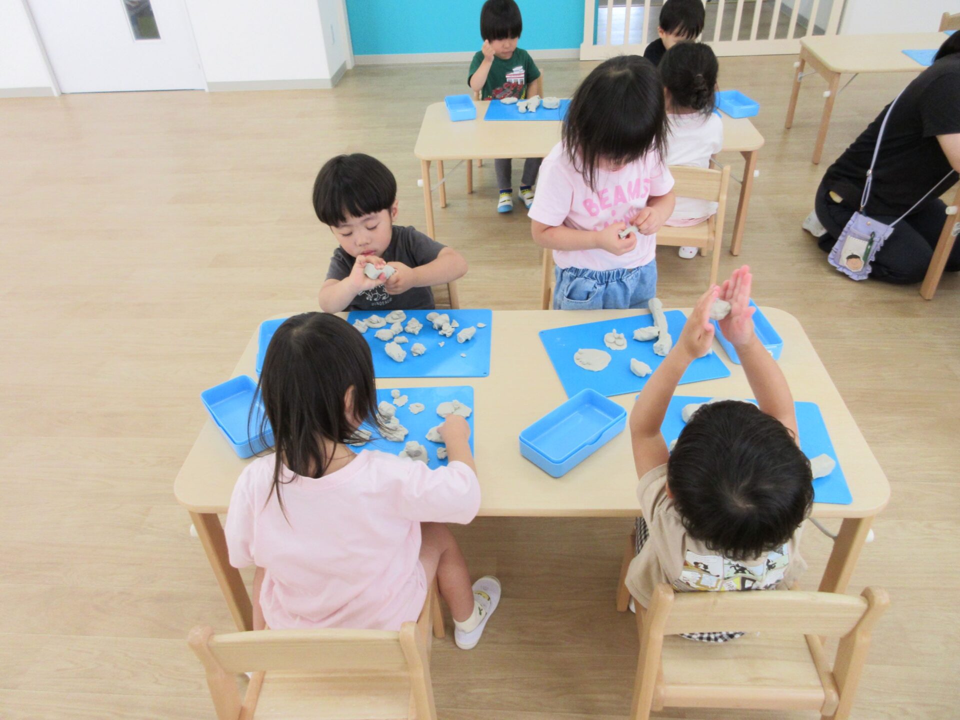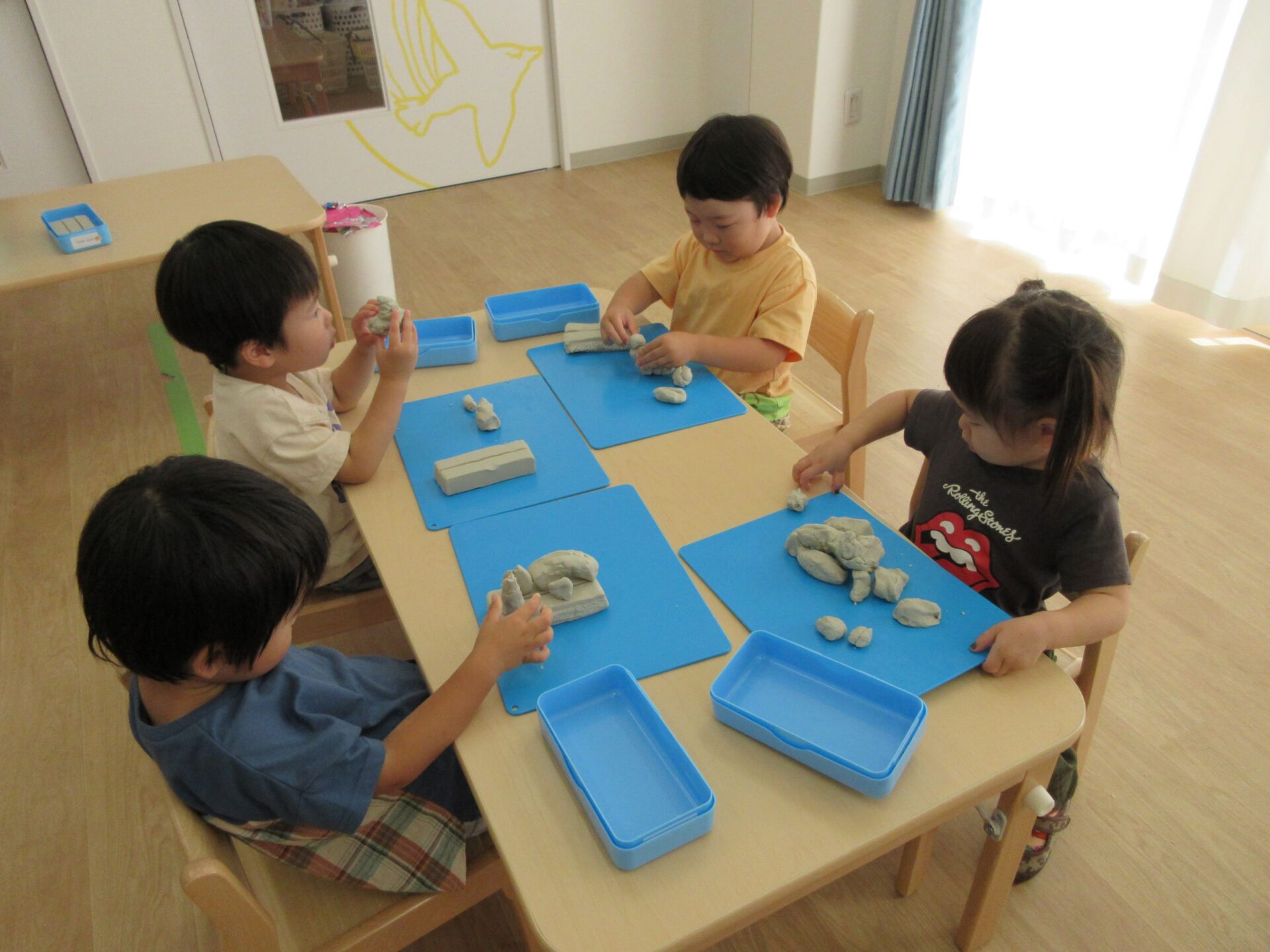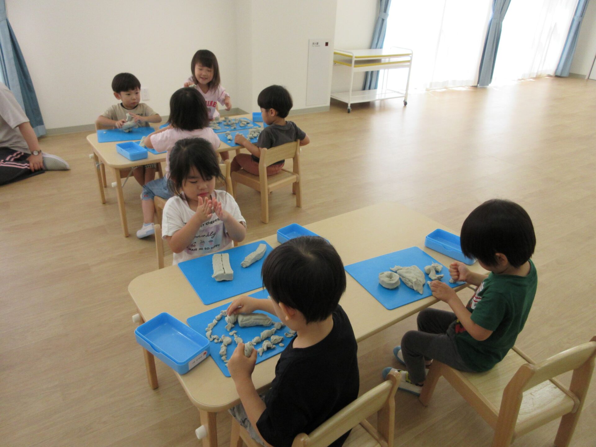 2024.06.24 お知らせ ブログ 粘土遊び(にじ組) 6月21日(金)、今日は3歳にじ組が、ランチルームで粘土遊びをしました。 初めての粘土遊びに、みんなワクワクです。 顔ができましたよ。 重ねてみたり、丸めてみたり、並べてみたりして楽しんでいます。 ケーキかな?オニかな? のばしたり、ちぎったり並べたり、いろいろ楽しいね。 さまざまな形に変化していく粘土に興味津々でした。また、しようね! 一覧へ戻る