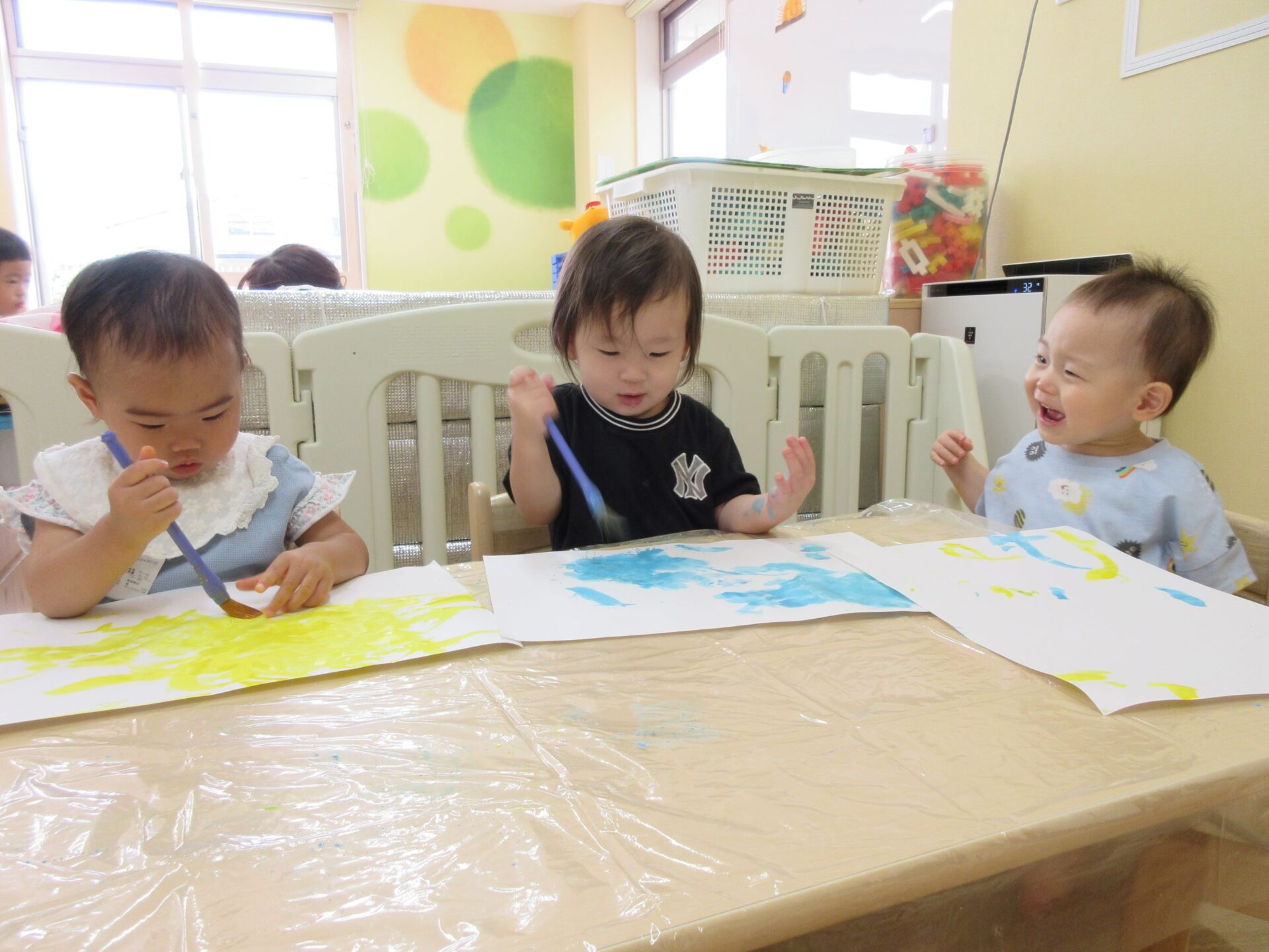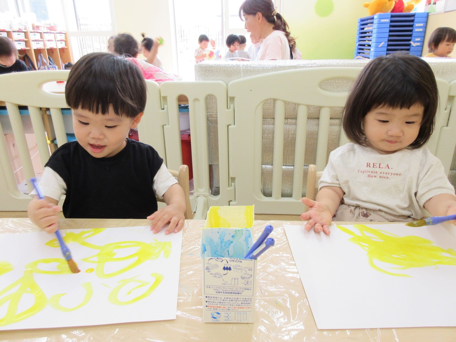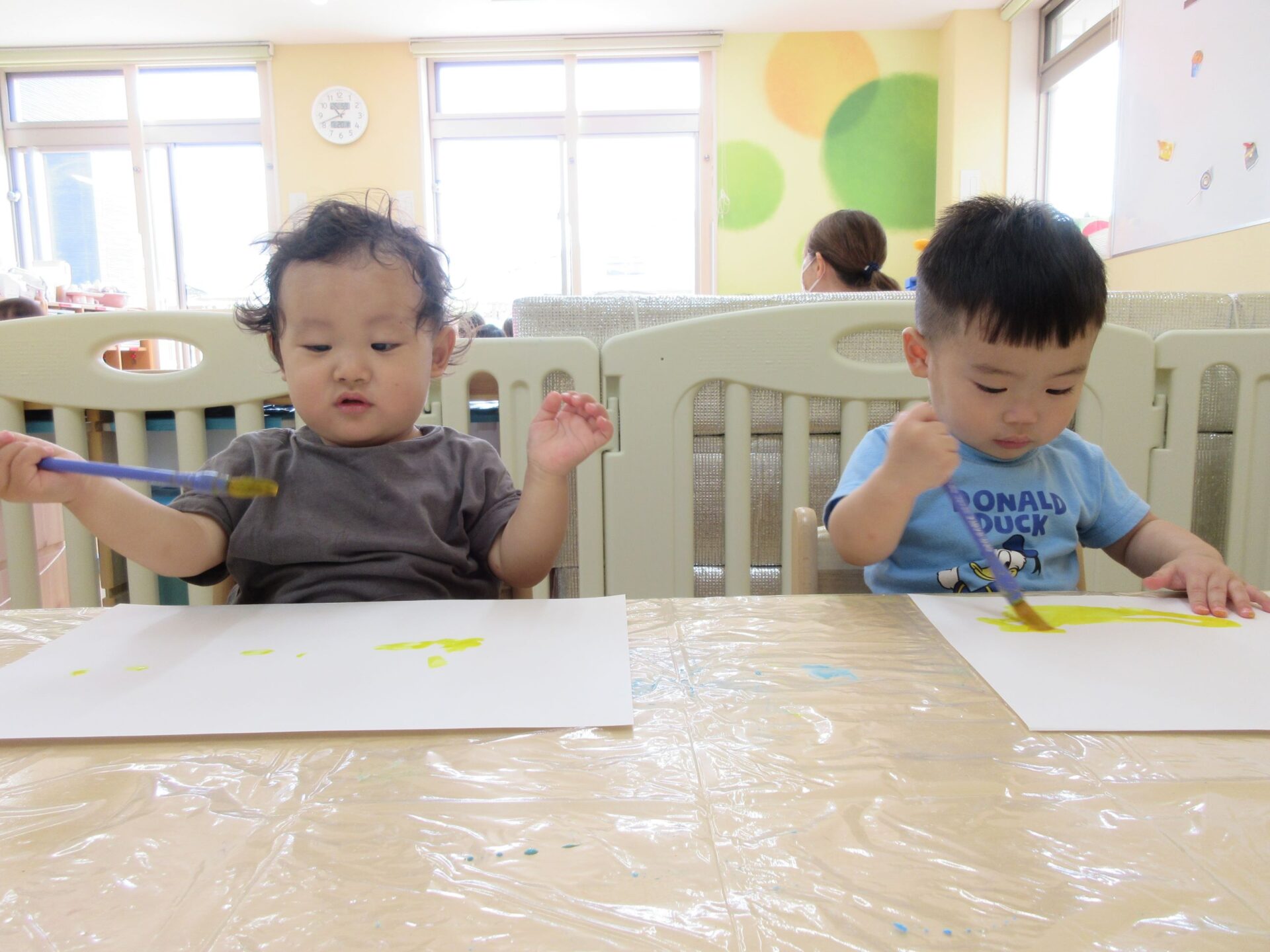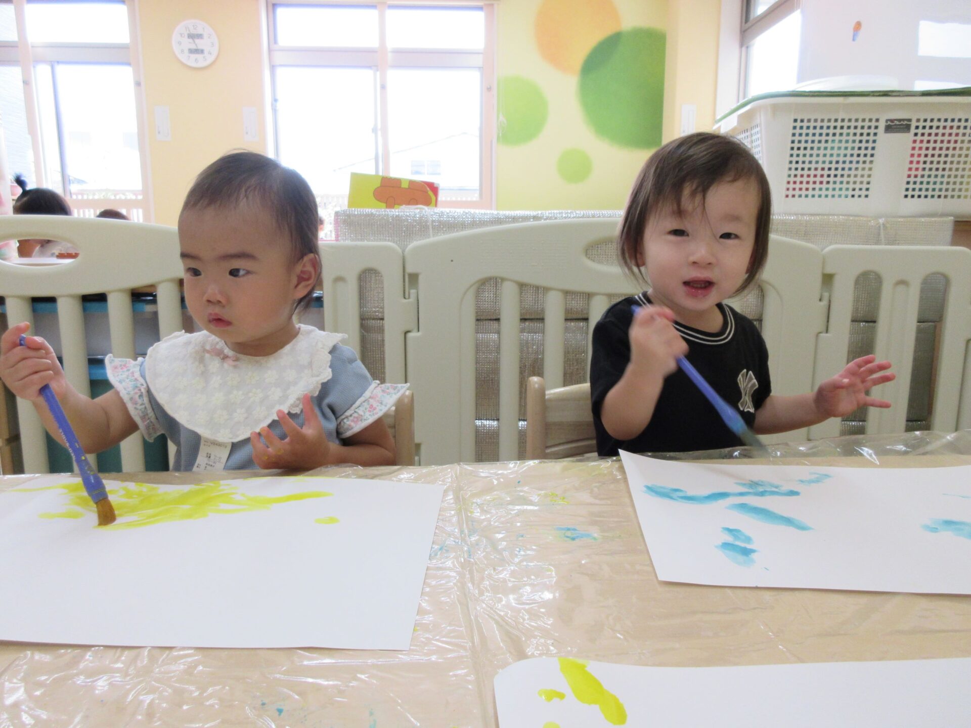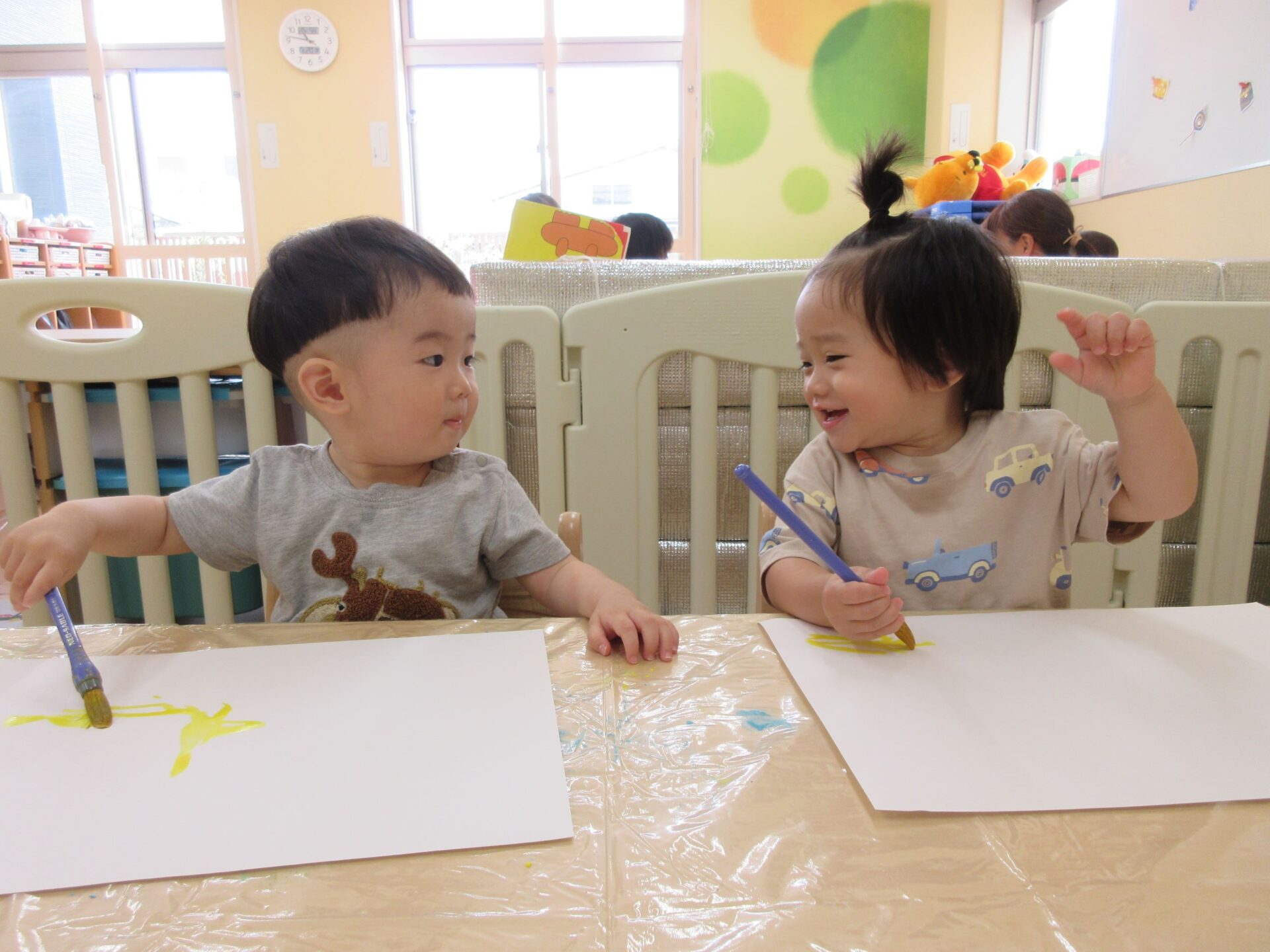 2024.06.25 お知らせ ブログ 絵の具で色塗り6/19(だいち組) 今日は、絵の具で色塗り遊びをしました。 色は黄色と青です。手に絵の具が付きましたね。 筆の使い方も上手ですね。 ぐるぐる自由に描いて、楽しいね。 中が気になります。牛乳パックの中には、絵の具が入っていますよ。 絵の具が手に付いちゃう! ぼく、できたよ! たのしいね、にこり。 楽しいね!友だちとにこり! 水色が好き?黄色が好き? てんてんてん これが何になるかは、お楽しみです。出来上がったら、廊下に貼りますね。 一覧へ戻る