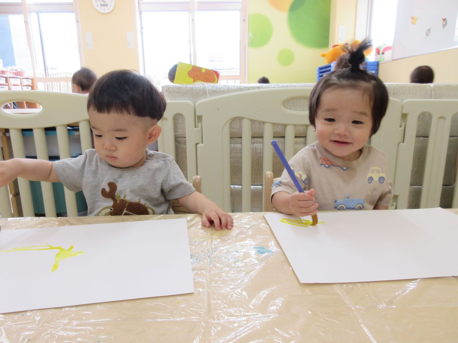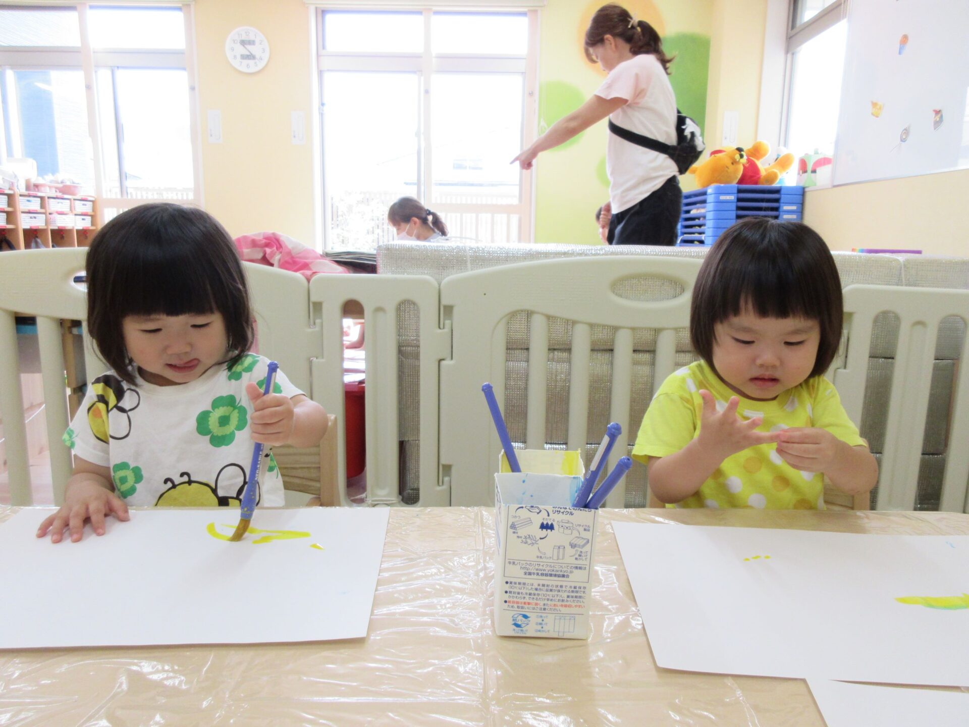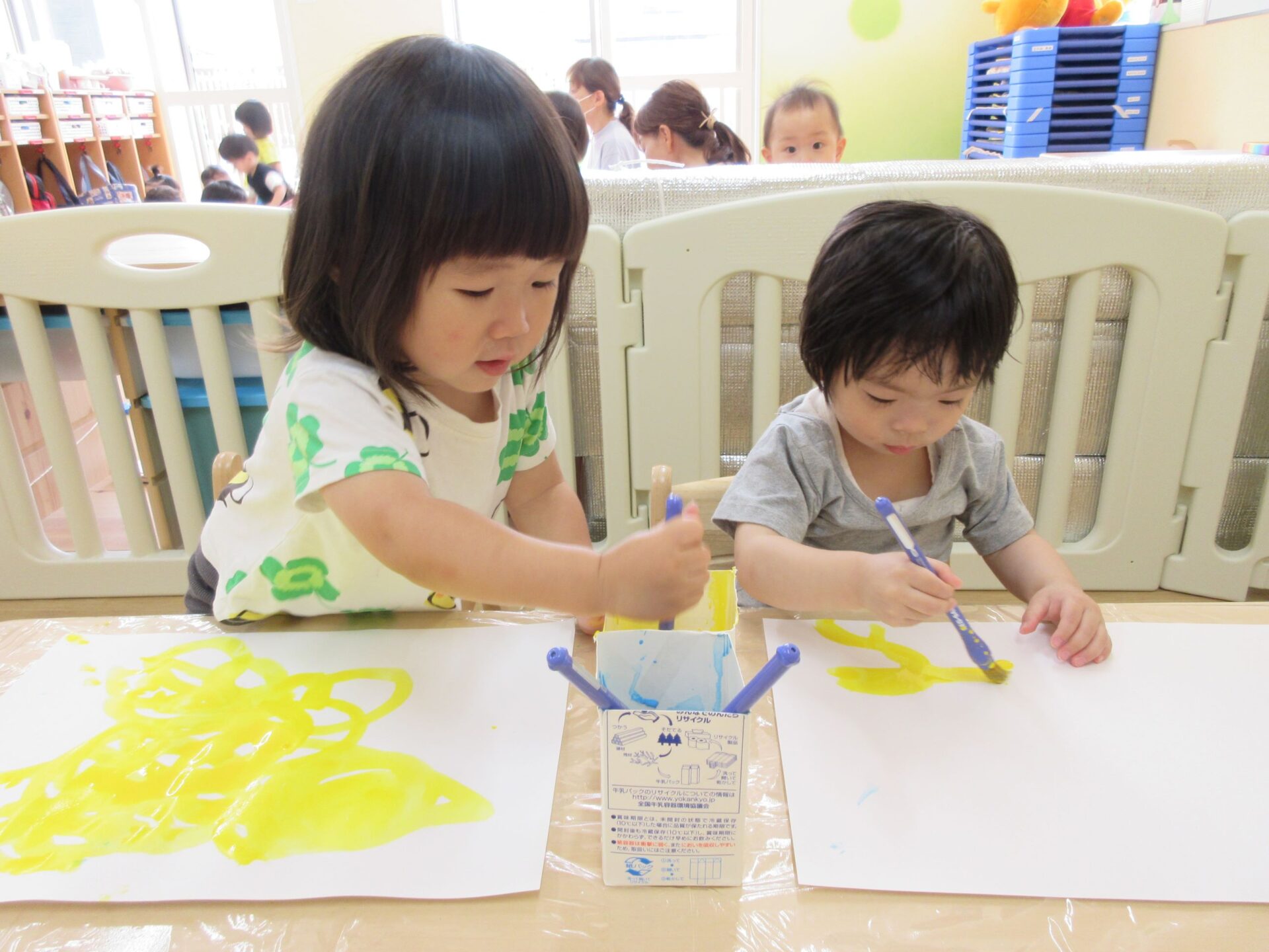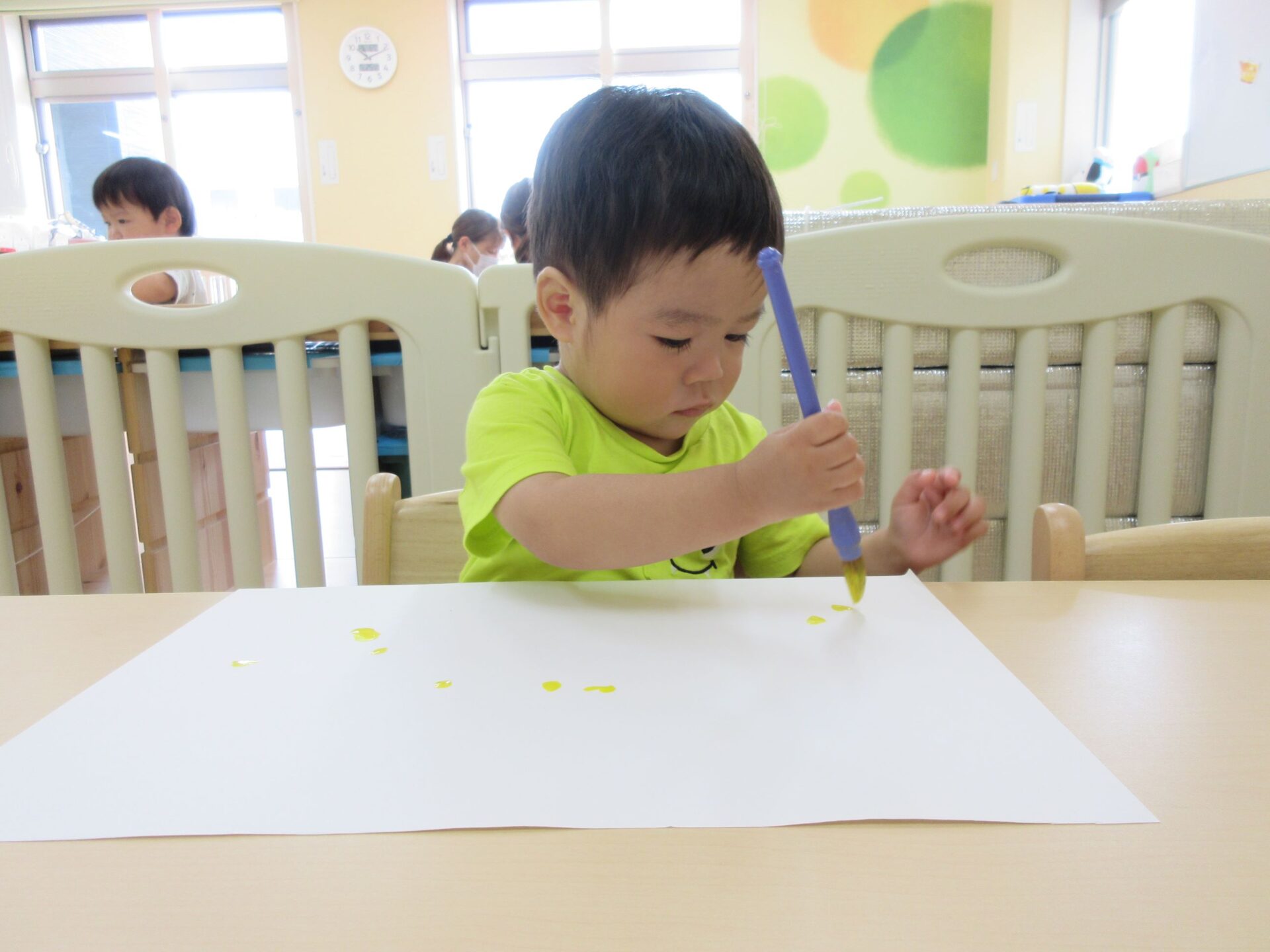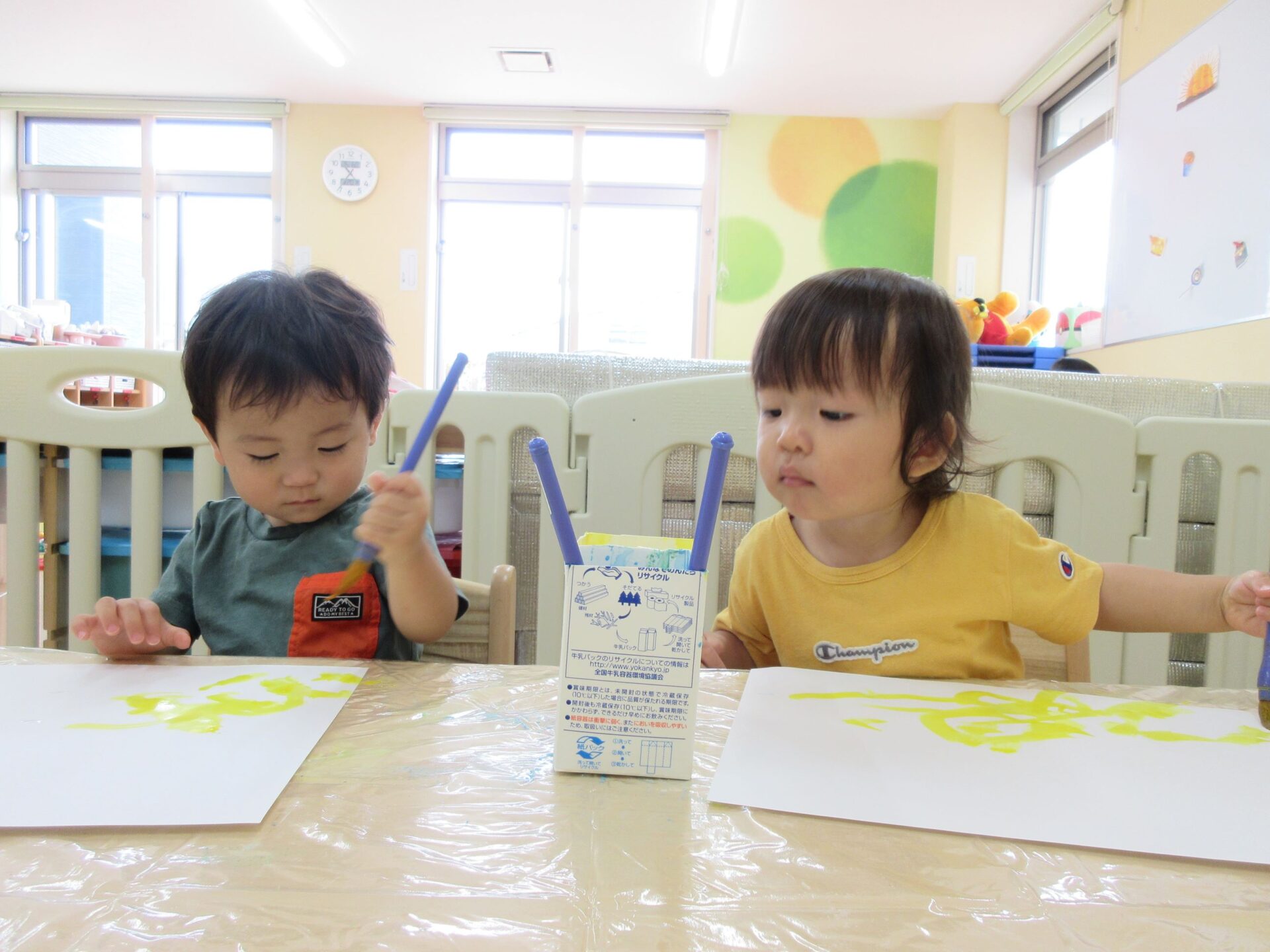 2024.06.25 お知らせ ブログ 絵の具で色塗り6/19(だいち組) 今日は、絵の具で色塗り遊びをしました。 色は黄色と青です。手に絵の具が付きましたね。 筆の使い方も上手ですね。 ぐるぐる自由に描いて、楽しいね。 中が気になります。牛乳パックの中には、絵の具が入っていますよ。 絵の具が手に付いちゃう! ぼく、できたよ! たのしいね、にこり。 楽しいね!友だちとにこり! 水色が好き?黄色が好き? てんてんてん これが何になるかは、お楽しみです。出来上がったら、廊下に貼りますね。 一覧へ戻る