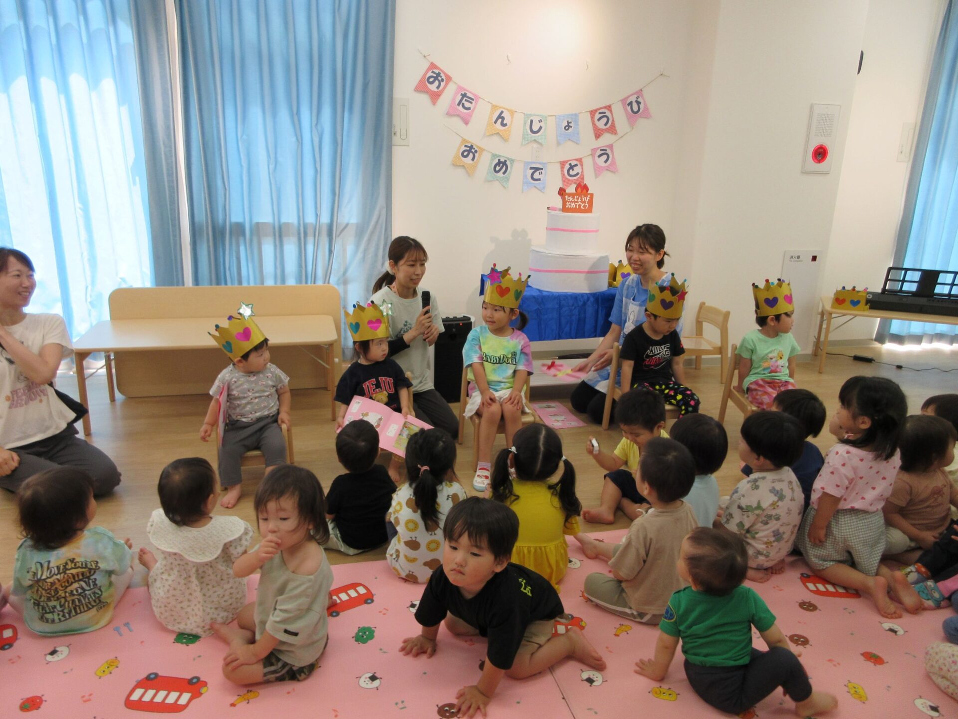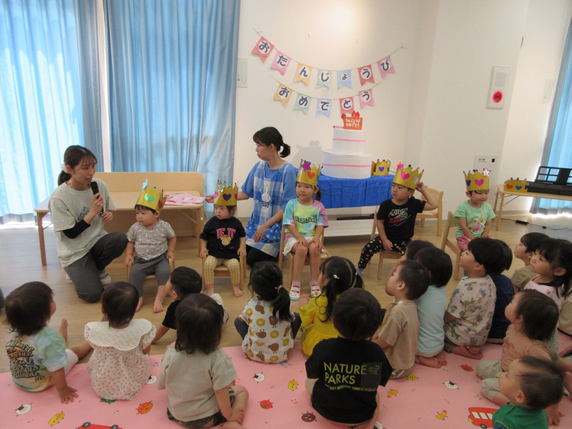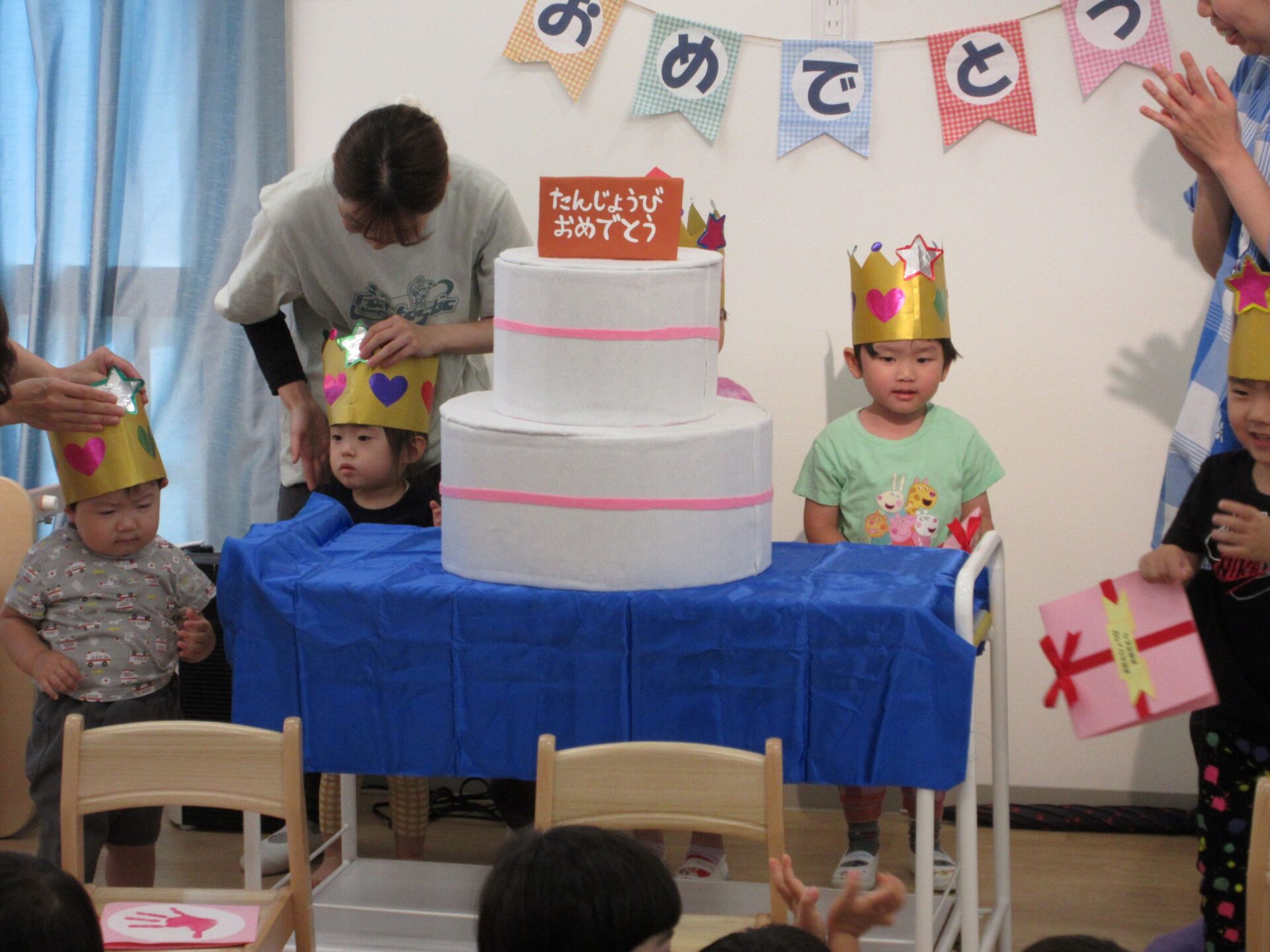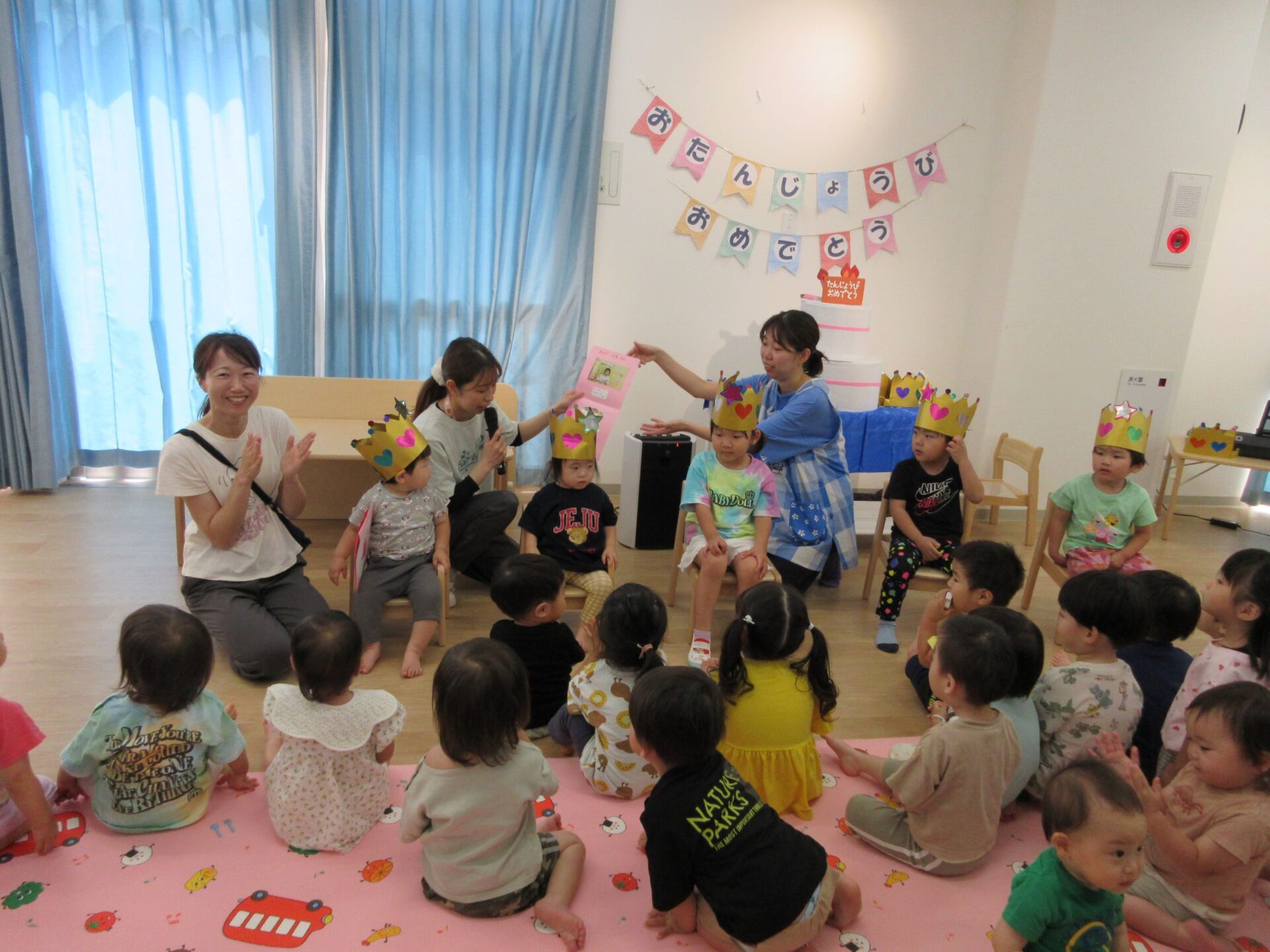 はじめにお誕生日の歌をみんなで歌いました。そして、かんむりをかぶって、記念のカードを受け取ります。