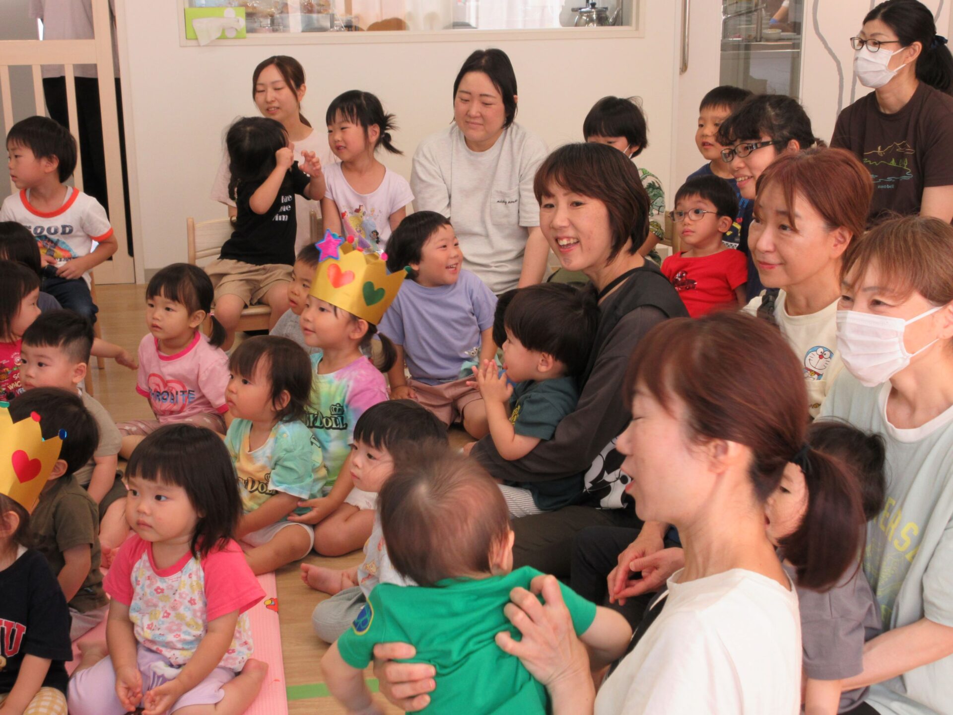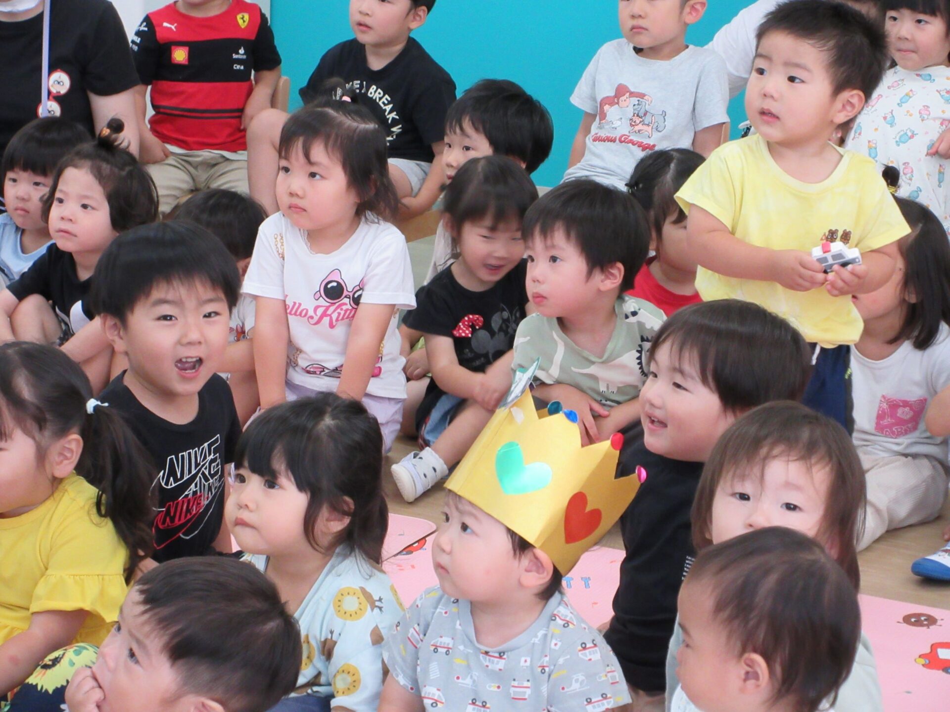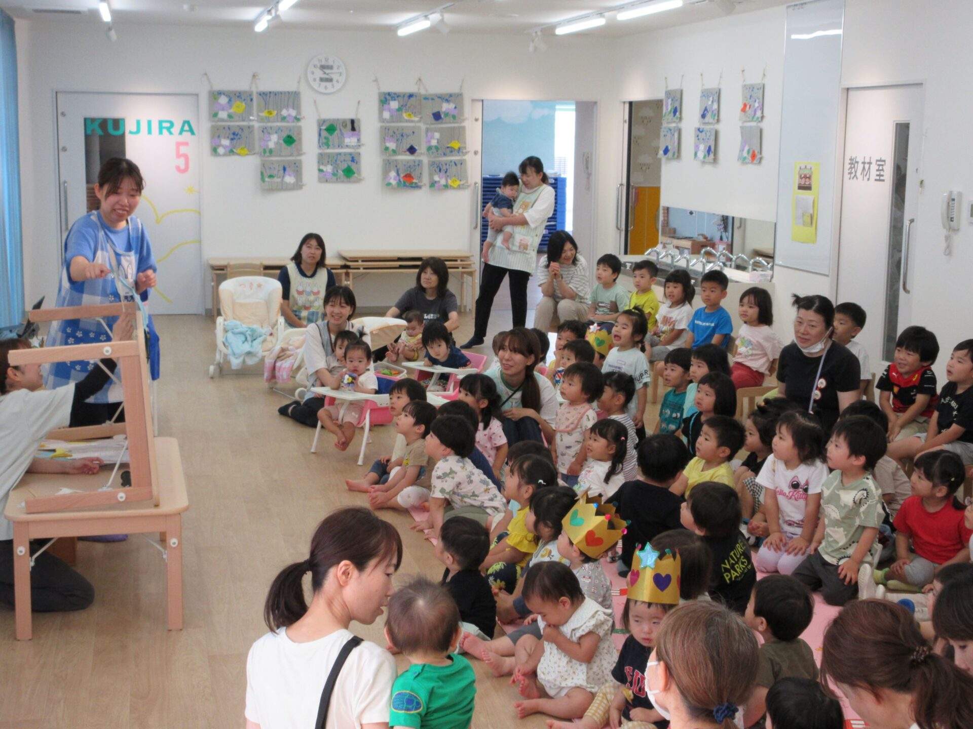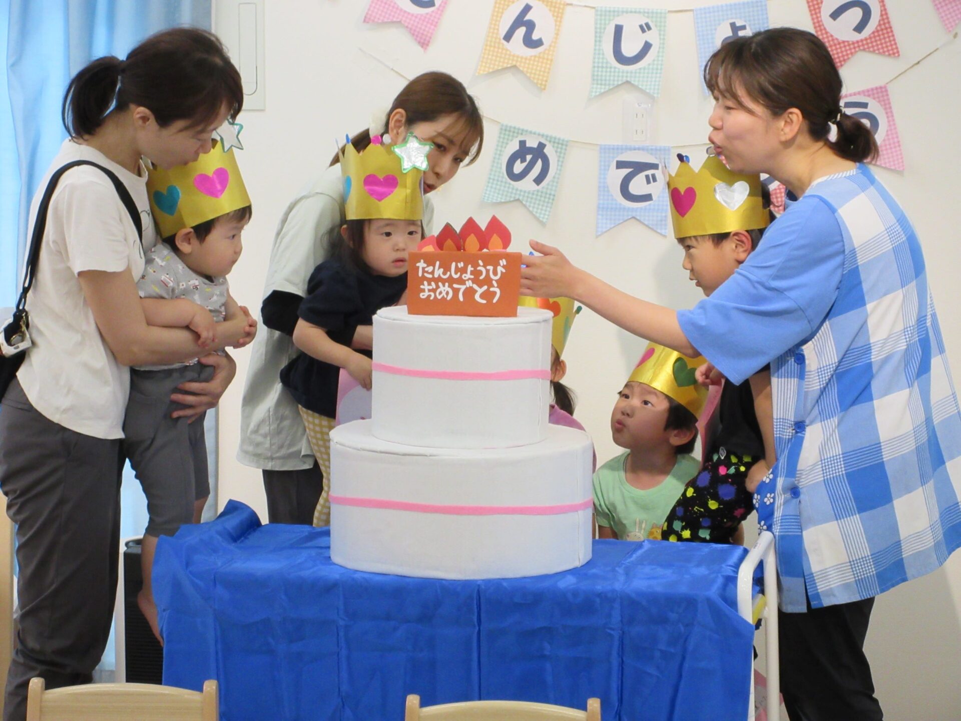 はじめにお誕生日の歌をみんなで歌いました。そして、かんむりをかぶって、記念のカードを受け取ります。