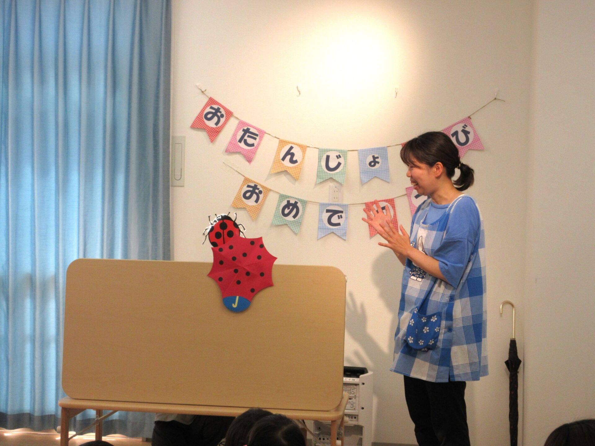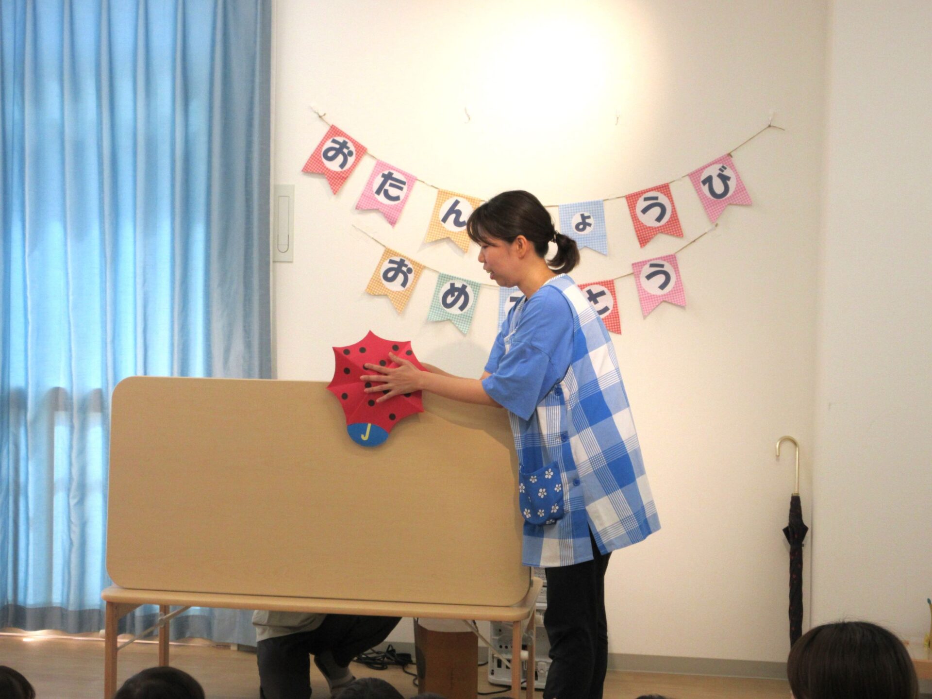 次は、先生の出し物。「だ~れの傘かな~♪」 これは、もしかして、あの小さな虫!?