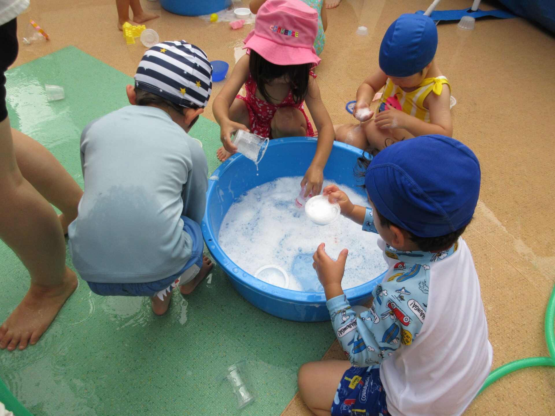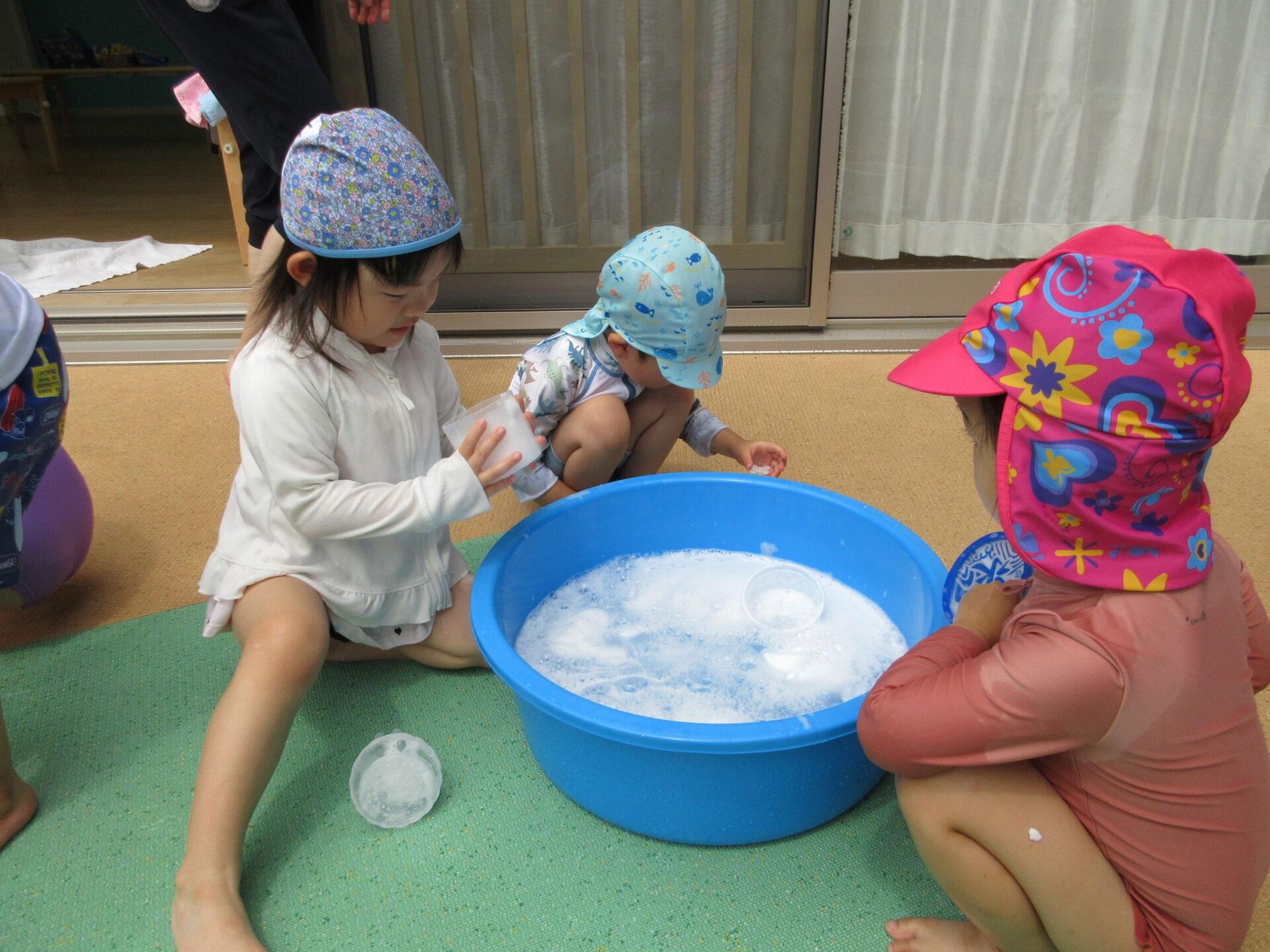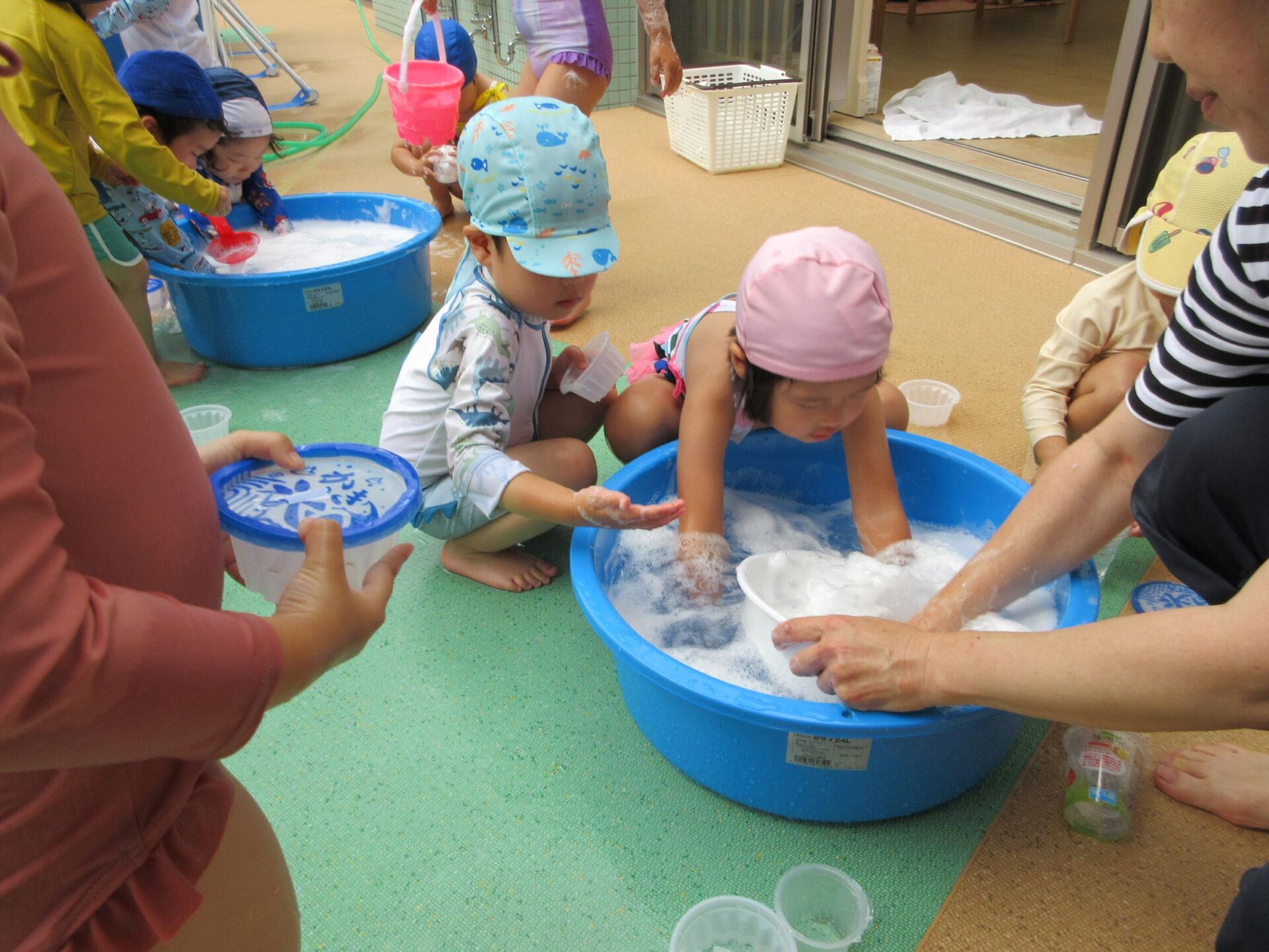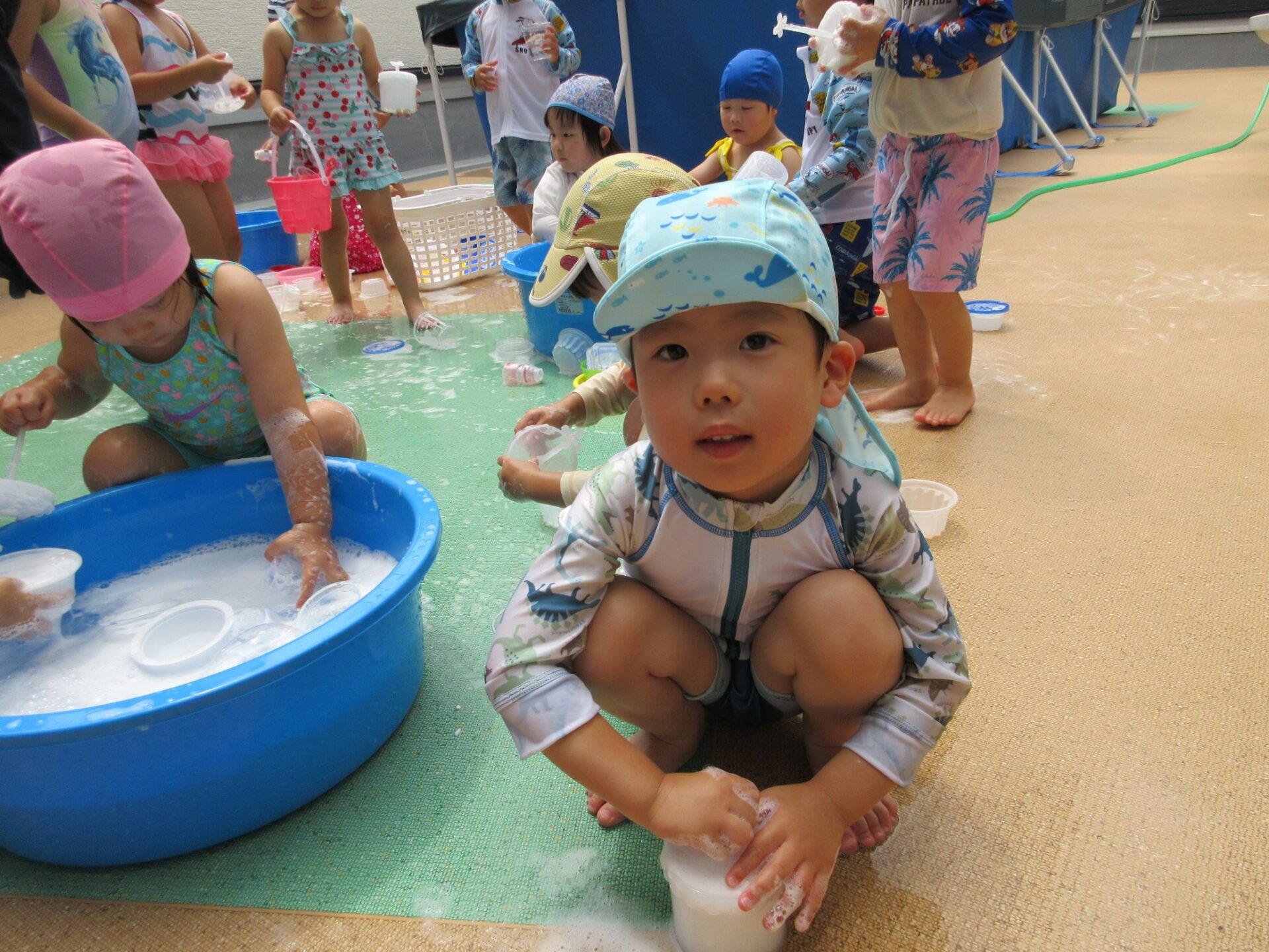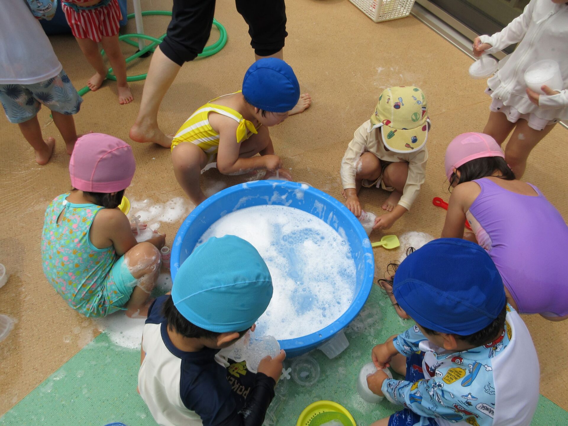 2024.07.26 お知らせ ブログ 泡遊び(にじ組) 7/10(水)泡遊びをしました。 削った石鹸をスポンジにつけて、ぷくぷく あわあわ!! 泡になると子どもたちは興味津々!! 泡だて器を使って自分たちで泡づくりにも挑戦!! たらいの中が泡いっぱいになると、大はしゃぎ!! 泡と水を混ぜたり、透明カップやアイスの容器に泡を入れて並べてみたり・・・ 泡を体にくっつけてみたり... 「きもちいい~」「あわあわ たのし~」と泡遊びに夢中な子どもたちでした!! 一覧へ戻る