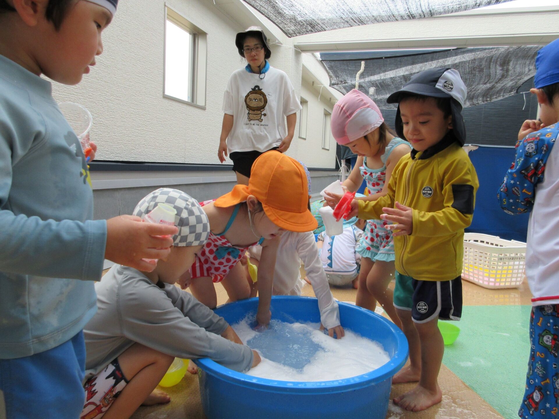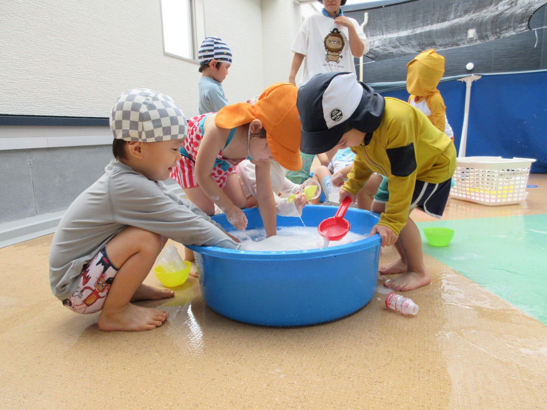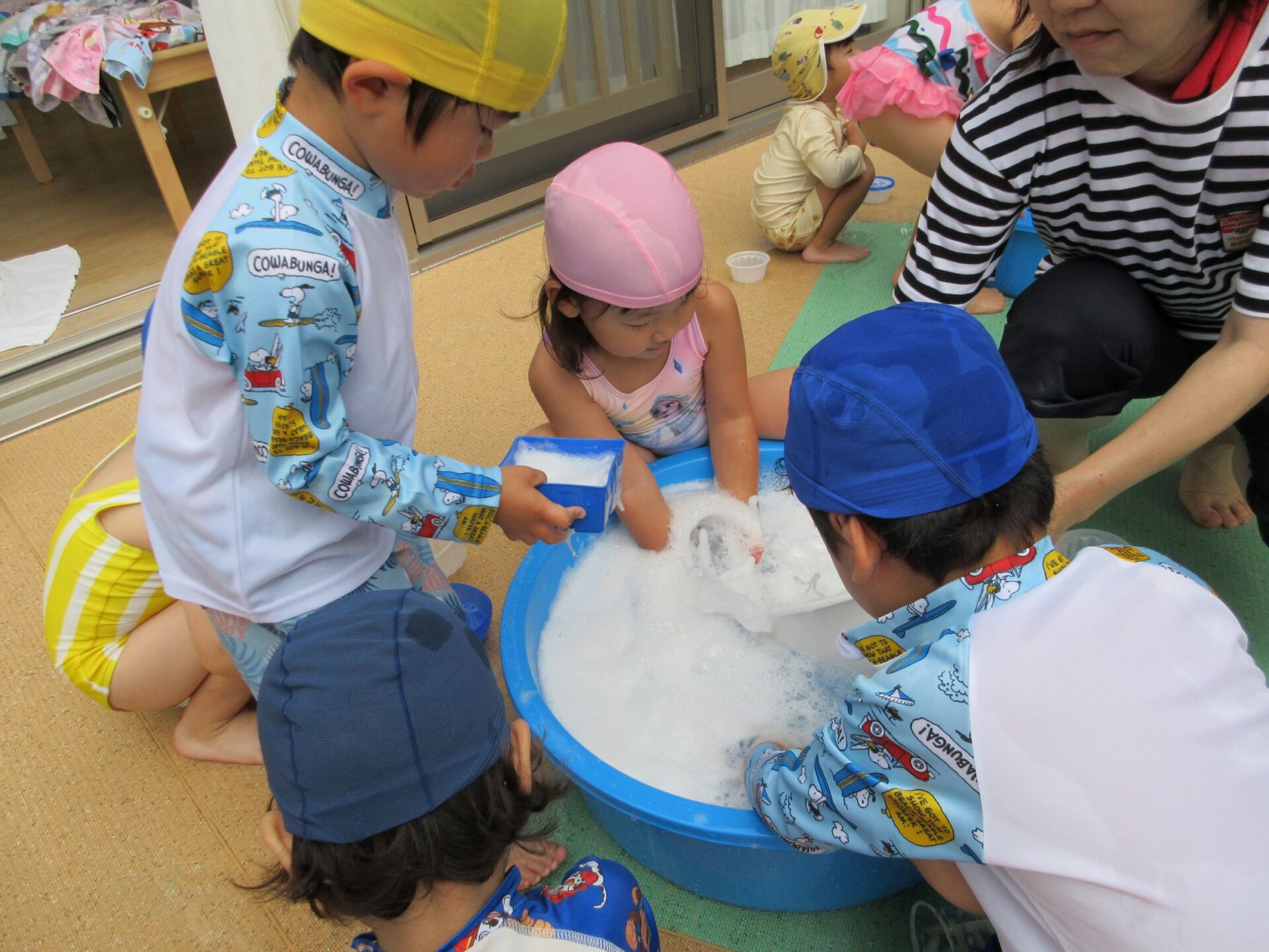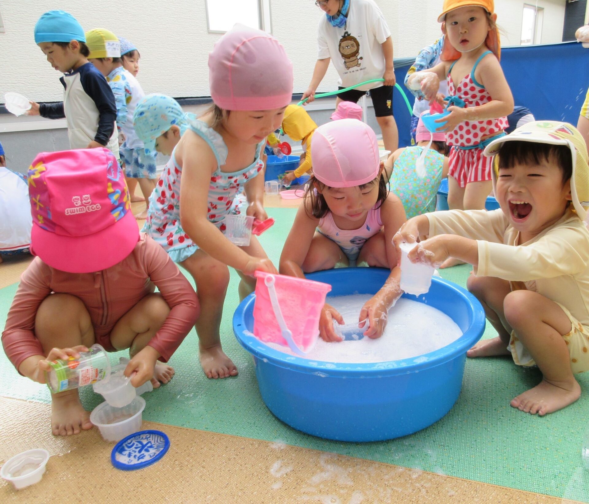 2024.07.26 お知らせ ブログ 泡遊び(にじ組) 7/10(水)泡遊びをしました。 削った石鹸をスポンジにつけて、ぷくぷく あわあわ!! 泡になると子どもたちは興味津々!! 泡だて器を使って自分たちで泡づくりにも挑戦!! たらいの中が泡いっぱいになると、大はしゃぎ!! 泡と水を混ぜたり、透明カップやアイスの容器に泡を入れて並べてみたり・・・ 泡を体にくっつけてみたり... 「きもちいい~」「あわあわ たのし~」と泡遊びに夢中な子どもたちでした!! 一覧へ戻る