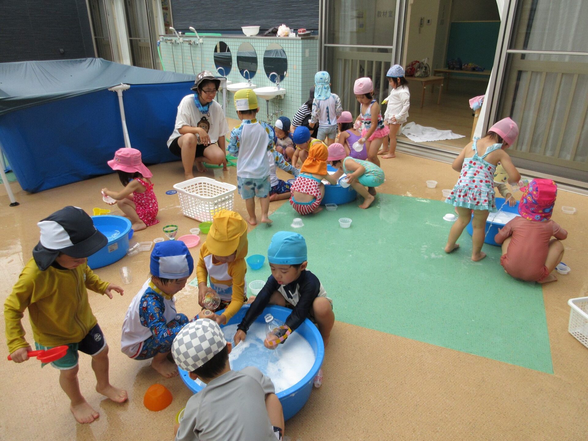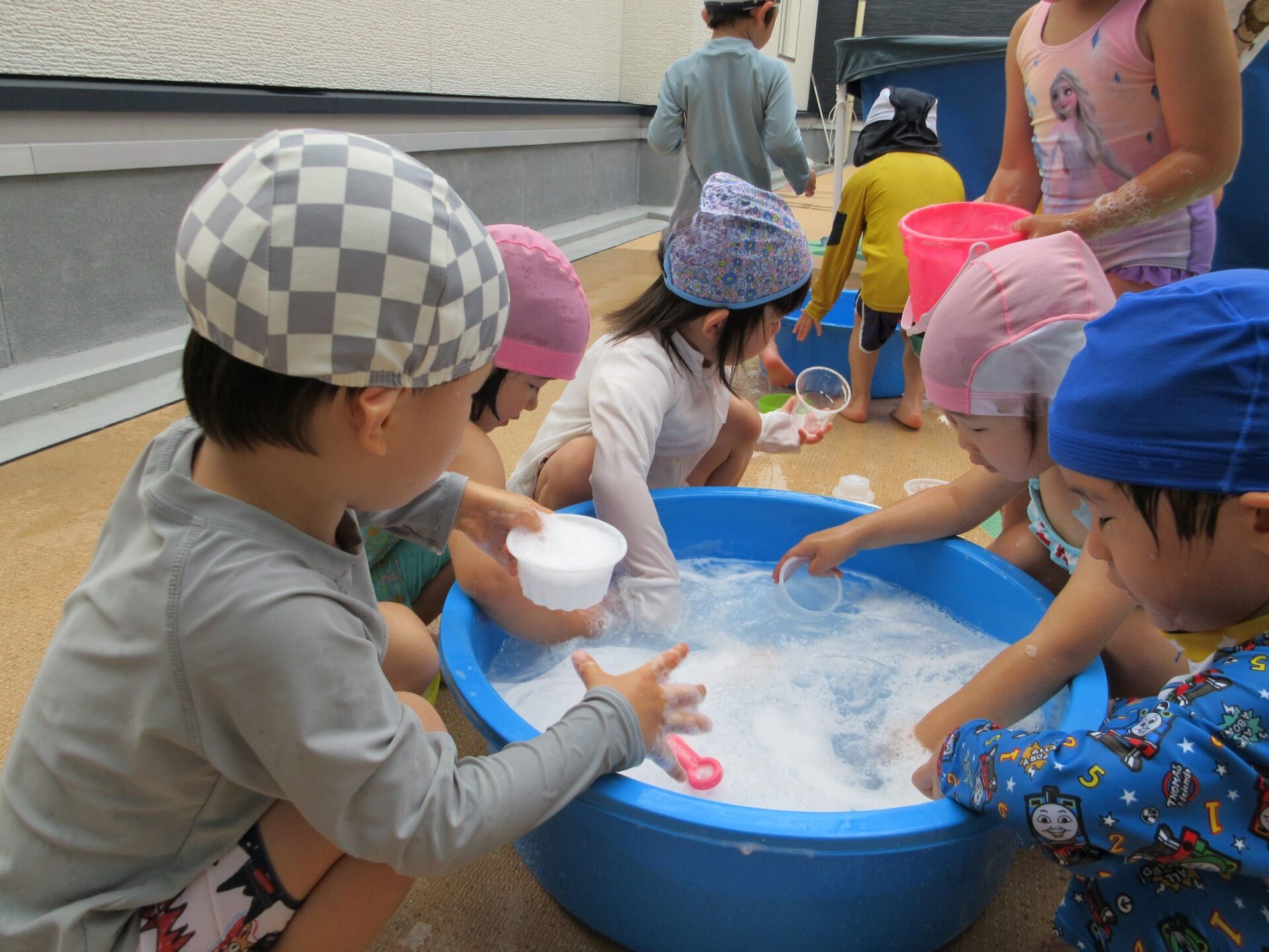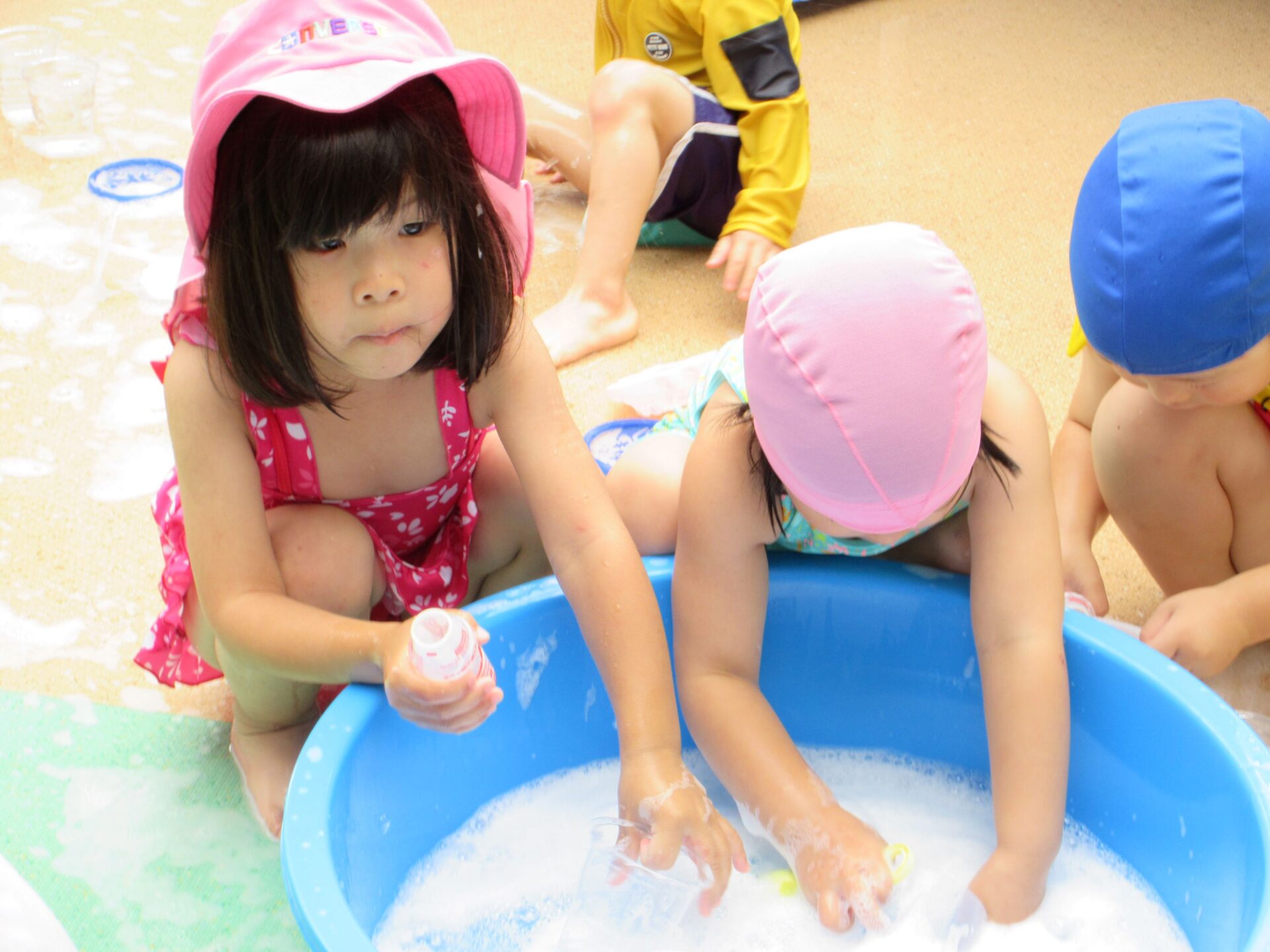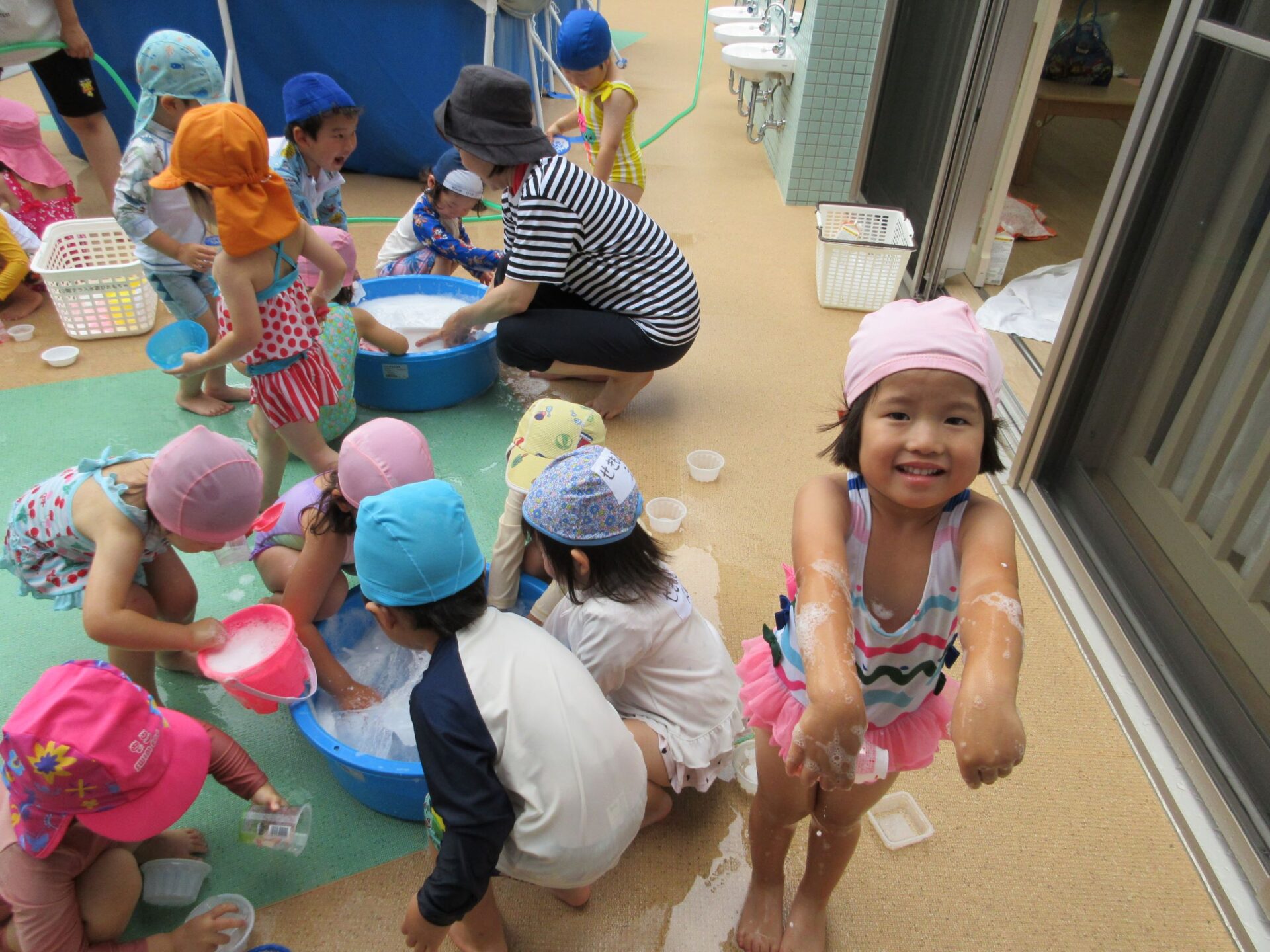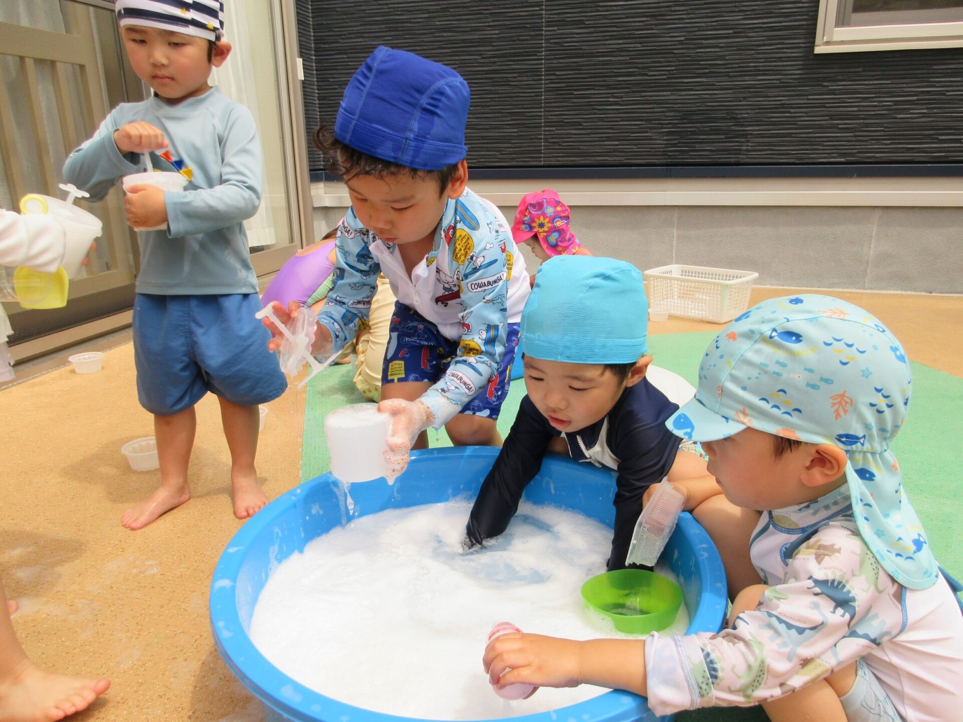 2024.07.26 お知らせ ブログ 泡遊び(にじ組) 7/10(水)泡遊びをしました。 削った石鹸をスポンジにつけて、ぷくぷく あわあわ!! 泡になると子どもたちは興味津々!! 泡だて器を使って自分たちで泡づくりにも挑戦!! たらいの中が泡いっぱいになると、大はしゃぎ!! 泡と水を混ぜたり、透明カップやアイスの容器に泡を入れて並べてみたり・・・ 泡を体にくっつけてみたり... 「きもちいい~」「あわあわ たのし~」と泡遊びに夢中な子どもたちでした!! 一覧へ戻る