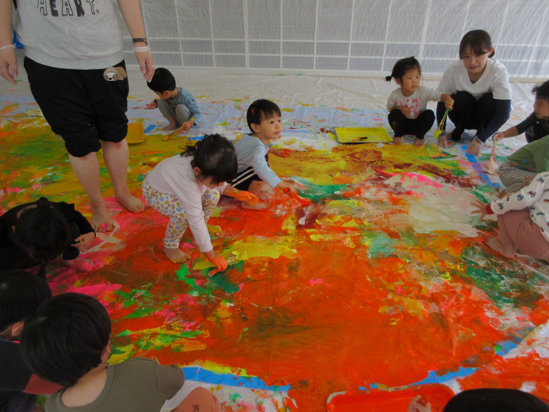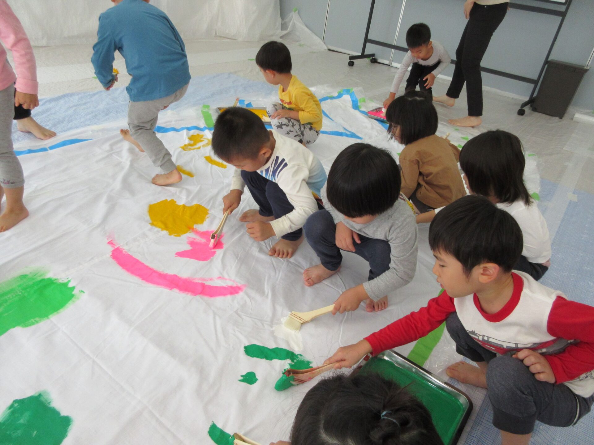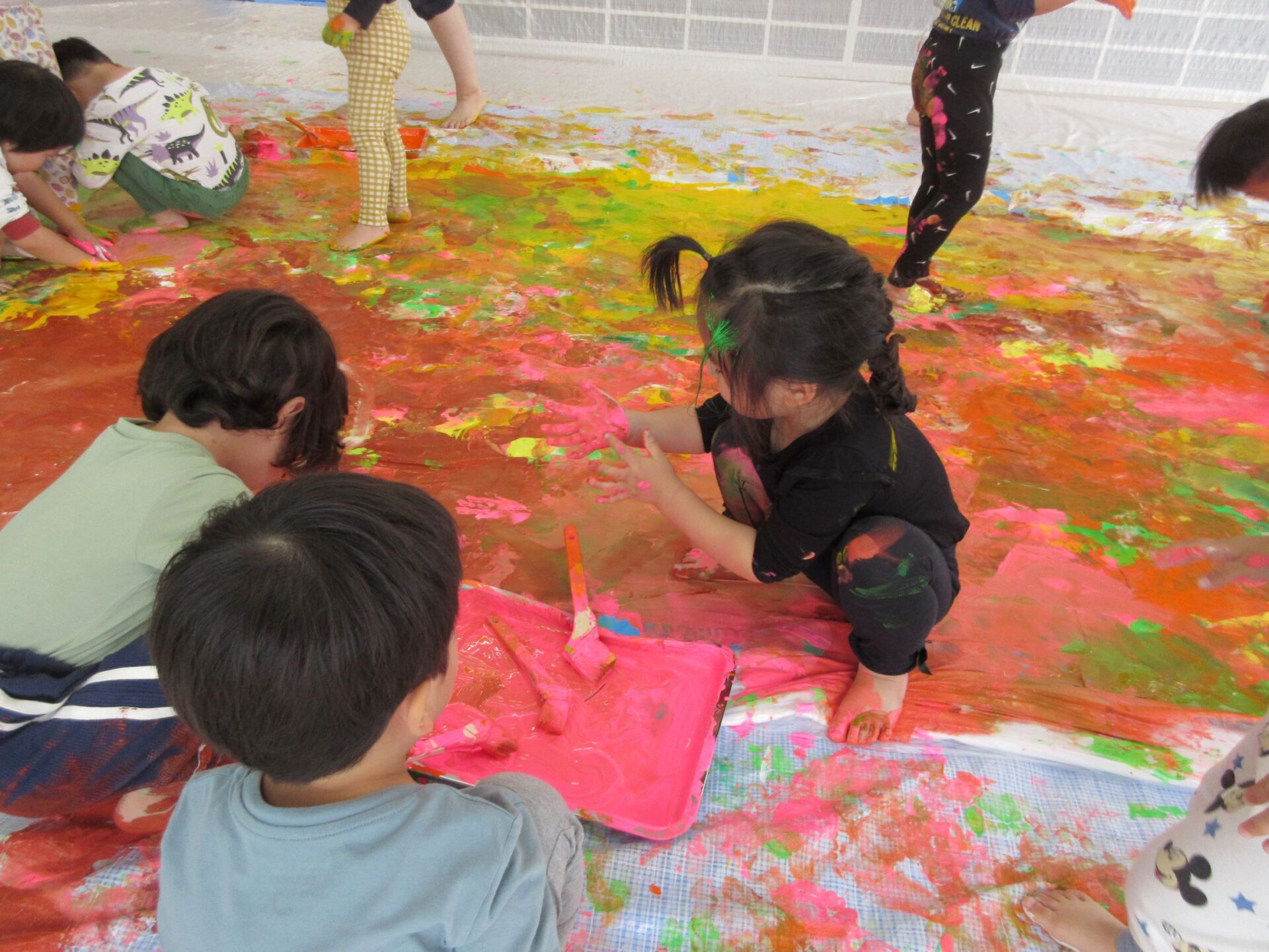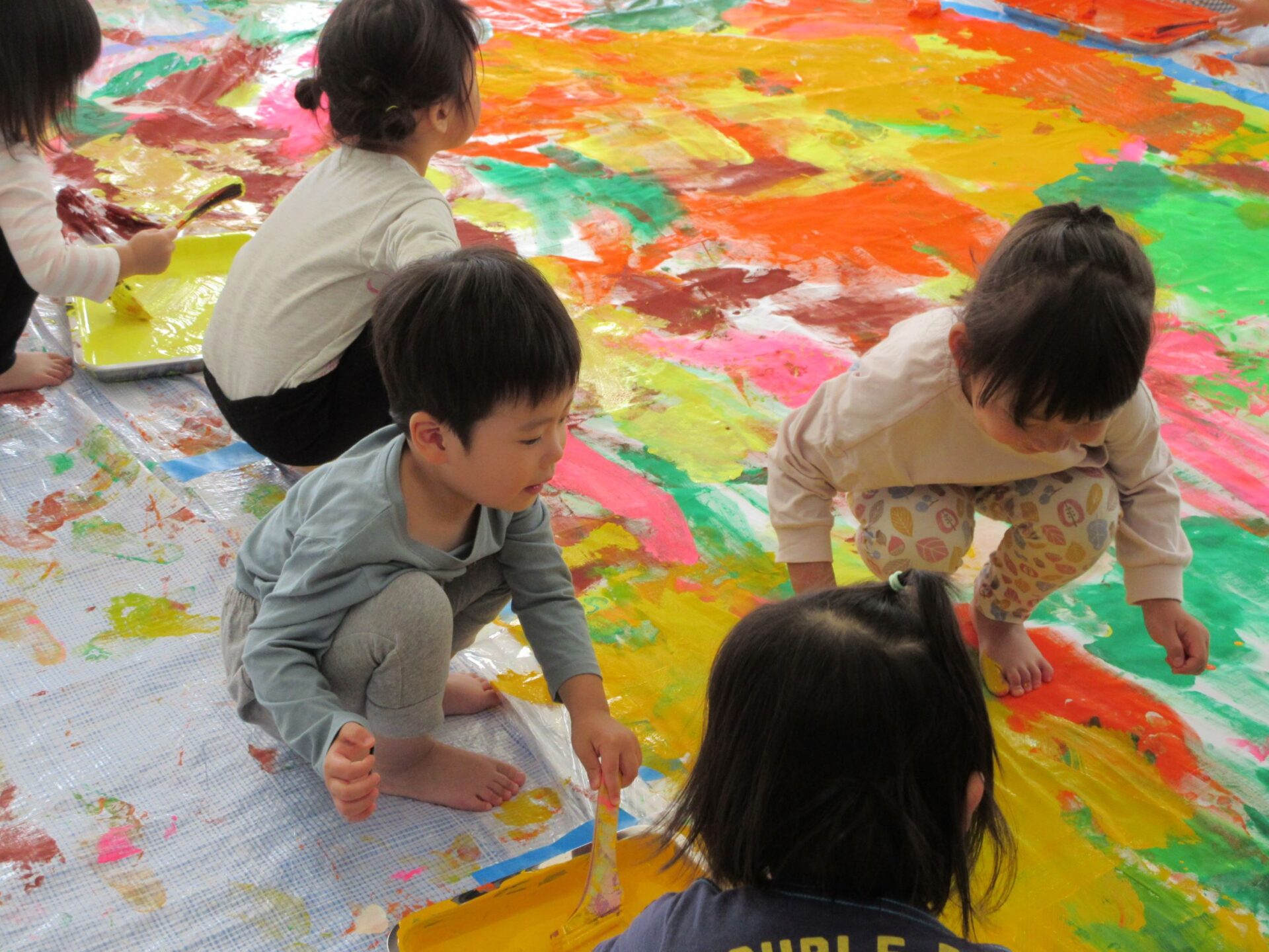 2024.07.25 お知らせ ブログ くじらタペストリー 7月16日に、4歳そら組と3歳にじ組が夏祭りにむけて、タペストリーづくりを始めました。 たて2.4m、横6mの大きな布に、くじらを描きます。 汚れても良い服装を準備しました。 こんな大きな布に描くのは、初めての体験です。 とにかく楽しい! はじめのうちは、汚れないようにしていましたが・・・。 もう足の裏にも絵の具がついて、あとはへっちゃらです。3歳にじ組さんがやってきました。そろそろ交代かな。 にじ組も頑張ります。 がんばりすぎて、色が混ざってしまいました。このあと、そら組がさらに色を加えて、2歳から0歳が色を塗ったり手形足形をつけて完成させました。出来上がりは、7月27日の夏祭りのお楽しみです。 一覧へ戻る