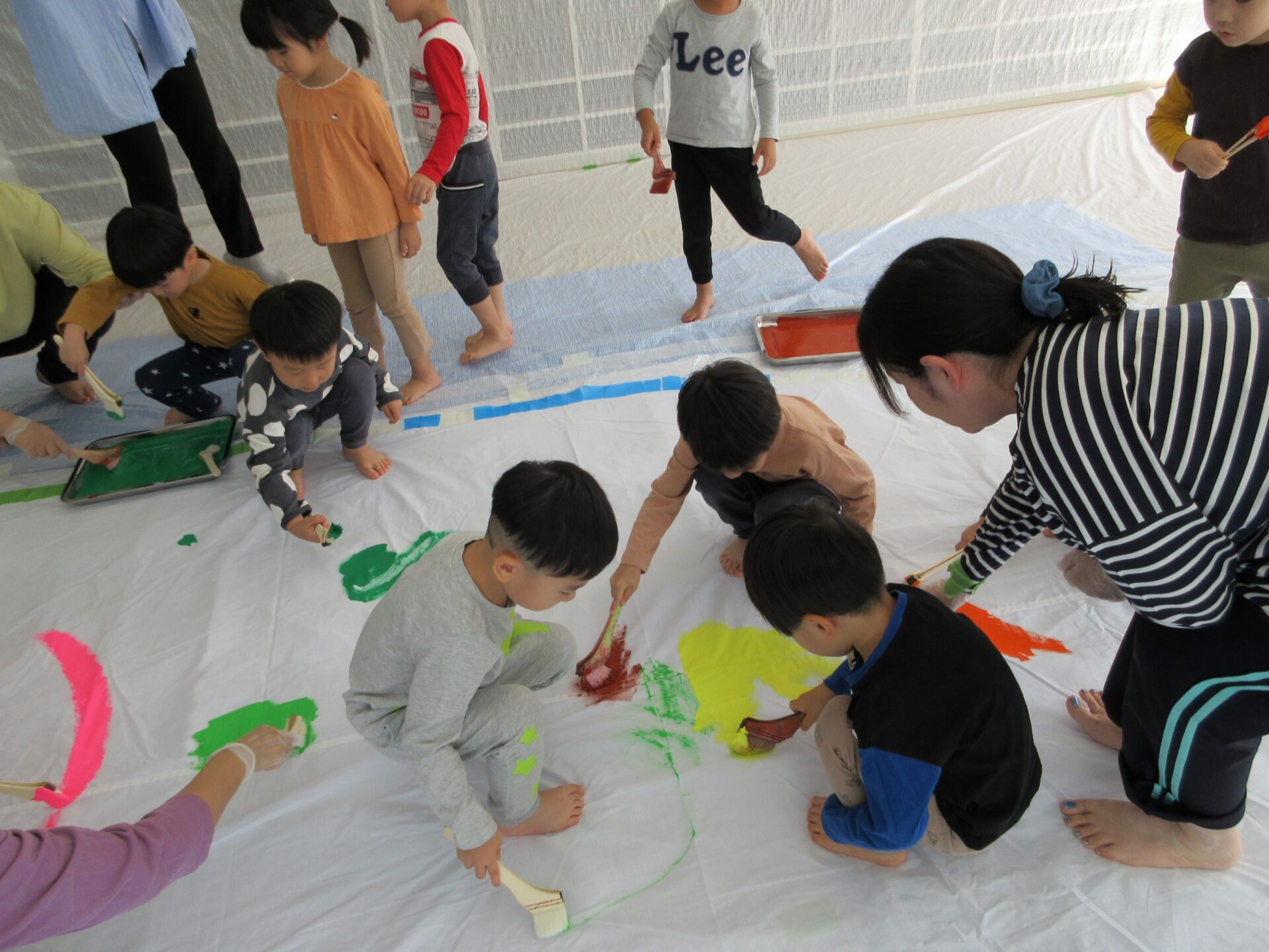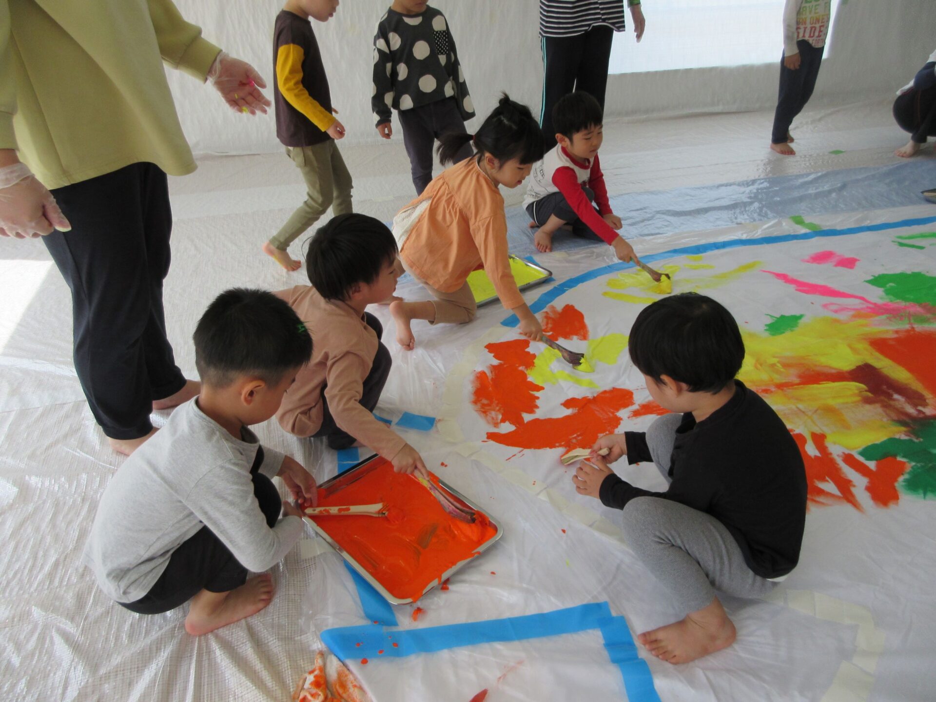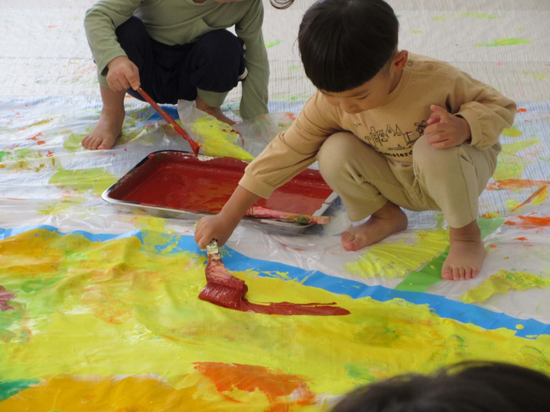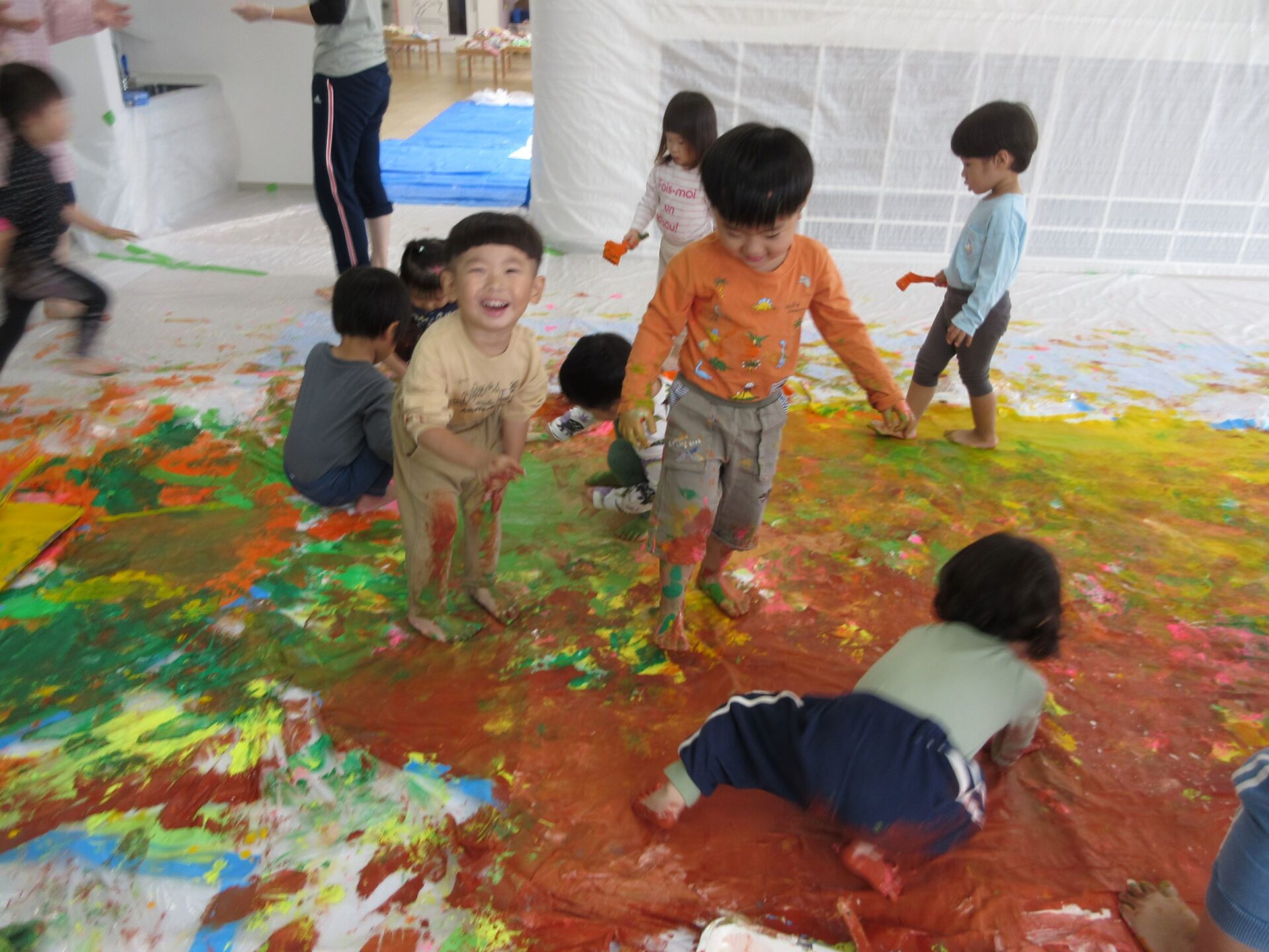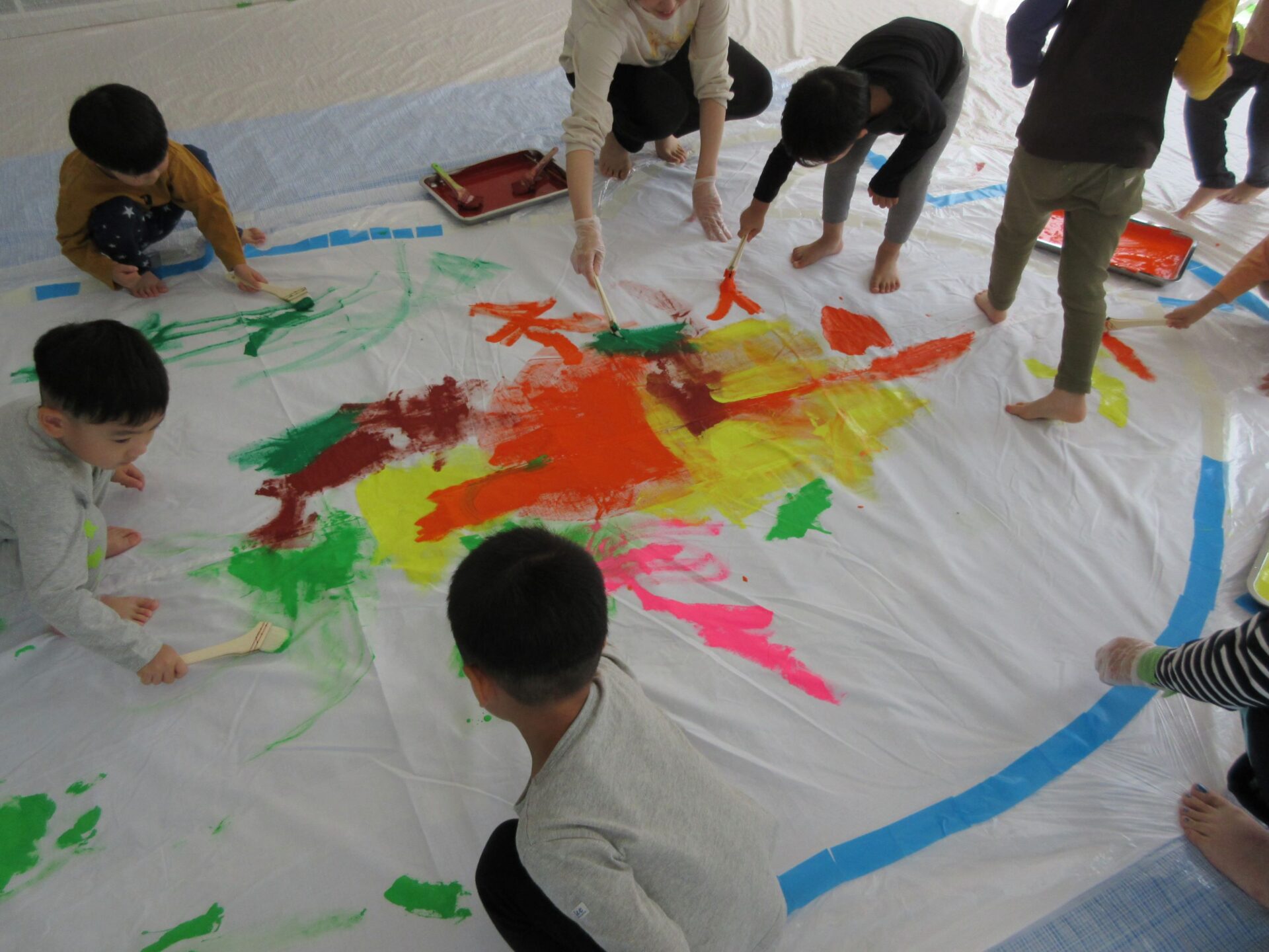 2024.07.25 お知らせ ブログ くじらタペストリー 7月16日に、4歳そら組と3歳にじ組が夏祭りにむけて、タペストリーづくりを始めました。 たて2.4m、横6mの大きな布に、くじらを描きます。 汚れても良い服装を準備しました。 こんな大きな布に描くのは、初めての体験です。 とにかく楽しい! はじめのうちは、汚れないようにしていましたが・・・。 もう足の裏にも絵の具がついて、あとはへっちゃらです。3歳にじ組さんがやってきました。そろそろ交代かな。 にじ組も頑張ります。 がんばりすぎて、色が混ざってしまいました。このあと、そら組がさらに色を加えて、2歳から0歳が色を塗ったり手形足形をつけて完成させました。出来上がりは、7月27日の夏祭りのお楽しみです。 一覧へ戻る