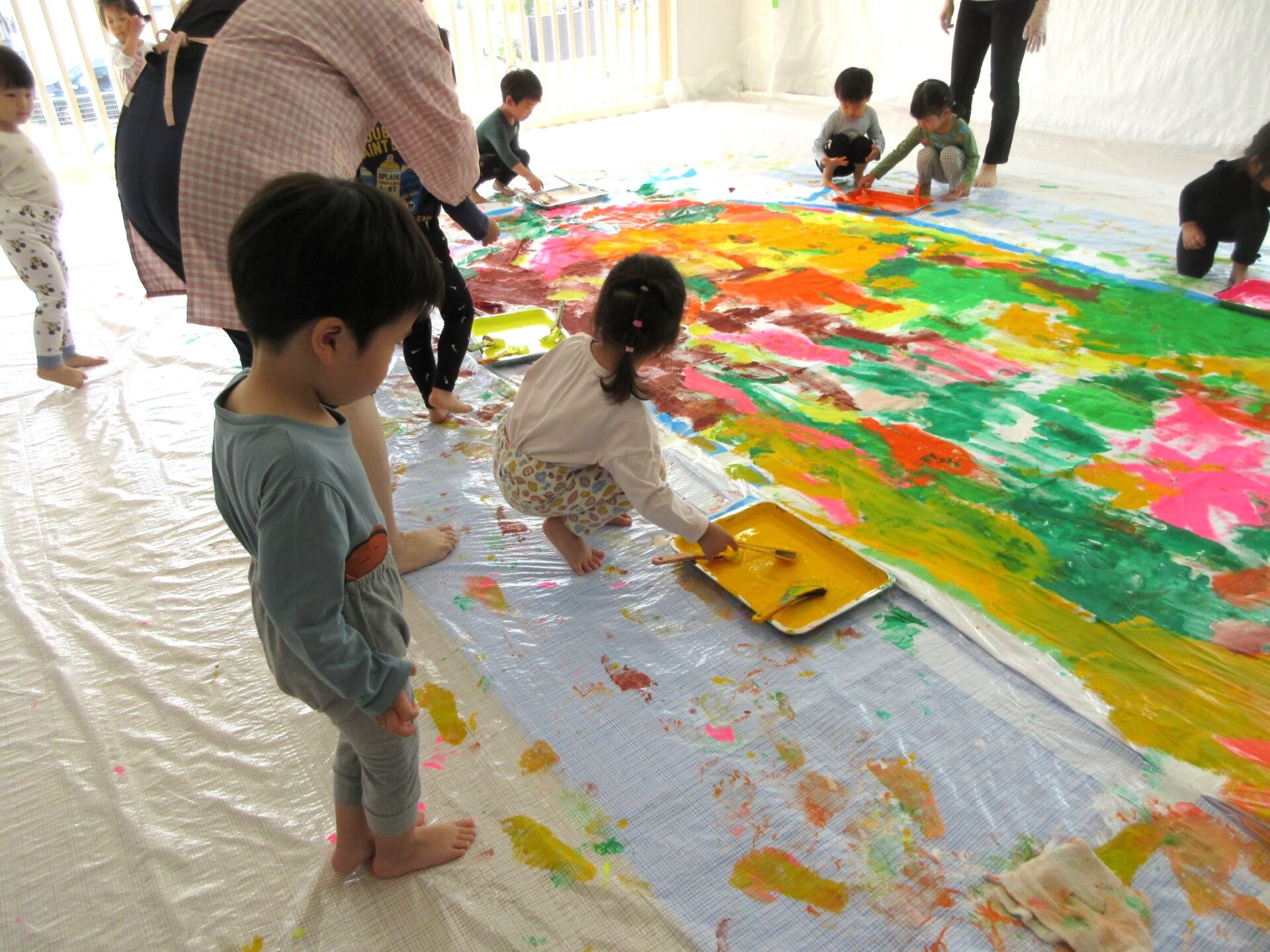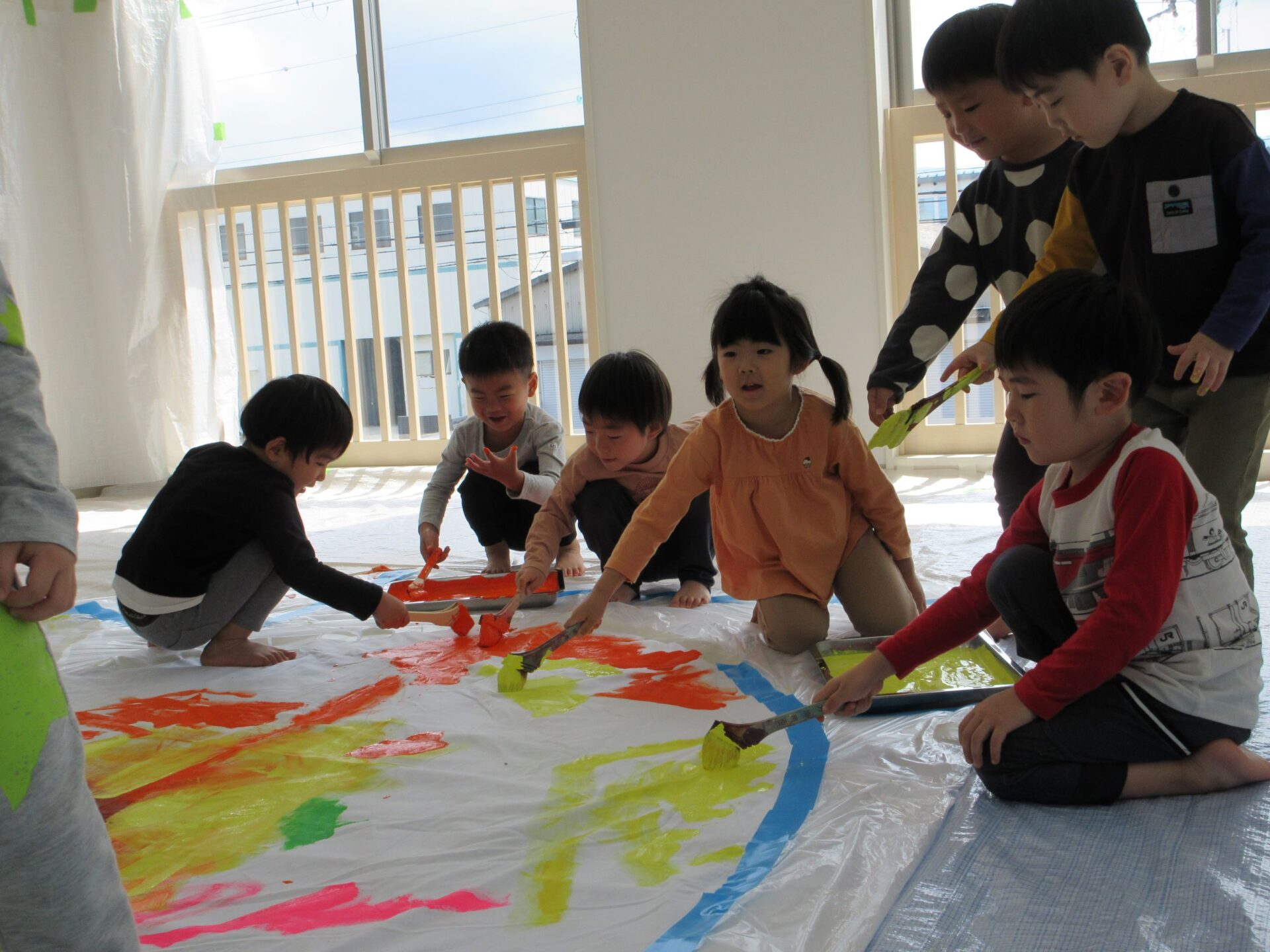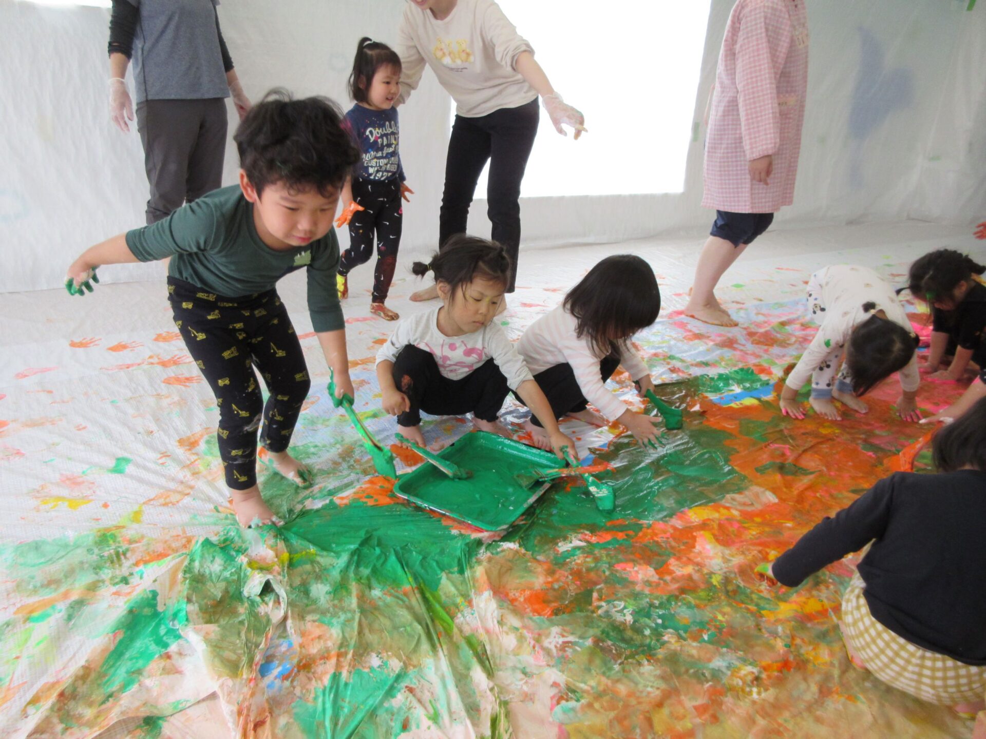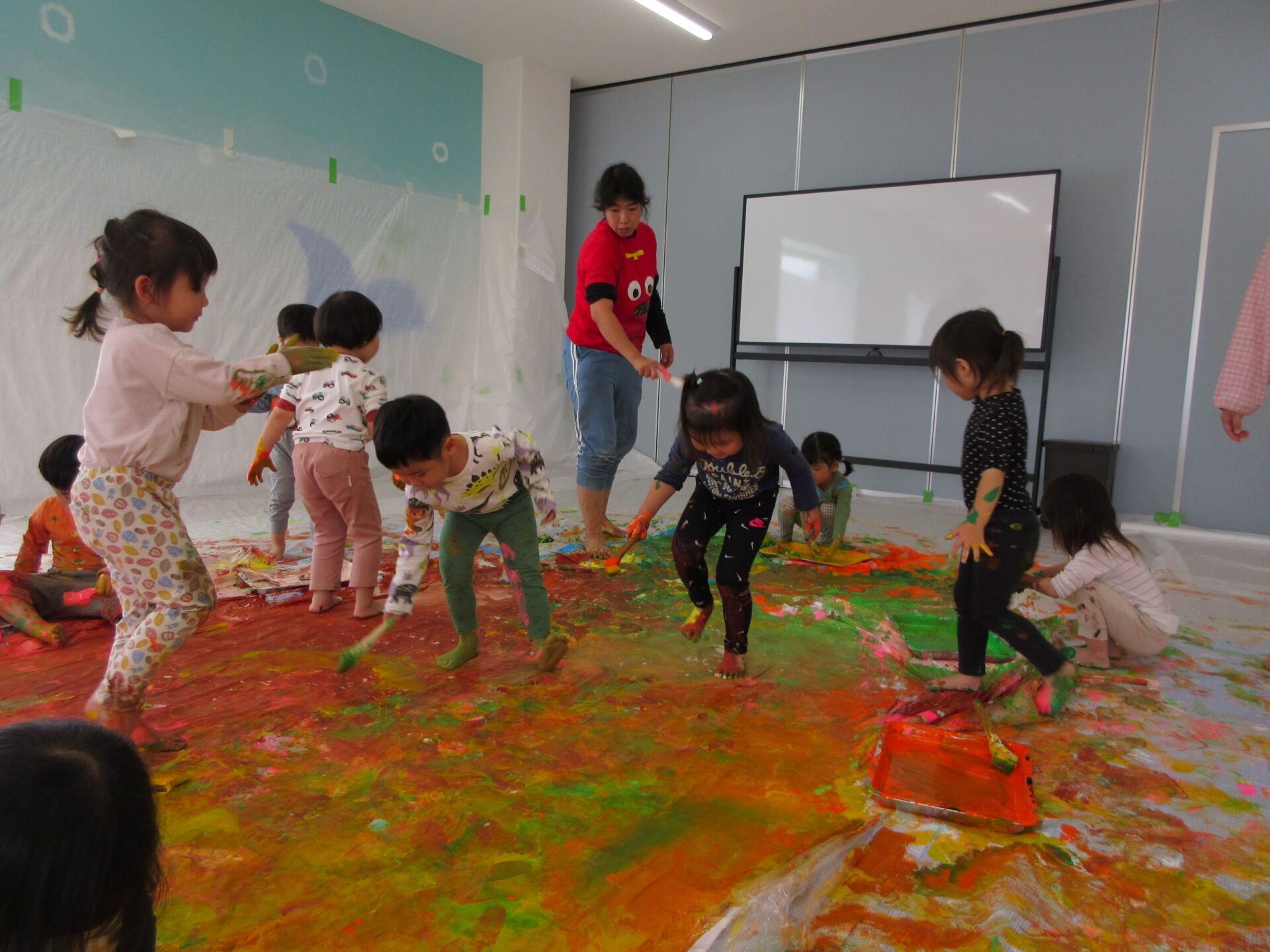 2024.07.25 お知らせ ブログ くじらタペストリー 7月16日に、4歳そら組と3歳にじ組が夏祭りにむけて、タペストリーづくりを始めました。 たて2.4m、横6mの大きな布に、くじらを描きます。 汚れても良い服装を準備しました。 こんな大きな布に描くのは、初めての体験です。 とにかく楽しい! はじめのうちは、汚れないようにしていましたが・・・。 もう足の裏にも絵の具がついて、あとはへっちゃらです。3歳にじ組さんがやってきました。そろそろ交代かな。 にじ組も頑張ります。 がんばりすぎて、色が混ざってしまいました。このあと、そら組がさらに色を加えて、2歳から0歳が色を塗ったり手形足形をつけて完成させました。出来上がりは、7月27日の夏祭りのお楽しみです。 一覧へ戻る