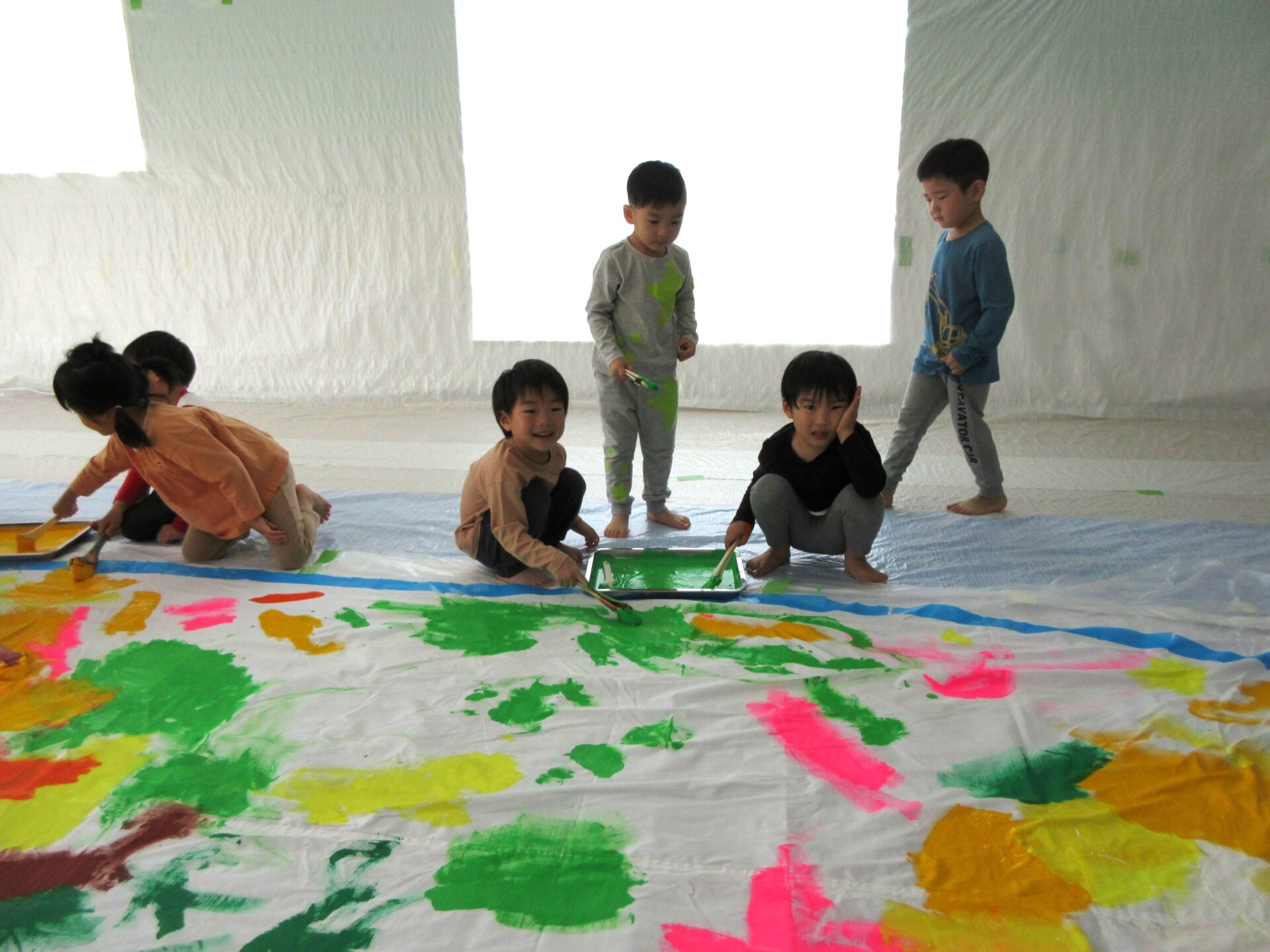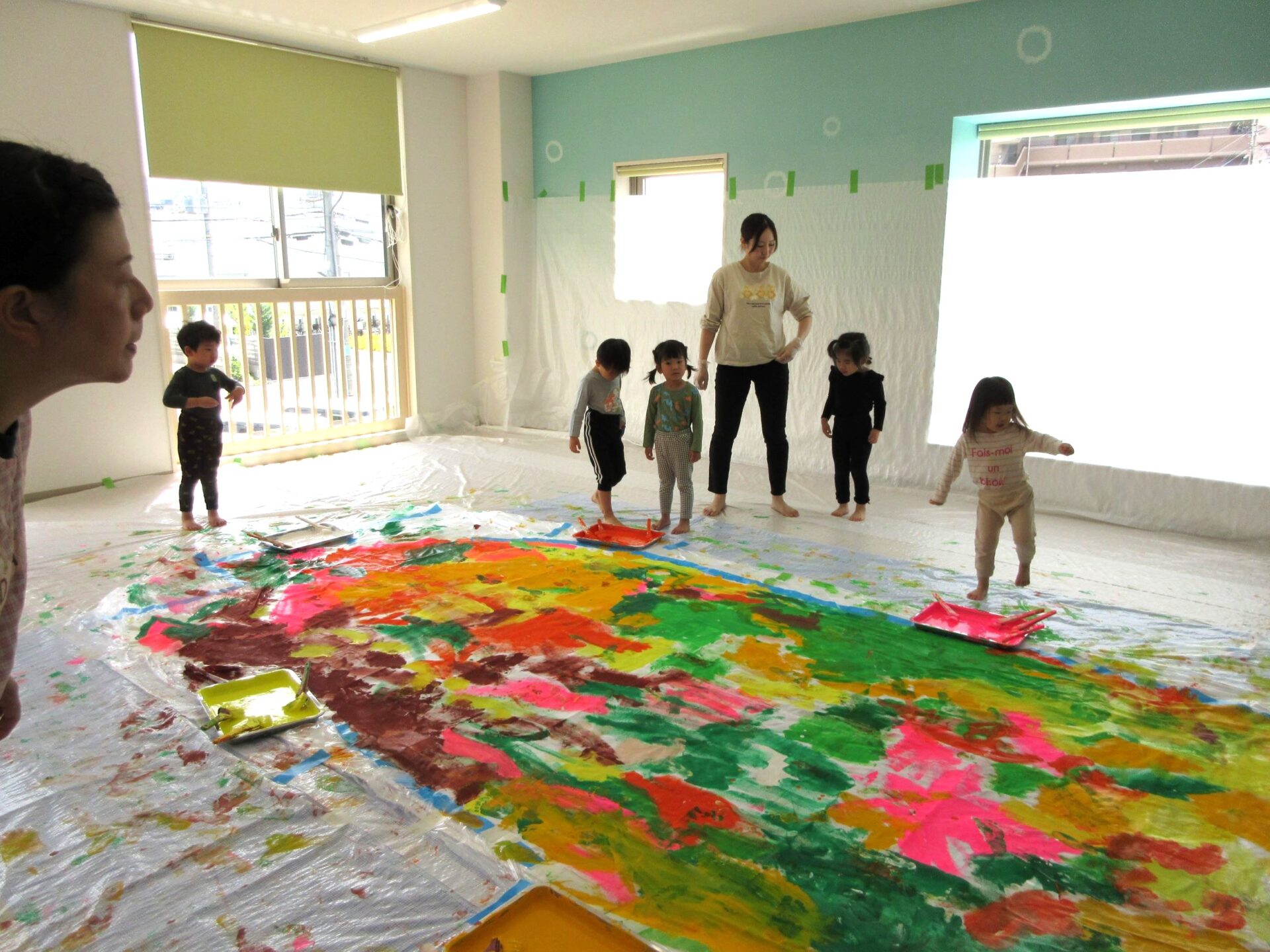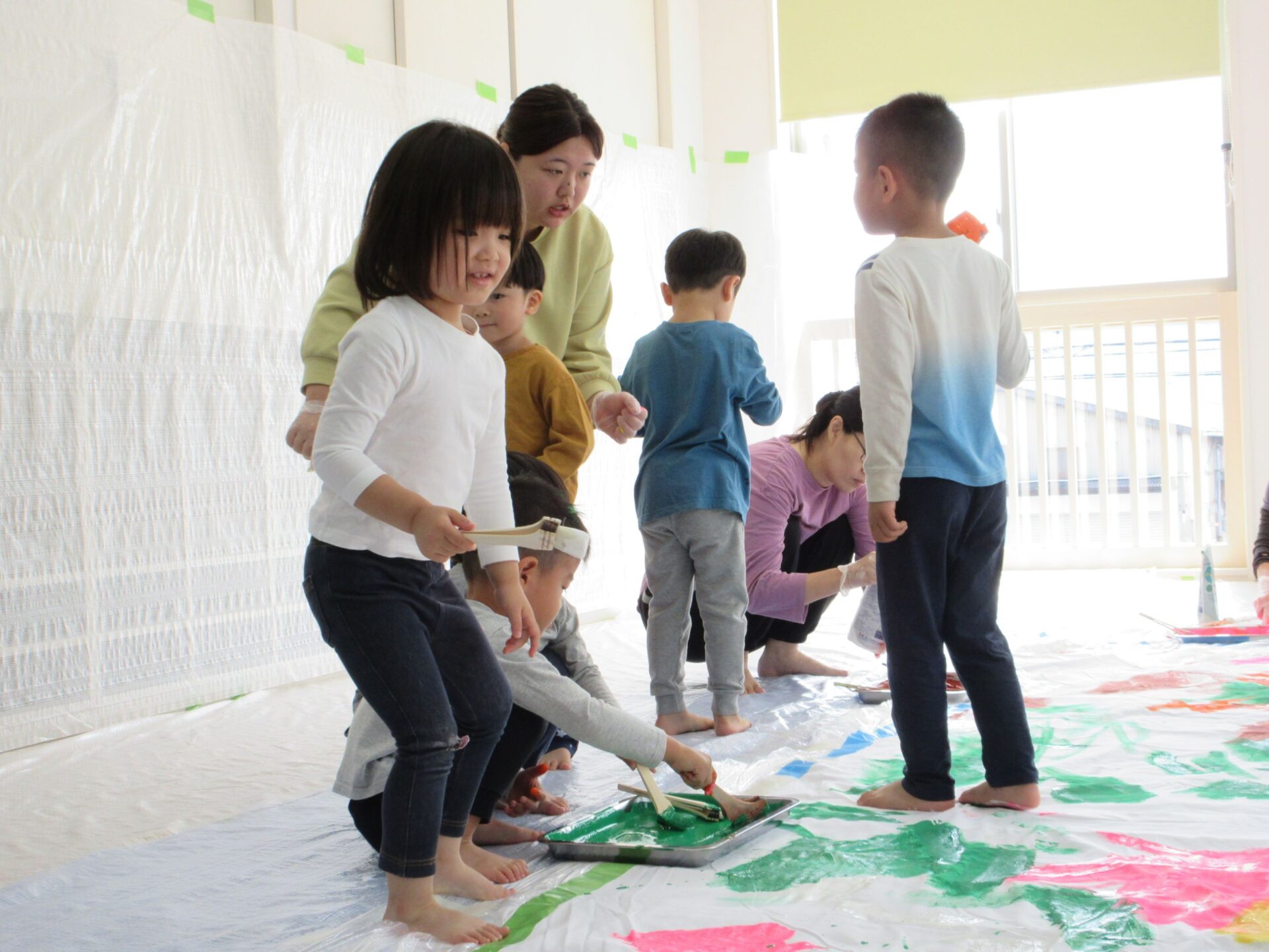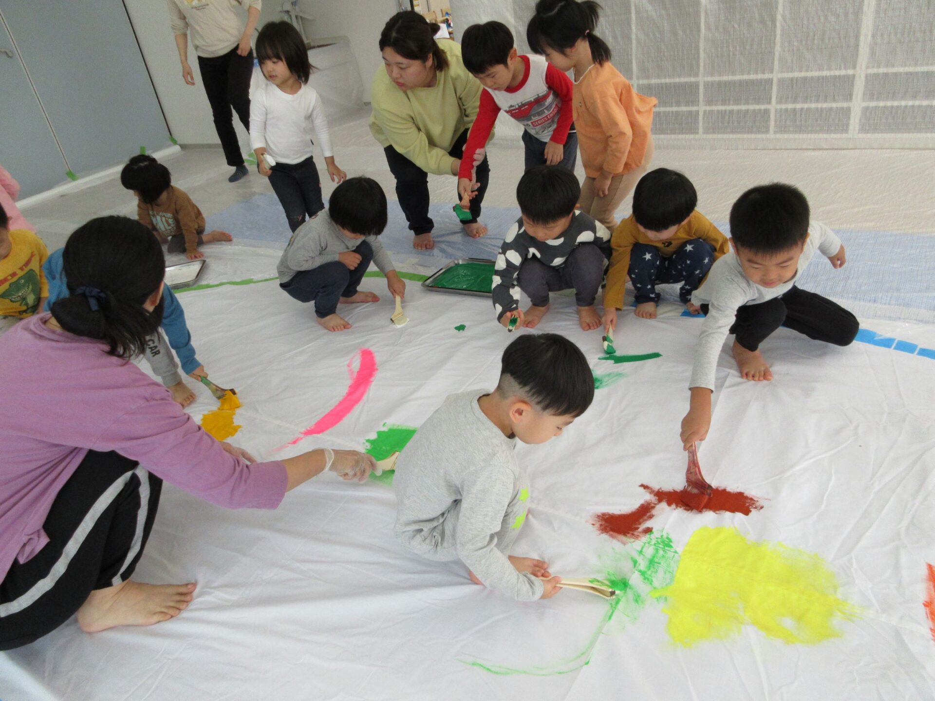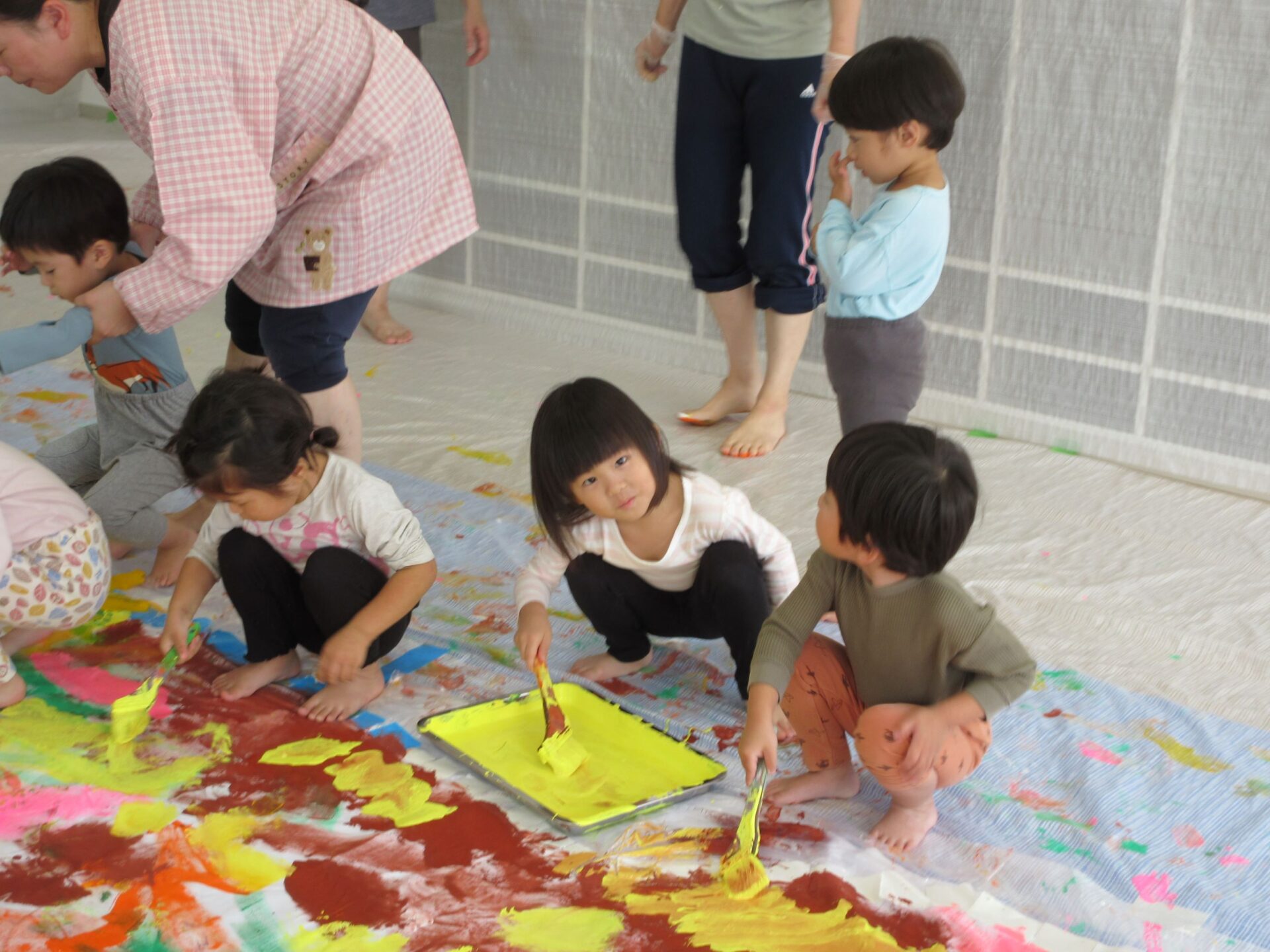 2024.07.25 お知らせ ブログ くじらタペストリー 7月16日に、4歳そら組と3歳にじ組が夏祭りにむけて、タペストリーづくりを始めました。 たて2.4m、横6mの大きな布に、くじらを描きます。 汚れても良い服装を準備しました。 こんな大きな布に描くのは、初めての体験です。 とにかく楽しい! はじめのうちは、汚れないようにしていましたが・・・。 もう足の裏にも絵の具がついて、あとはへっちゃらです。3歳にじ組さんがやってきました。そろそろ交代かな。 にじ組も頑張ります。 がんばりすぎて、色が混ざってしまいました。このあと、そら組がさらに色を加えて、2歳から0歳が色を塗ったり手形足形をつけて完成させました。出来上がりは、7月27日の夏祭りのお楽しみです。 一覧へ戻る