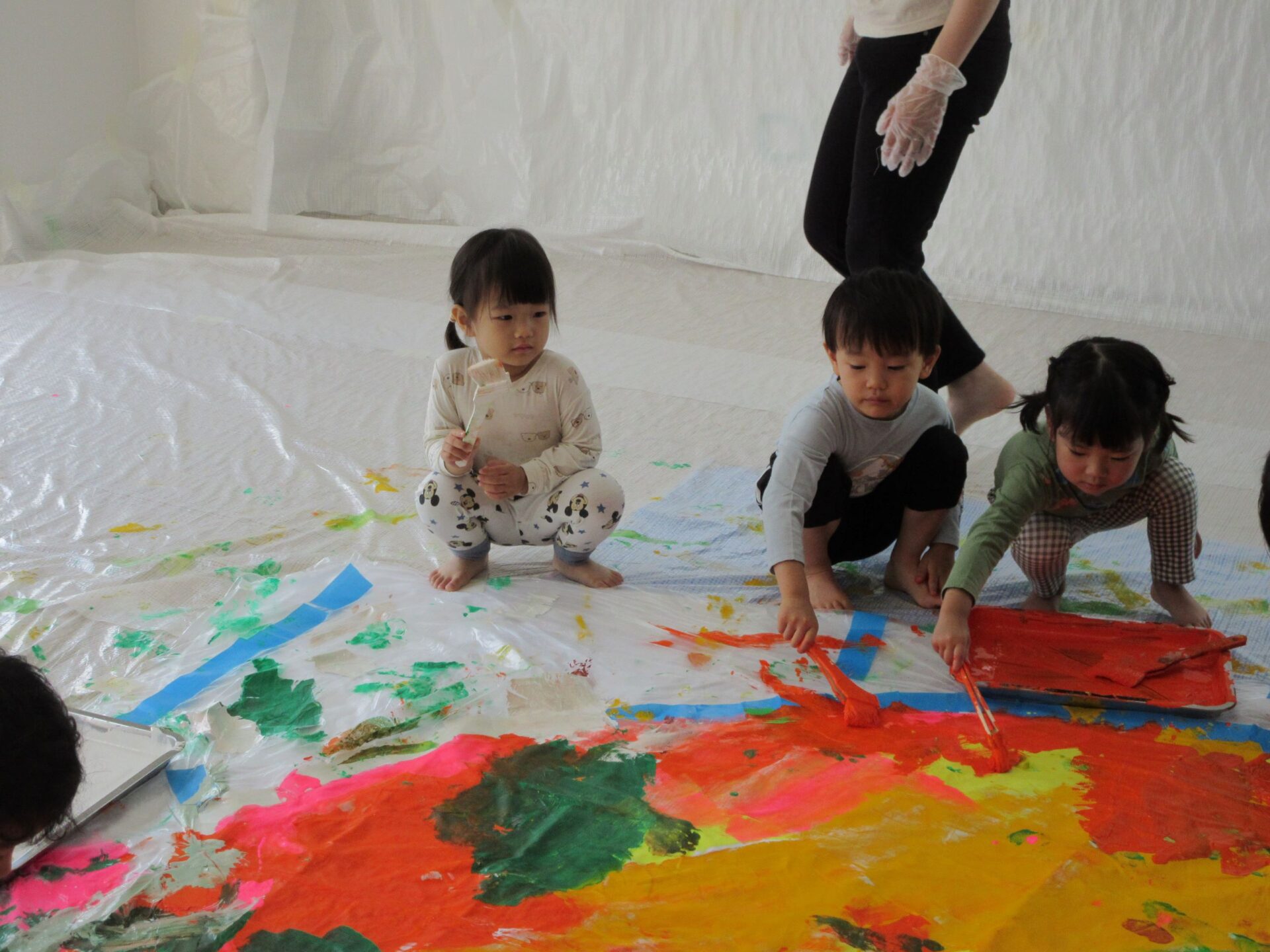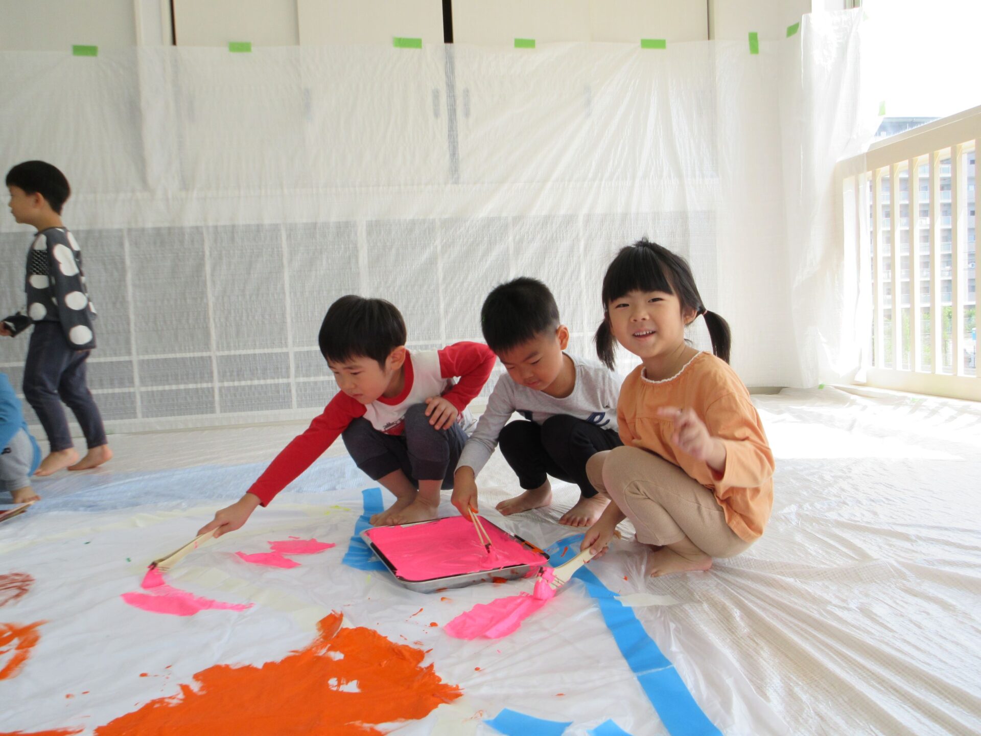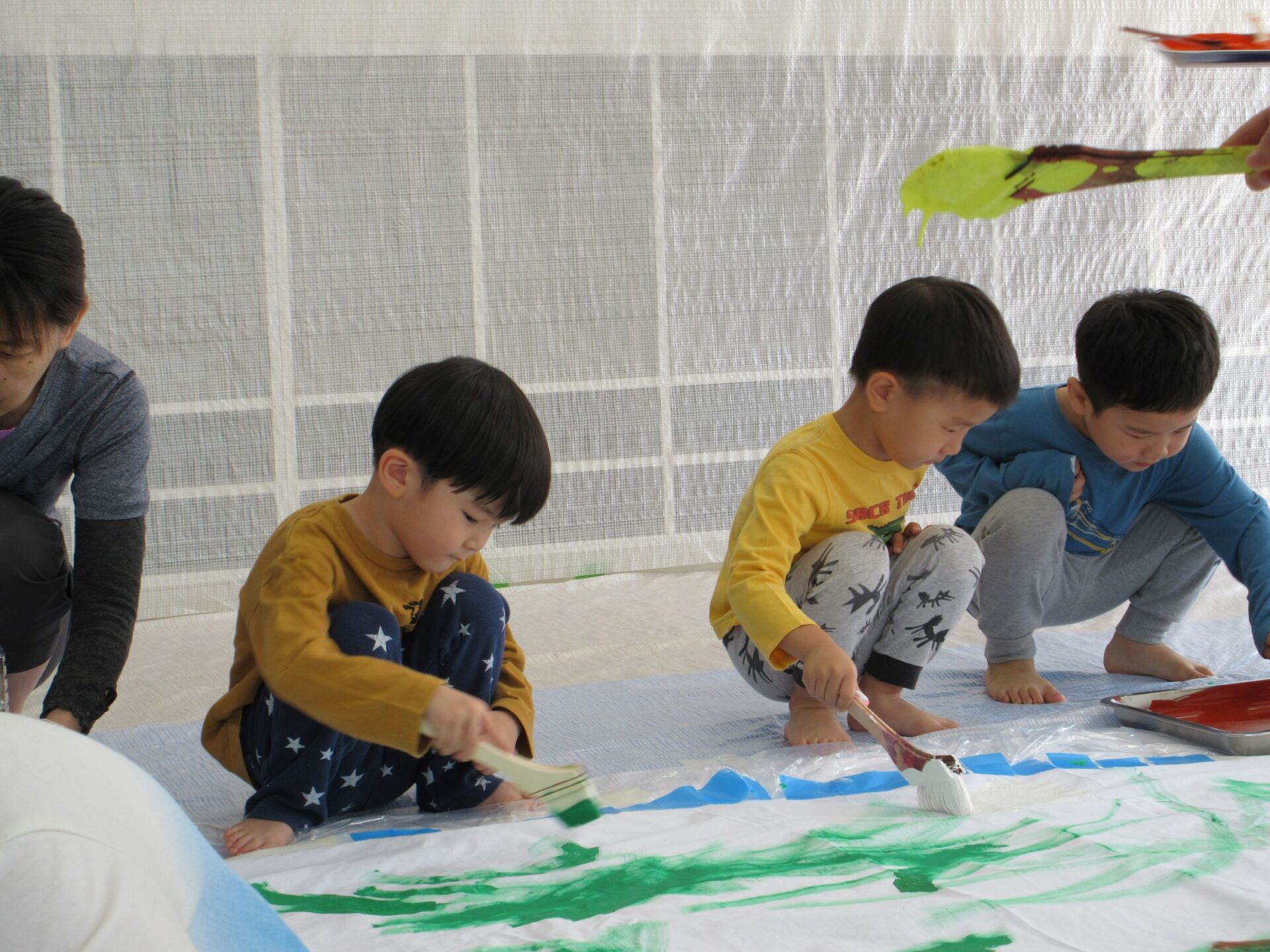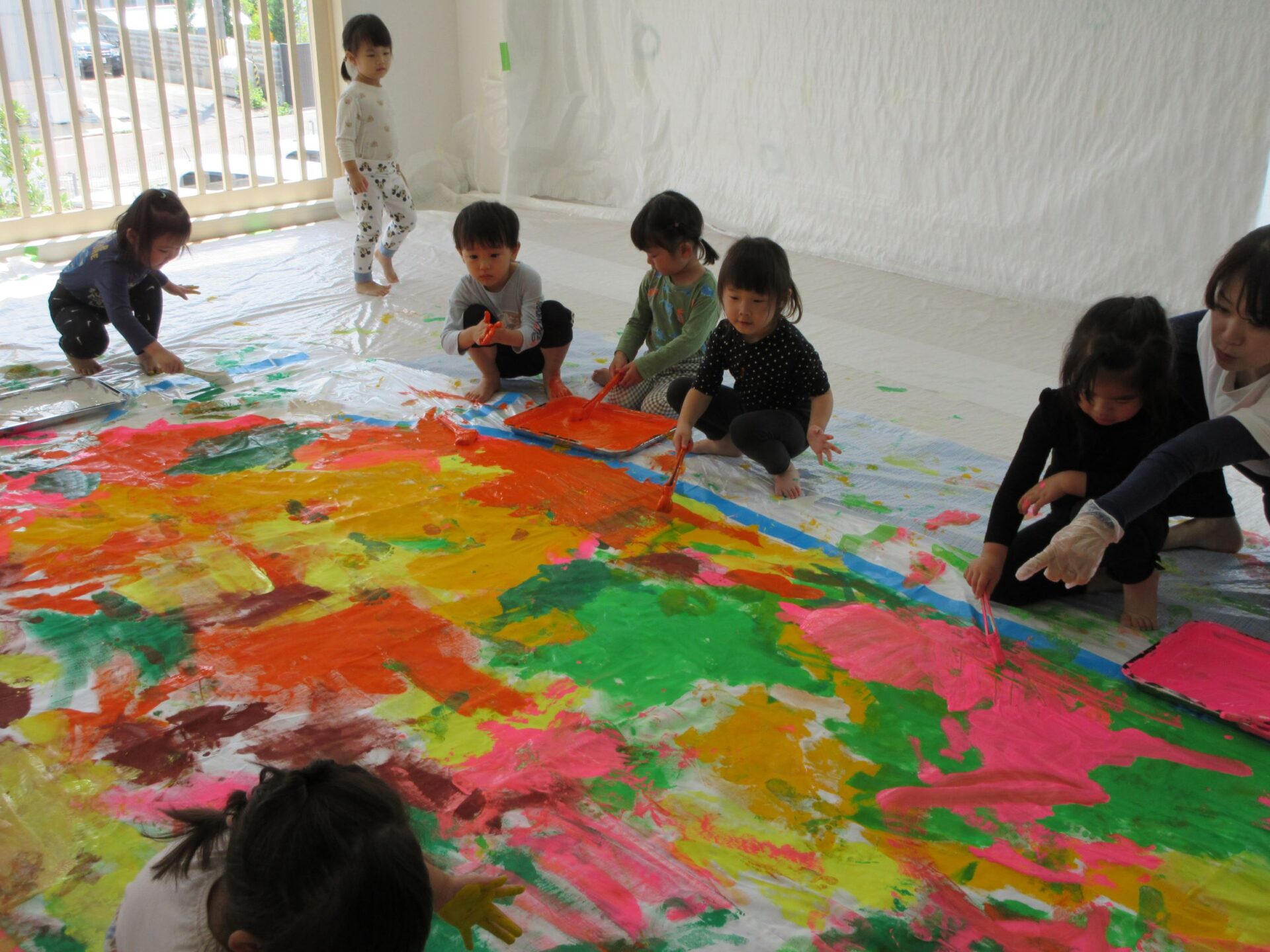 2024.07.25 お知らせ ブログ くじらタペストリー 7月16日に、4歳そら組と3歳にじ組が夏祭りにむけて、タペストリーづくりを始めました。 たて2.4m、横6mの大きな布に、くじらを描きます。 汚れても良い服装を準備しました。 こんな大きな布に描くのは、初めての体験です。 とにかく楽しい! はじめのうちは、汚れないようにしていましたが・・・。 もう足の裏にも絵の具がついて、あとはへっちゃらです。3歳にじ組さんがやってきました。そろそろ交代かな。 にじ組も頑張ります。 がんばりすぎて、色が混ざってしまいました。このあと、そら組がさらに色を加えて、2歳から0歳が色を塗ったり手形足形をつけて完成させました。出来上がりは、7月27日の夏祭りのお楽しみです。 一覧へ戻る