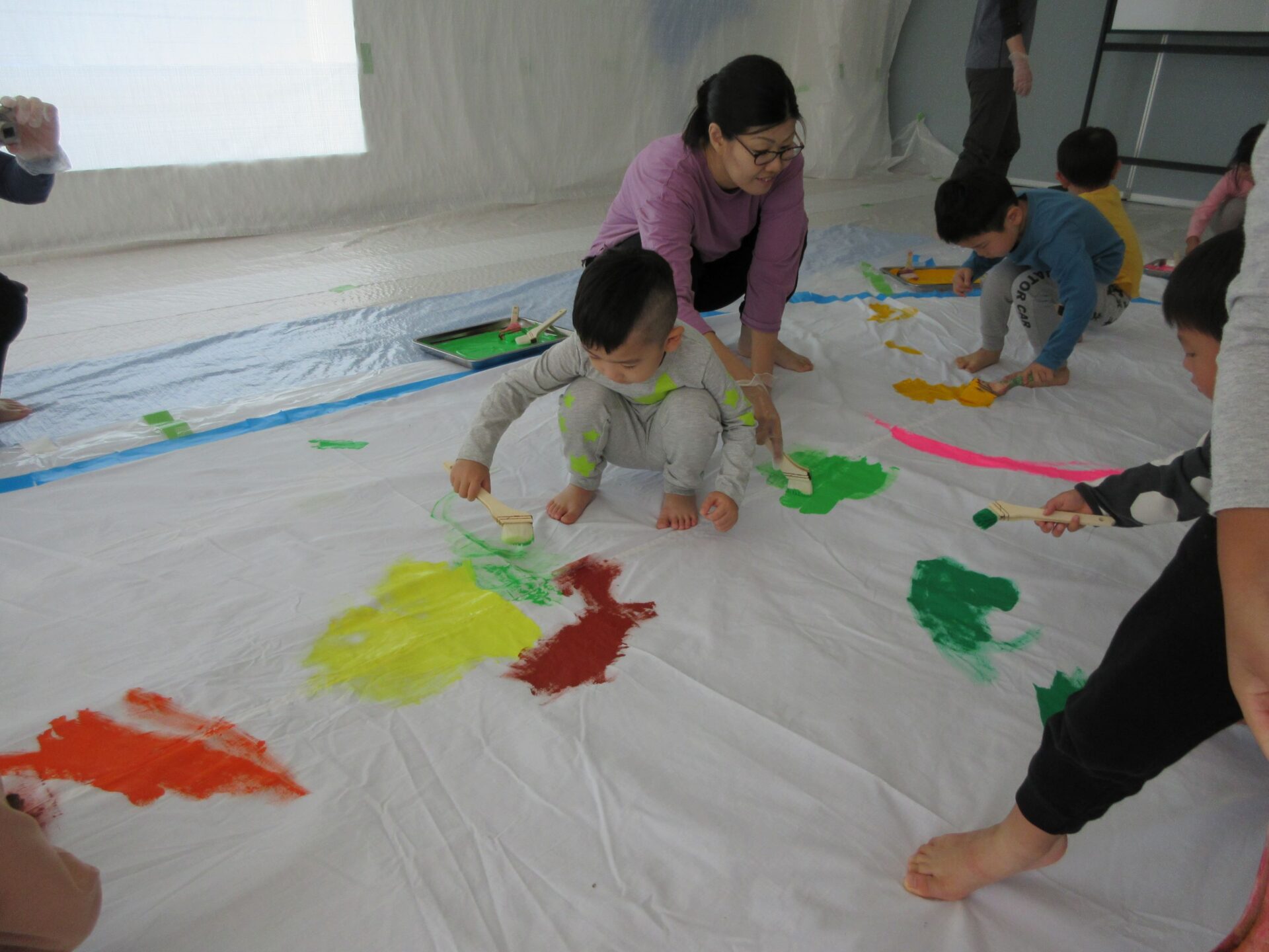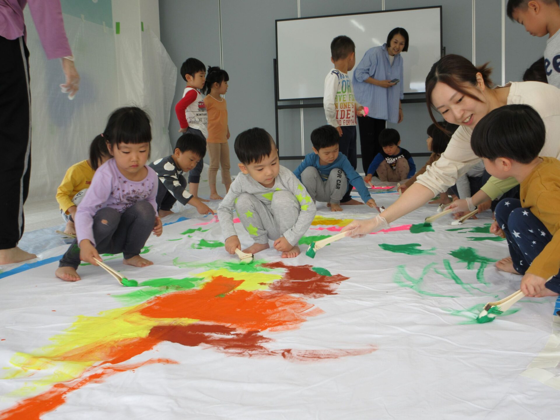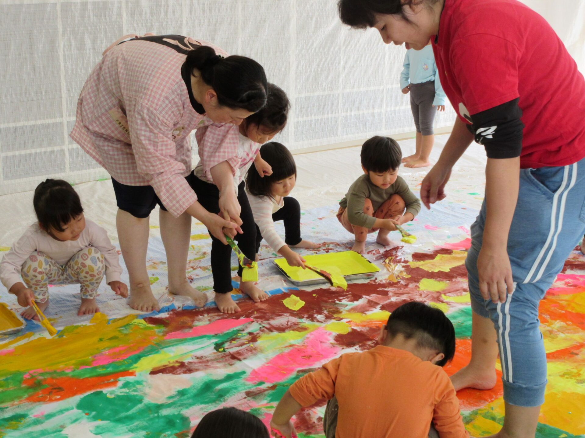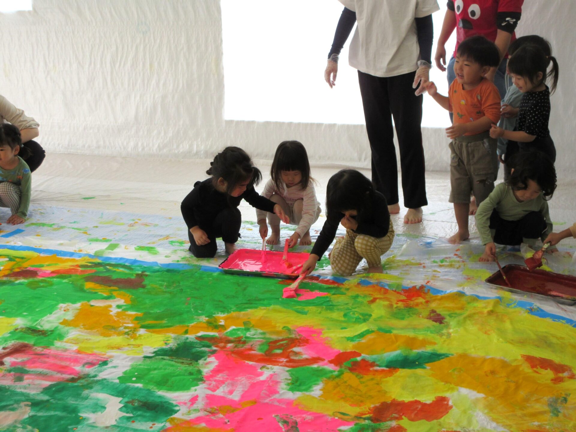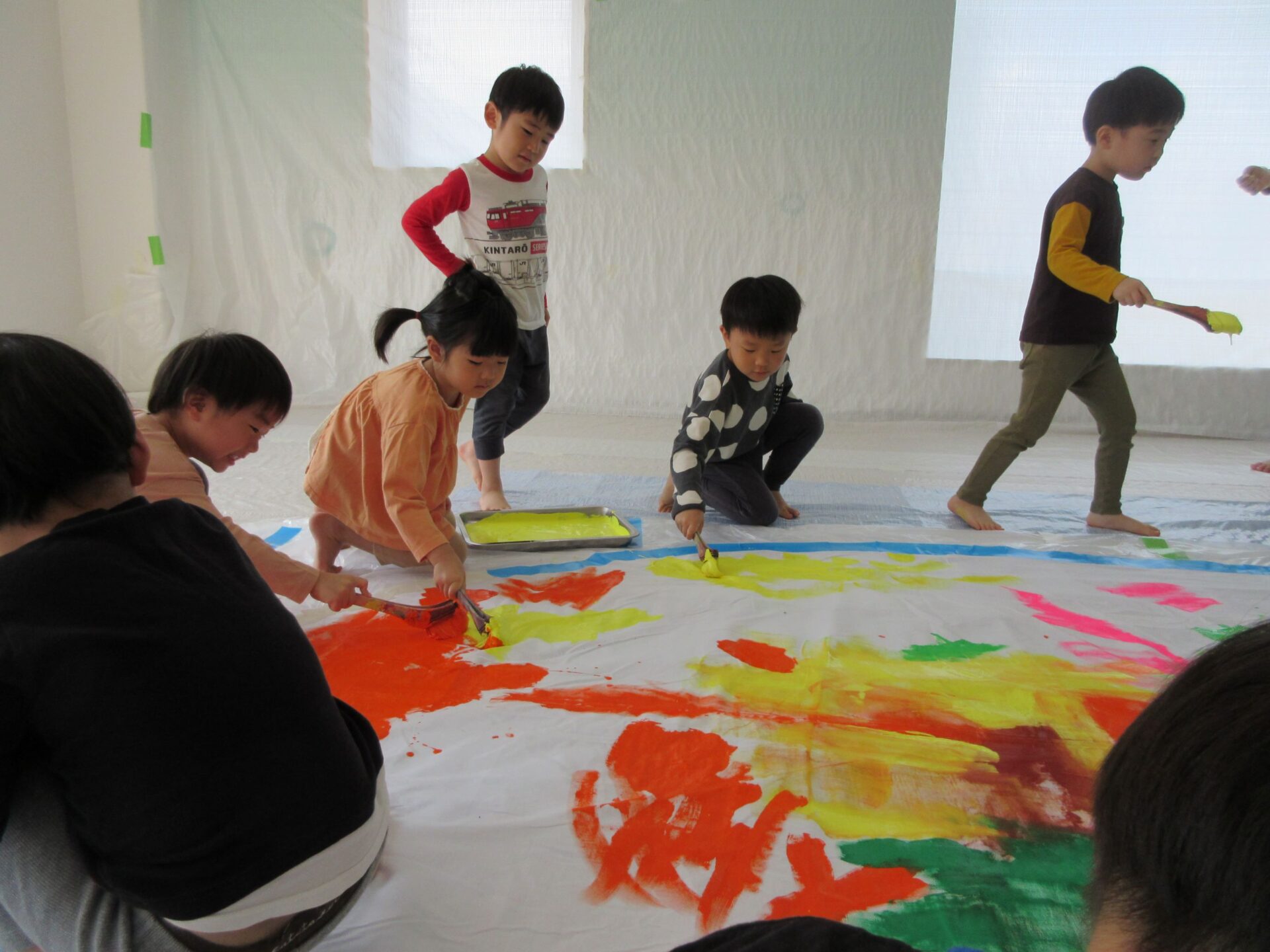 2024.07.25 お知らせ ブログ くじらタペストリー 7月16日に、4歳そら組と3歳にじ組が夏祭りにむけて、タペストリーづくりを始めました。 たて2.4m、横6mの大きな布に、くじらを描きます。 汚れても良い服装を準備しました。 こんな大きな布に描くのは、初めての体験です。 とにかく楽しい! はじめのうちは、汚れないようにしていましたが・・・。 もう足の裏にも絵の具がついて、あとはへっちゃらです。3歳にじ組さんがやってきました。そろそろ交代かな。 にじ組も頑張ります。 がんばりすぎて、色が混ざってしまいました。このあと、そら組がさらに色を加えて、2歳から0歳が色を塗ったり手形足形をつけて完成させました。出来上がりは、7月27日の夏祭りのお楽しみです。 一覧へ戻る