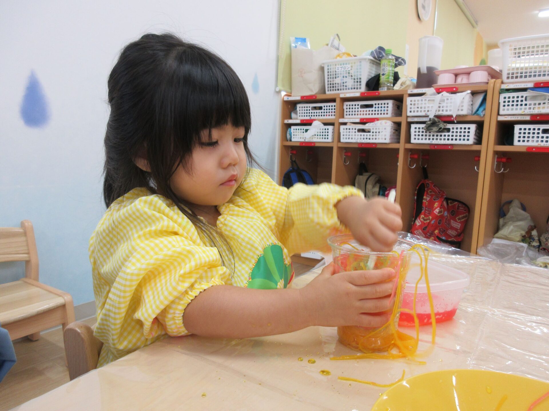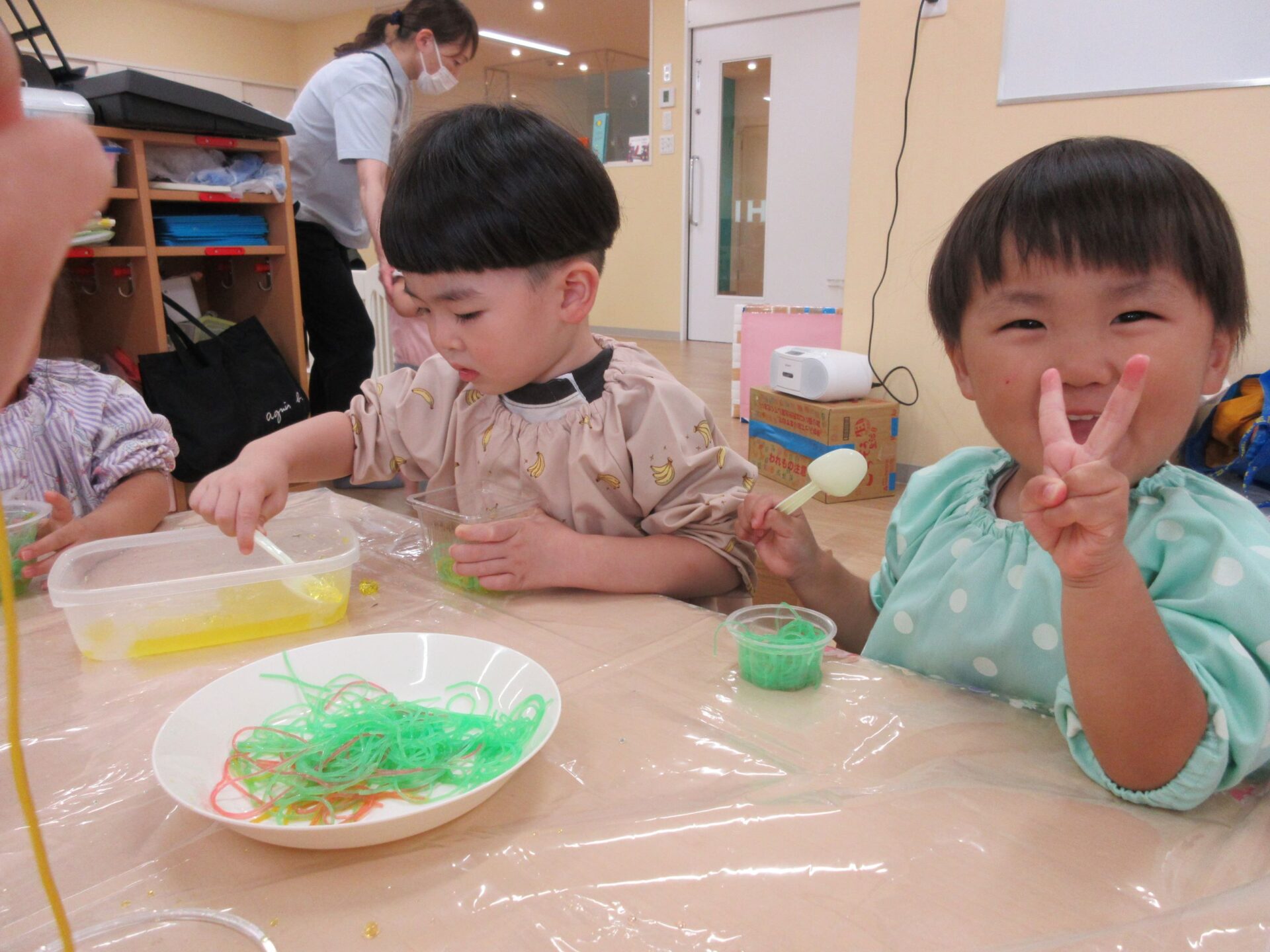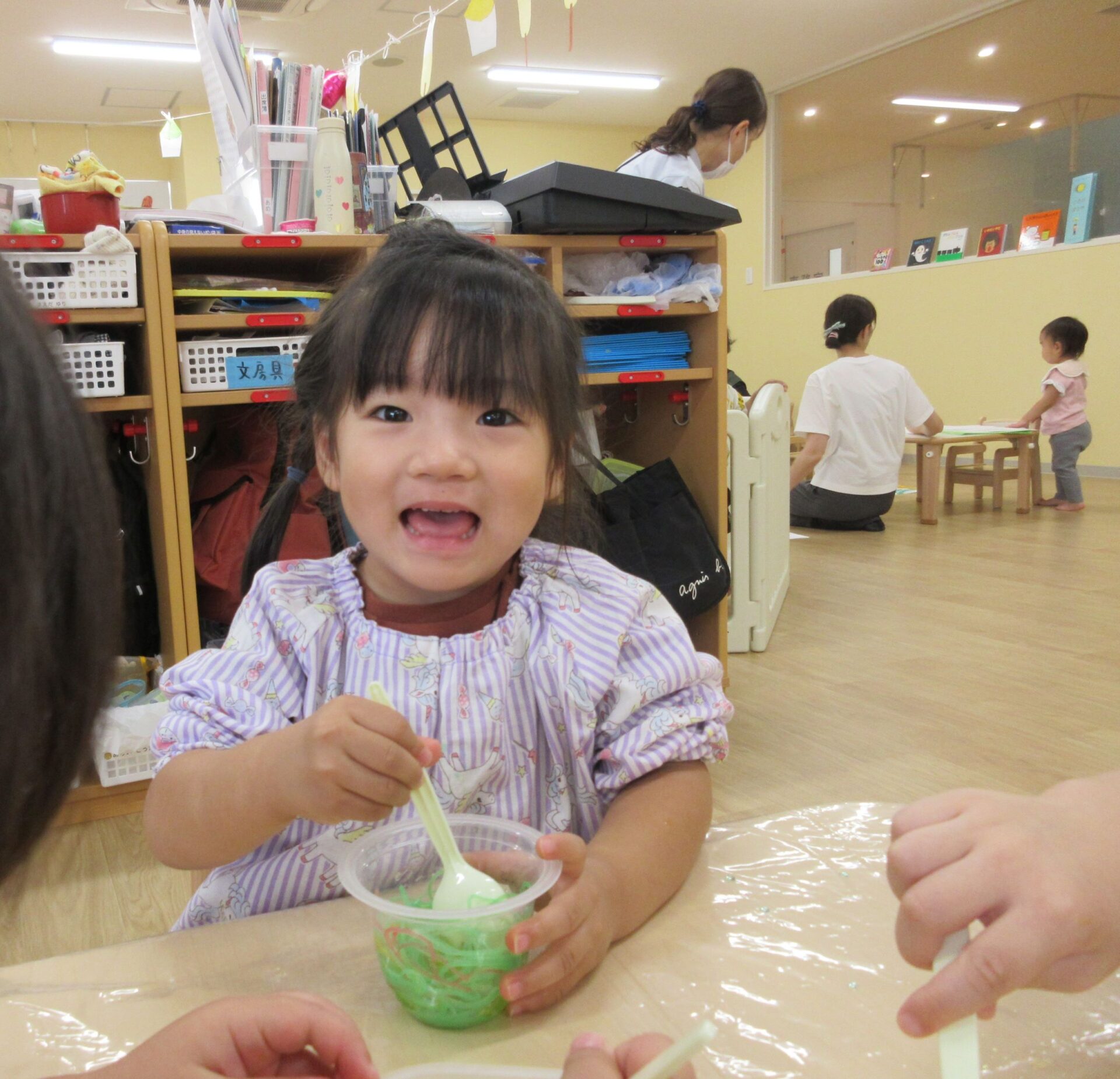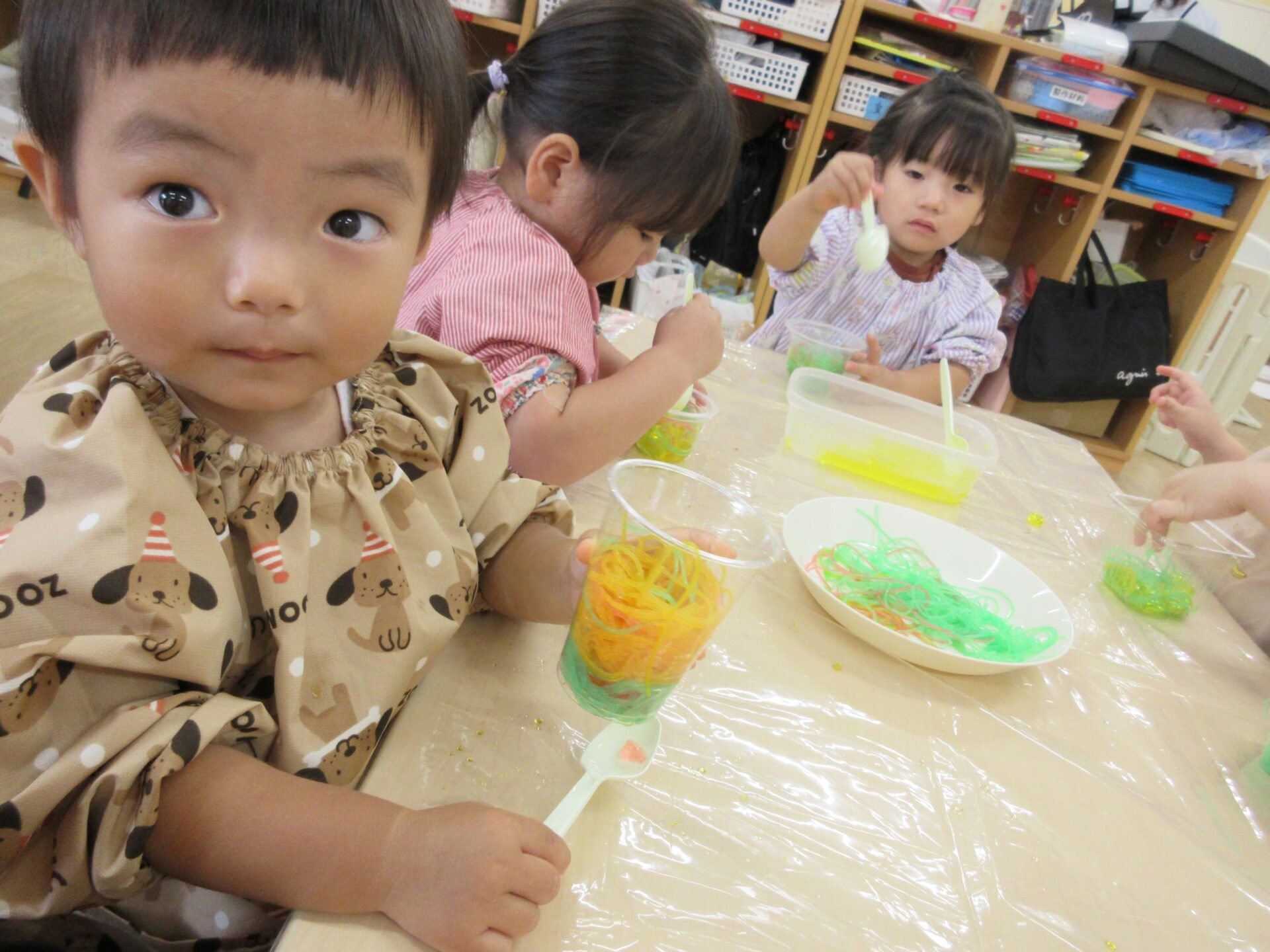 2024.08.07 お知らせ ブログ ぷるぷる・つるつる 感触遊び(あめ組) 7/31(水)色をつけたゼラチンゼリーと春雨を使い、感触遊びをしました。 スポーンですくったり、手で持ったり・・・ みんなにこにこで、興味津々です!! カップに好きな色を入れてまぜまぜ・・・ 「せんせい みて!」と嬉しそうに見せてくれました。 これからもいろいろな感触を味わって楽しんでいきたいと思います( ^^) 一覧へ戻る