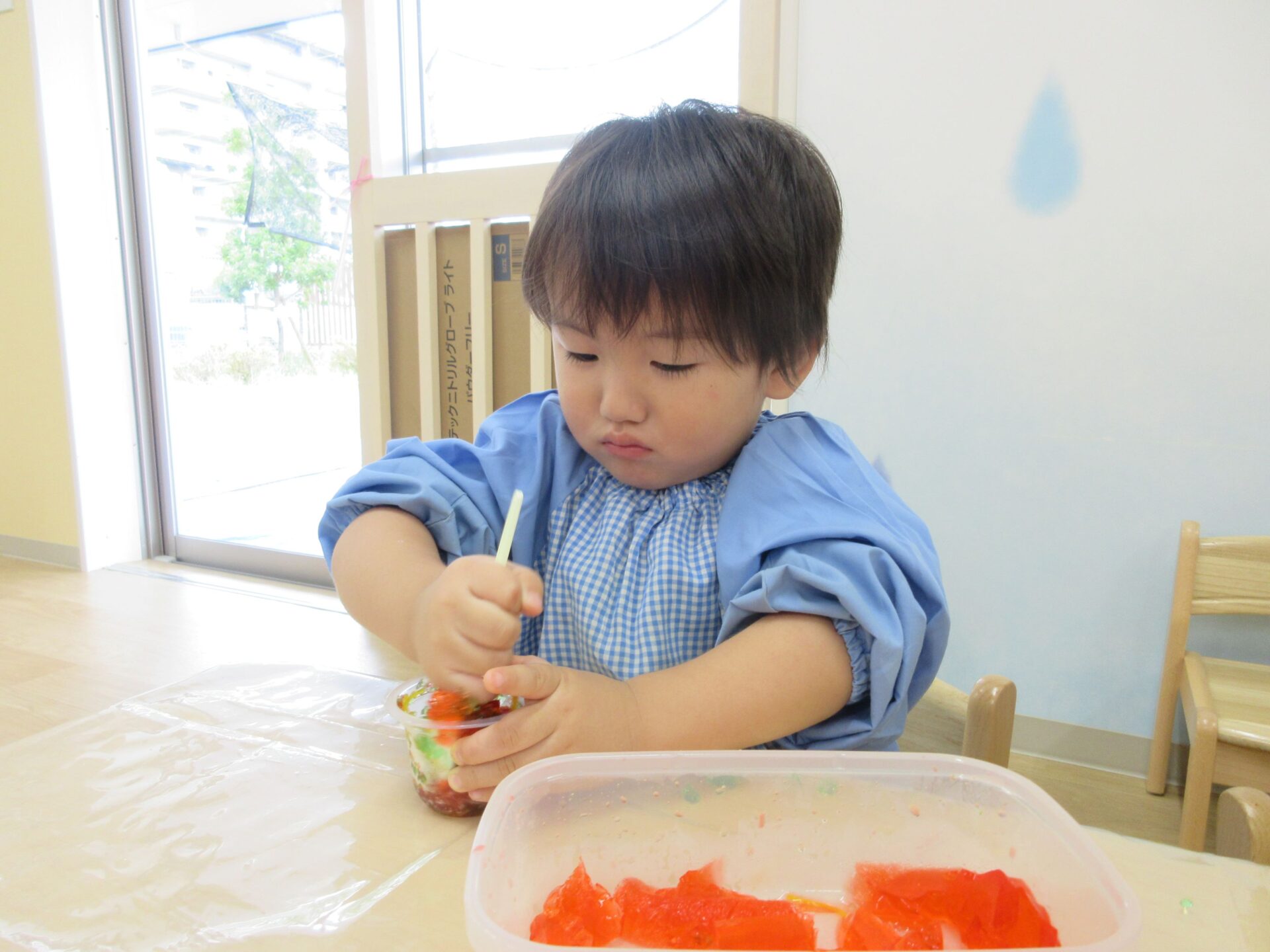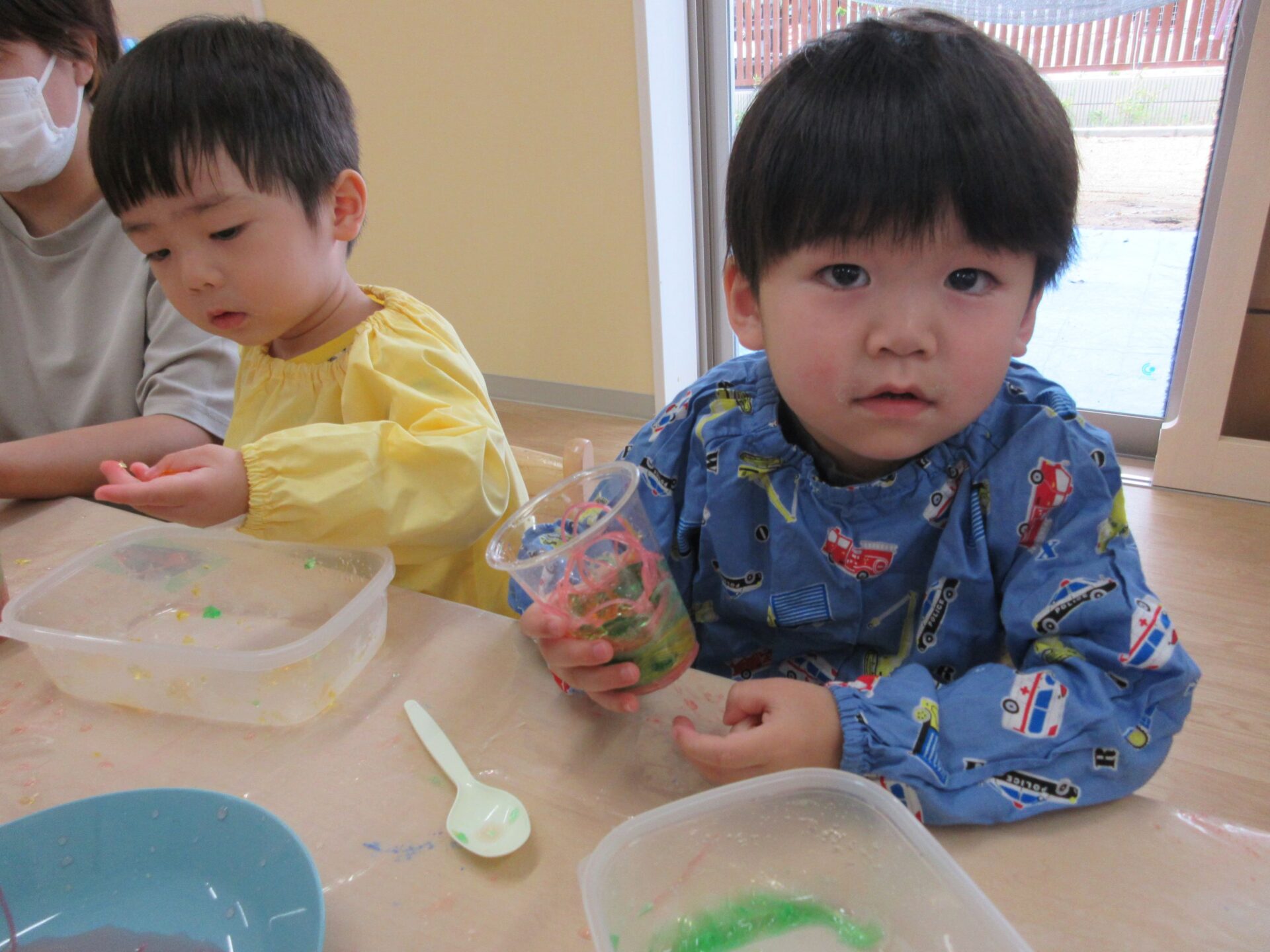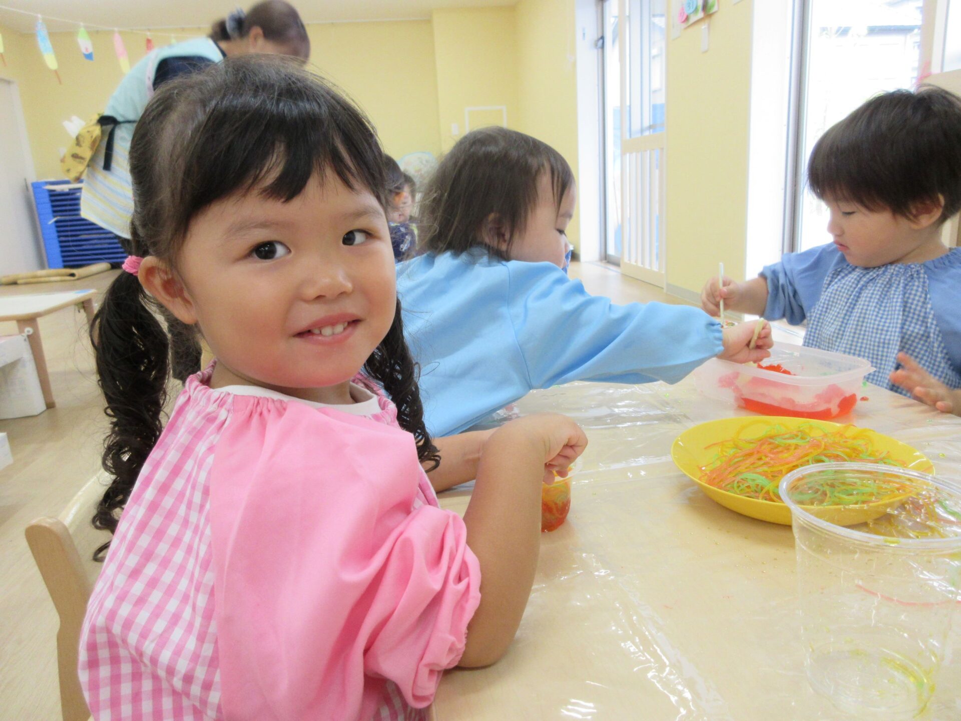 2024.08.07 お知らせ ブログ ぷるぷる・つるつる 感触遊び(あめ組) 7/31(水)色をつけたゼラチンゼリーと春雨を使い、感触遊びをしました。 スポーンですくったり、手で持ったり・・・ みんなにこにこで、興味津々です!! カップに好きな色を入れてまぜまぜ・・・ 「せんせい みて!」と嬉しそうに見せてくれました。 これからもいろいろな感触を味わって楽しんでいきたいと思います( ^^) 一覧へ戻る