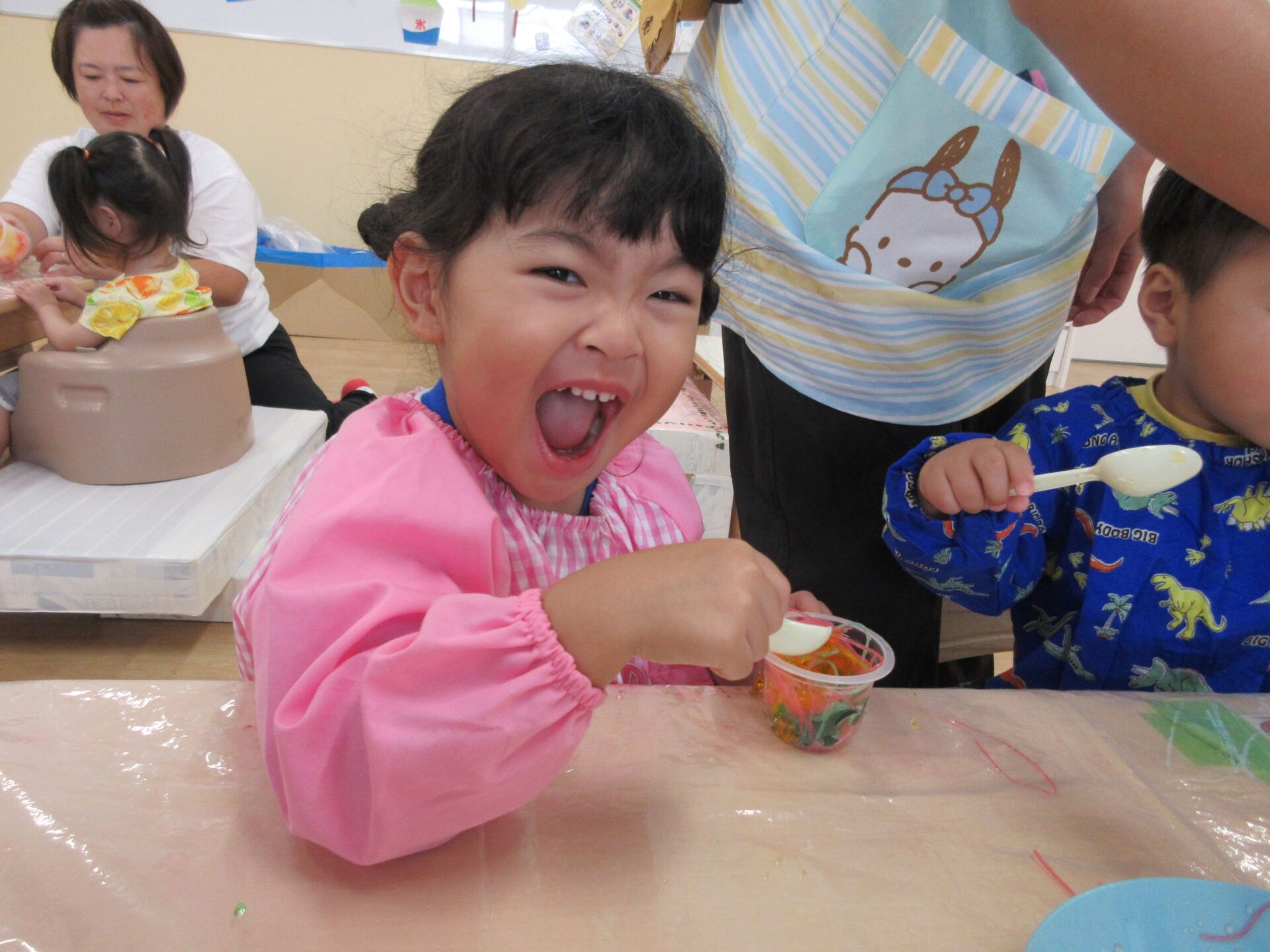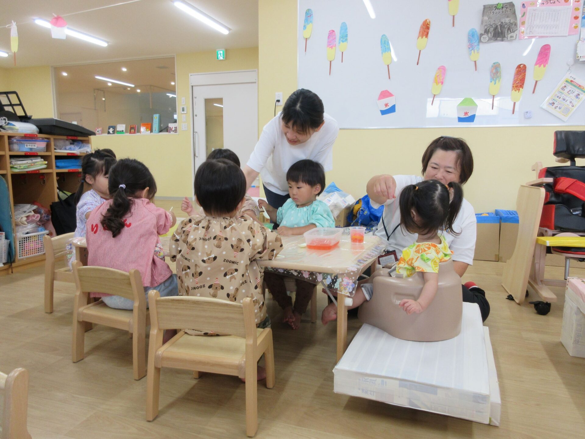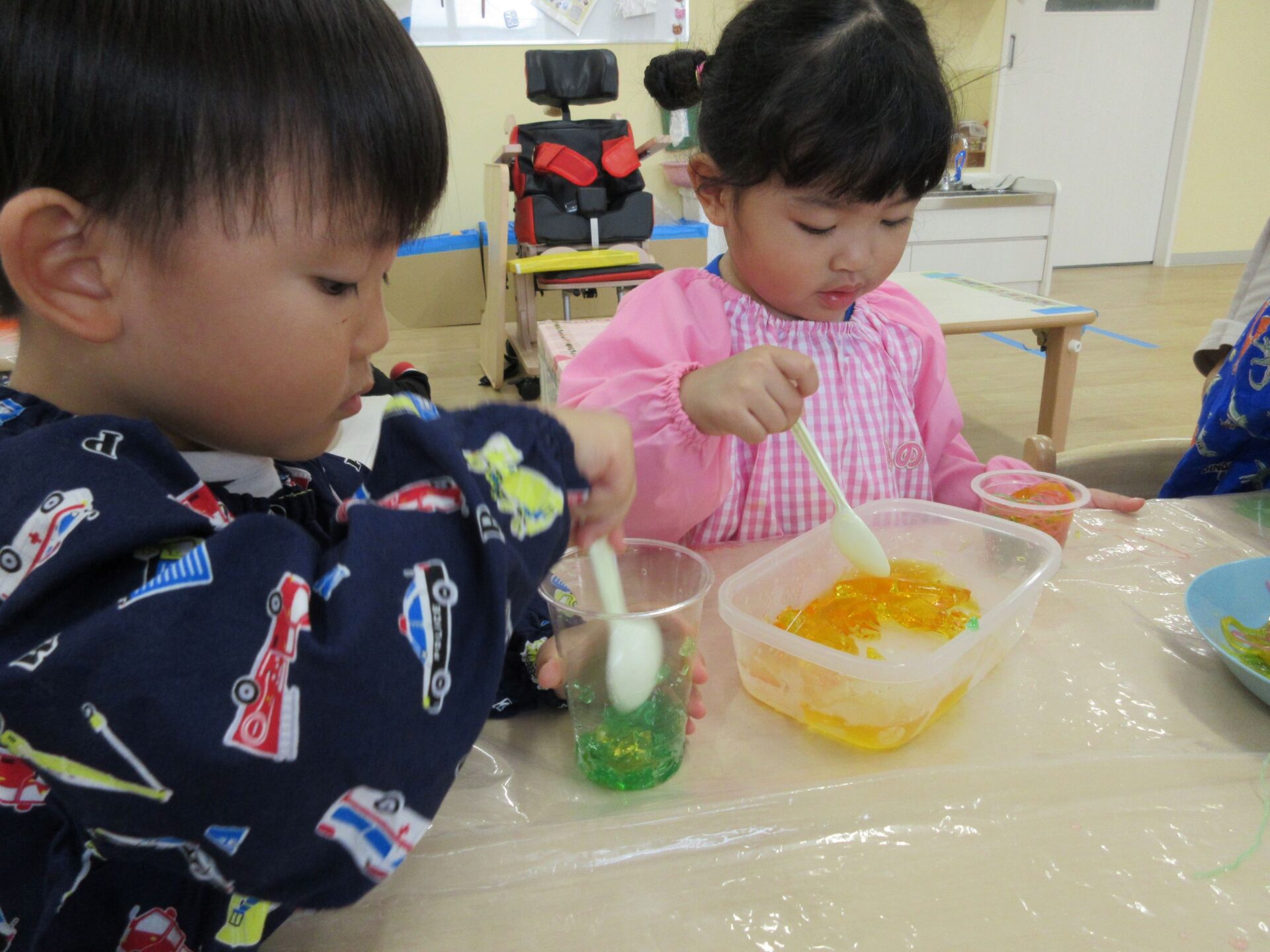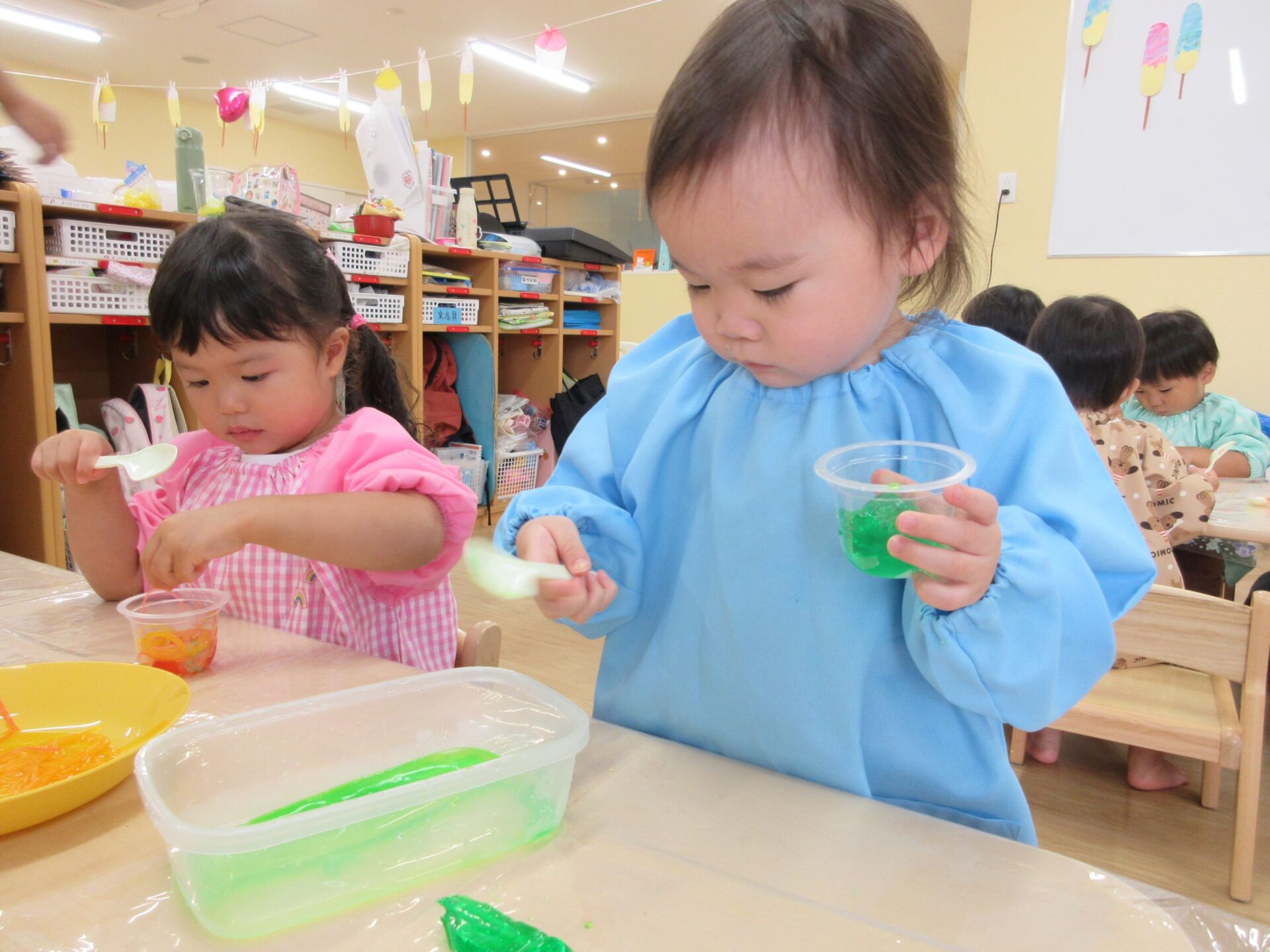 2024.08.07 お知らせ ブログ ぷるぷる・つるつる 感触遊び(あめ組) 7/31(水)色をつけたゼラチンゼリーと春雨を使い、感触遊びをしました。 スポーンですくったり、手で持ったり・・・ みんなにこにこで、興味津々です!! カップに好きな色を入れてまぜまぜ・・・ 「せんせい みて!」と嬉しそうに見せてくれました。 これからもいろいろな感触を味わって楽しんでいきたいと思います( ^^) 一覧へ戻る