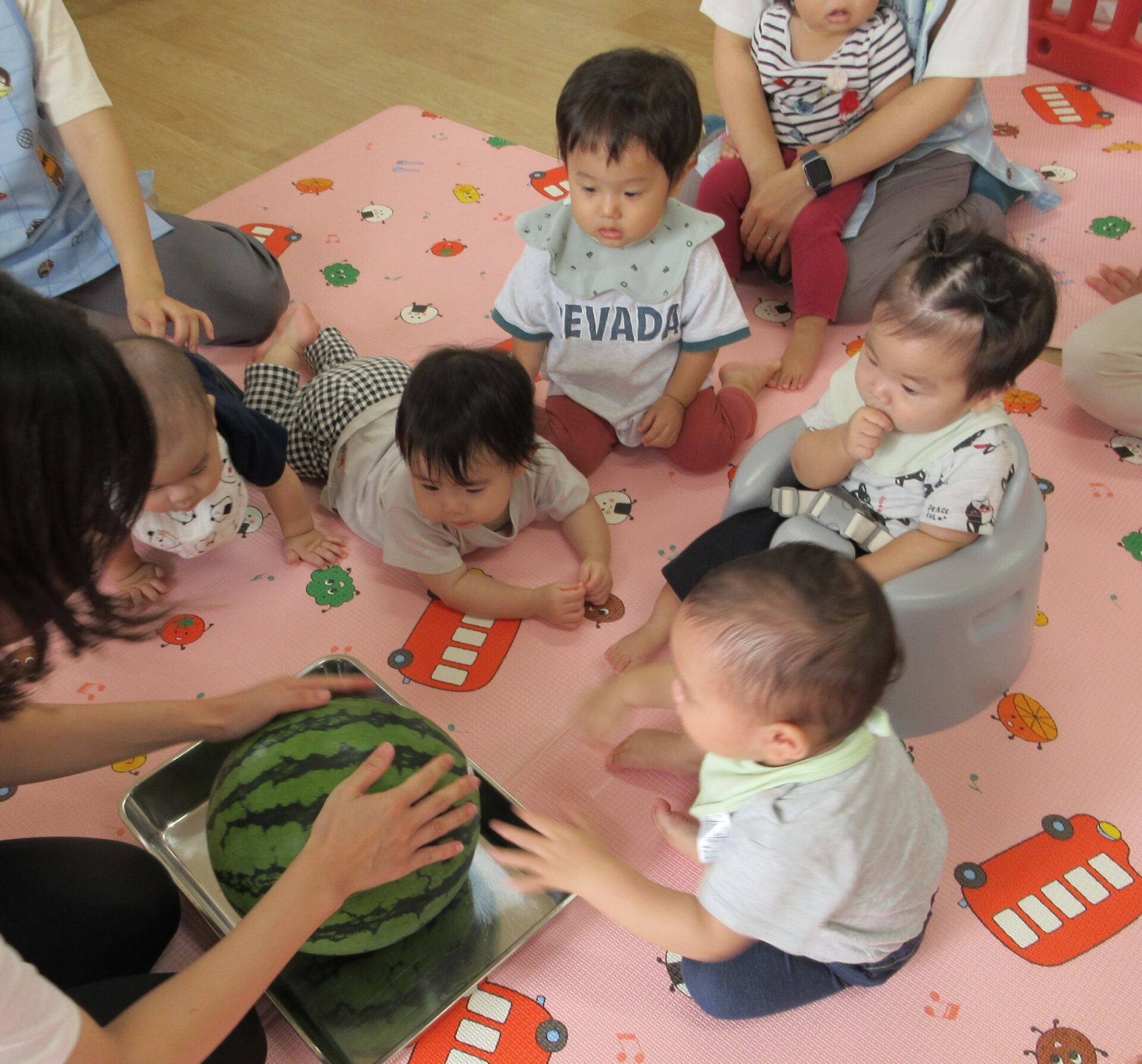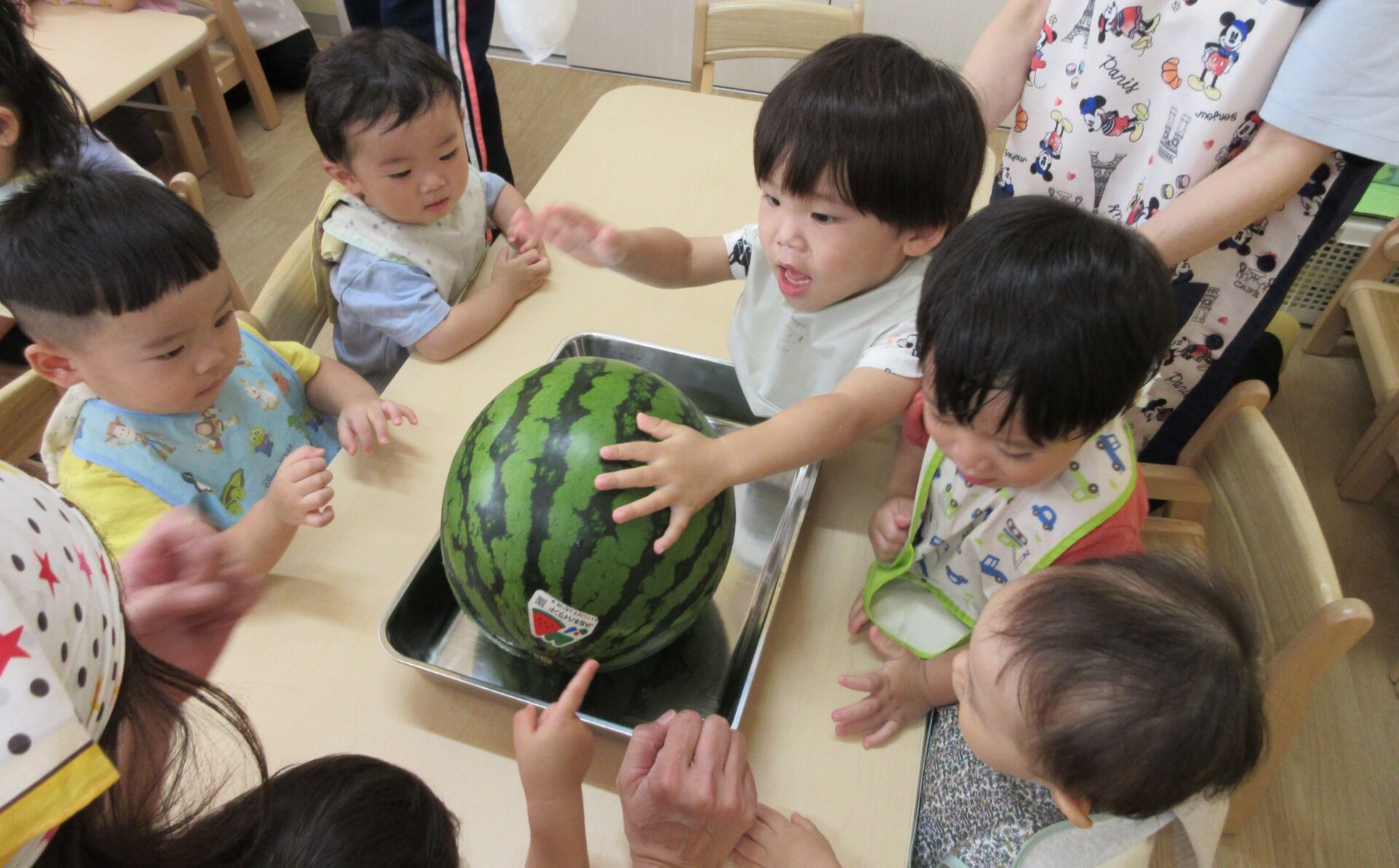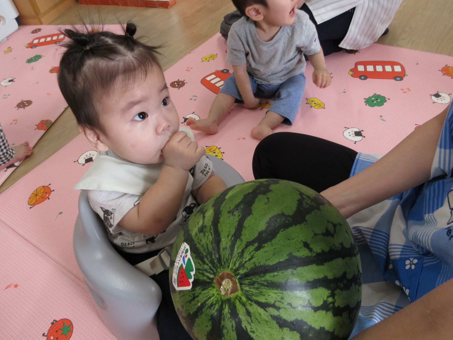 8/22(木)のおやつに出るスイカを、うみぐみとだいちぐみで見せてもらいました!