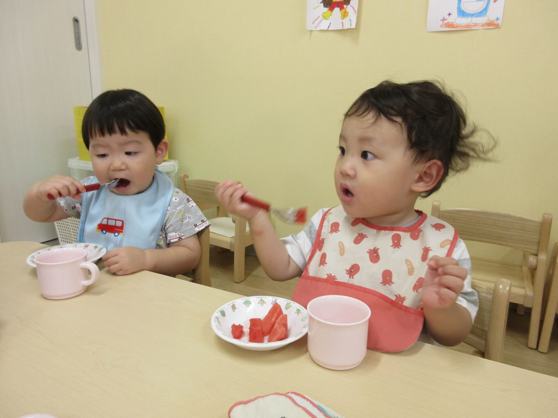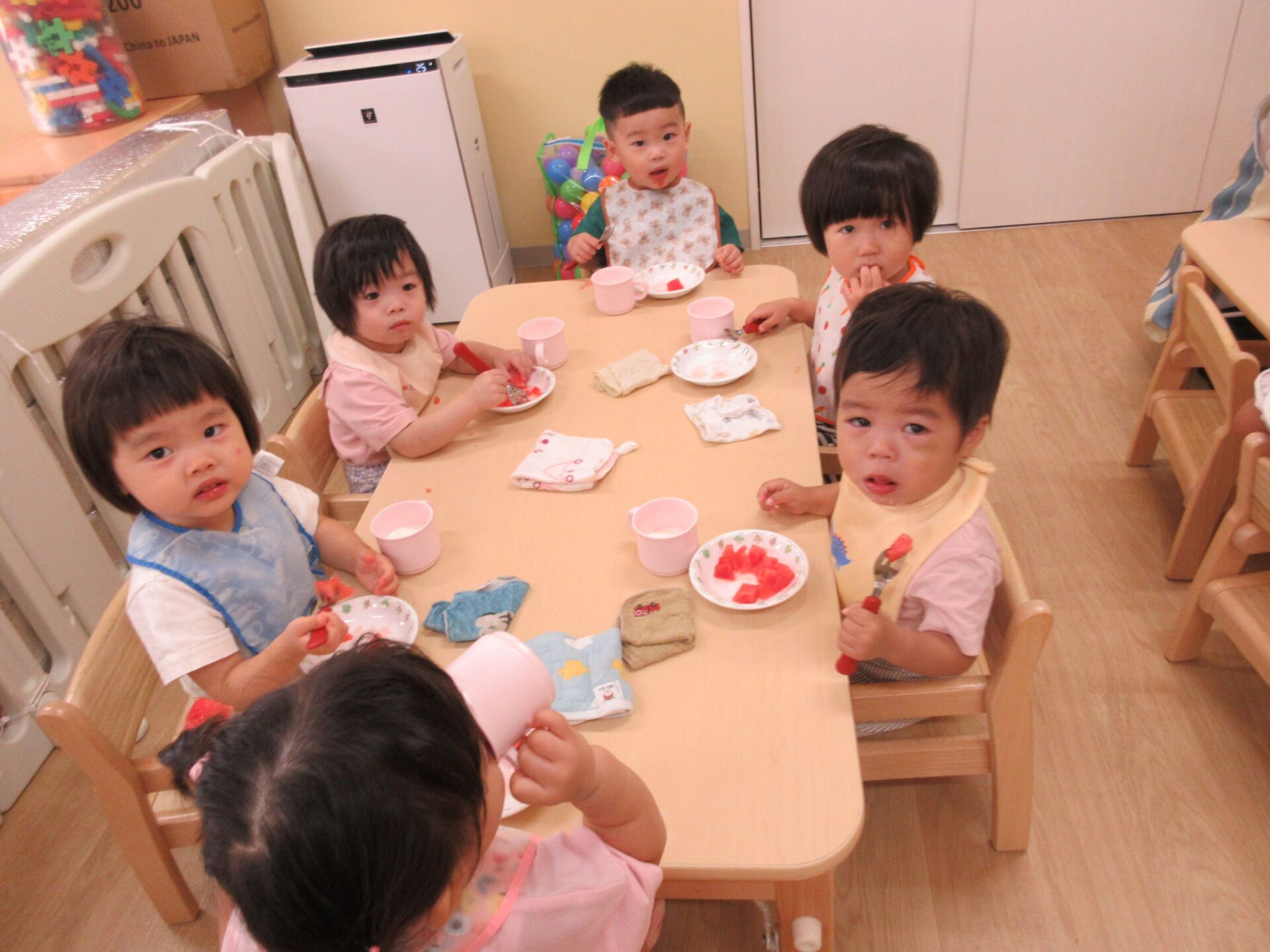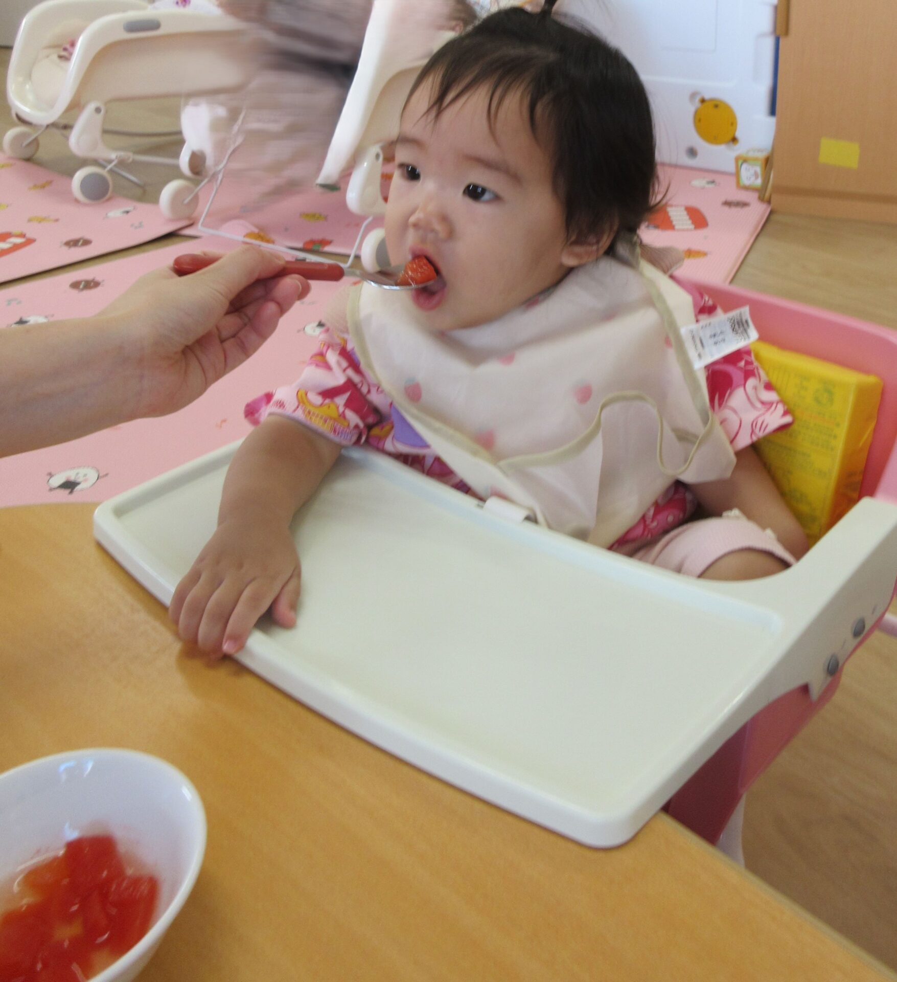 給食の先生に切ってもらい、午後のおやつでいただきました。