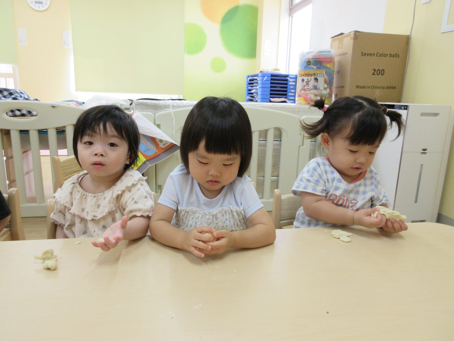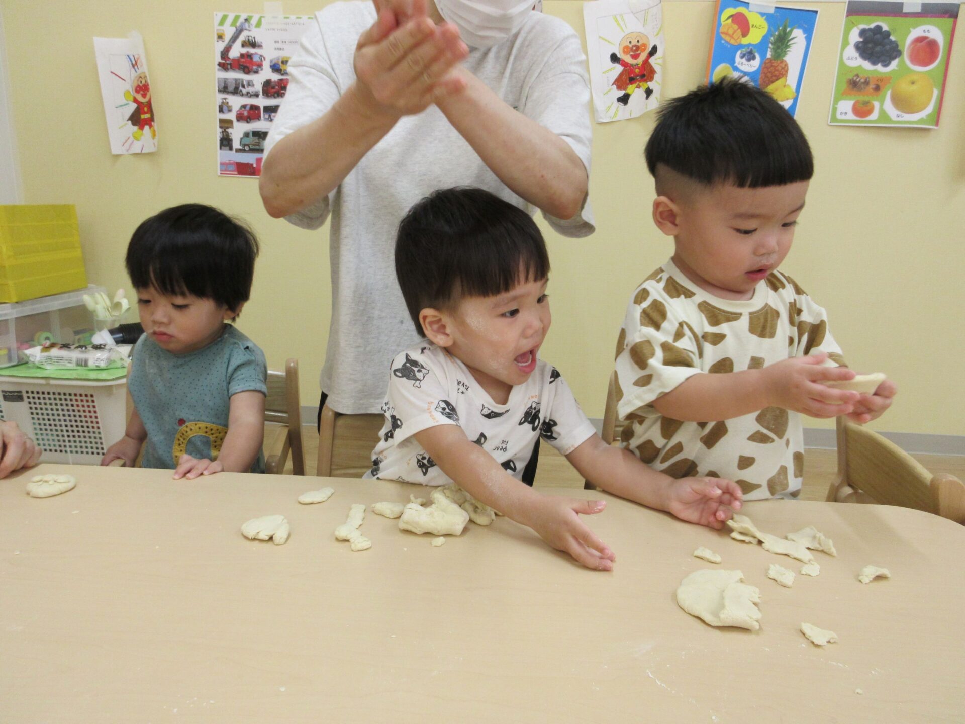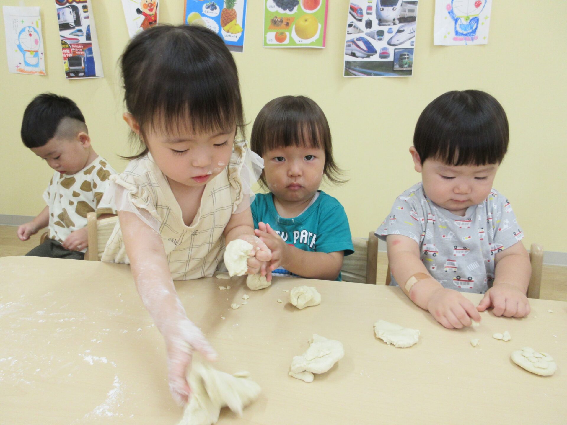 そのあとは、みんなで小麦粉ねんどをして遊びました。小麦粉粘土は二回目です。もう、扱いもお手の物ですね。