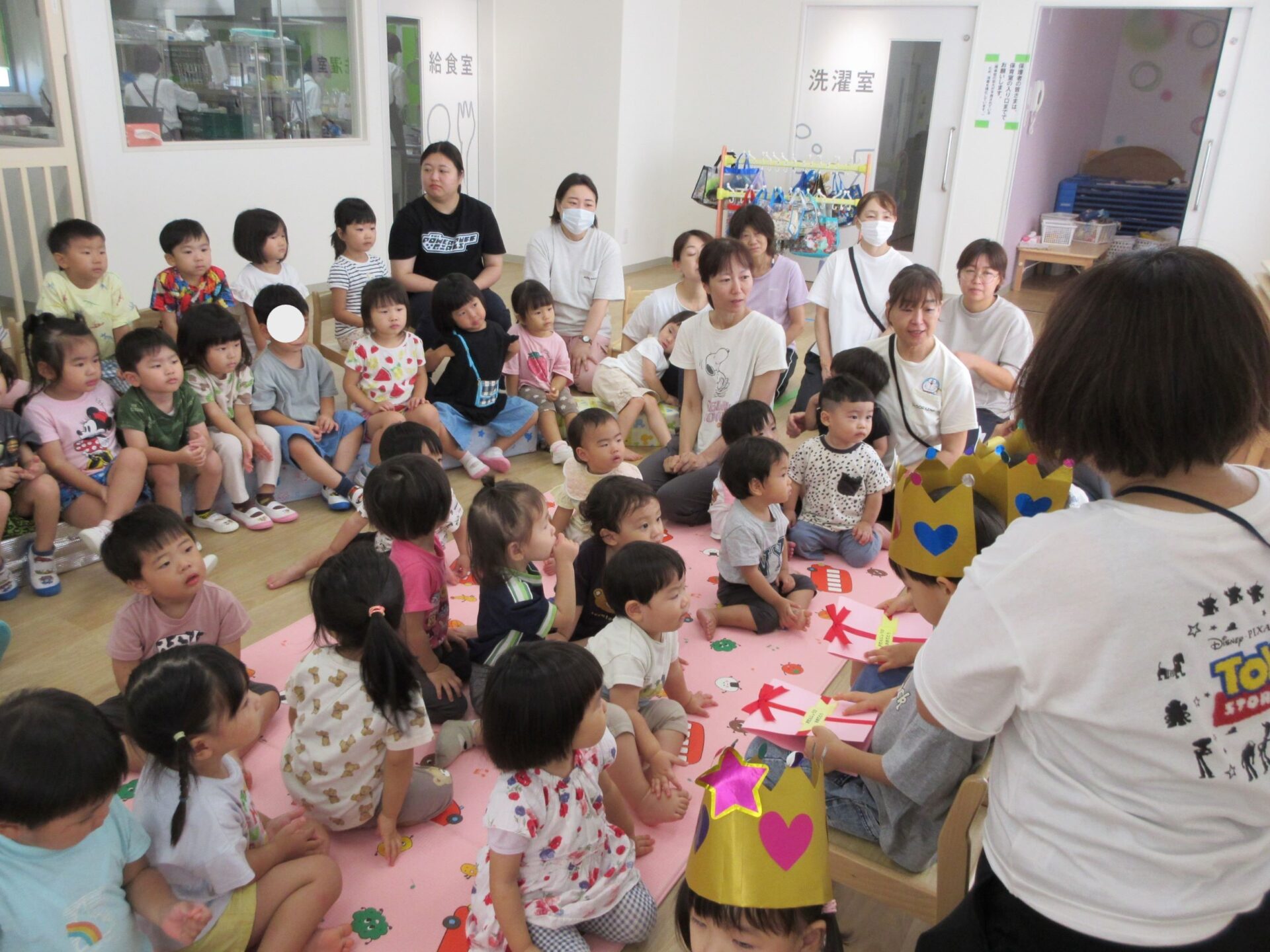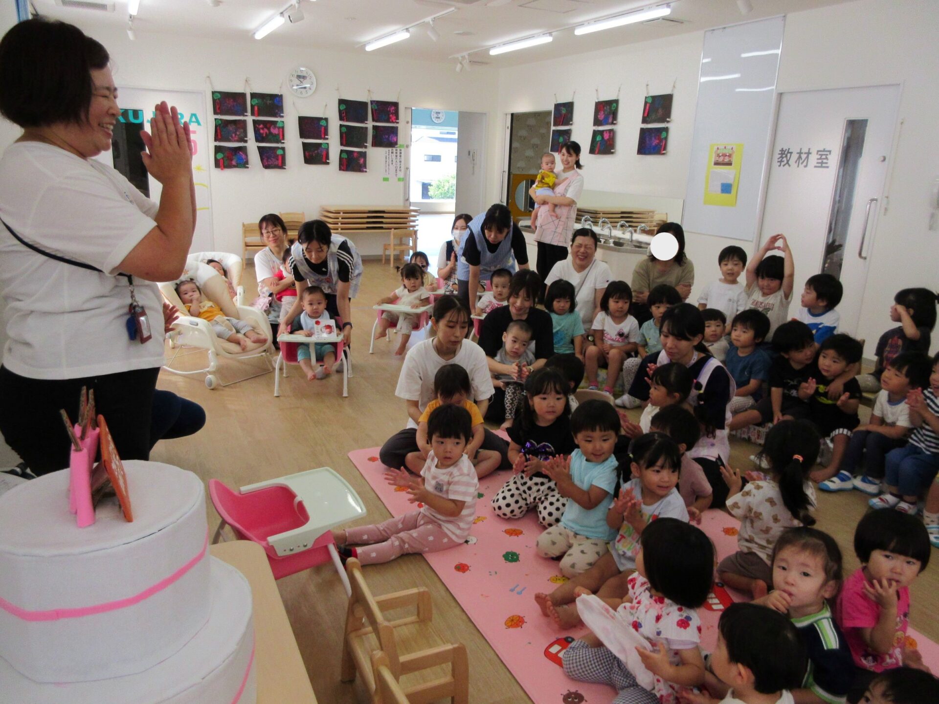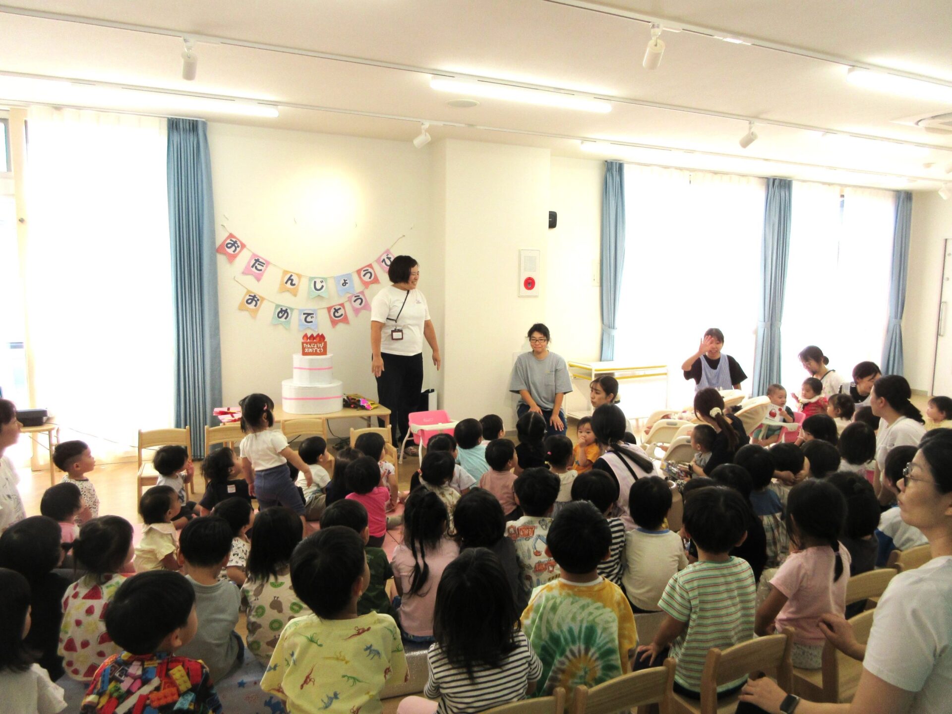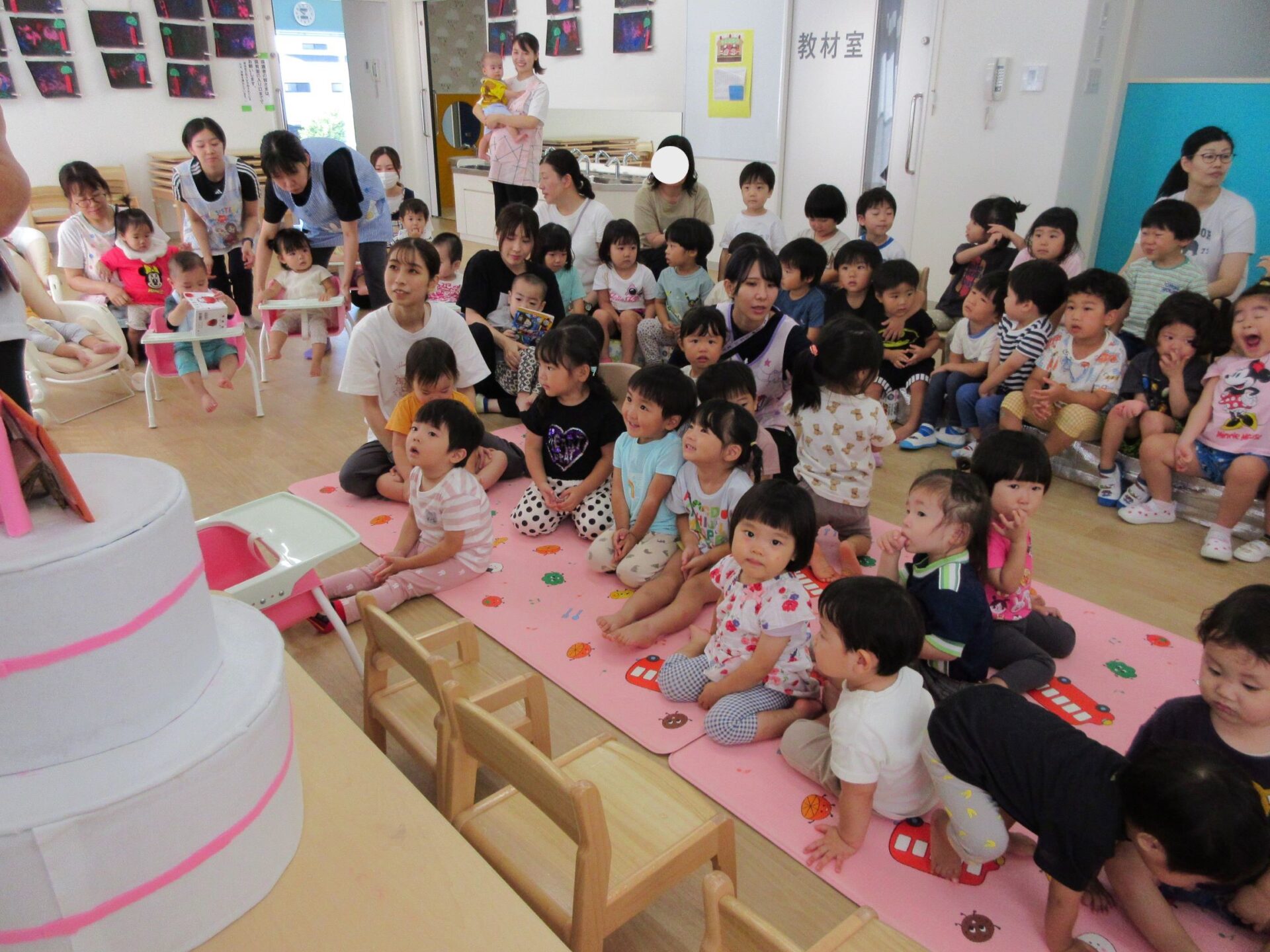 2024.09.04 お知らせ ブログ 8月の誕生会 8月22日(木)2階ランチルームに集まり、誕生会を行いました。 0歳うみ組から4歳そら組までが集まりました。はじめに先生からのお話です。 「今日はどんなお話があるんだろう?」 誕生月のお友だちの紹介です。 うみ組さんも泣いていませんね。 冠をかぶせてもらってから、記念のしおりを受け取ります。 ひとりずつ、インタビューもありました。「好きな食べ物はなにですか?」 誕生日ケーキのろうそくの炎を消しましょう。「フゥー!」 次は、先生の出し物。今月は、ペープサート。 「これは何かな?」「ライオンでした。」 最後は、お鼻のながーいゾウさんでした。 一覧へ戻る