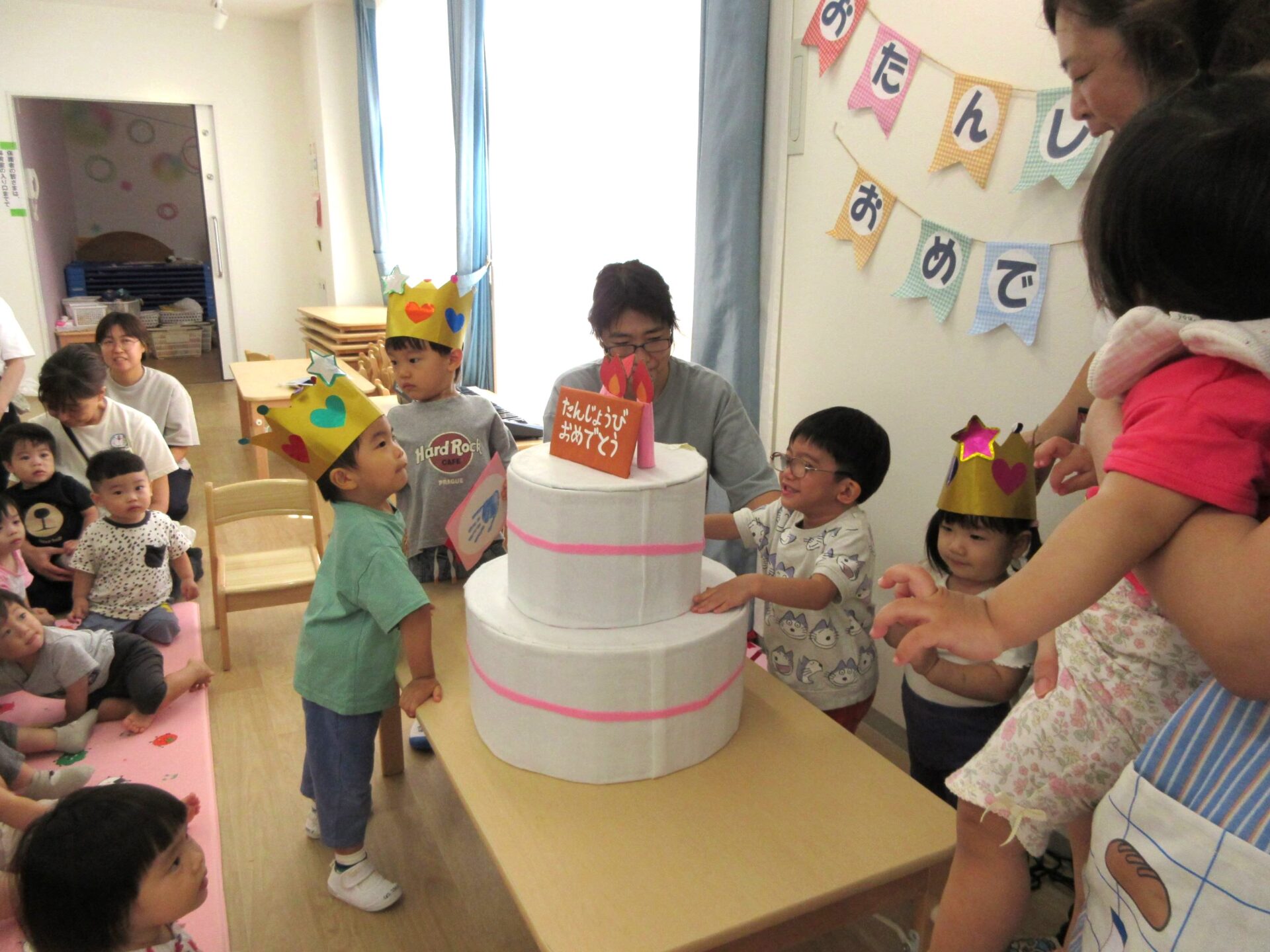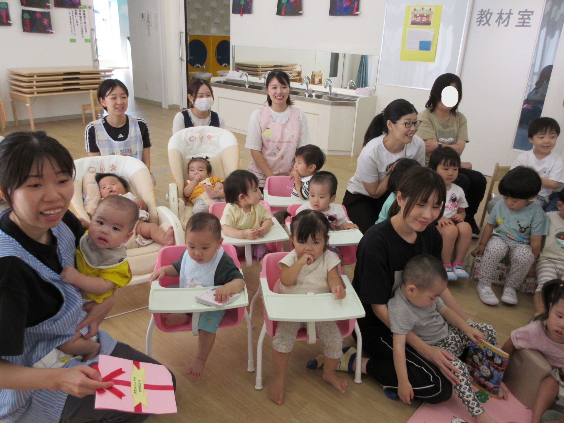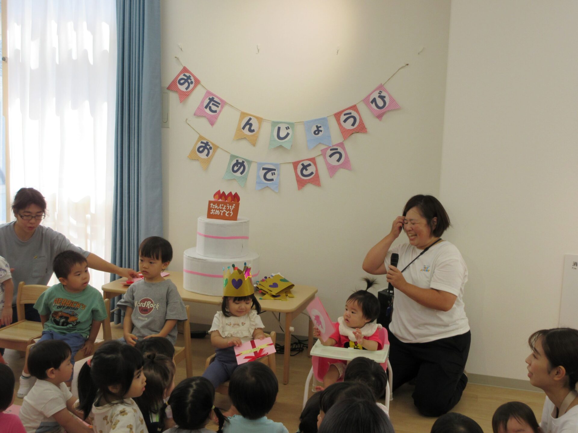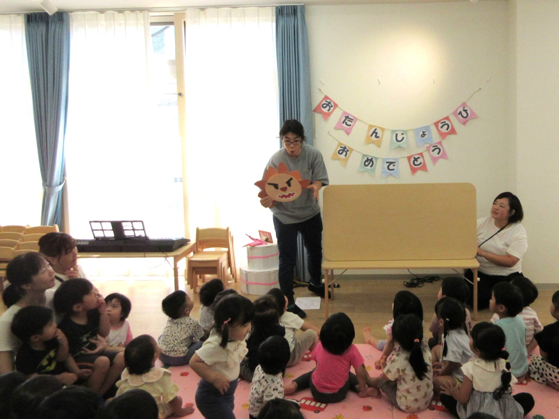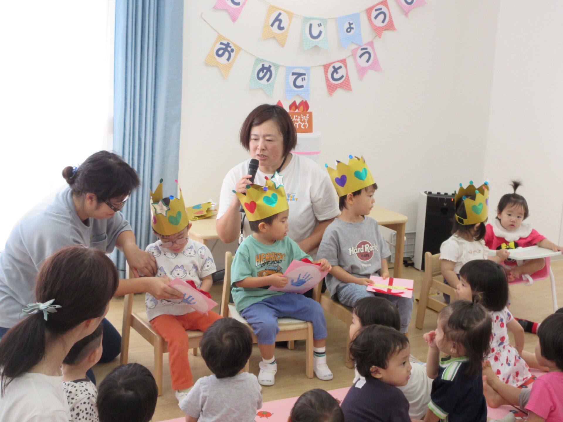 2024.09.04 お知らせ ブログ 8月の誕生会 8月22日(木)2階ランチルームに集まり、誕生会を行いました。 0歳うみ組から4歳そら組までが集まりました。はじめに先生からのお話です。 「今日はどんなお話があるんだろう?」 誕生月のお友だちの紹介です。 うみ組さんも泣いていませんね。 冠をかぶせてもらってから、記念のしおりを受け取ります。 ひとりずつ、インタビューもありました。「好きな食べ物はなにですか?」 誕生日ケーキのろうそくの炎を消しましょう。「フゥー!」 次は、先生の出し物。今月は、ペープサート。 「これは何かな?」「ライオンでした。」 最後は、お鼻のながーいゾウさんでした。 一覧へ戻る